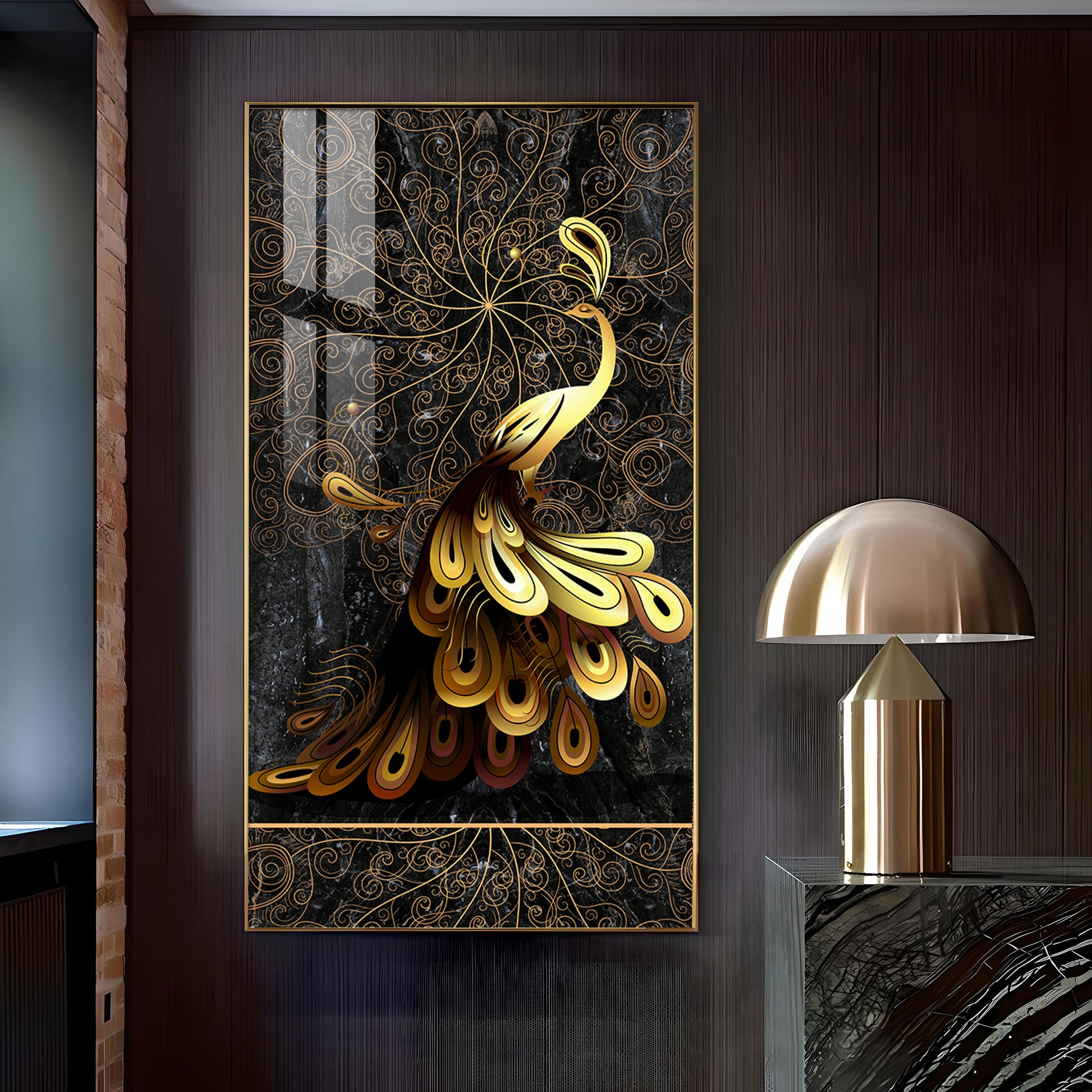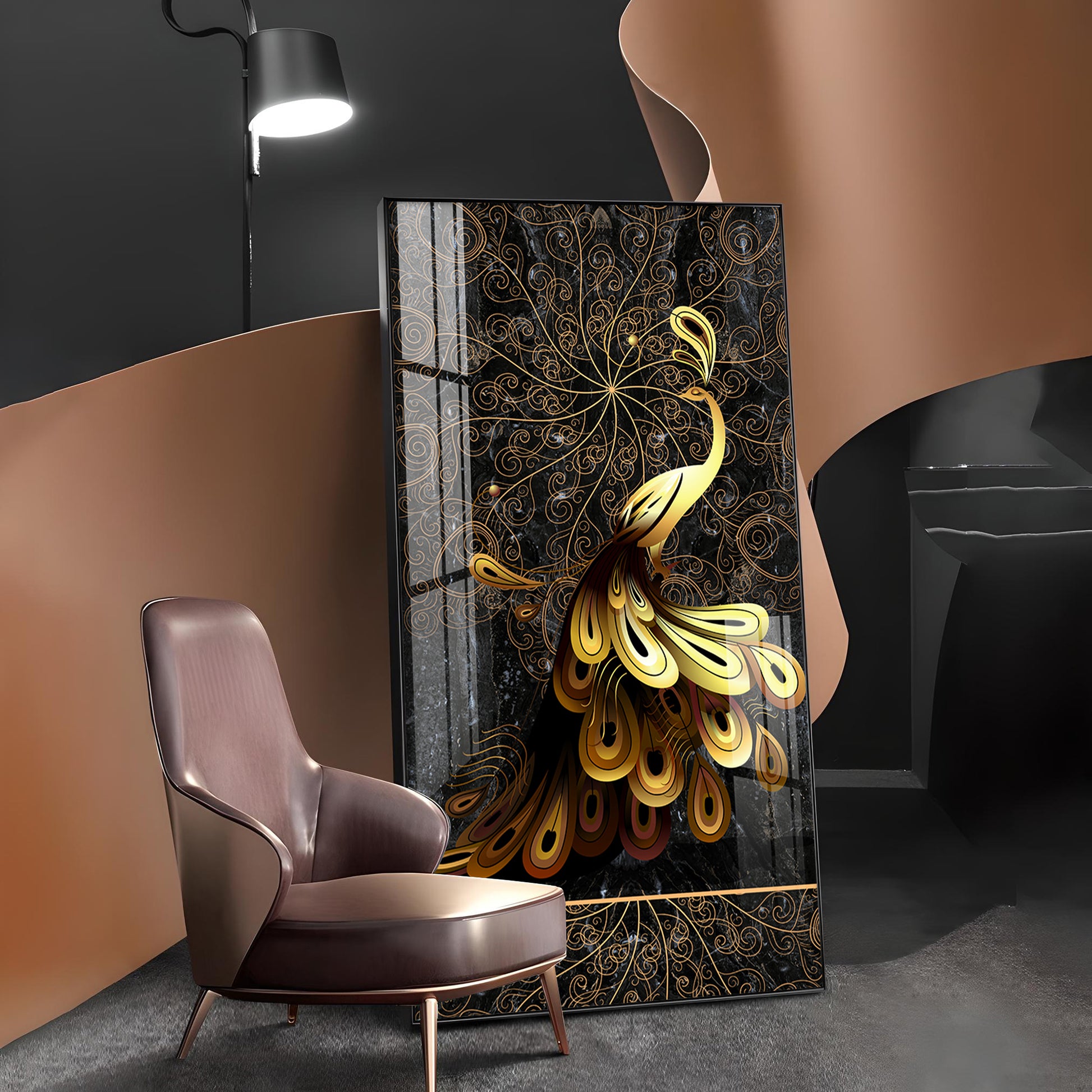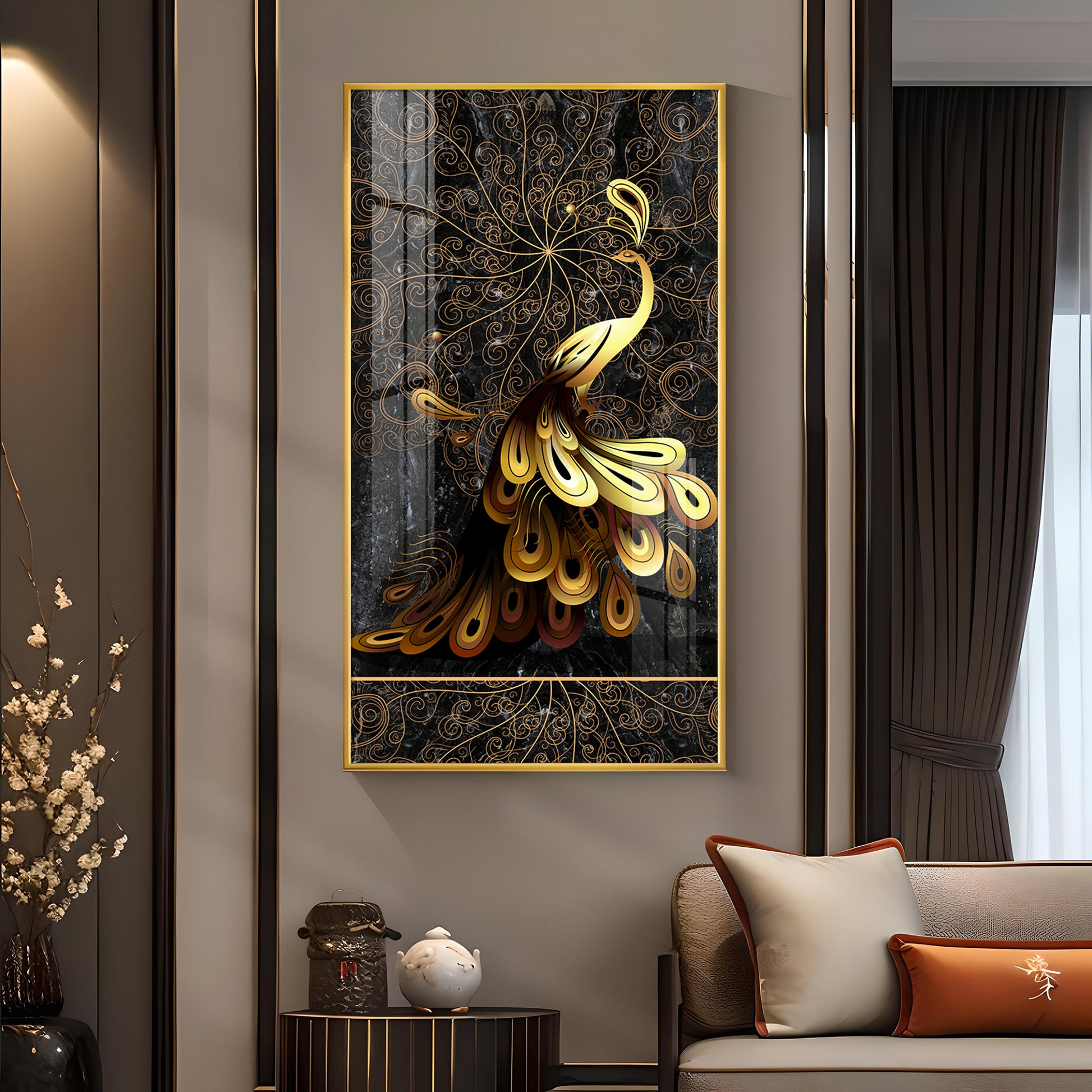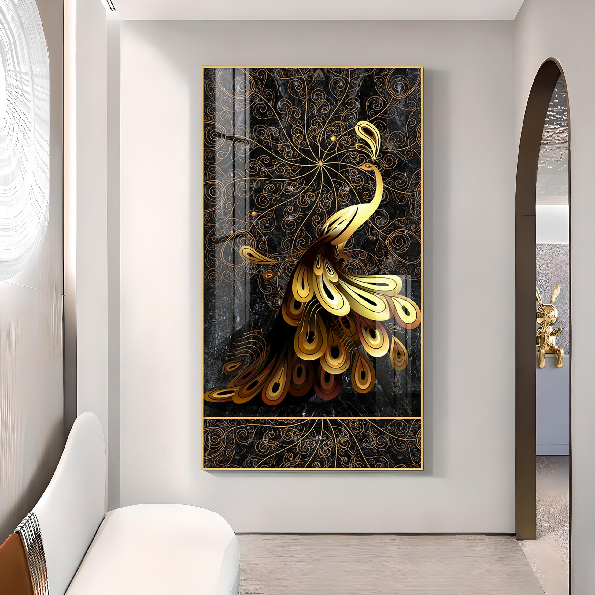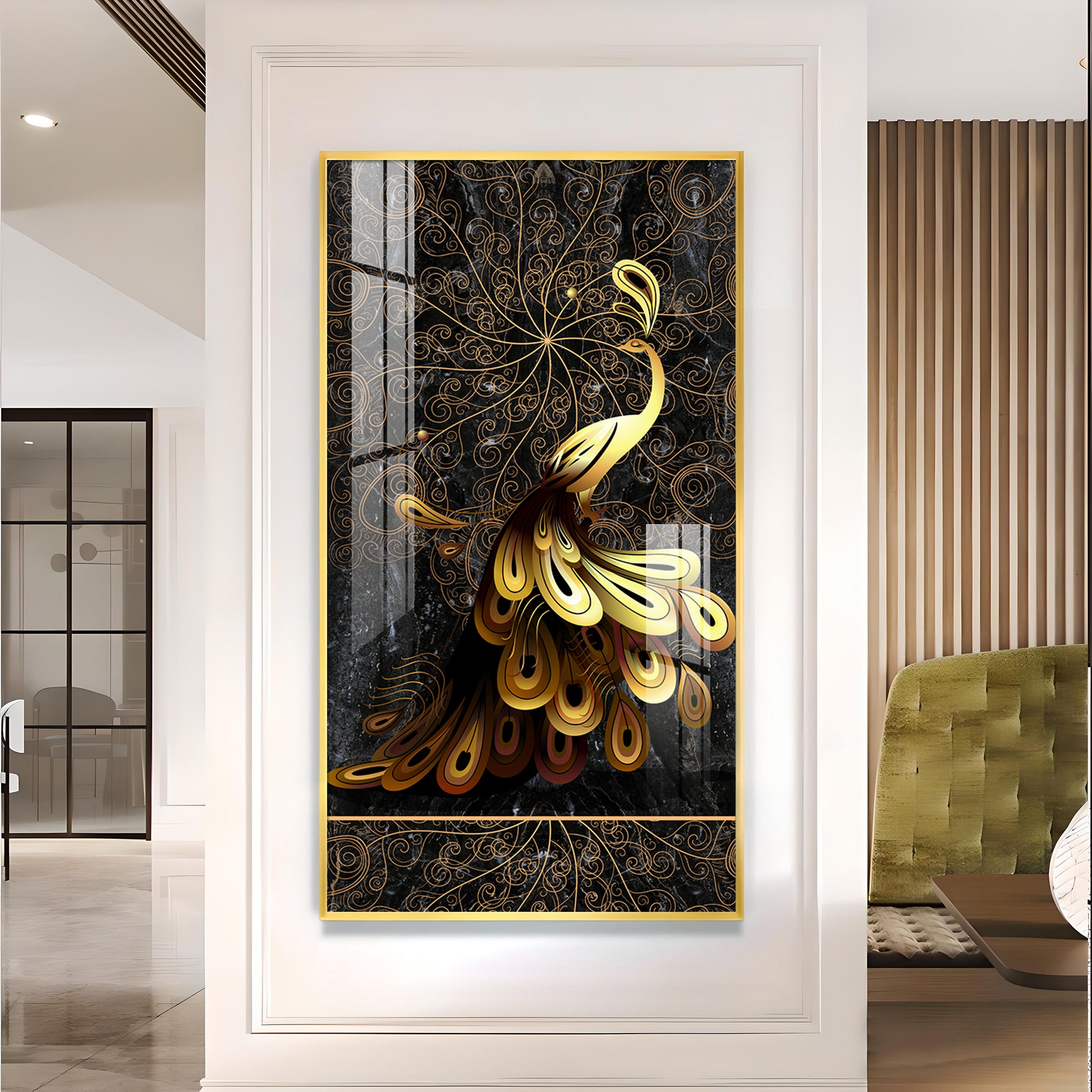 Golden Veil Peacock Glass Finish Vertical Wall Art