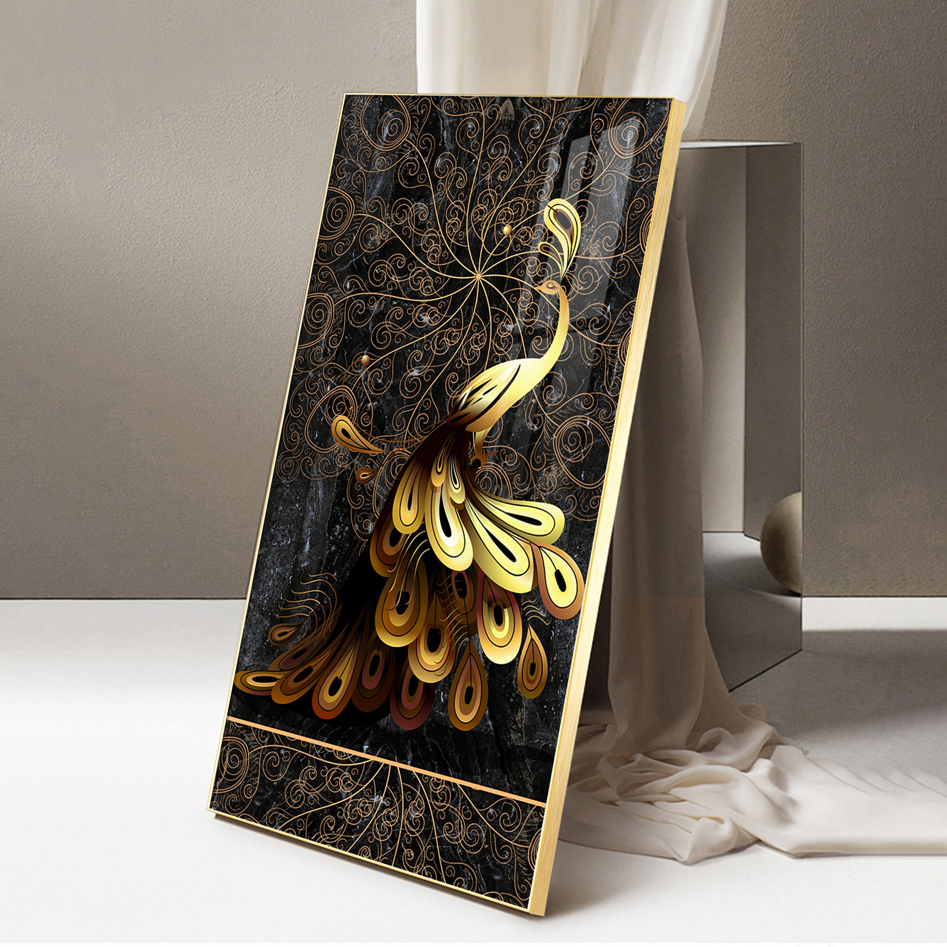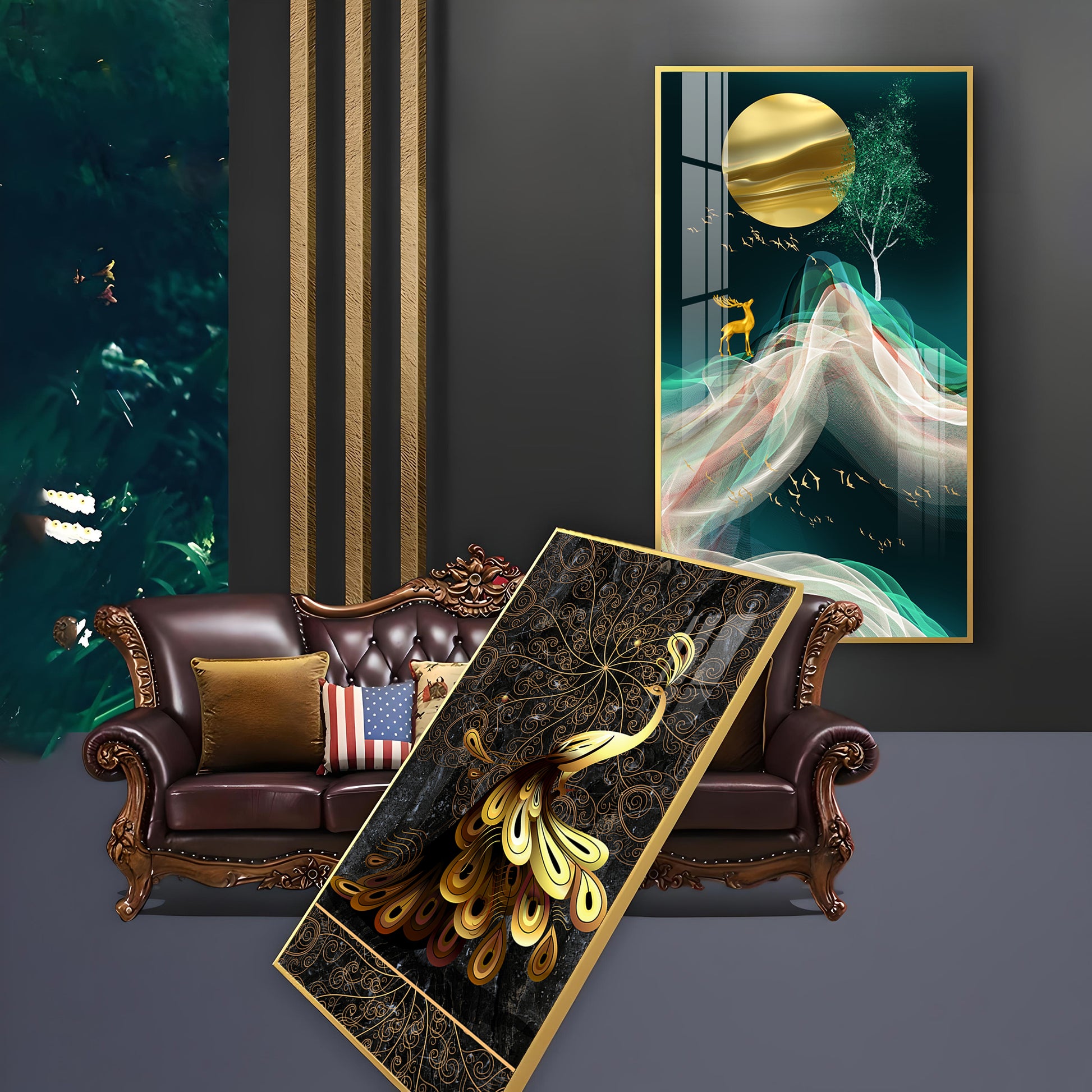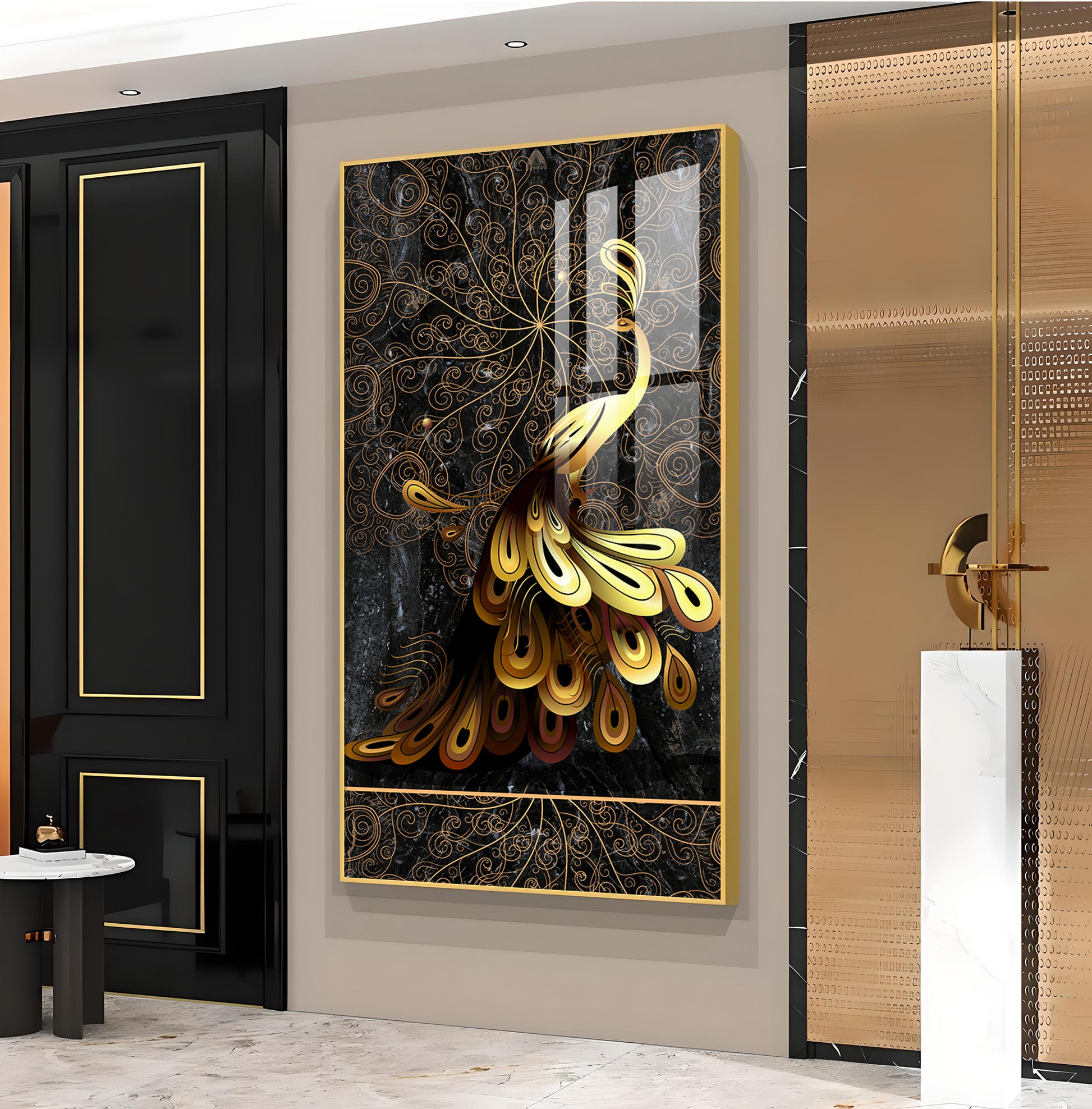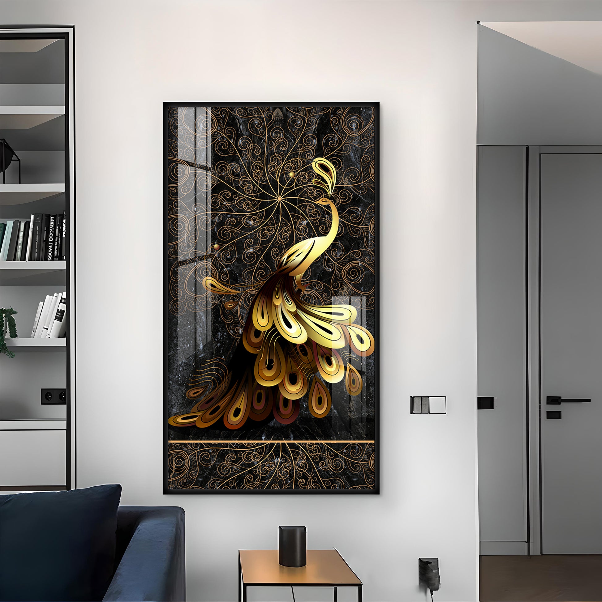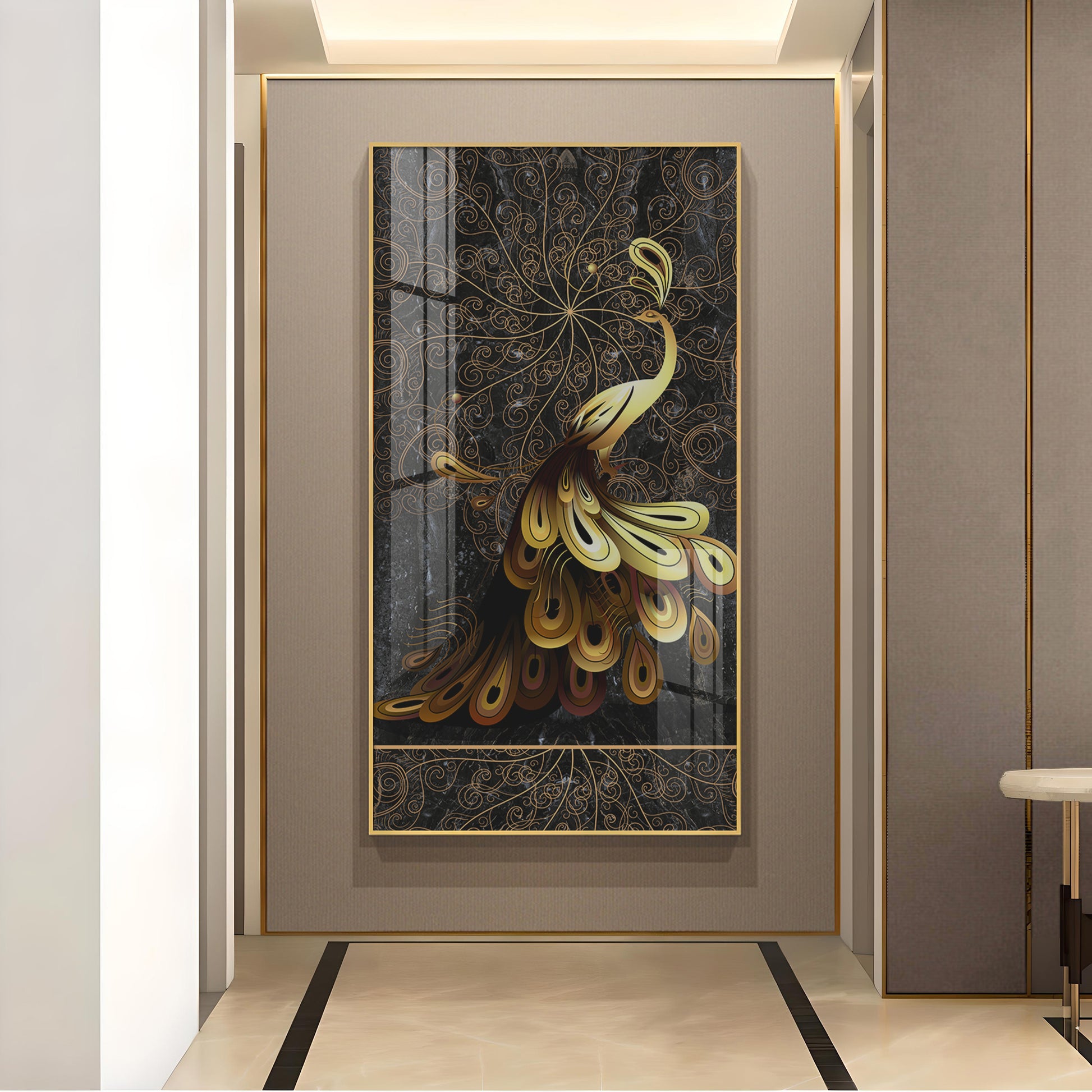 Golden Veil Peacock Glass Finish Vertical Wall Art