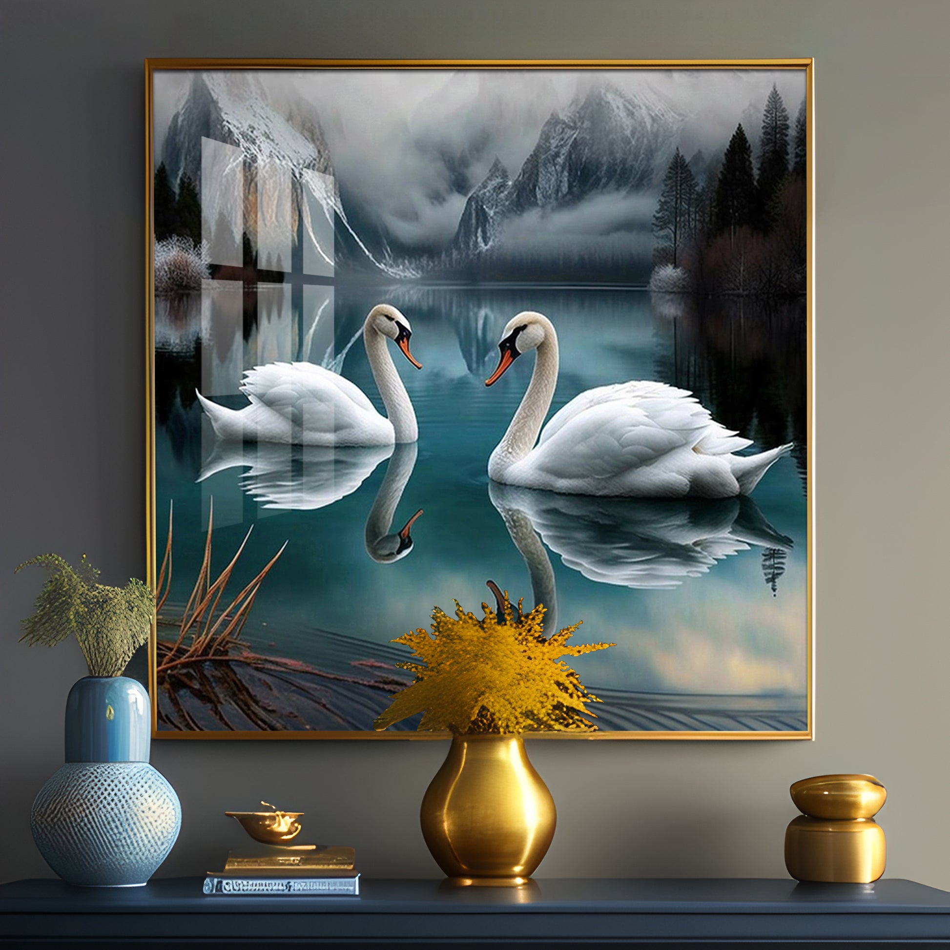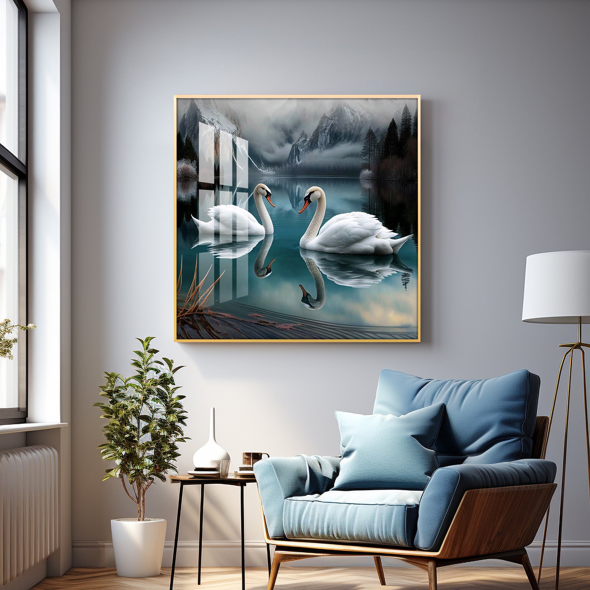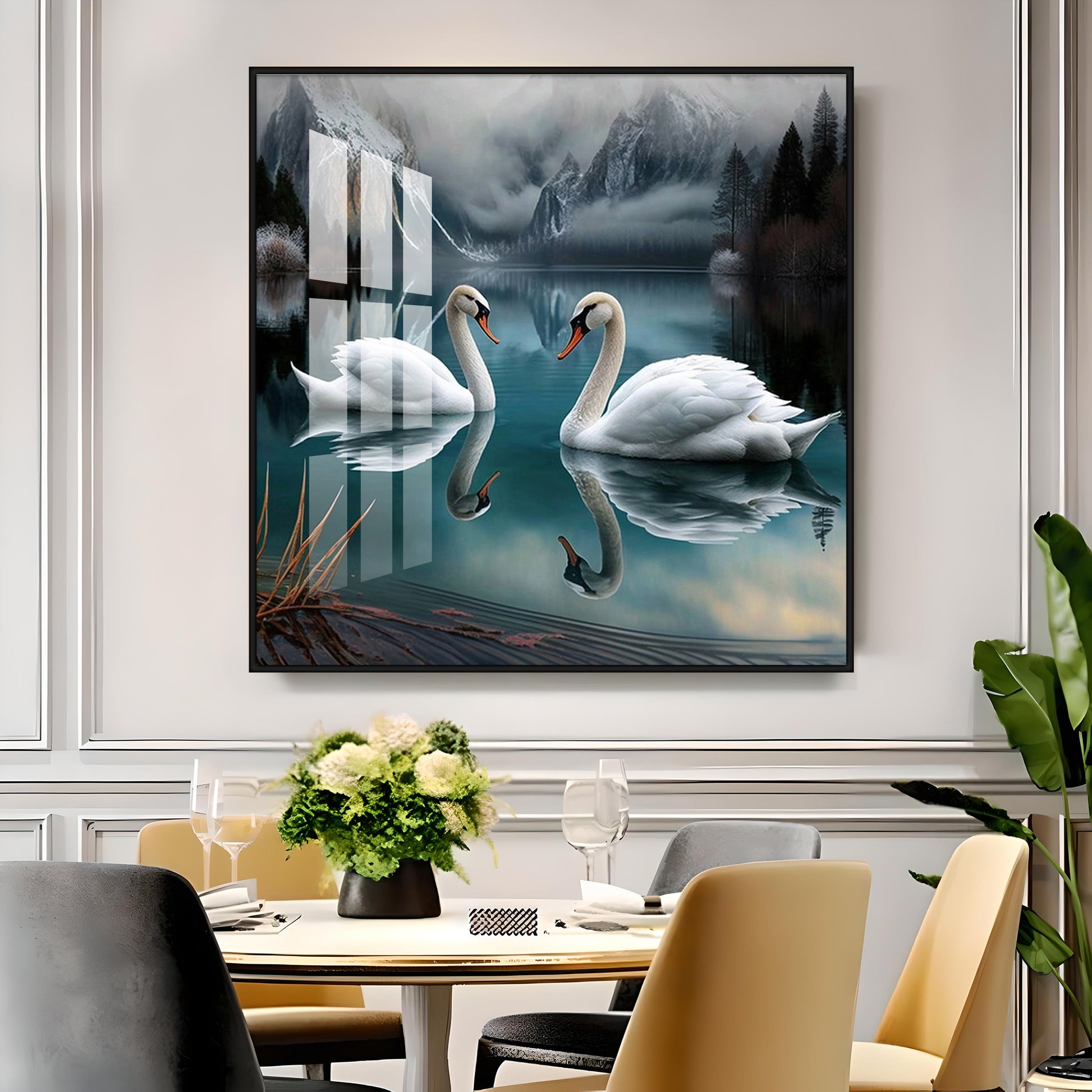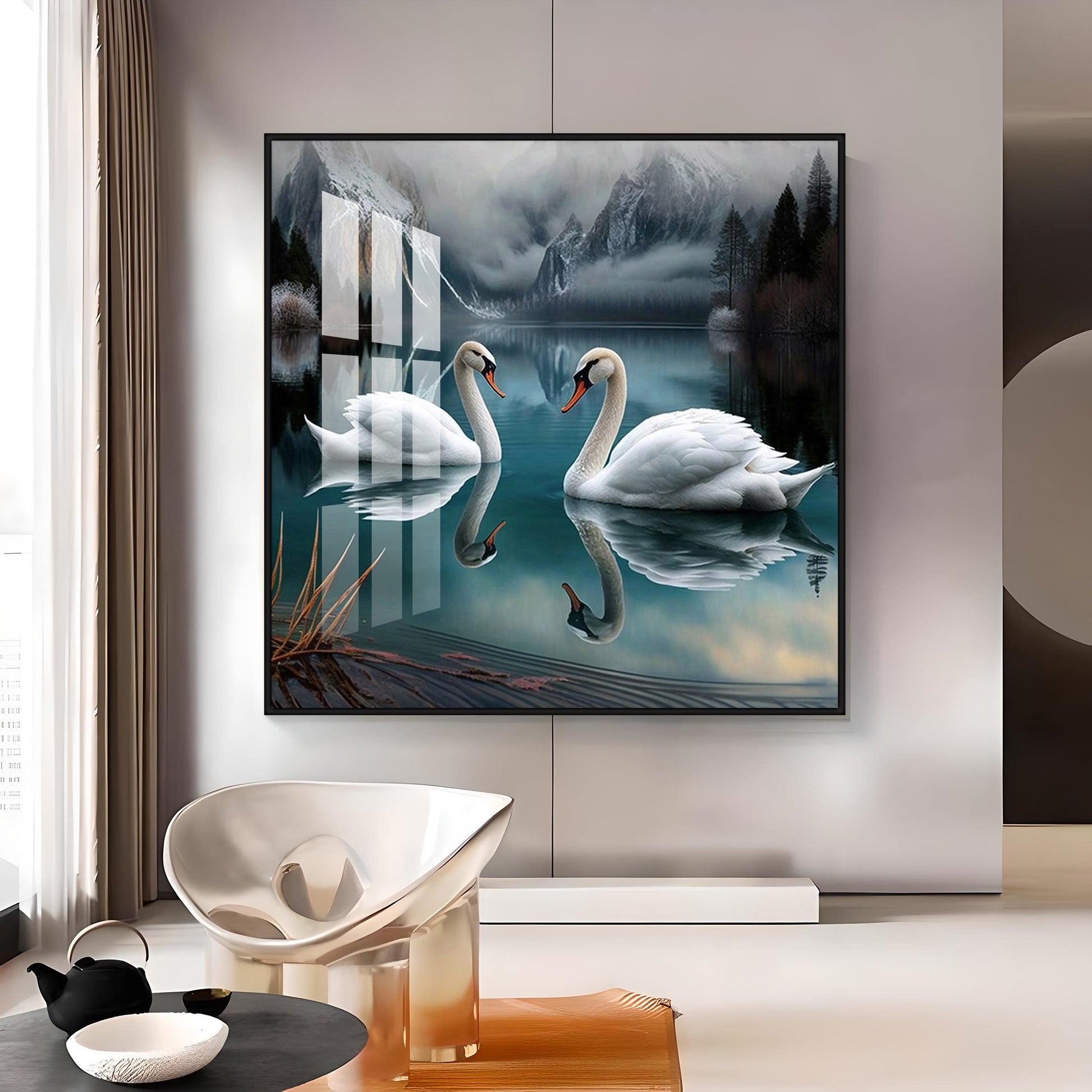 Graceful Swans in Water Glass Finish Square Wall Art