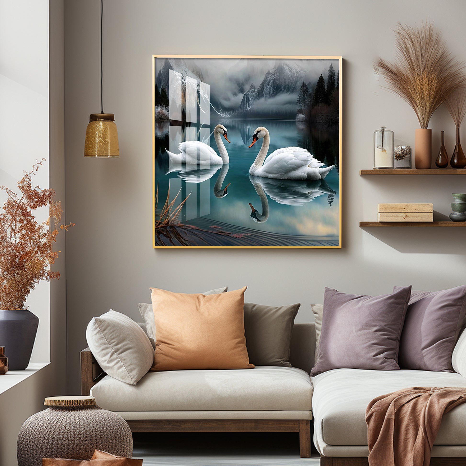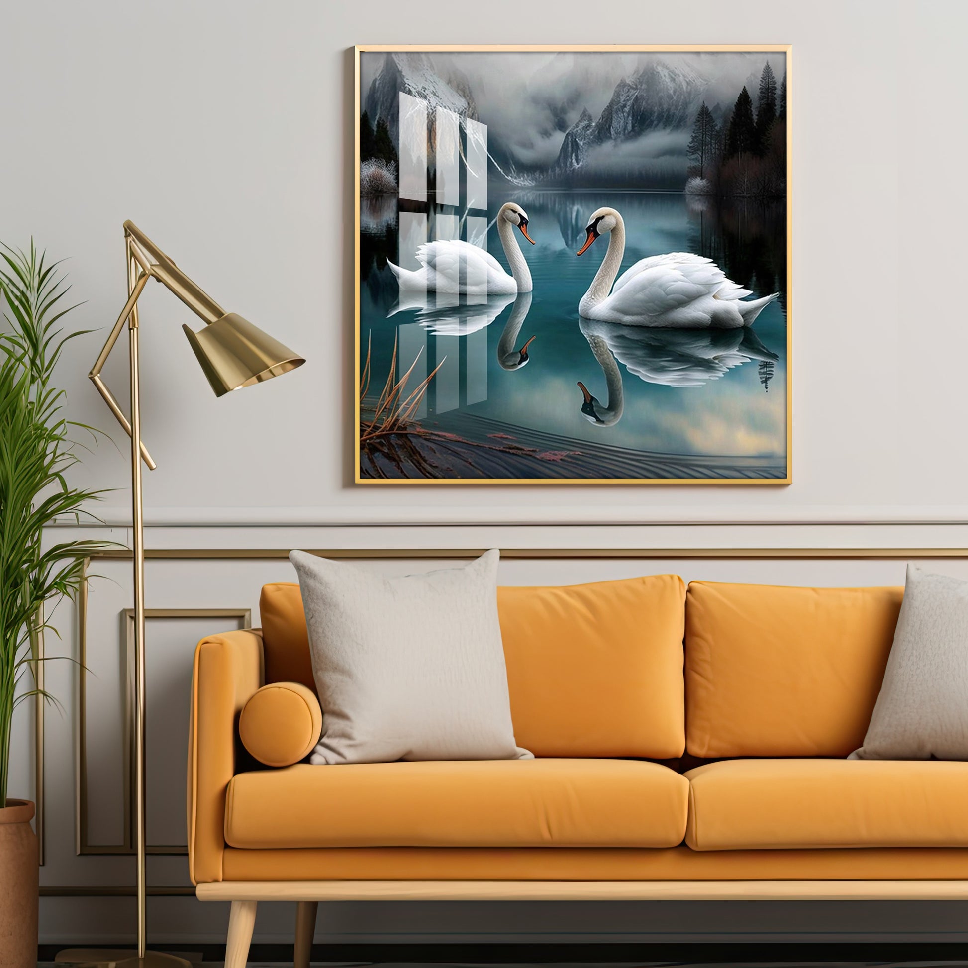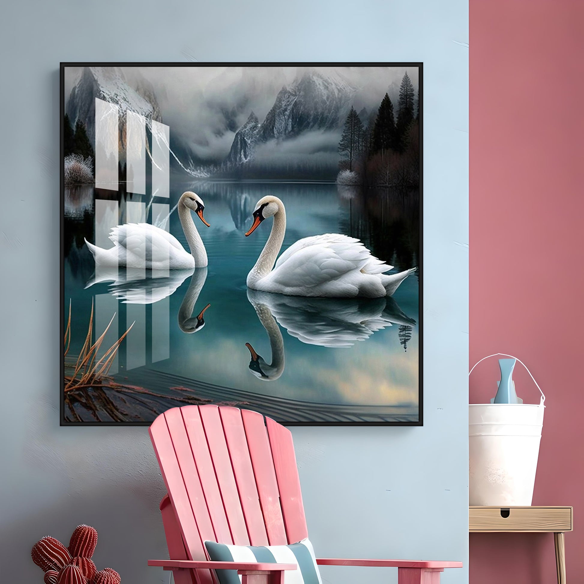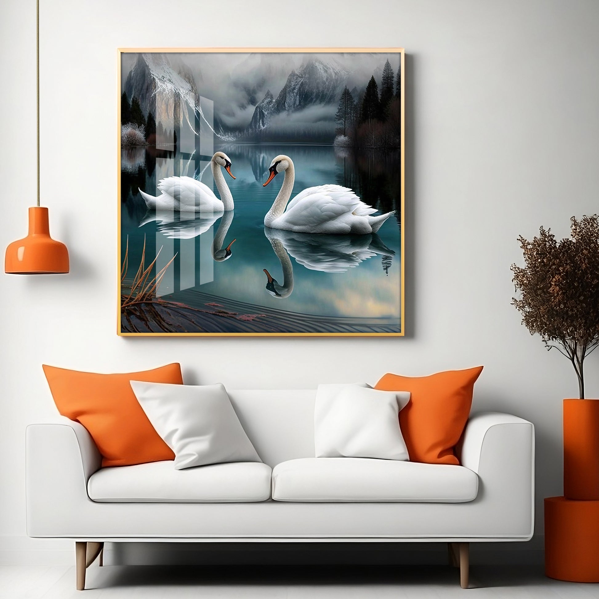 Graceful Swans in Water Glass Finish Square Wall Art