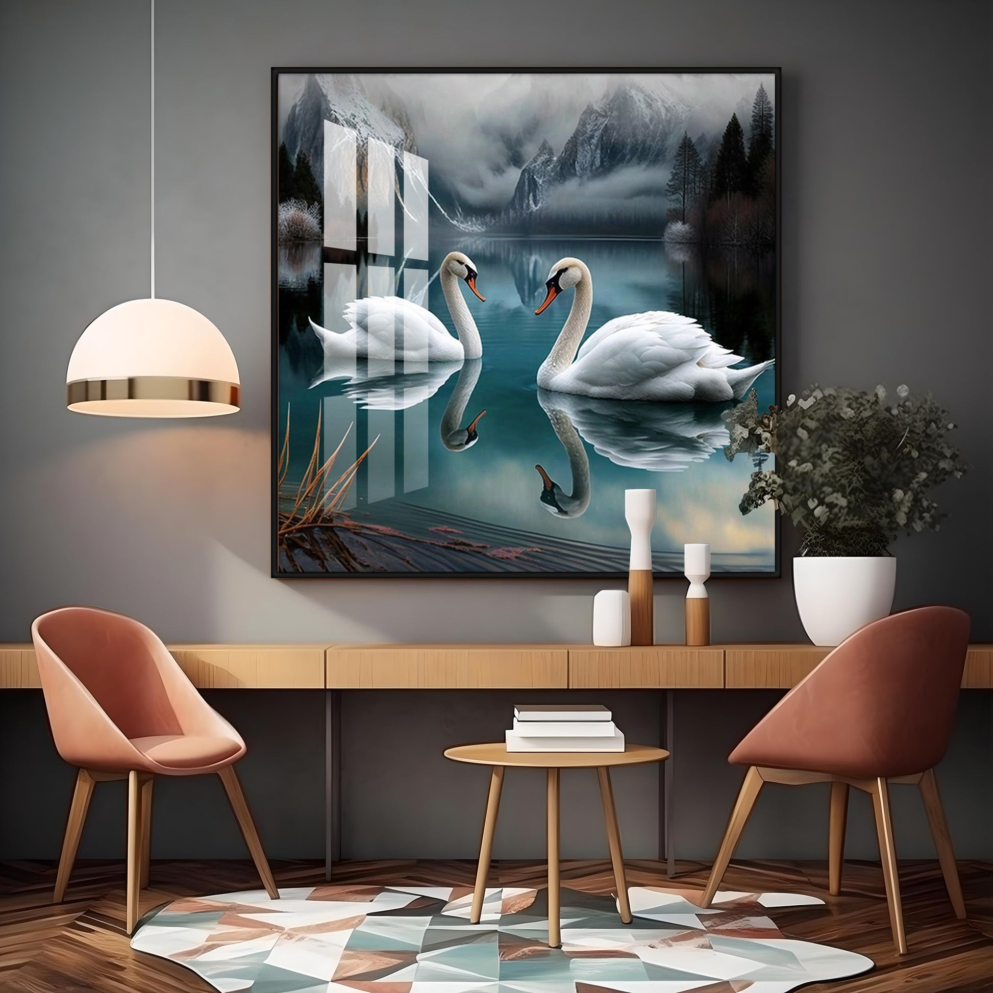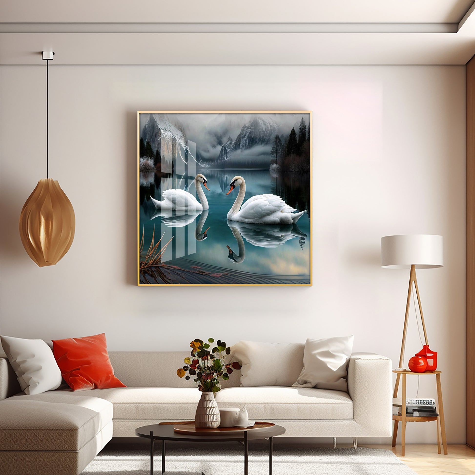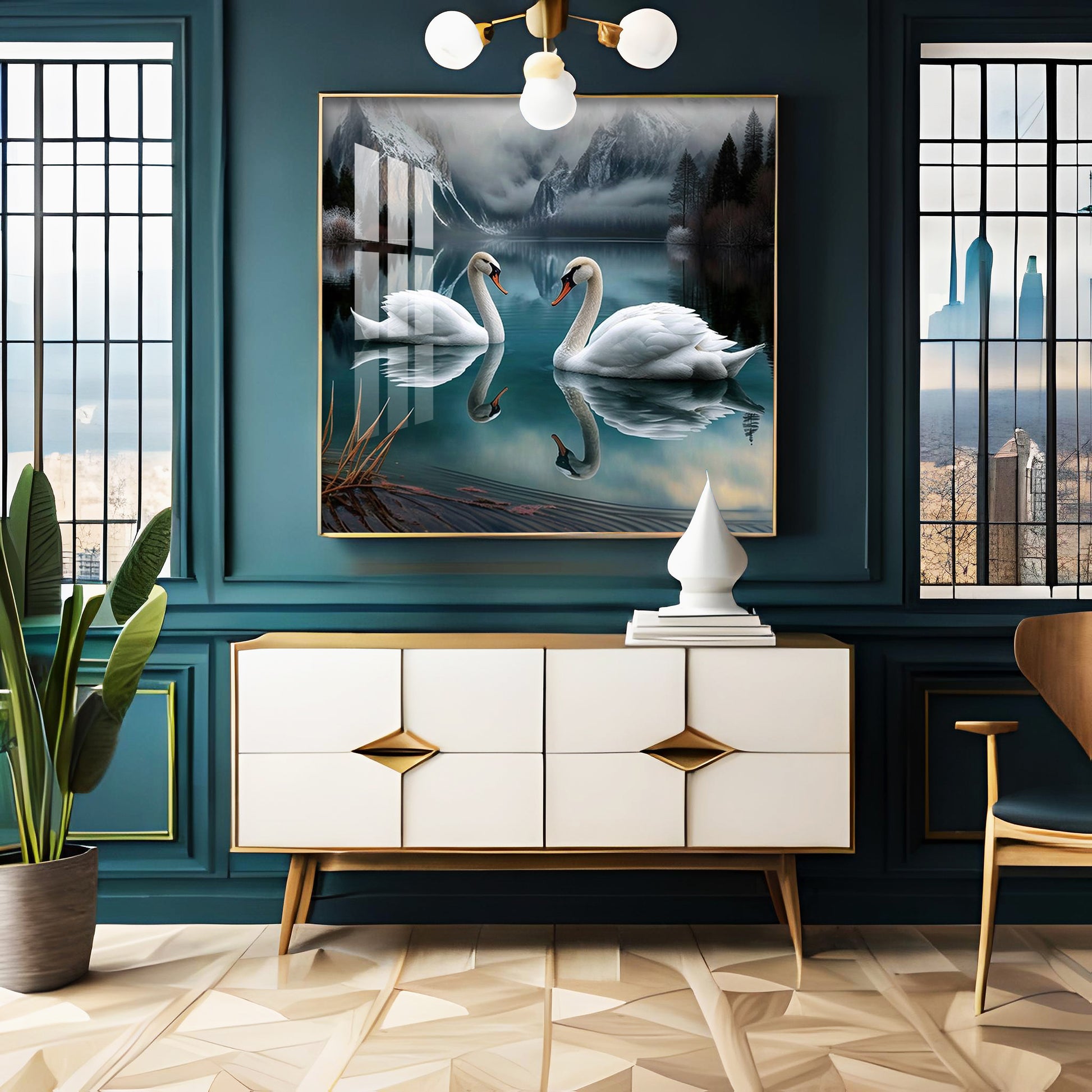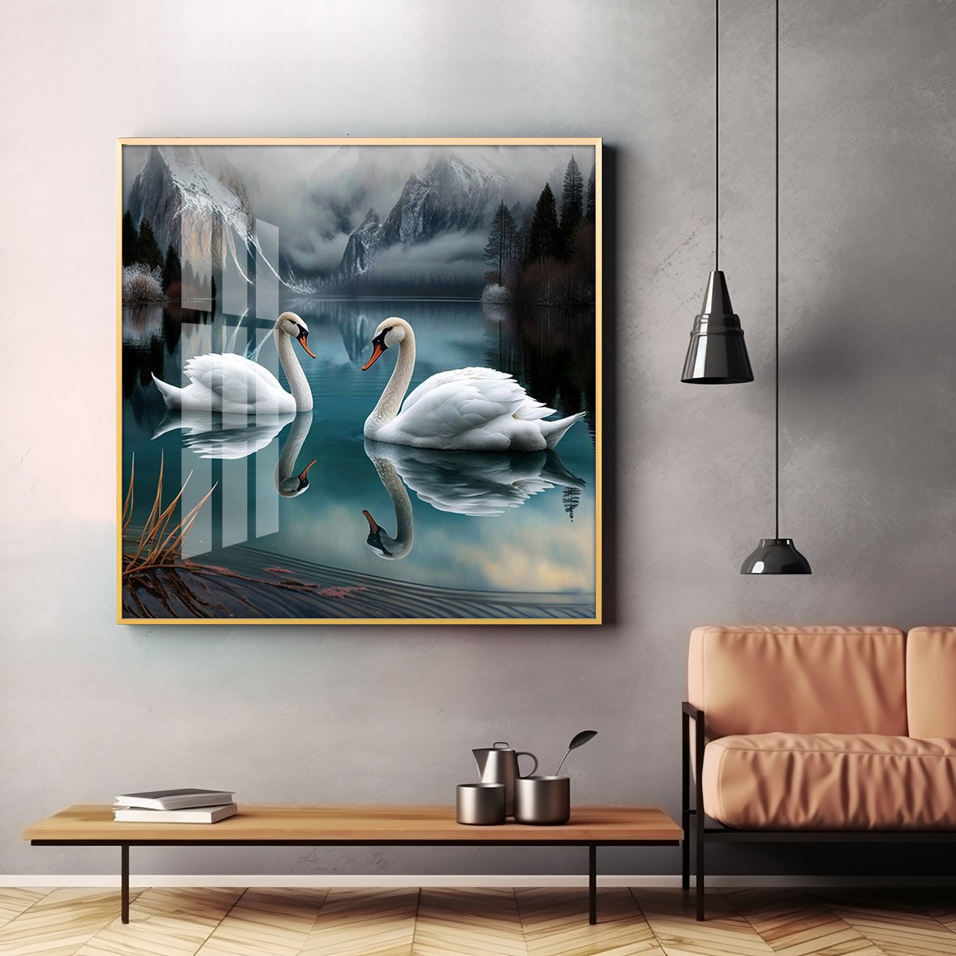 Graceful Swans in Water Glass Finish Square Wall Art
