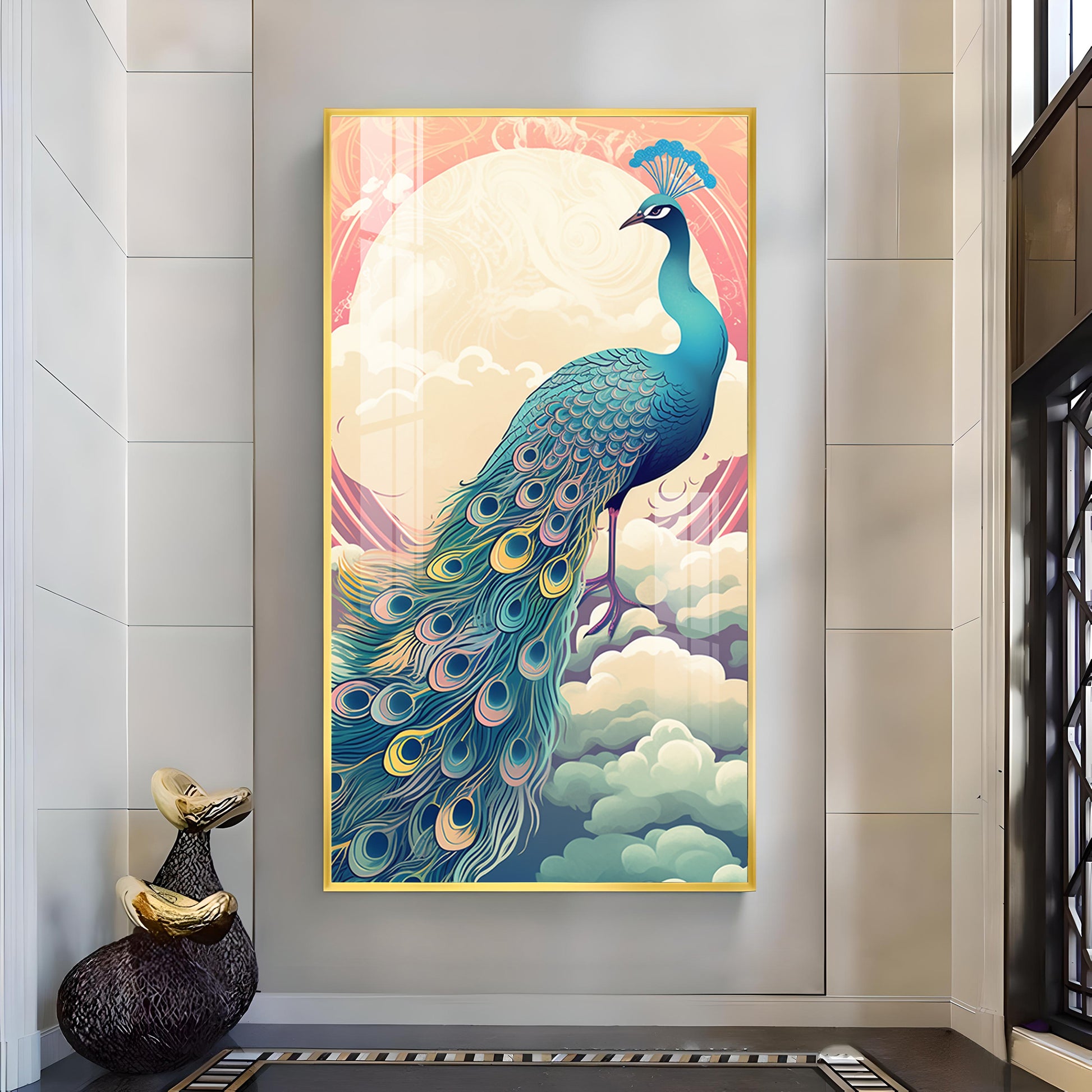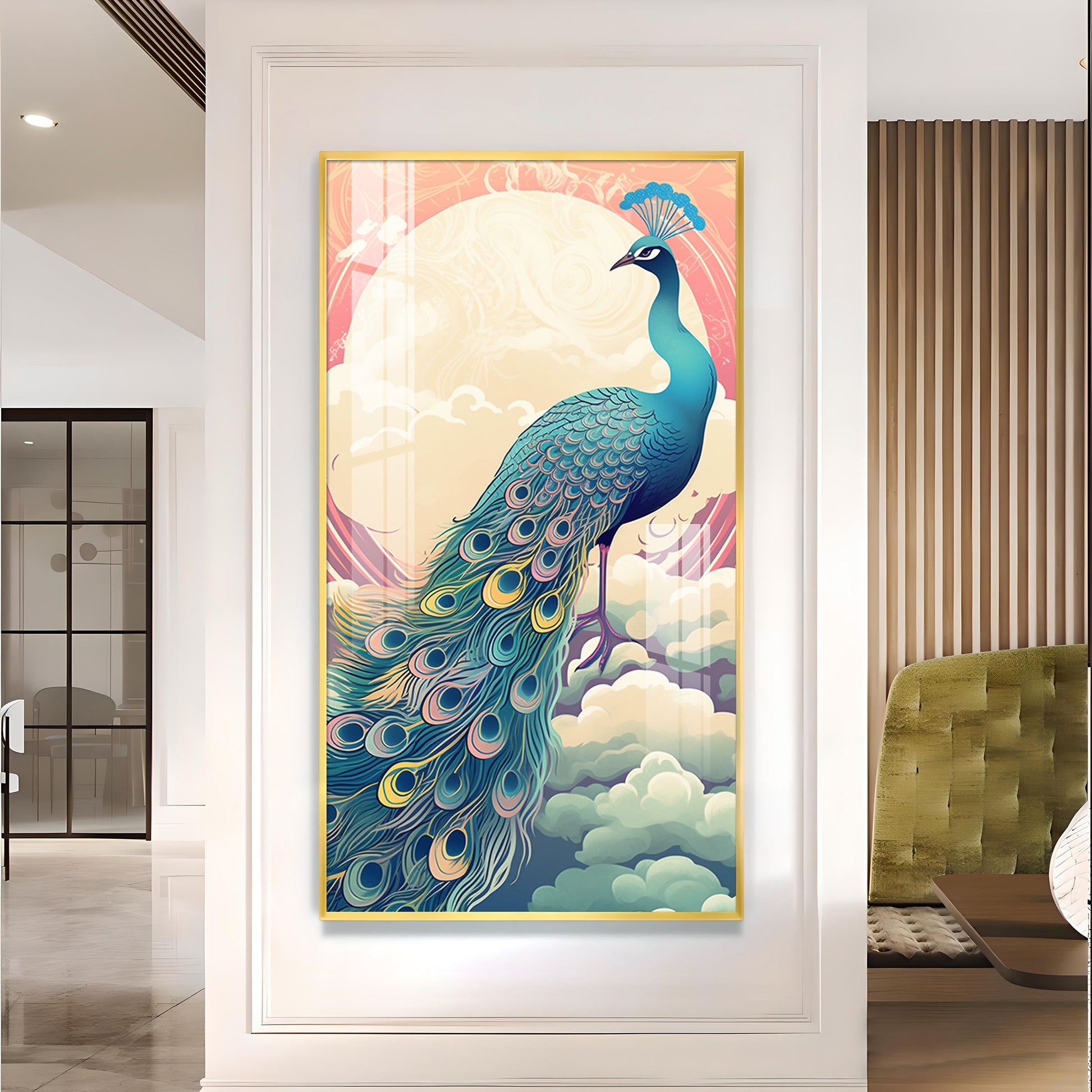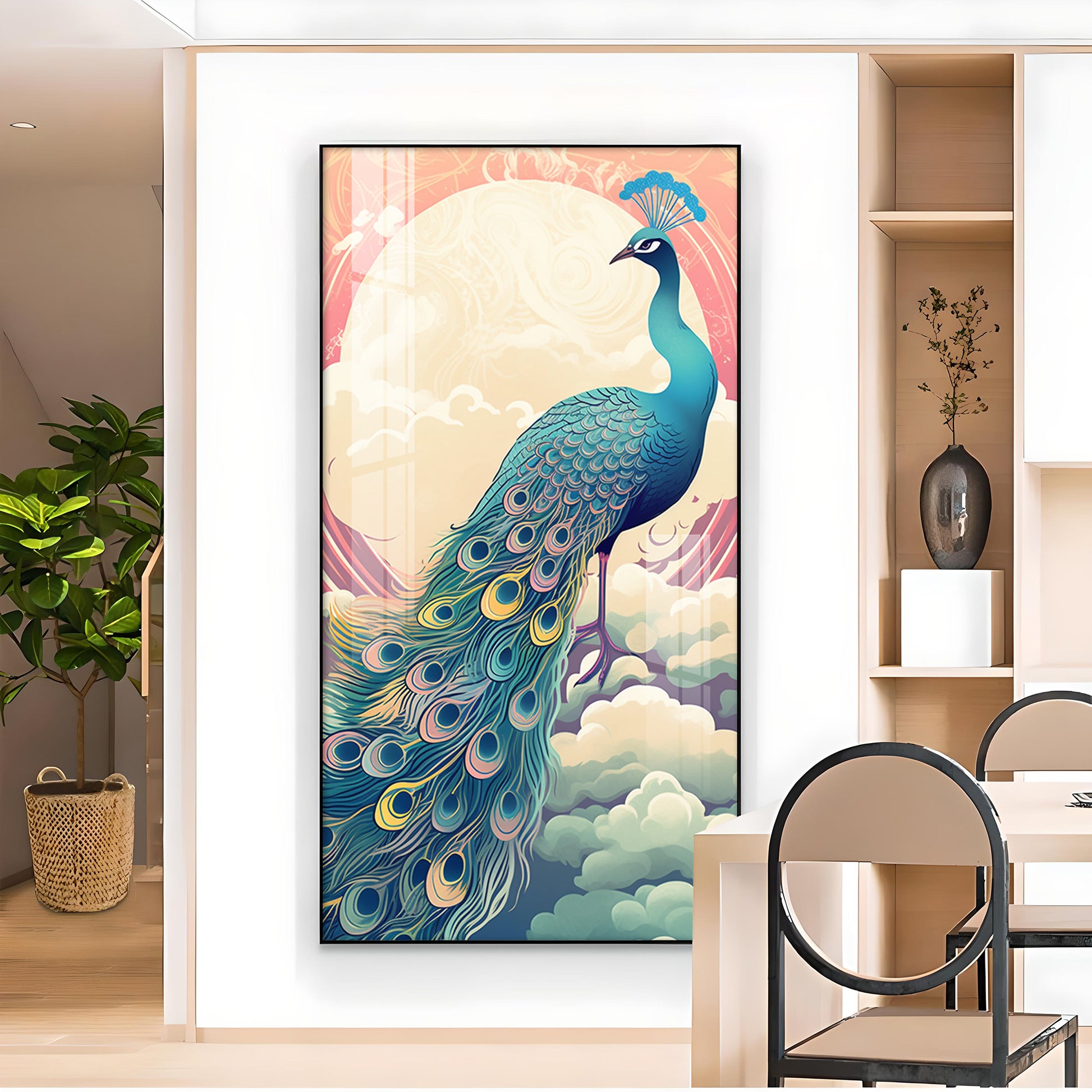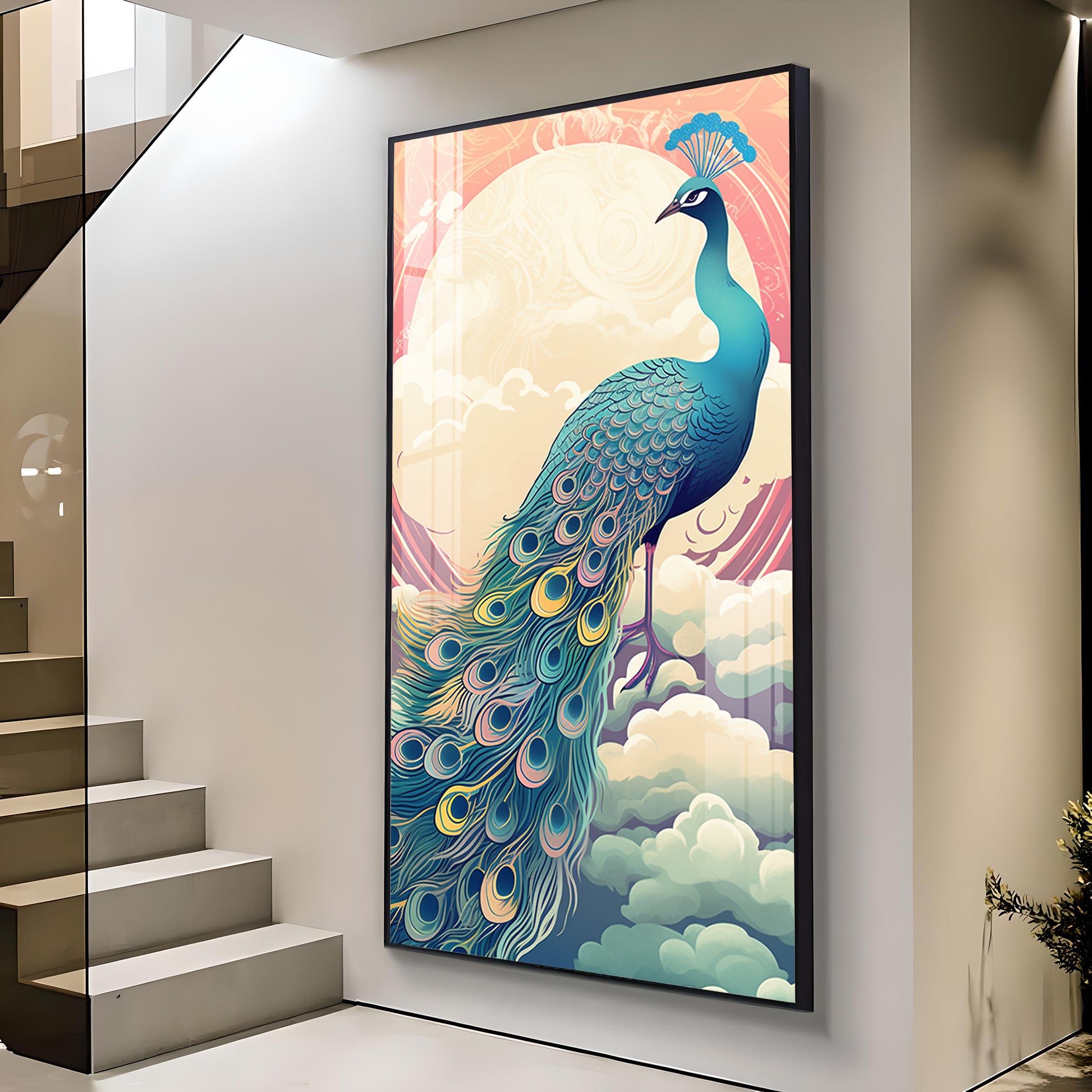 Heavenly Peacock Vista Glass Finish Vertical Wall Art