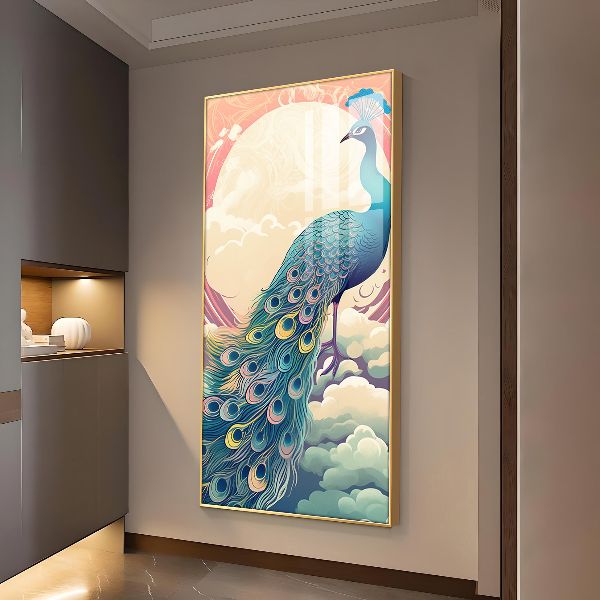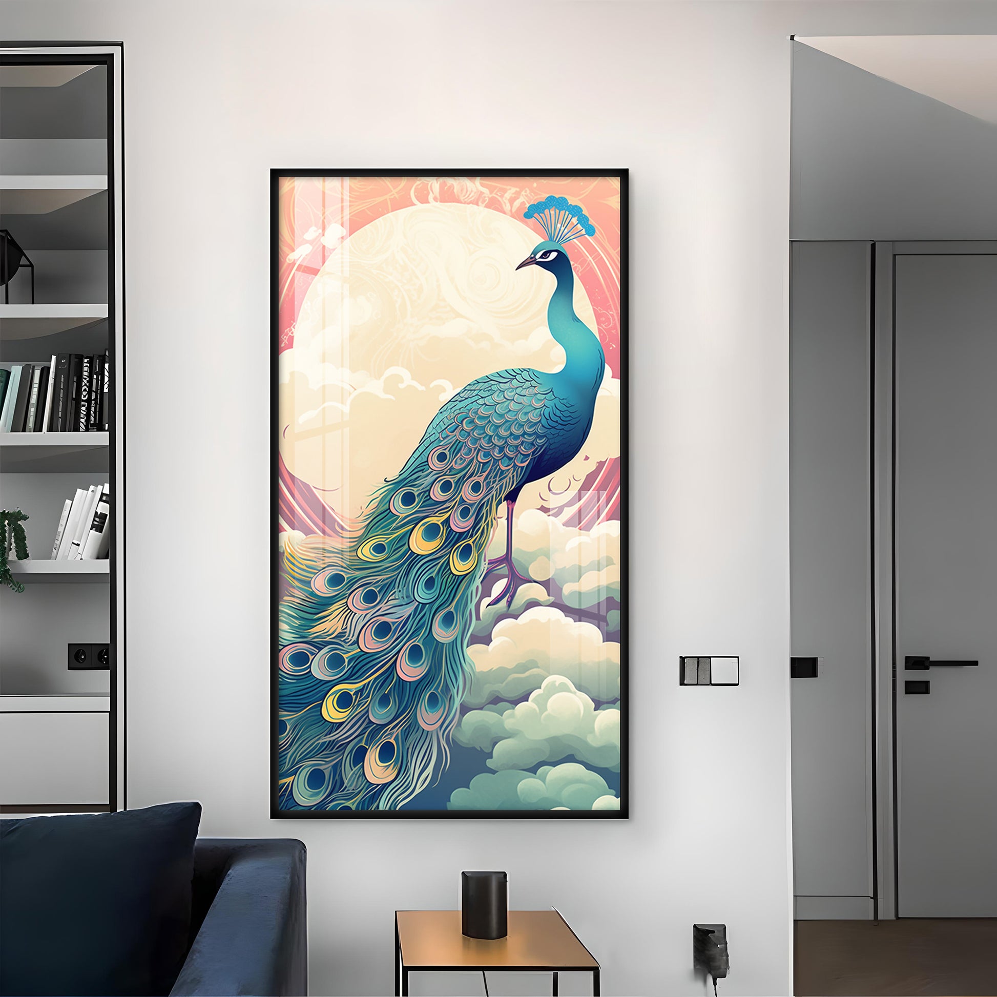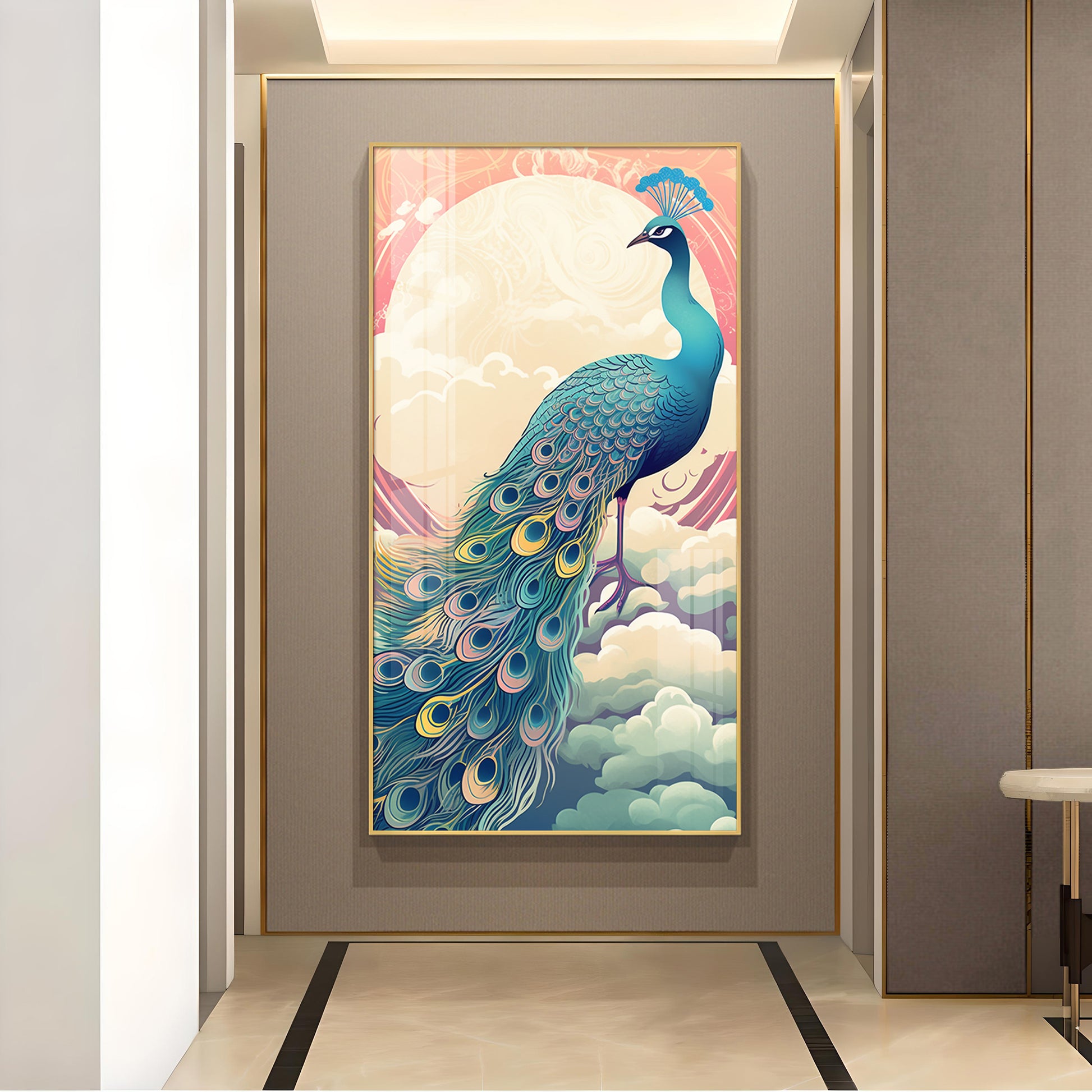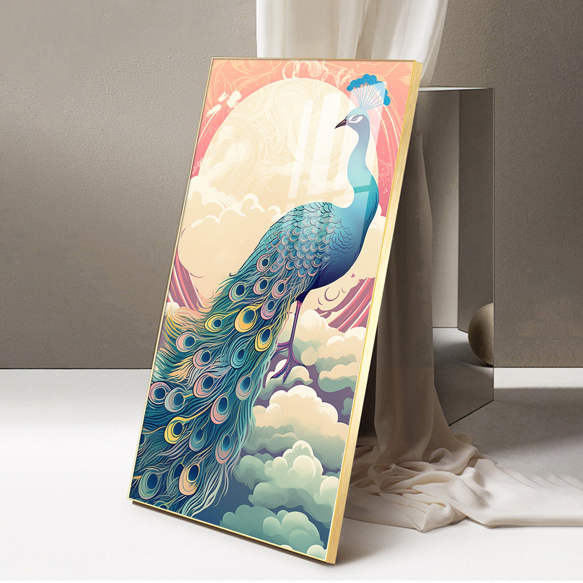 Heavenly Peacock Vista Glass Finish Vertical Wall Art