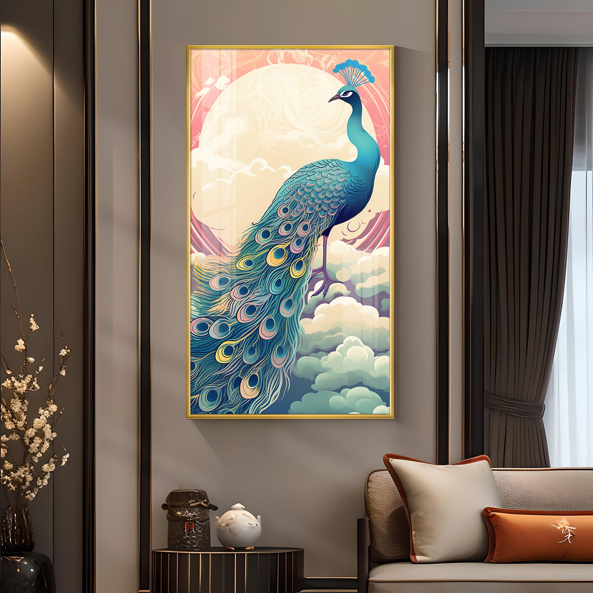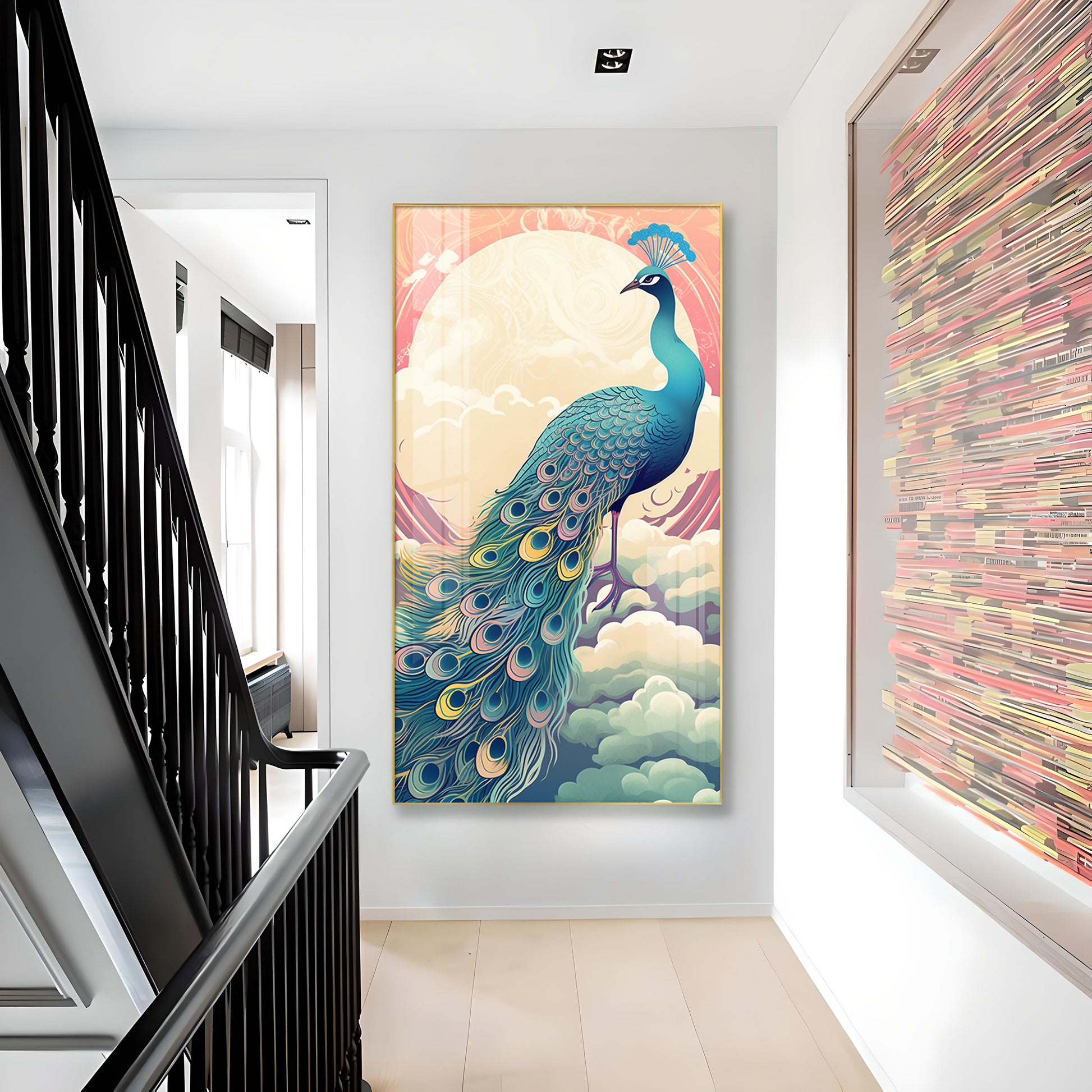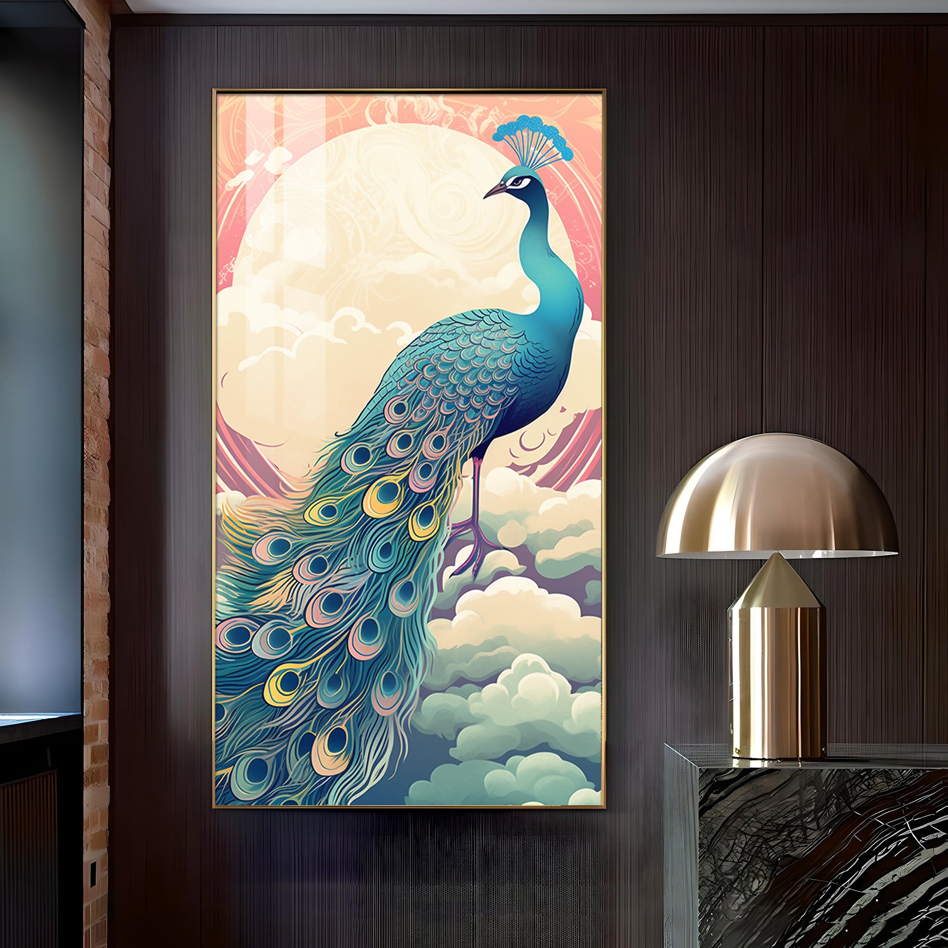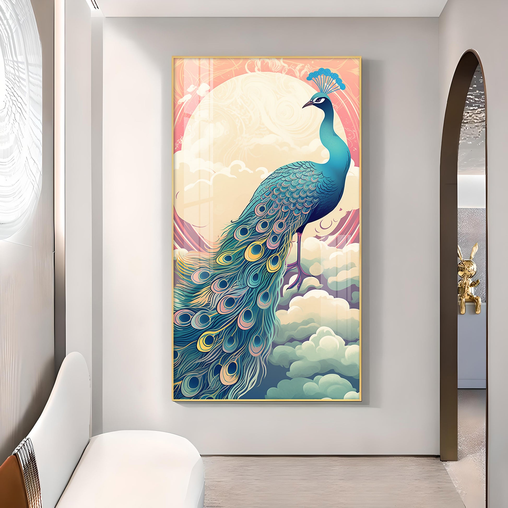 Heavenly Peacock Vista Glass Finish Vertical Wall Art