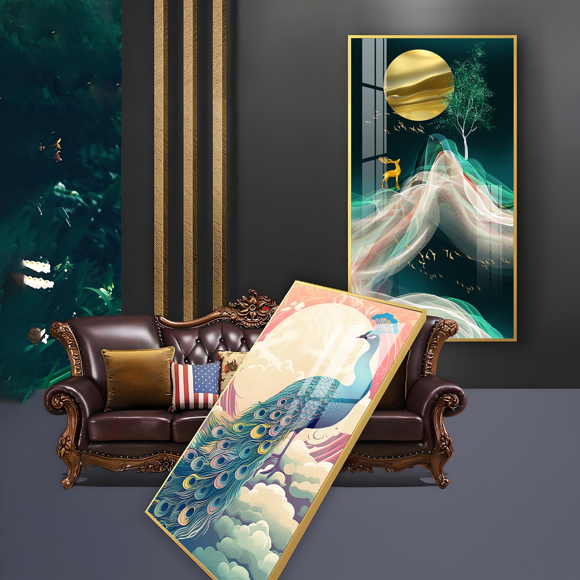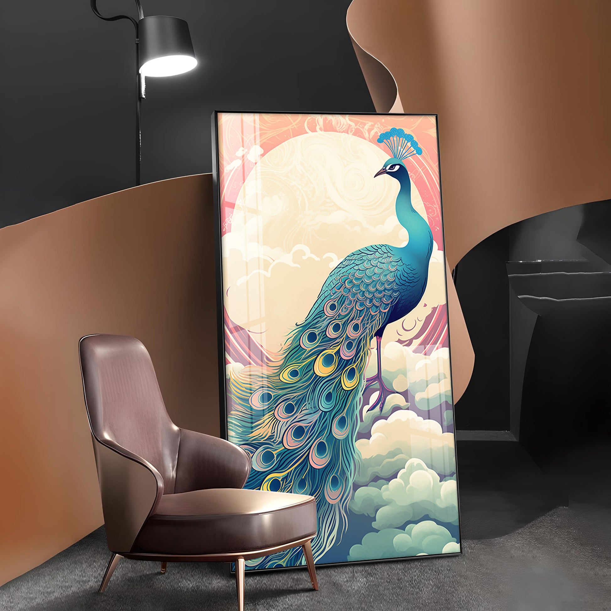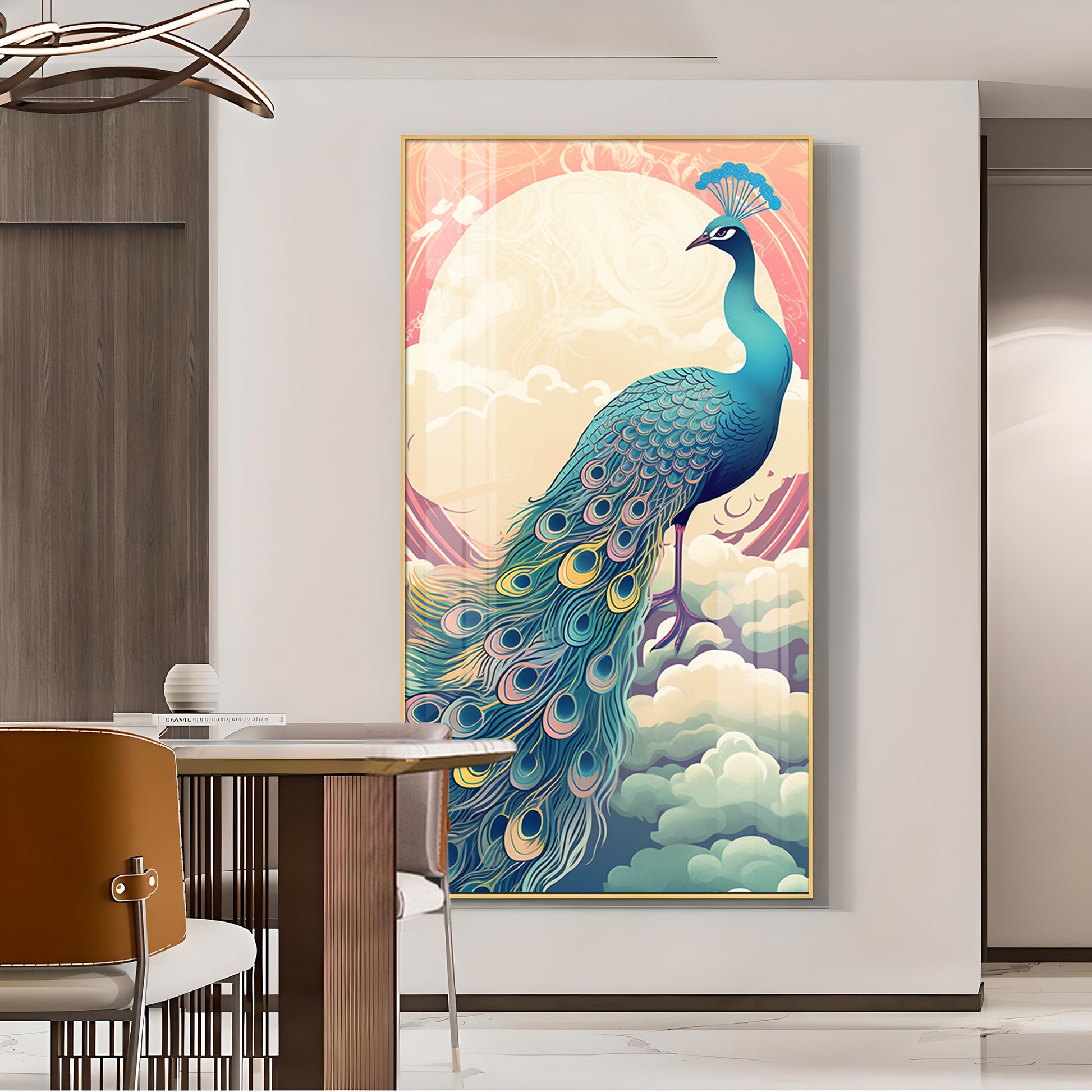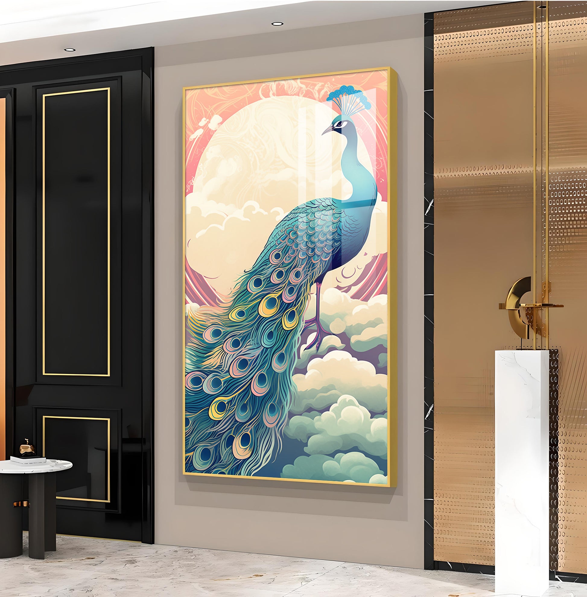 Heavenly Peacock Vista Glass Finish Vertical Wall Art