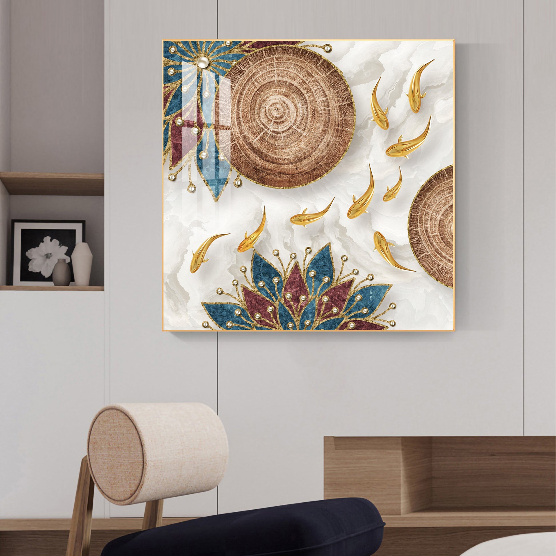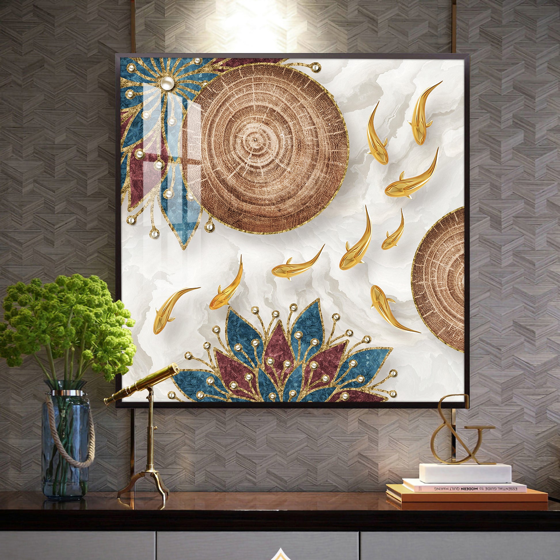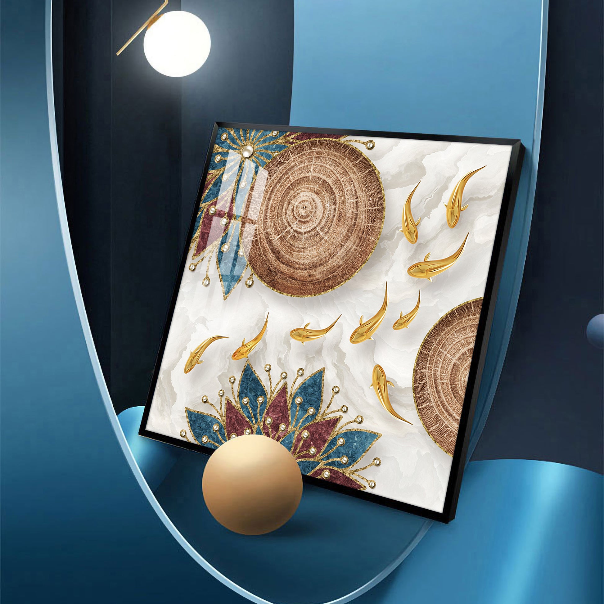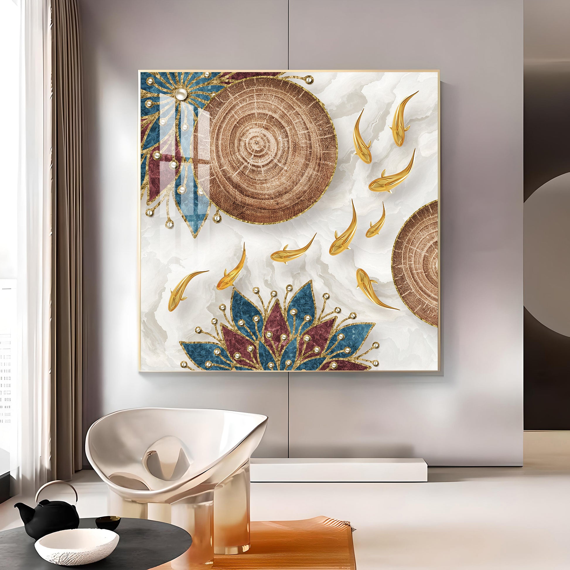 Ivory and Gold Fish Harmony Glass Finish Square Wall Art