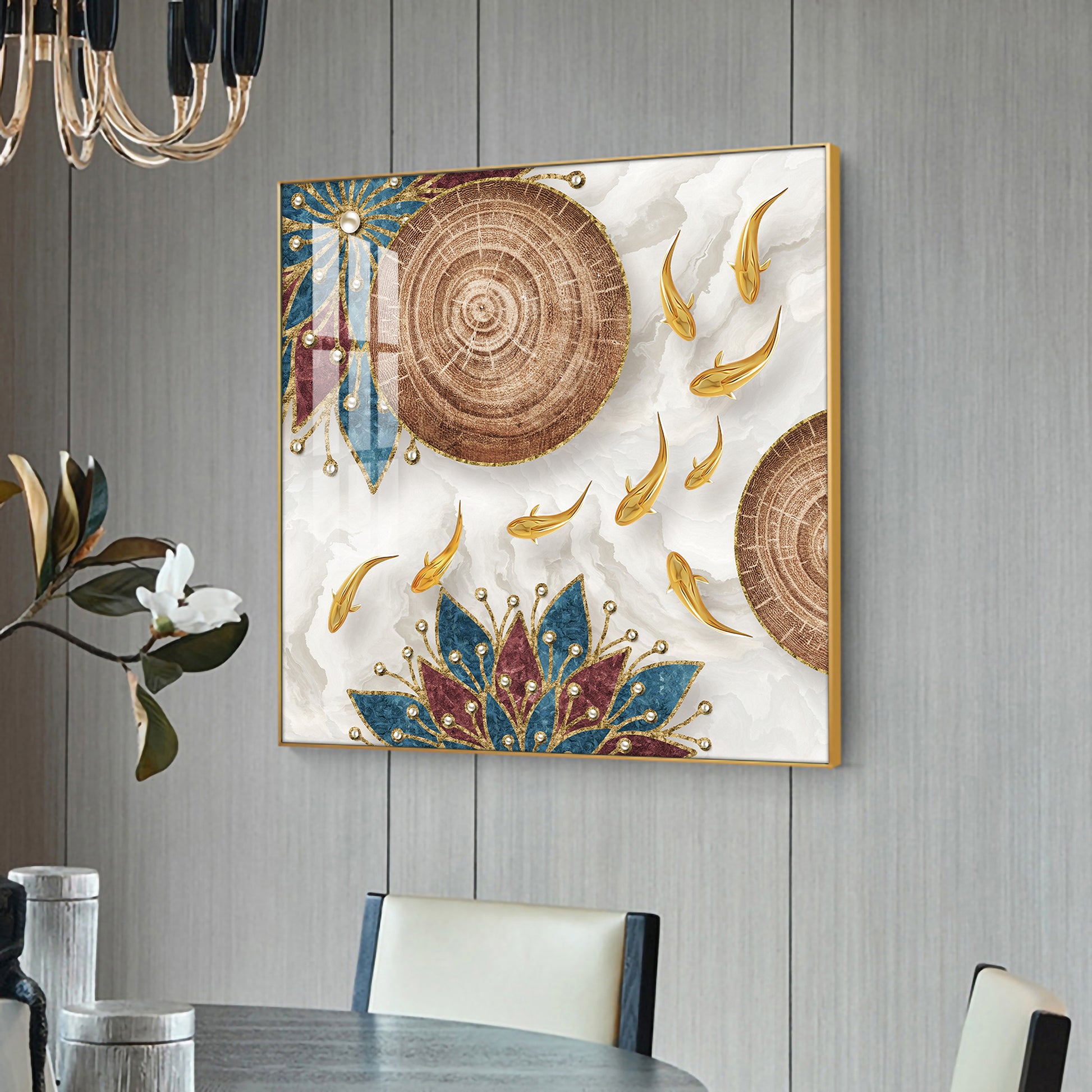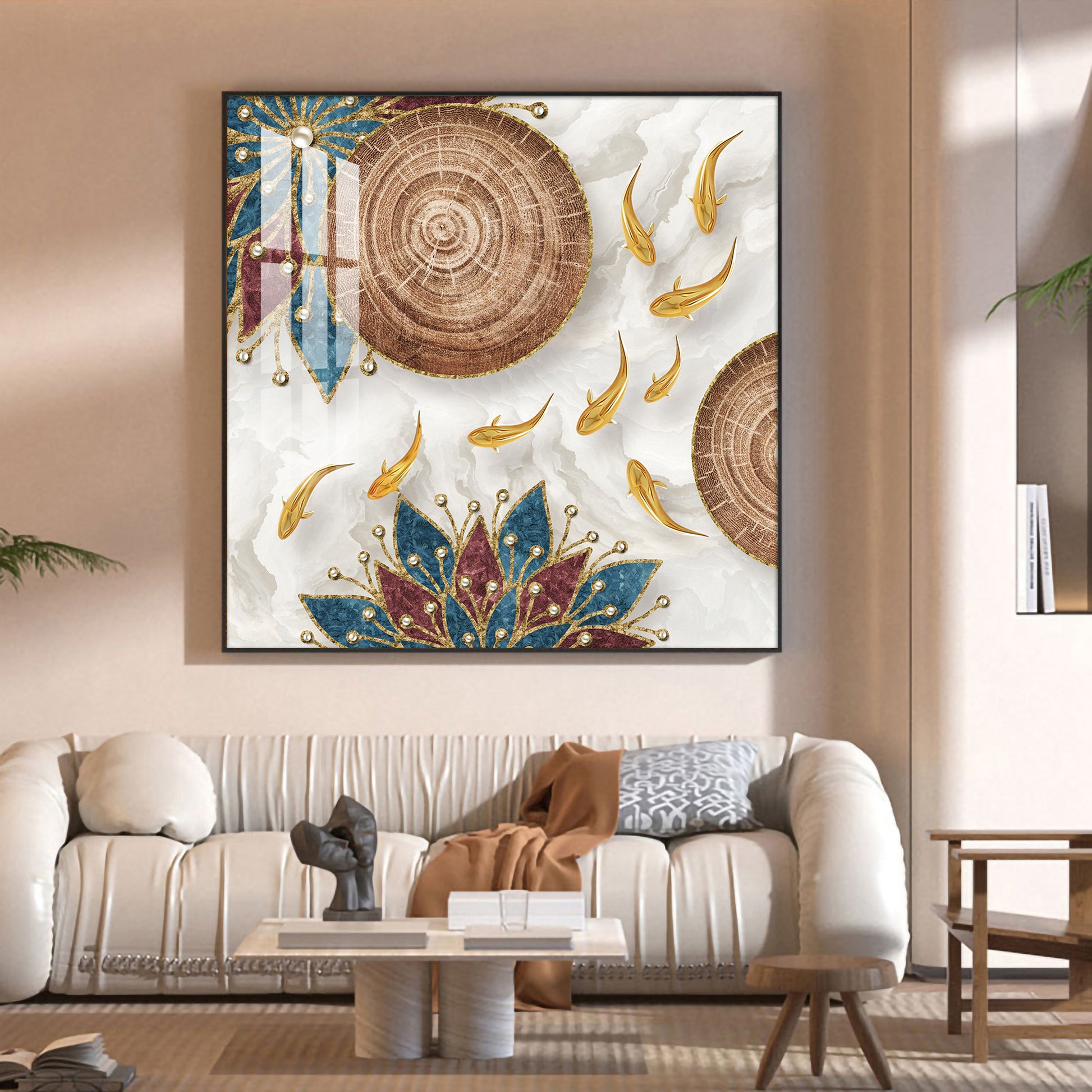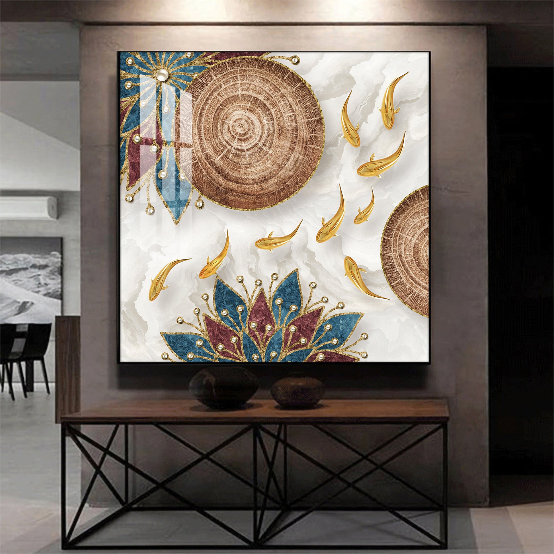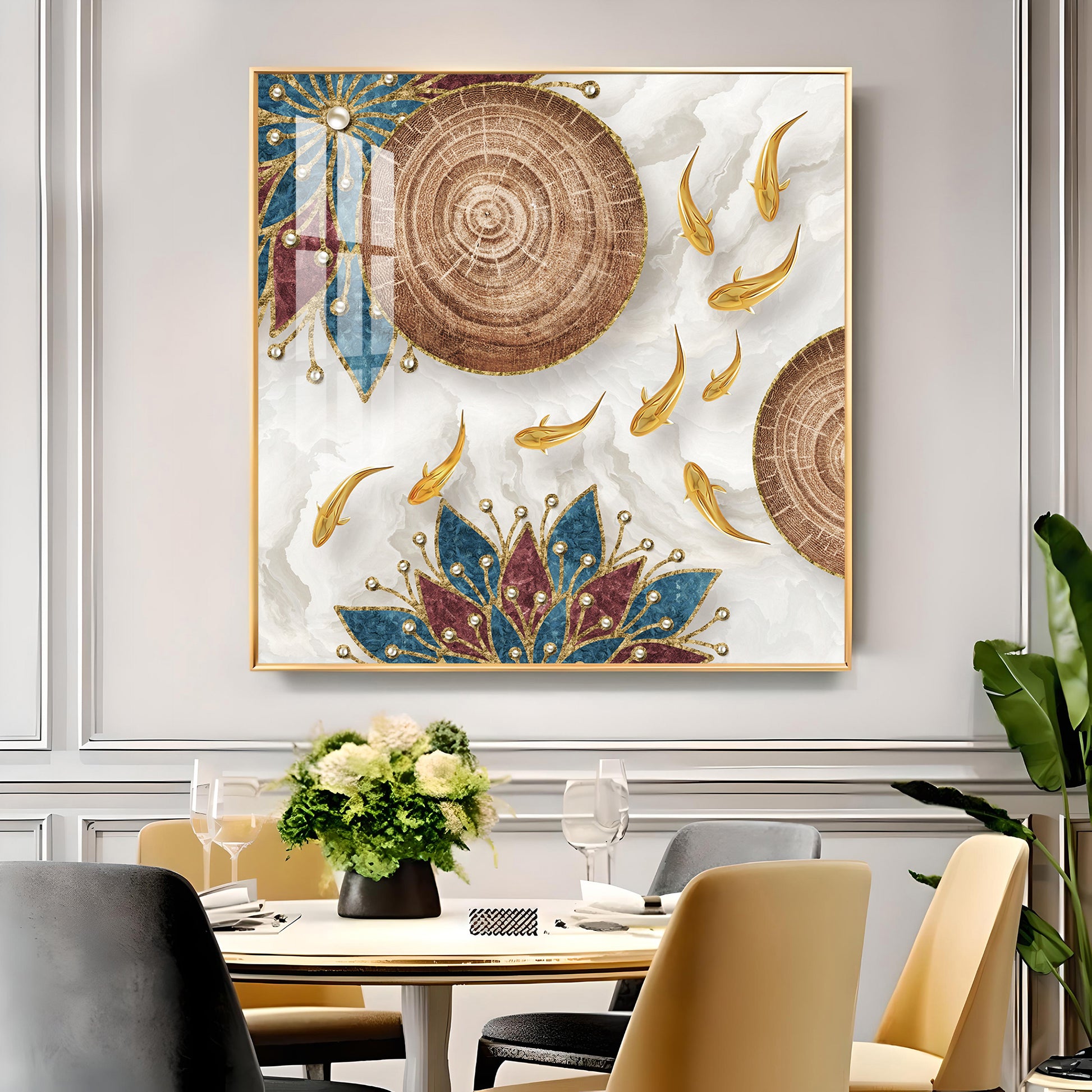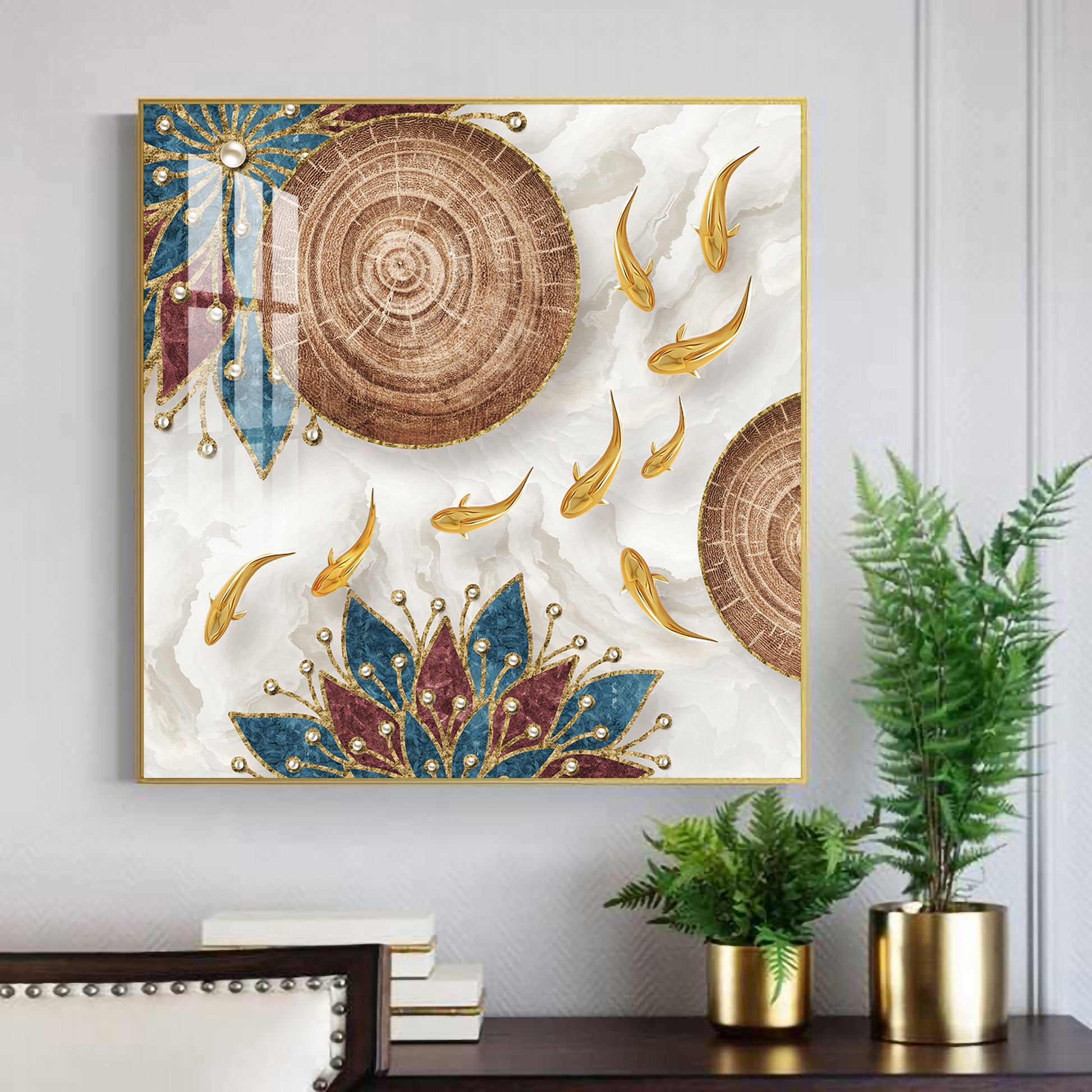 Ivory and Gold Fish Harmony Glass Finish Square Wall Art
