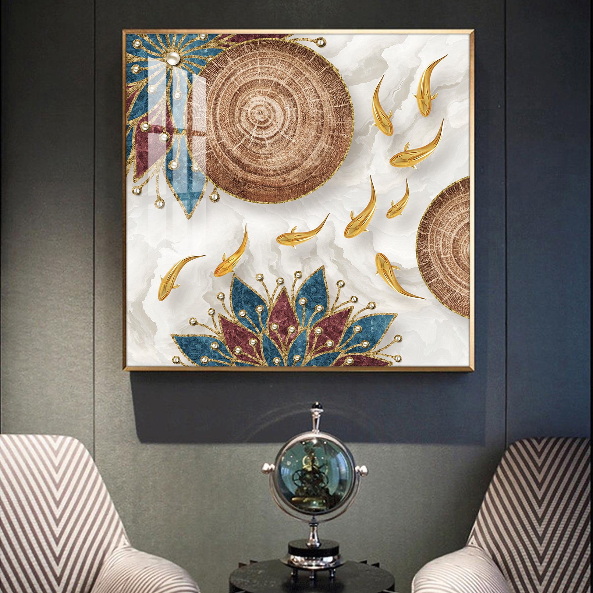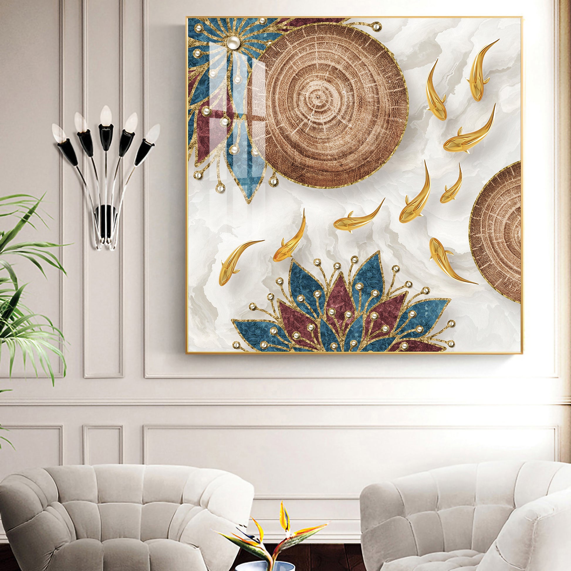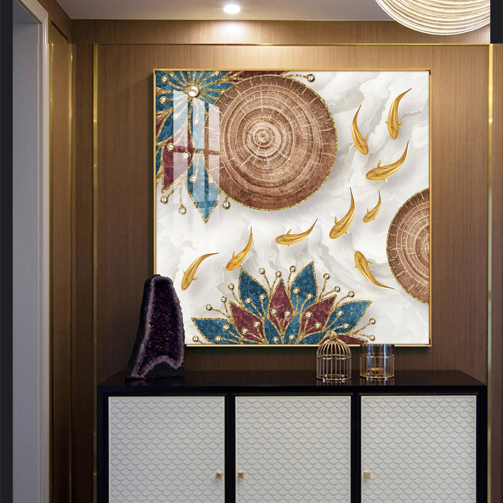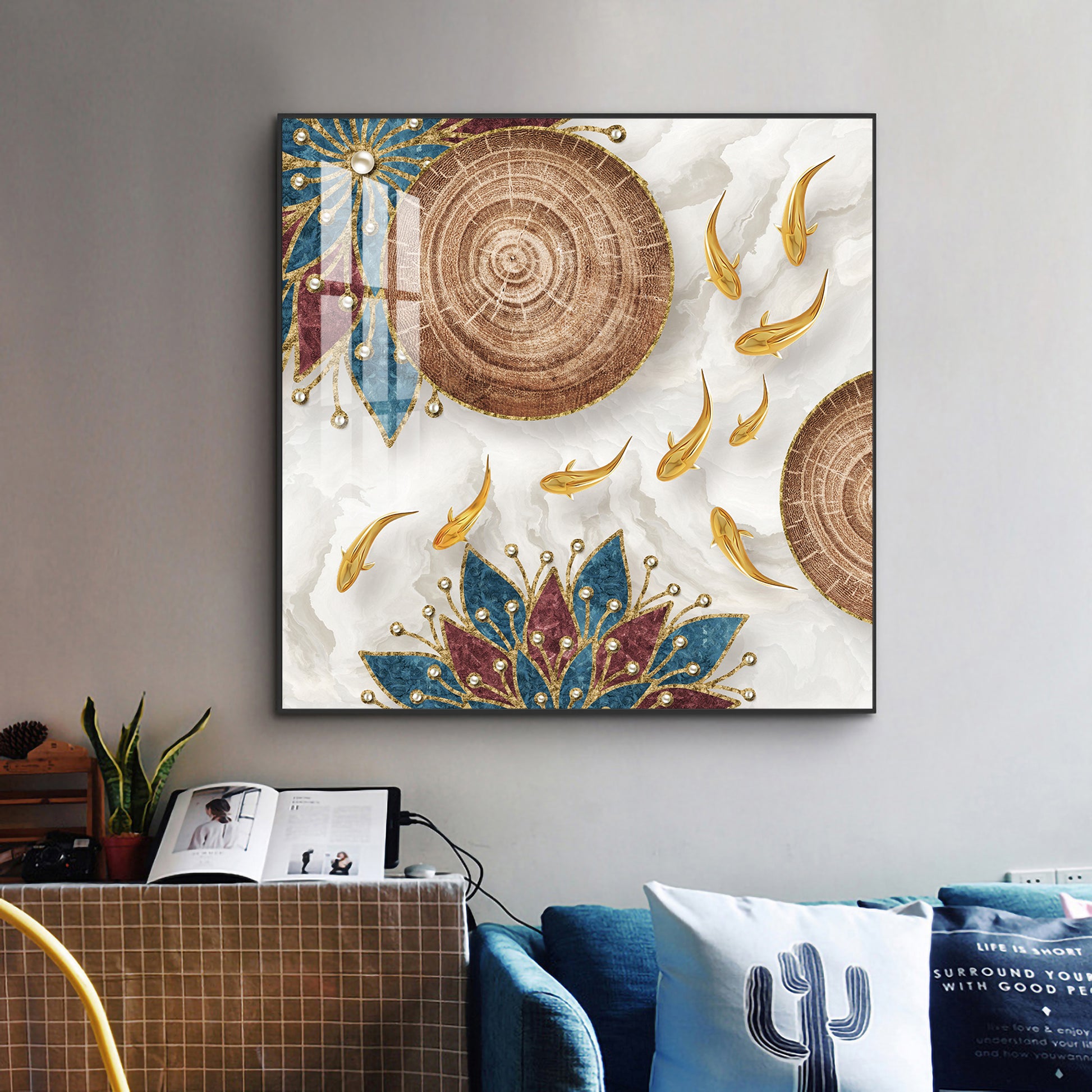 Ivory and Gold Fish Harmony Glass Finish Square Wall Art