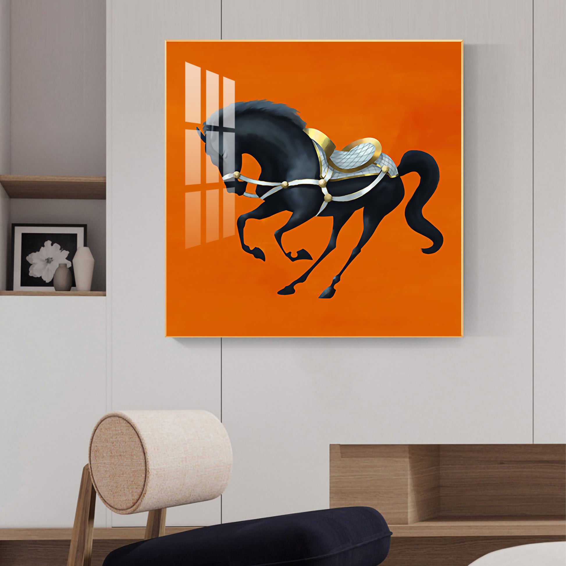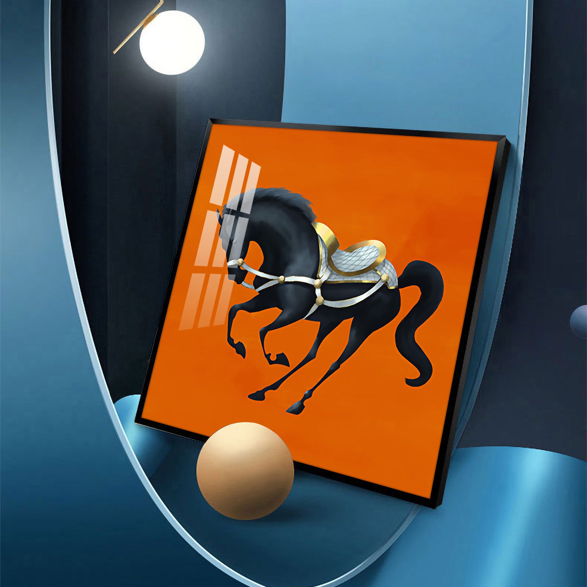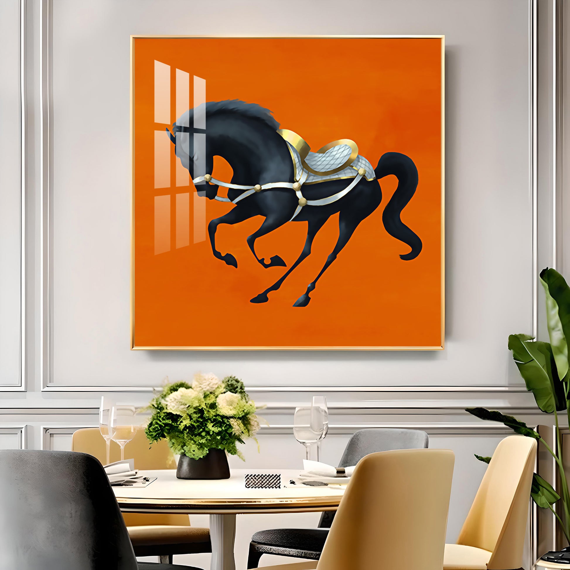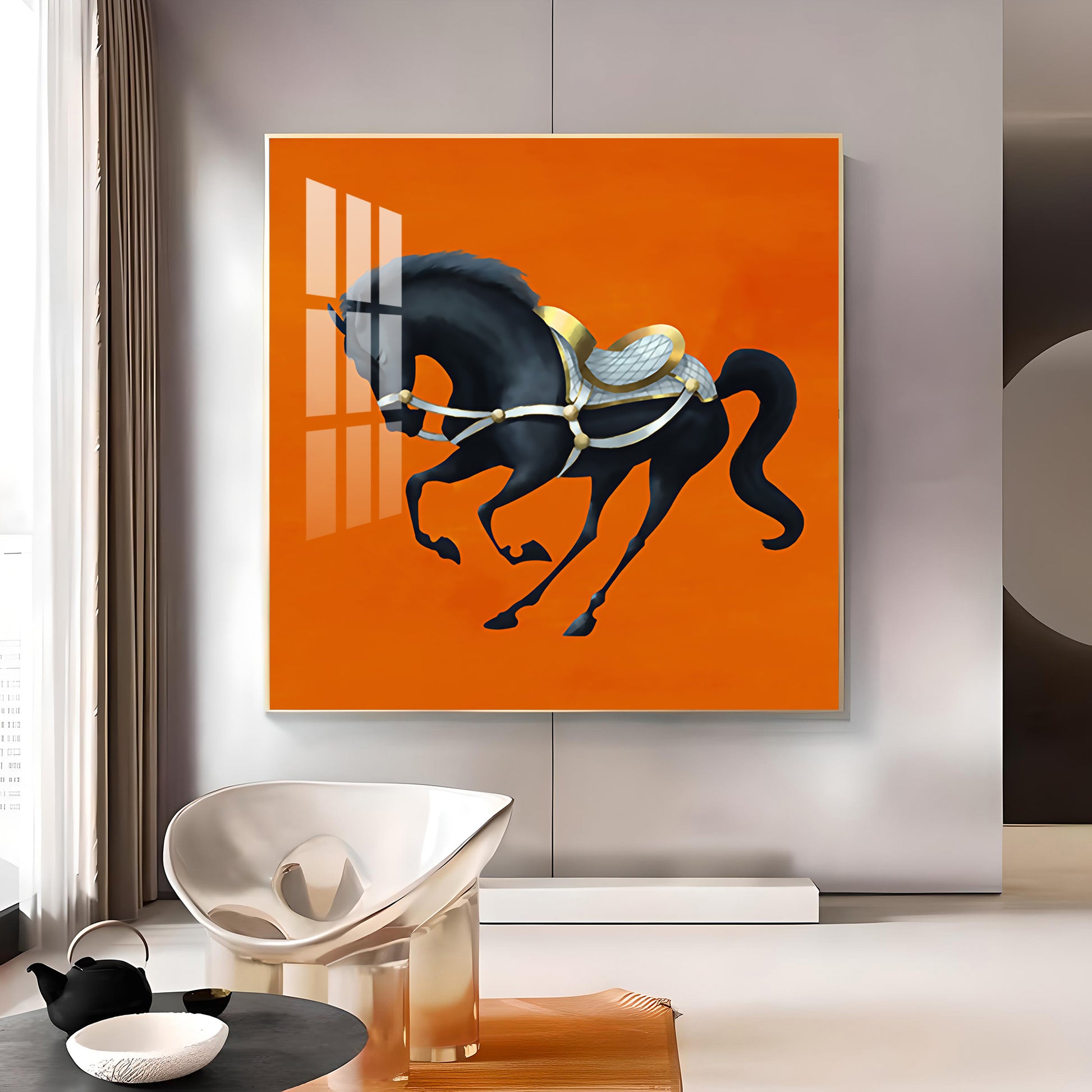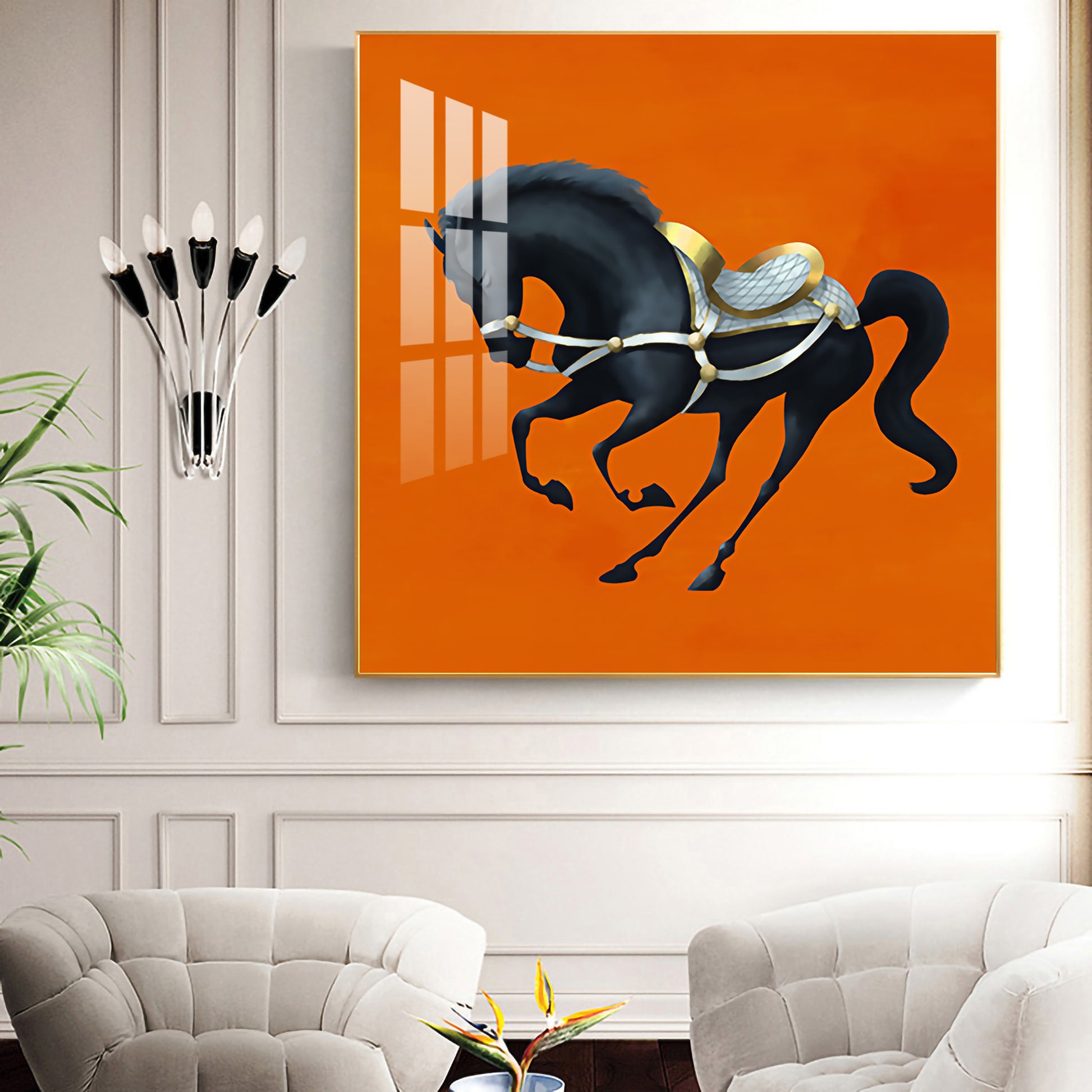 Jumping Horse In Orange Horizon Glass Finish Square Wall Art