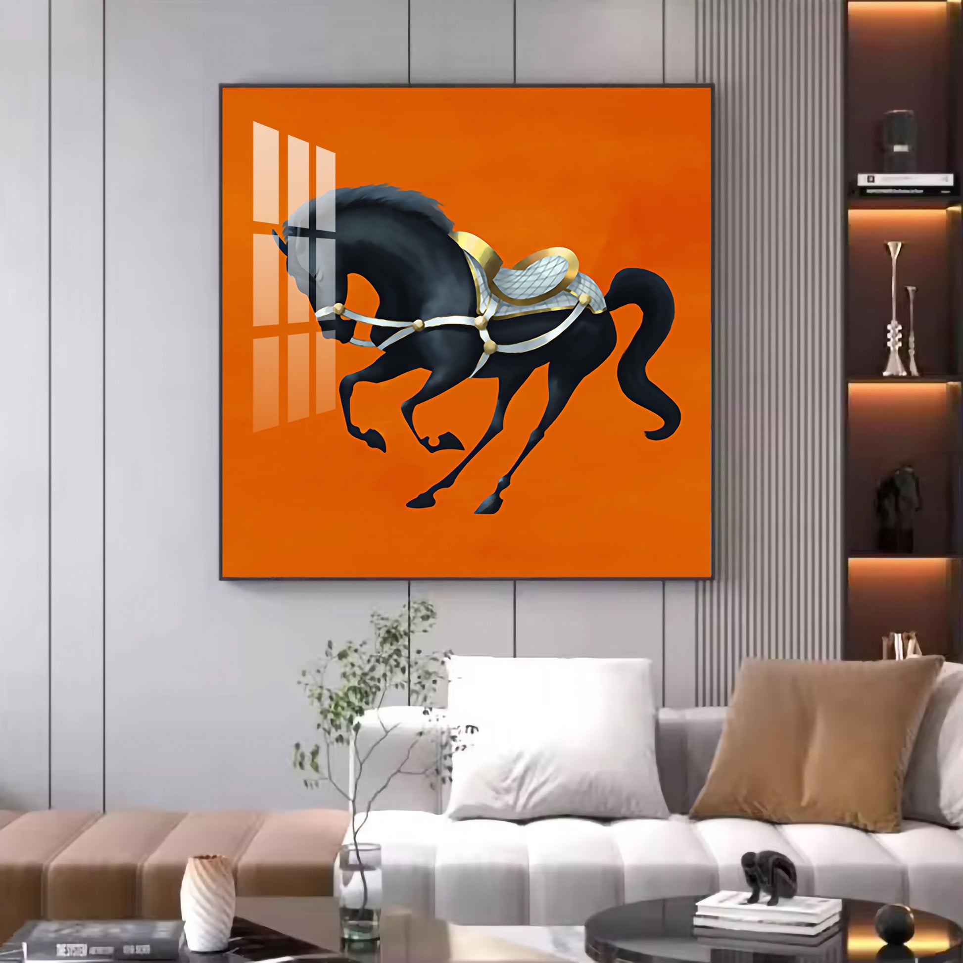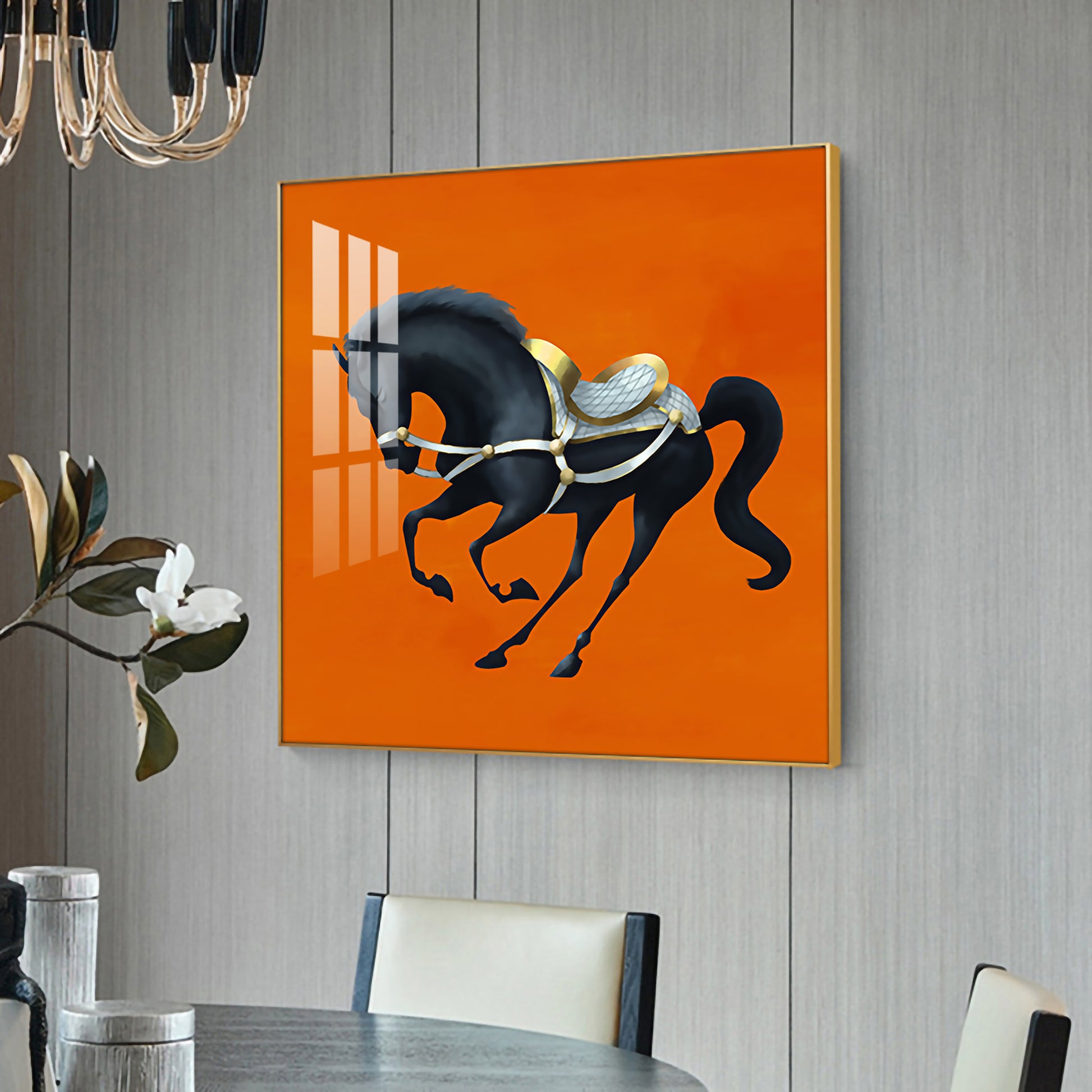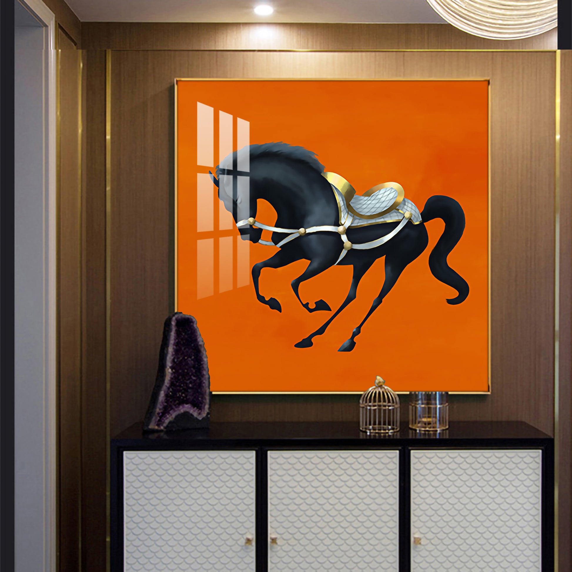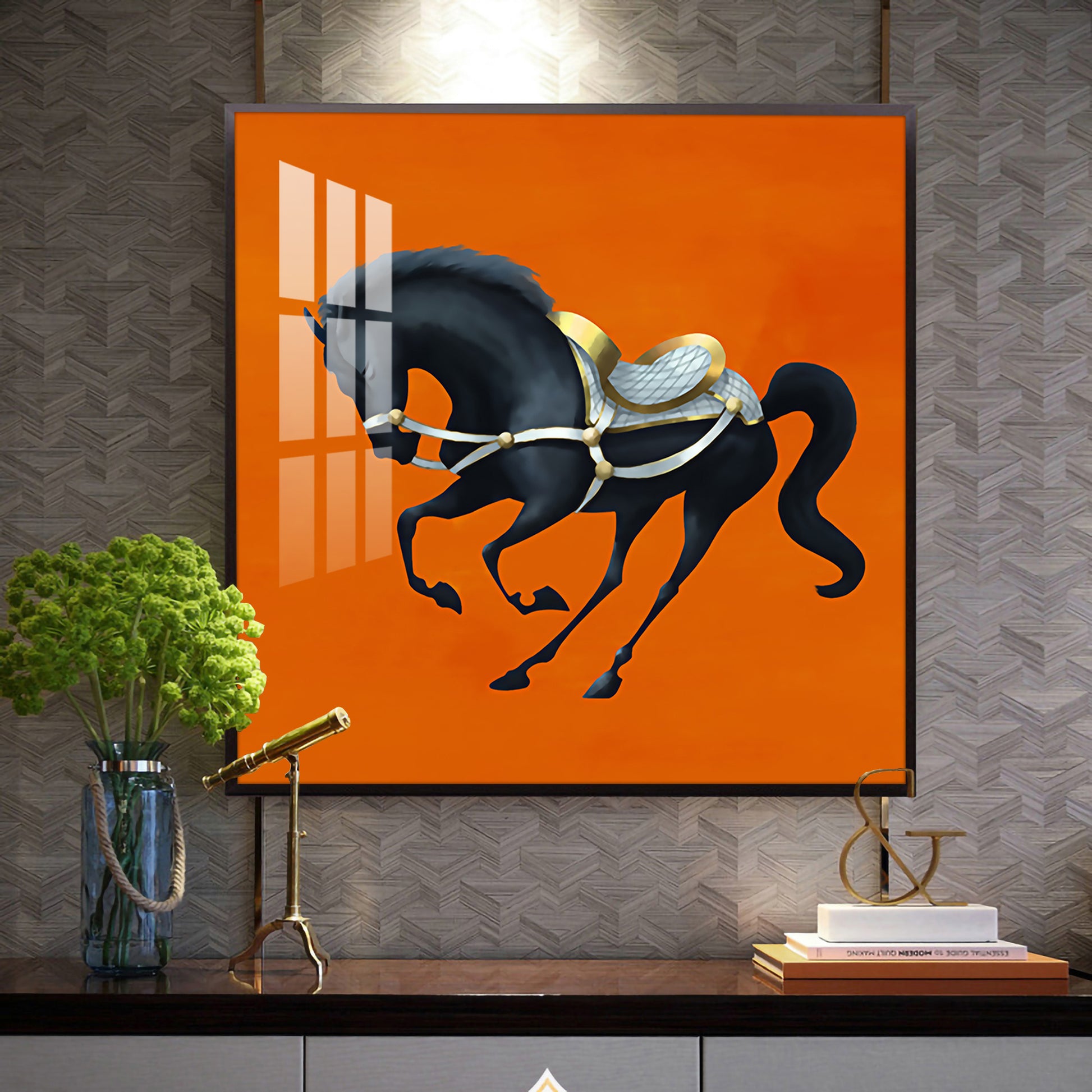 Jumping Horse In Orange Horizon Glass Finish Square Wall Art