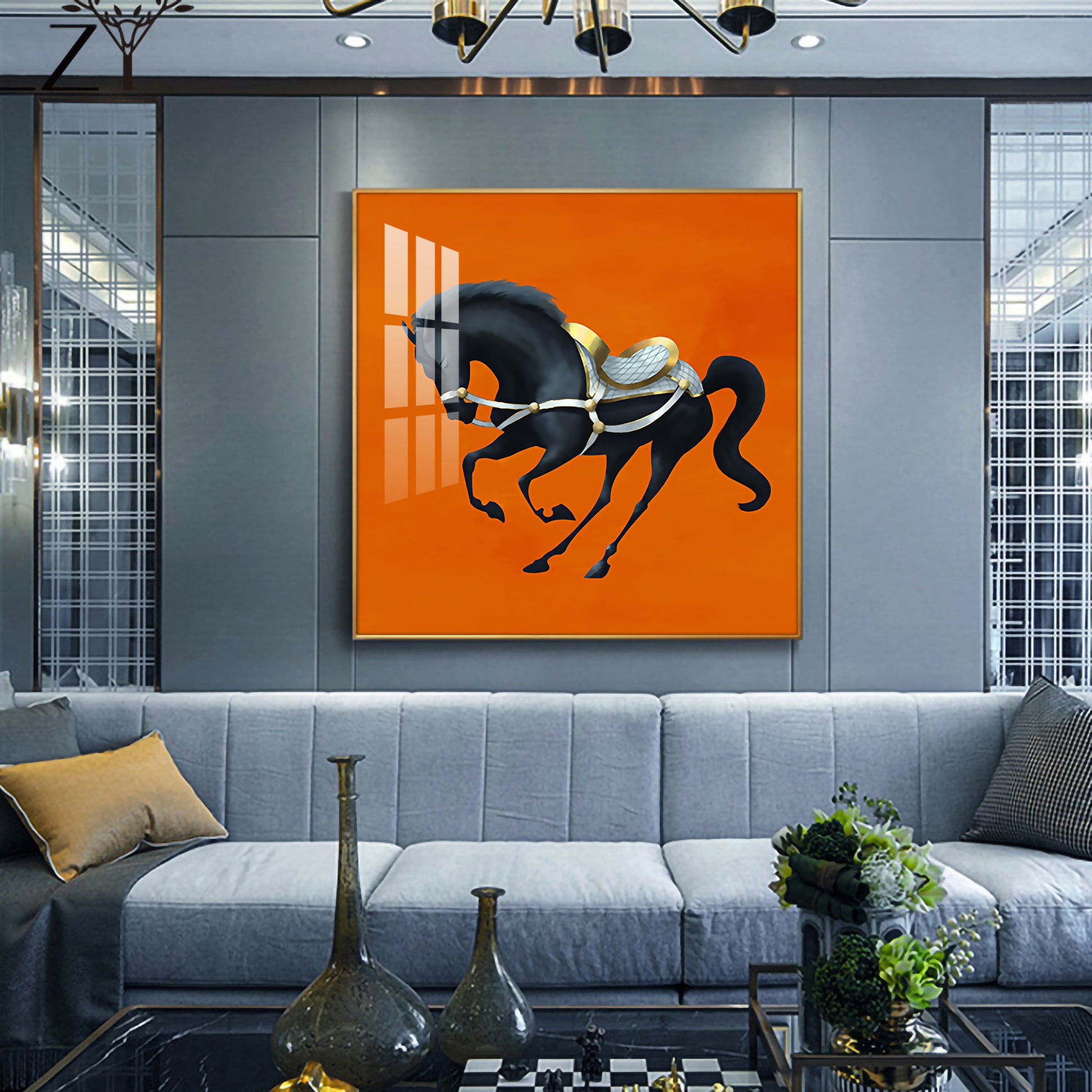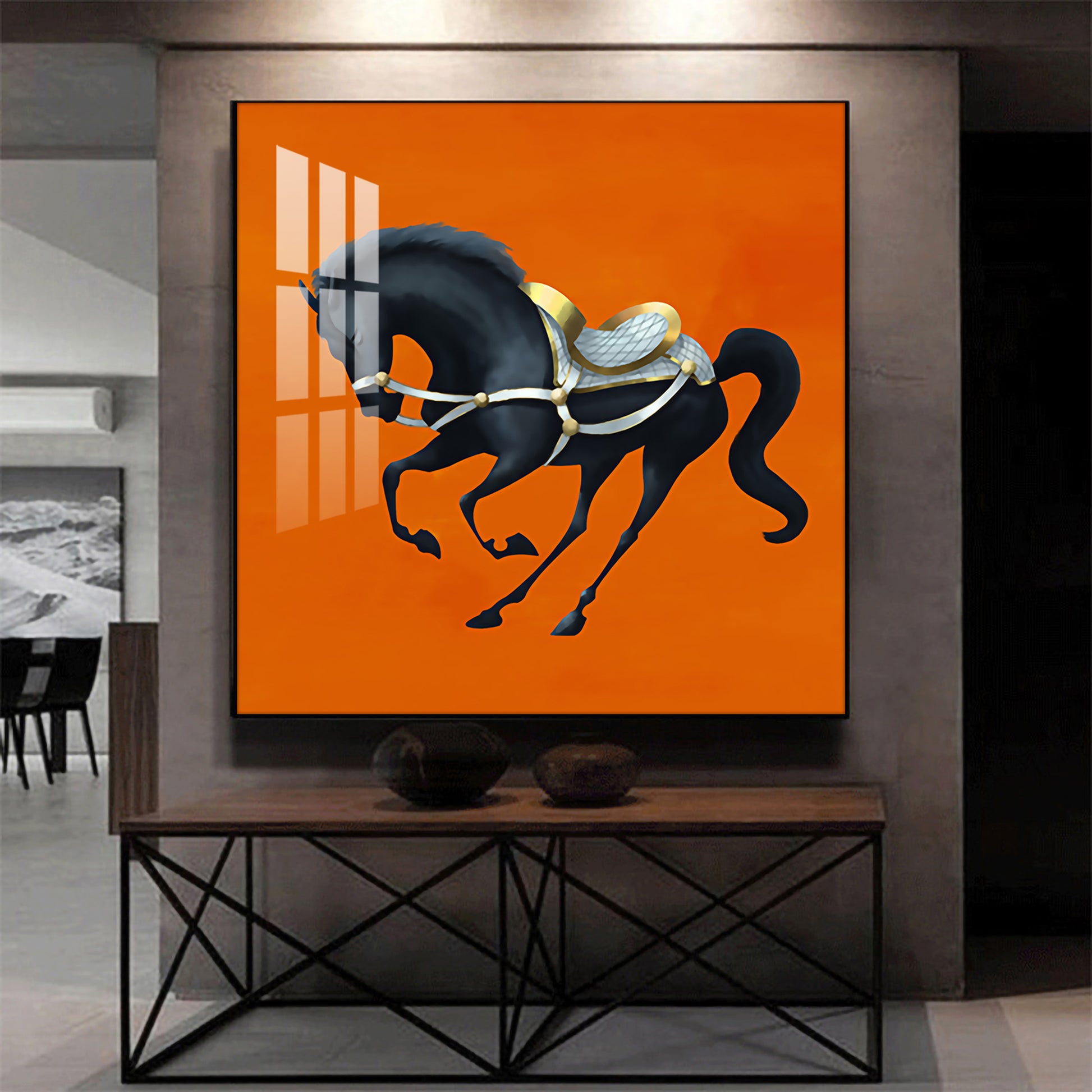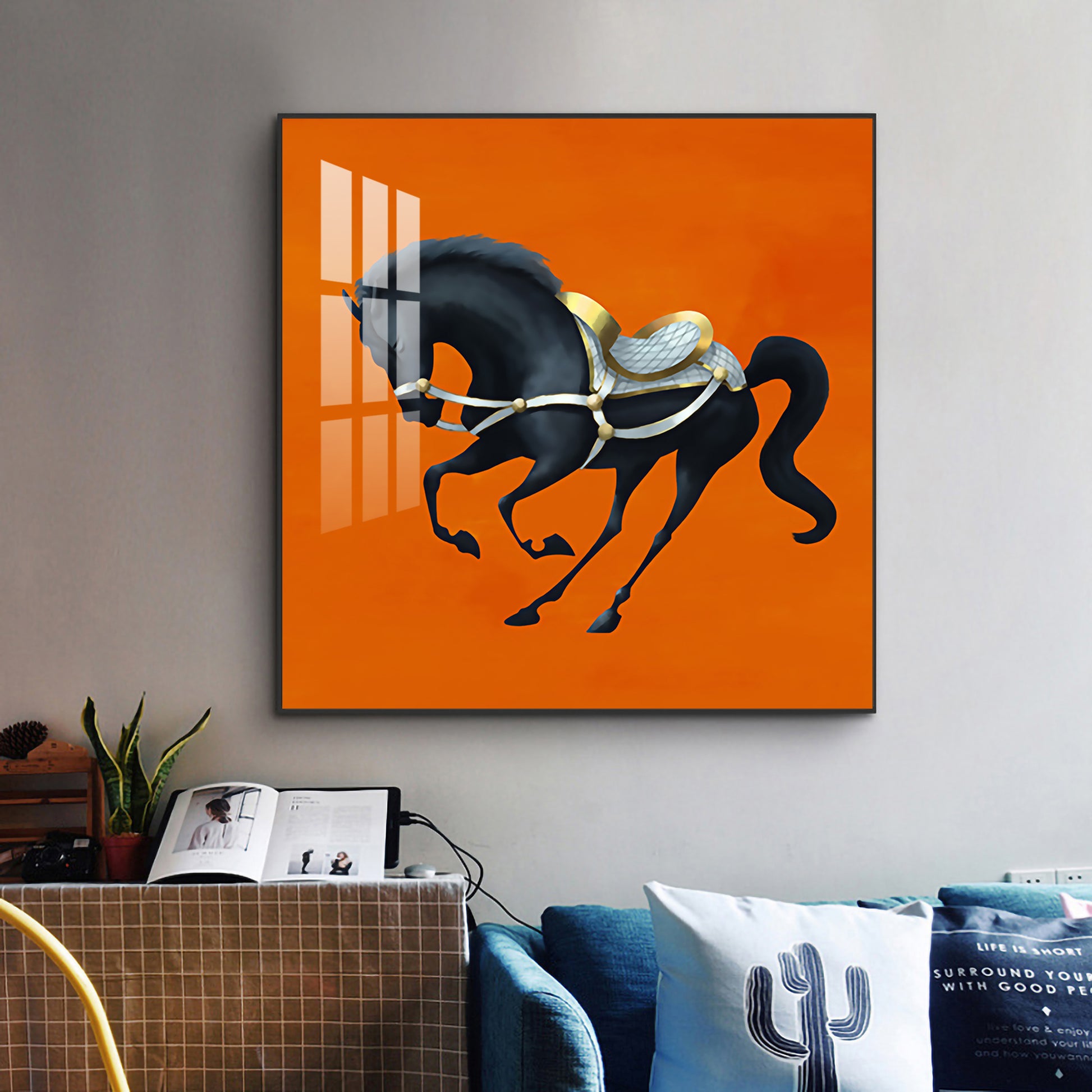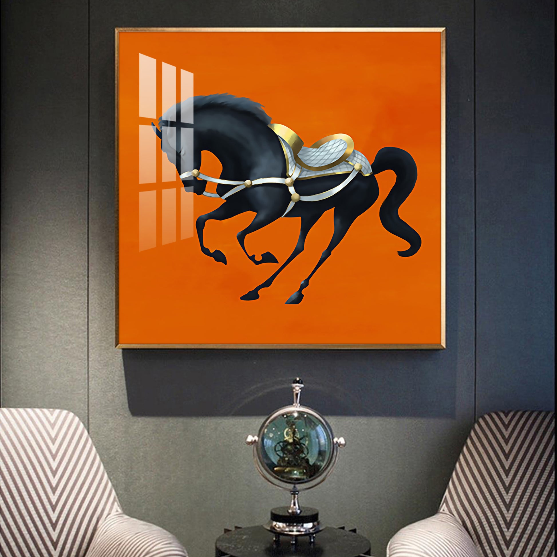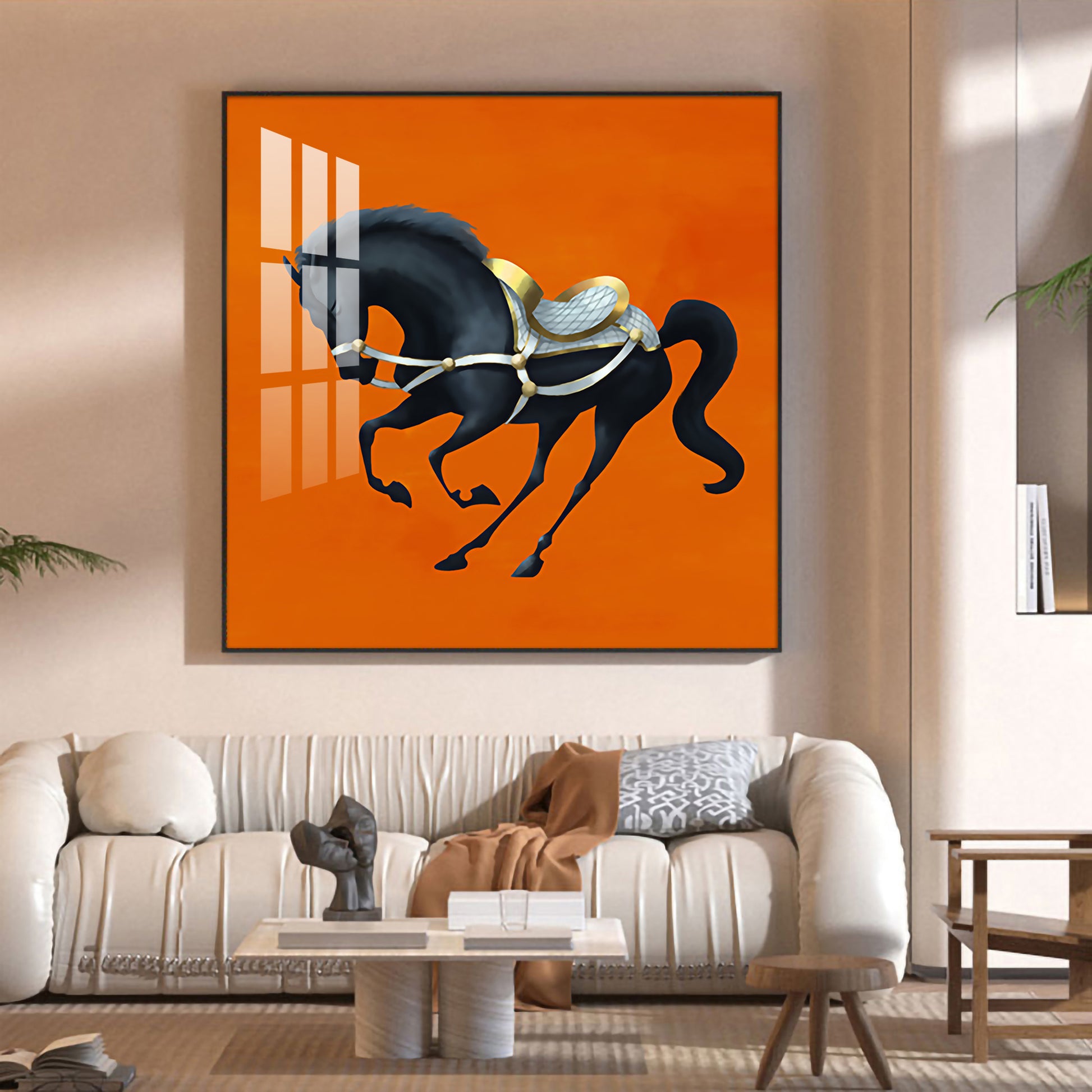 Jumping Horse In Orange Horizon Glass Finish Square Wall Art