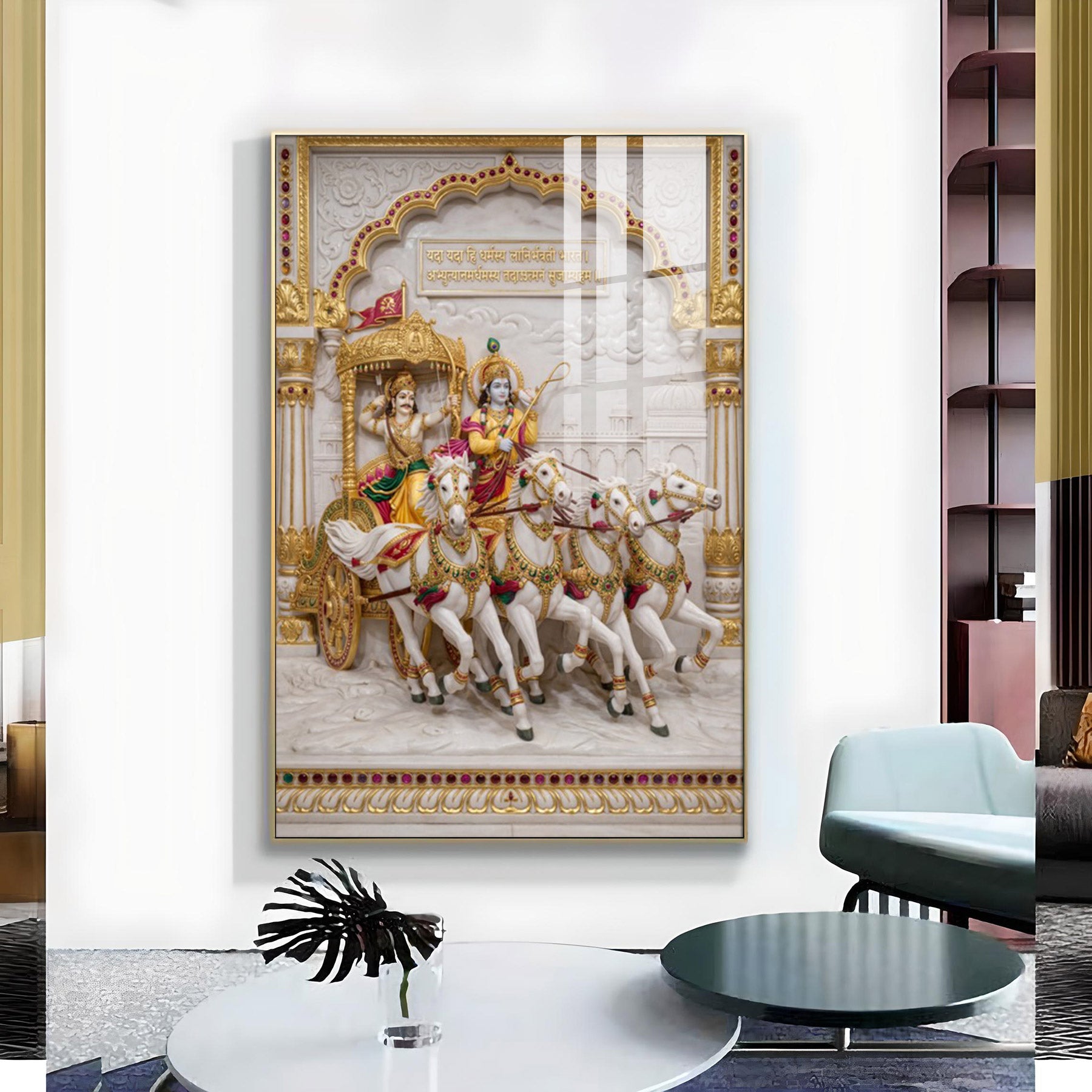 Krishna & Arjuna Chariot Glass Finish Vertical Wall Art