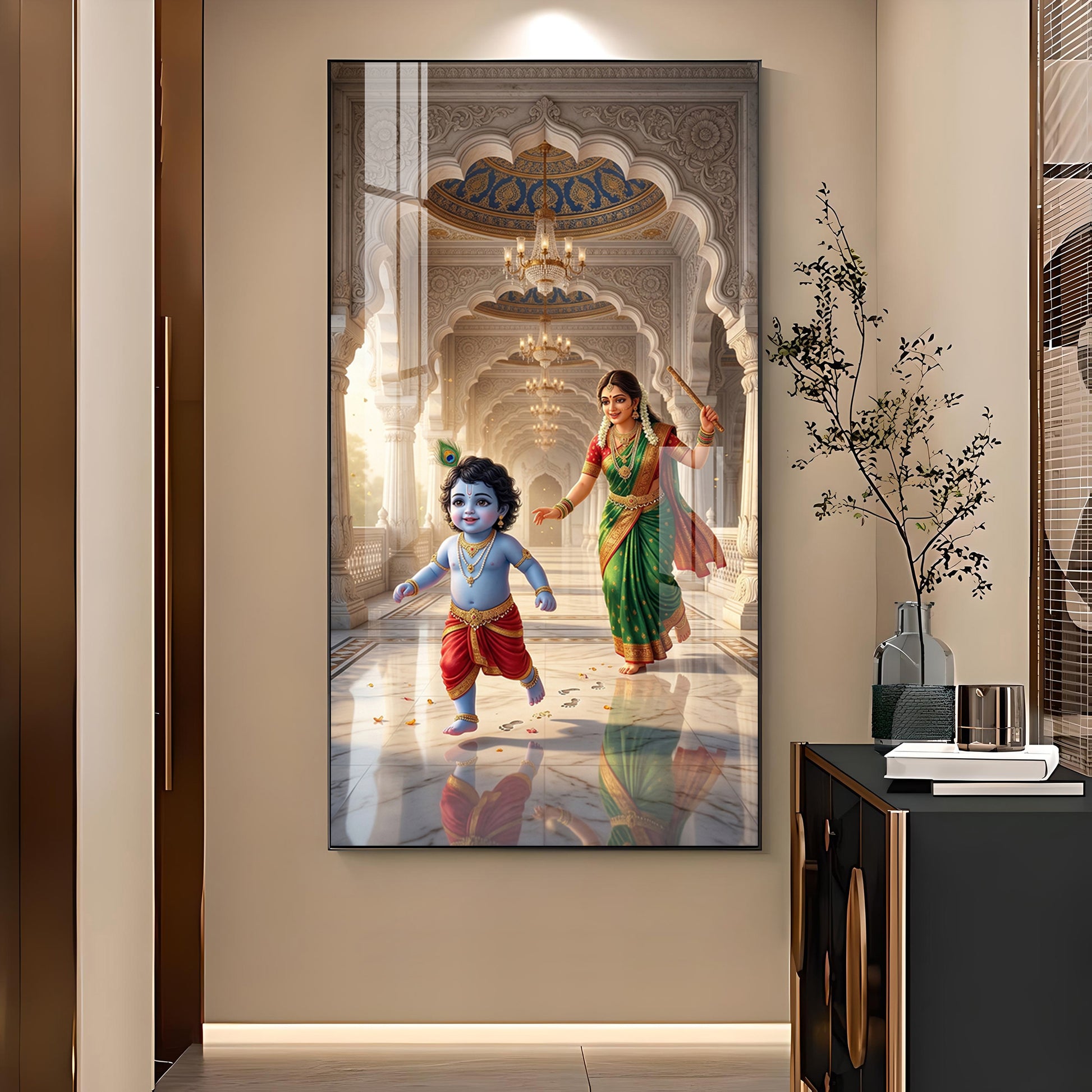 Little kanha With Maa Yashoda Glass Finish Vertical Wall Art