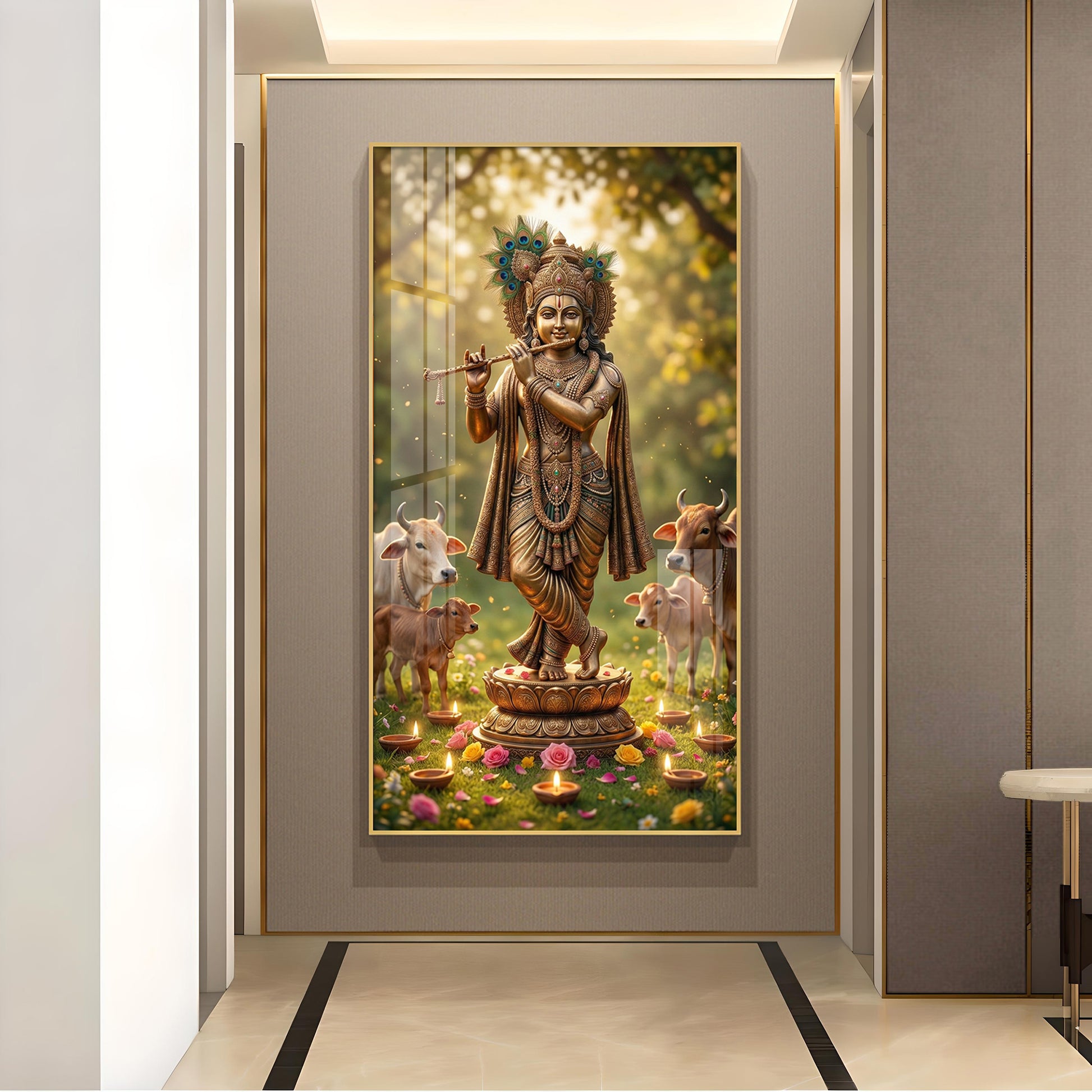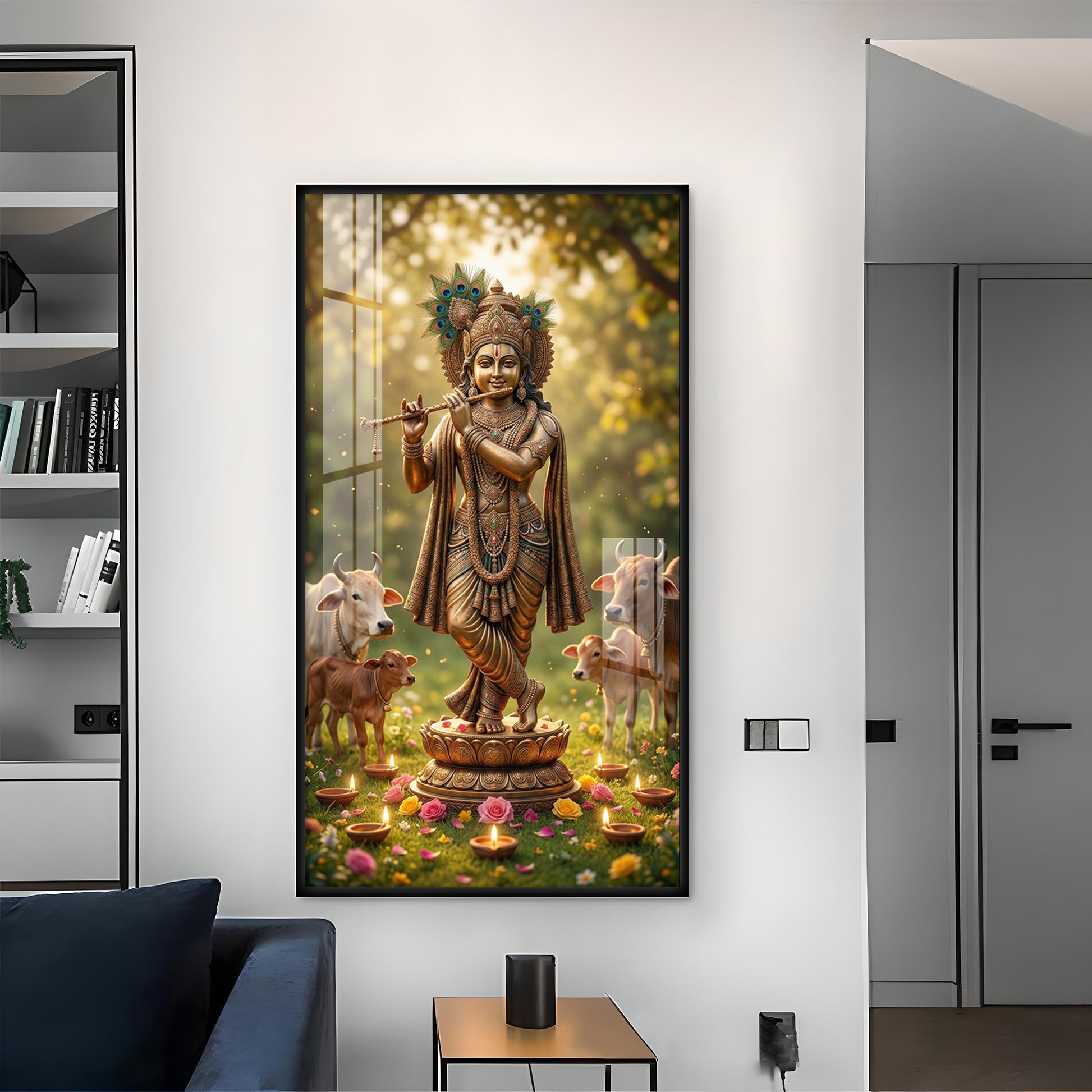 Lord Krishna With Playing the Flute Glass Finish Vertical Wall Art