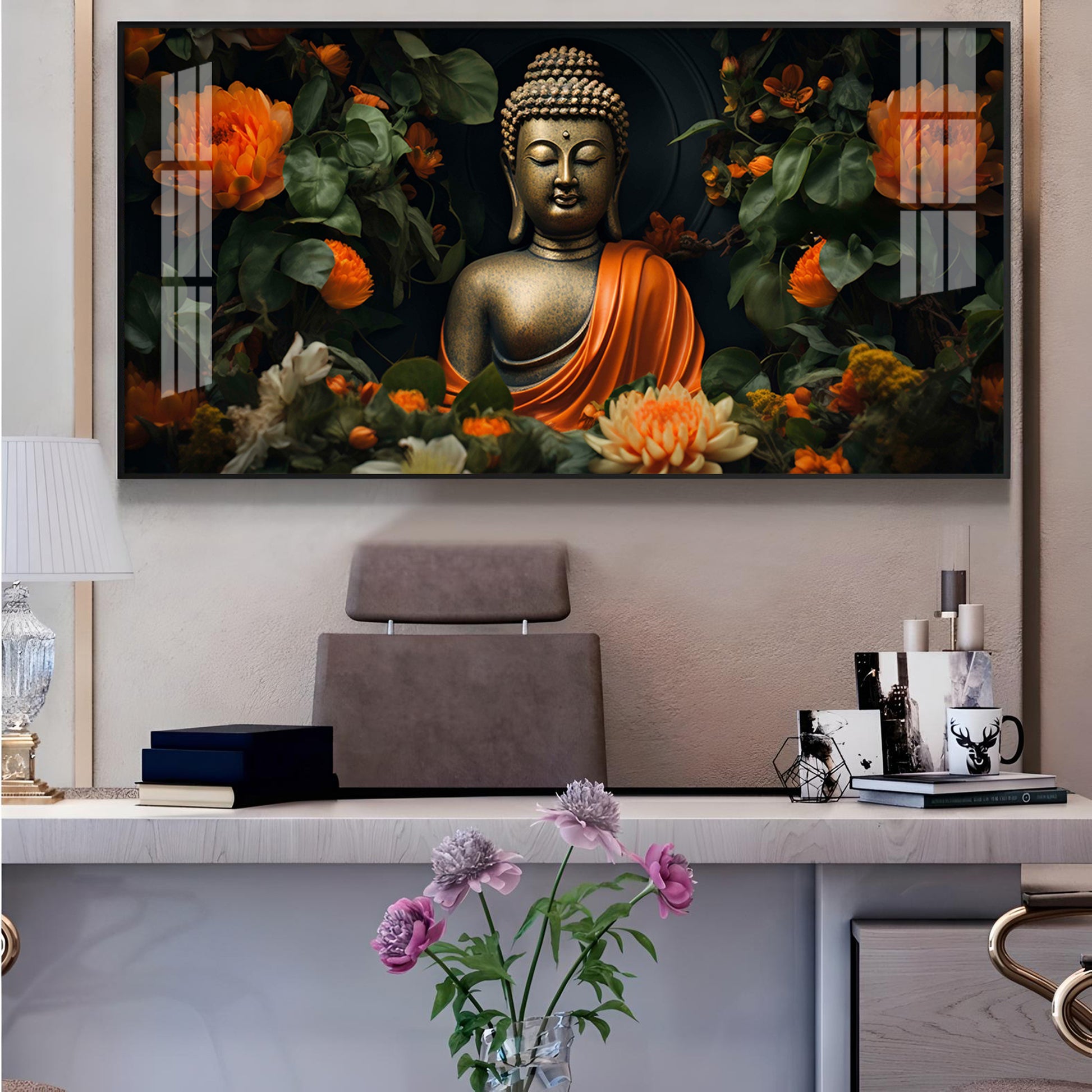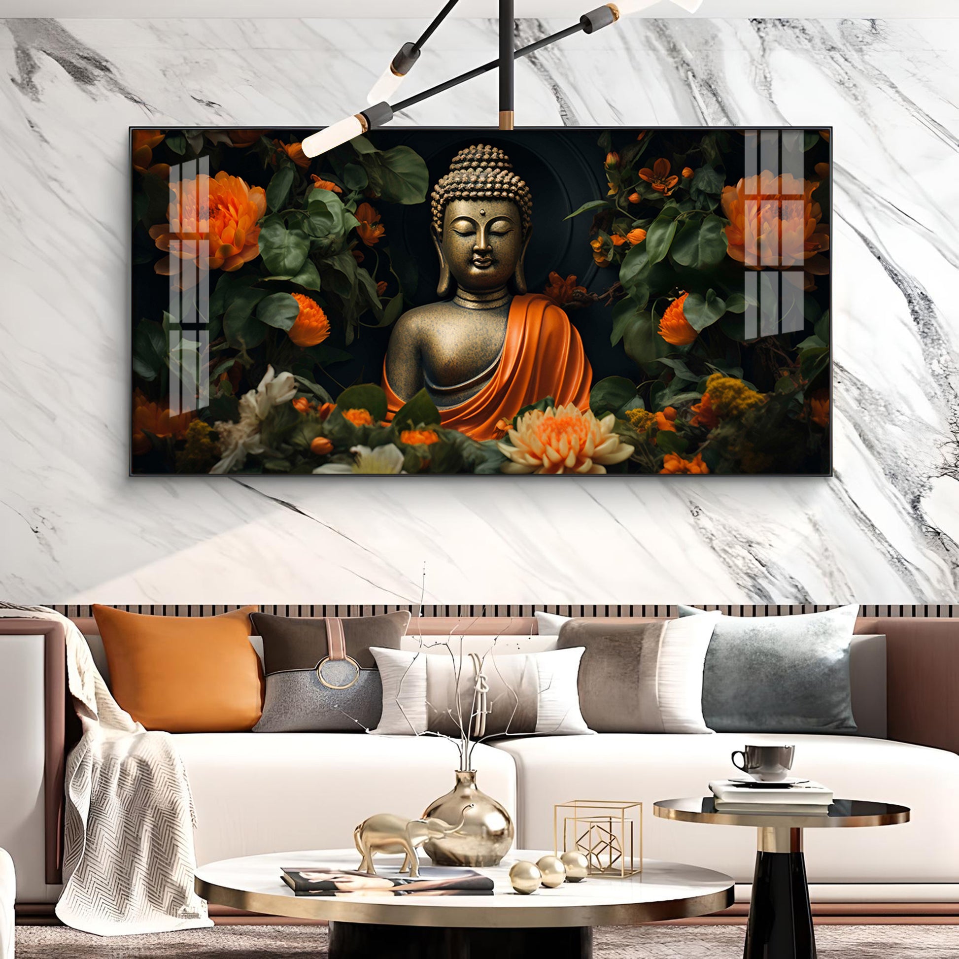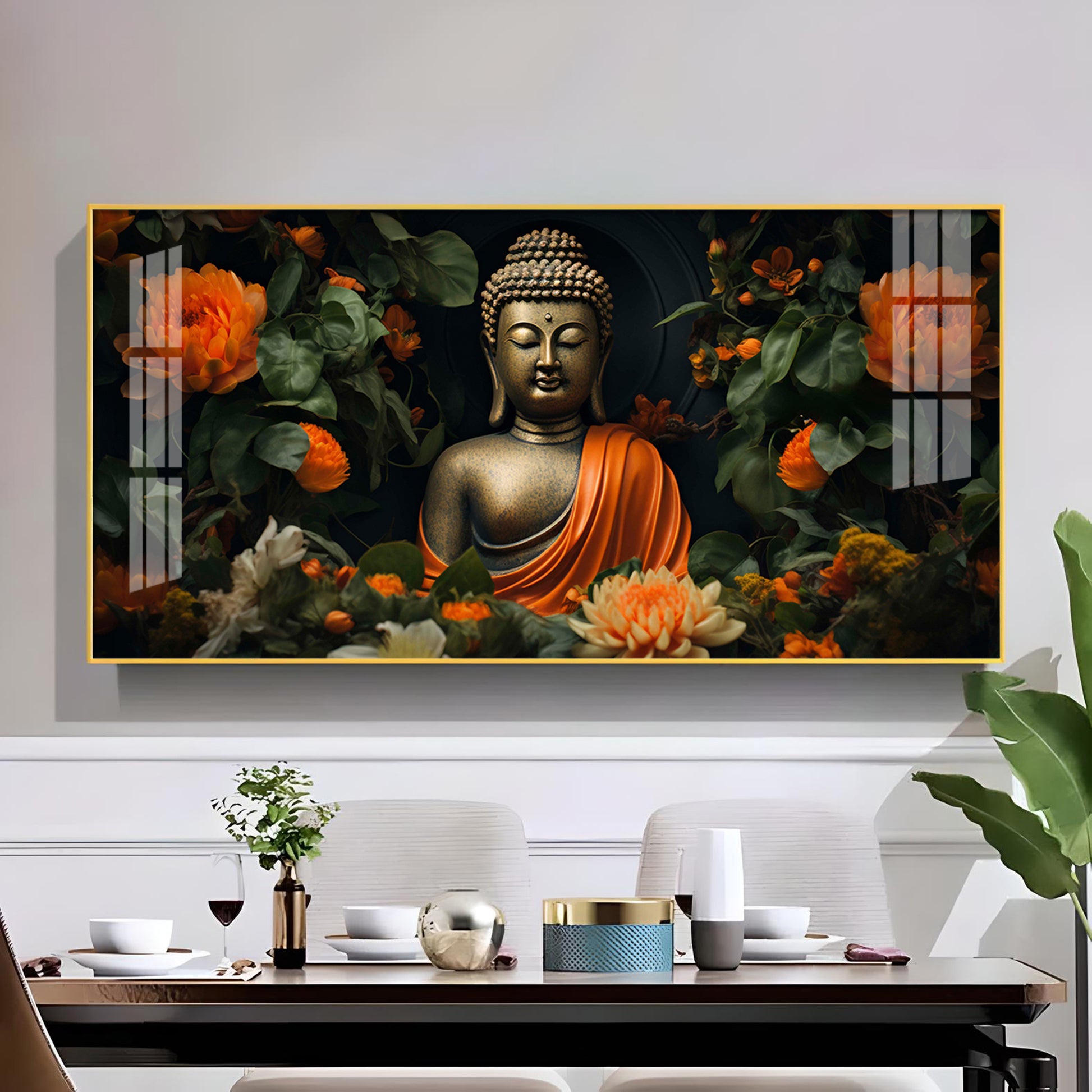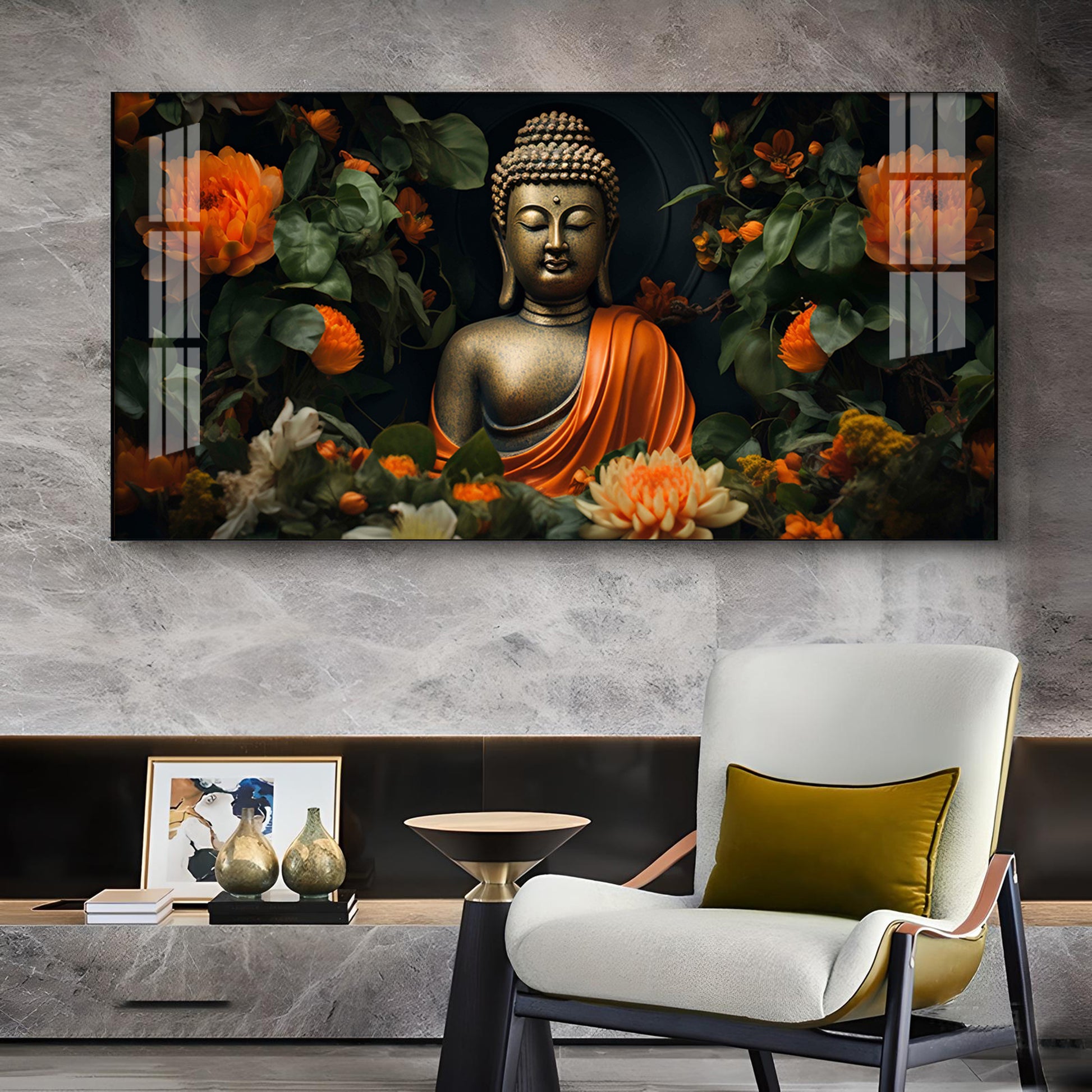 Luminous Buddha With Flower Glass Finish Horizontal Wall Art
