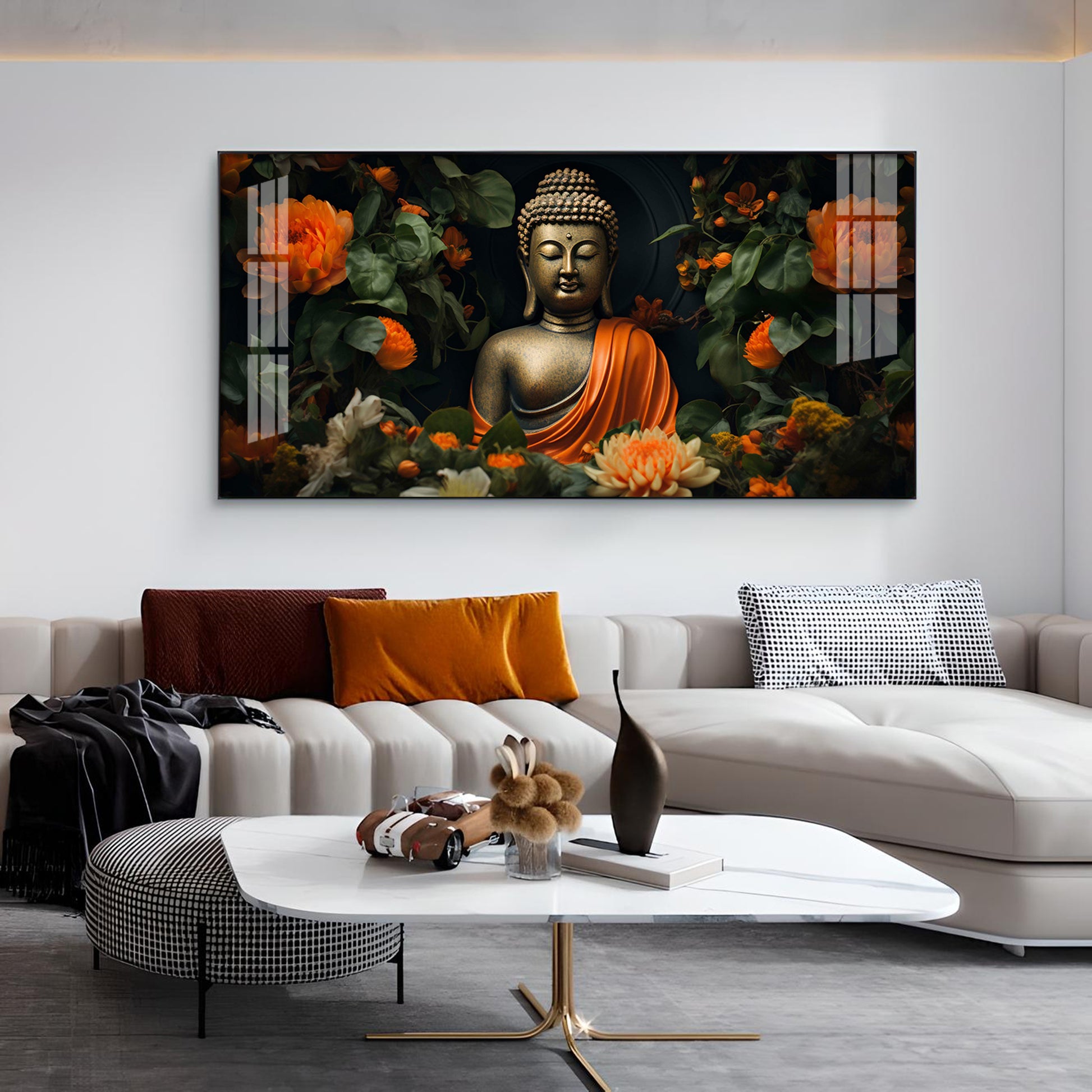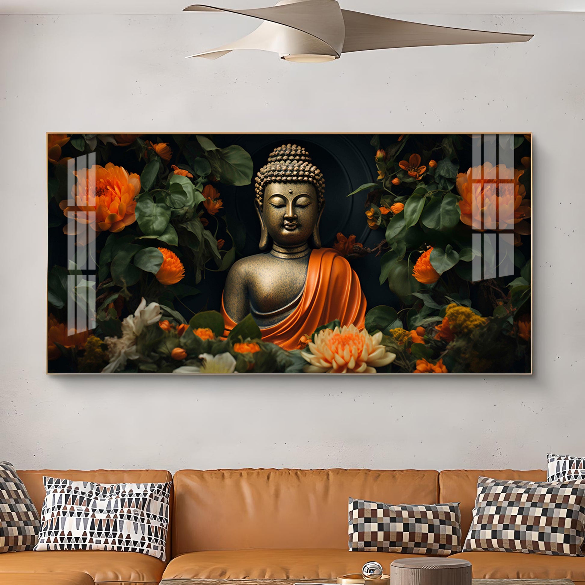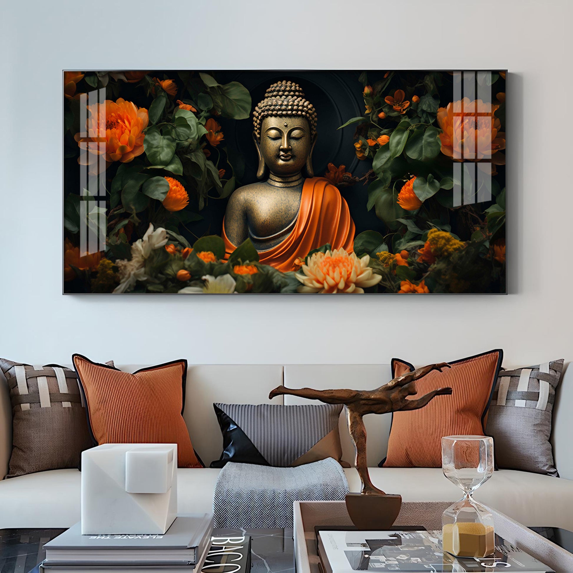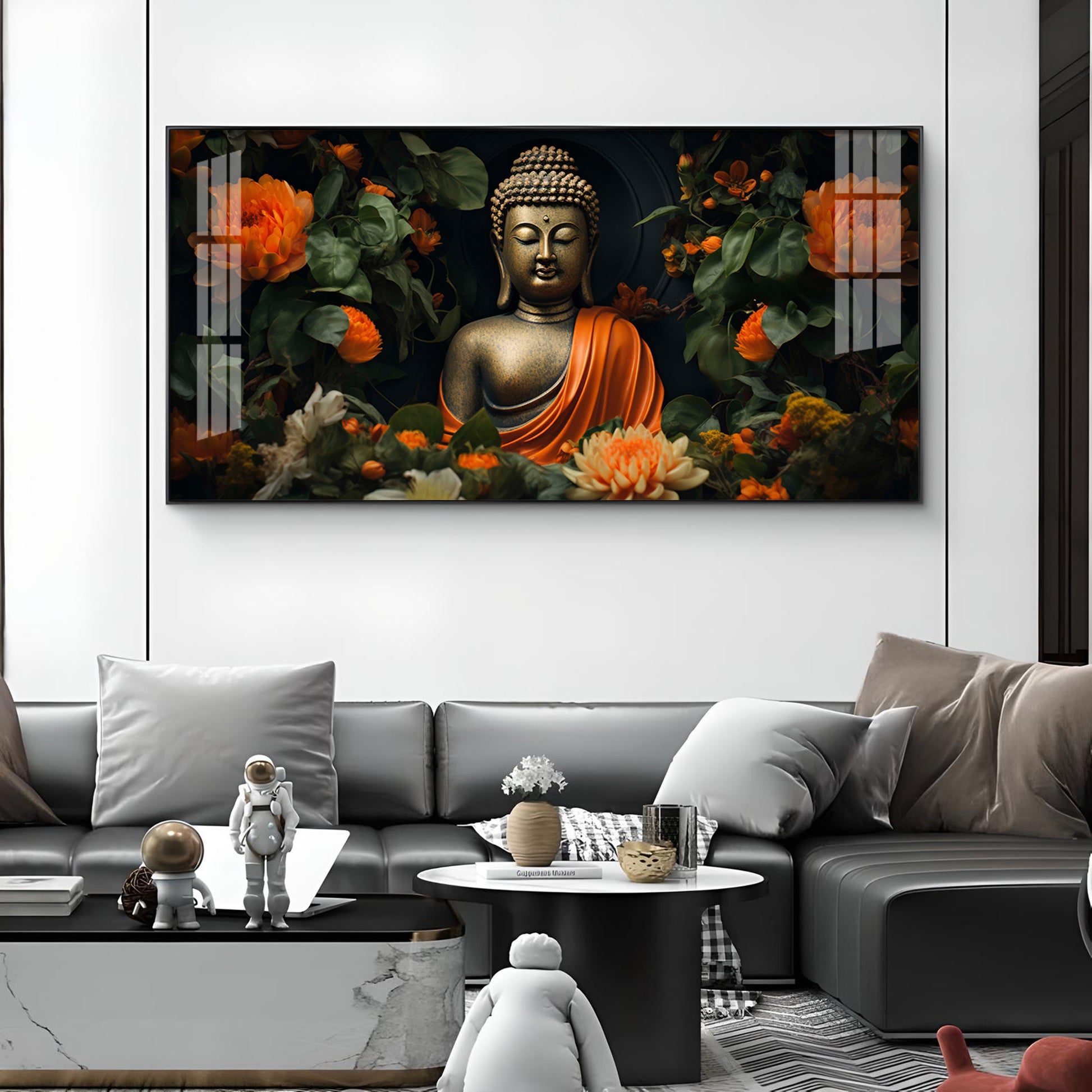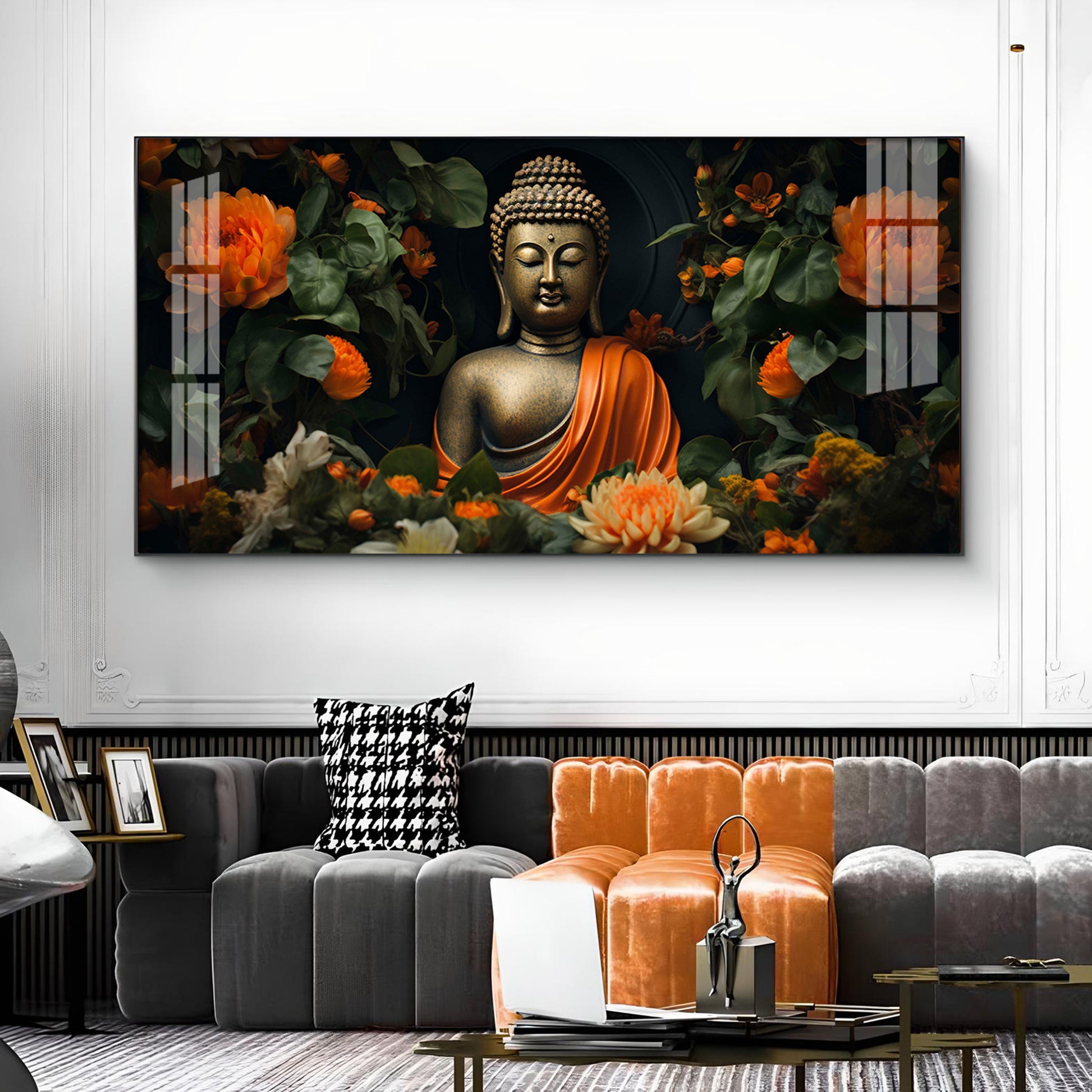 Luminous Buddha With Flower Glass Finish Horizontal Wall Art