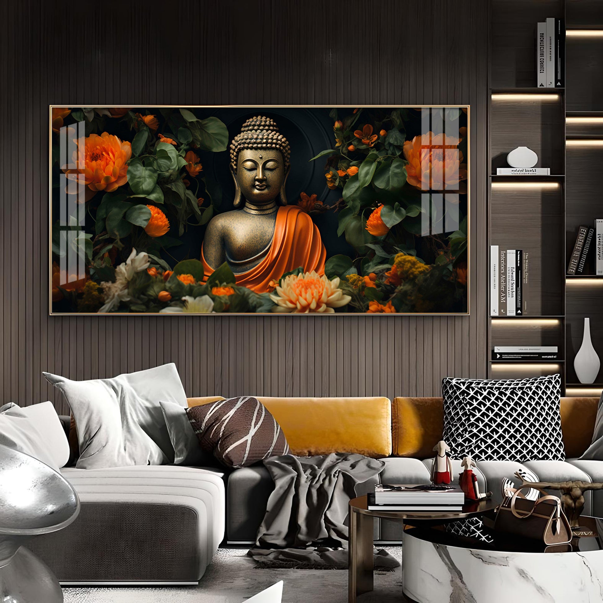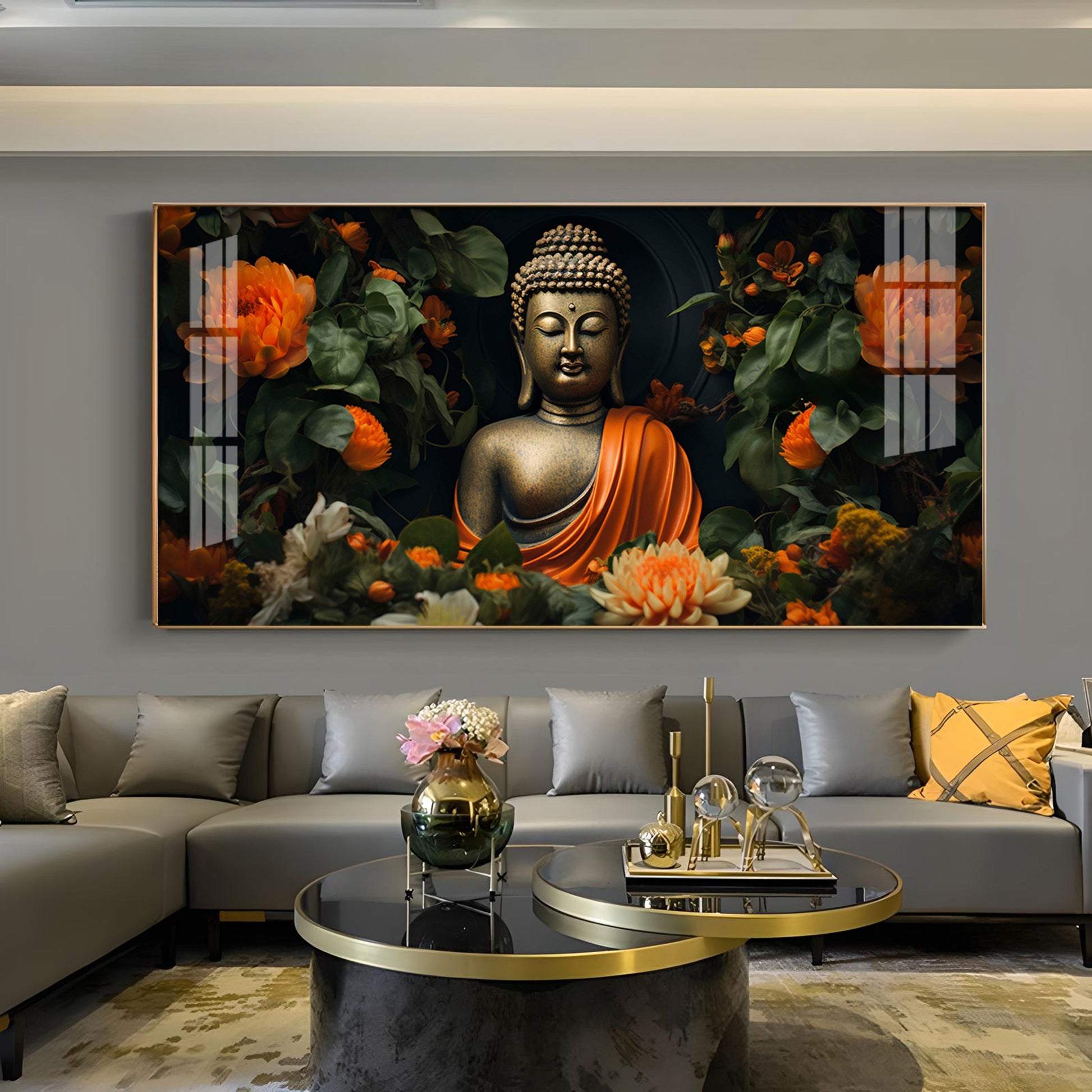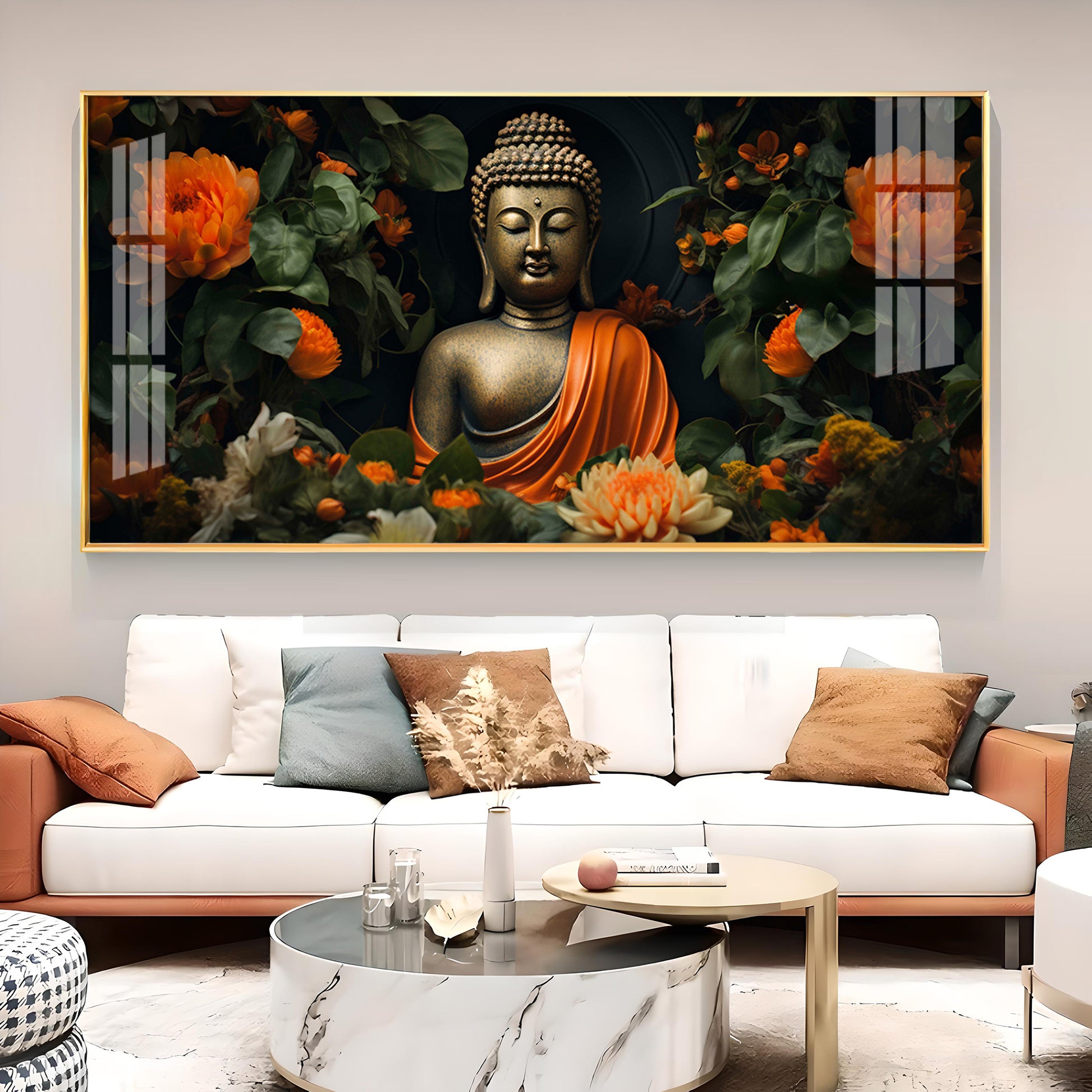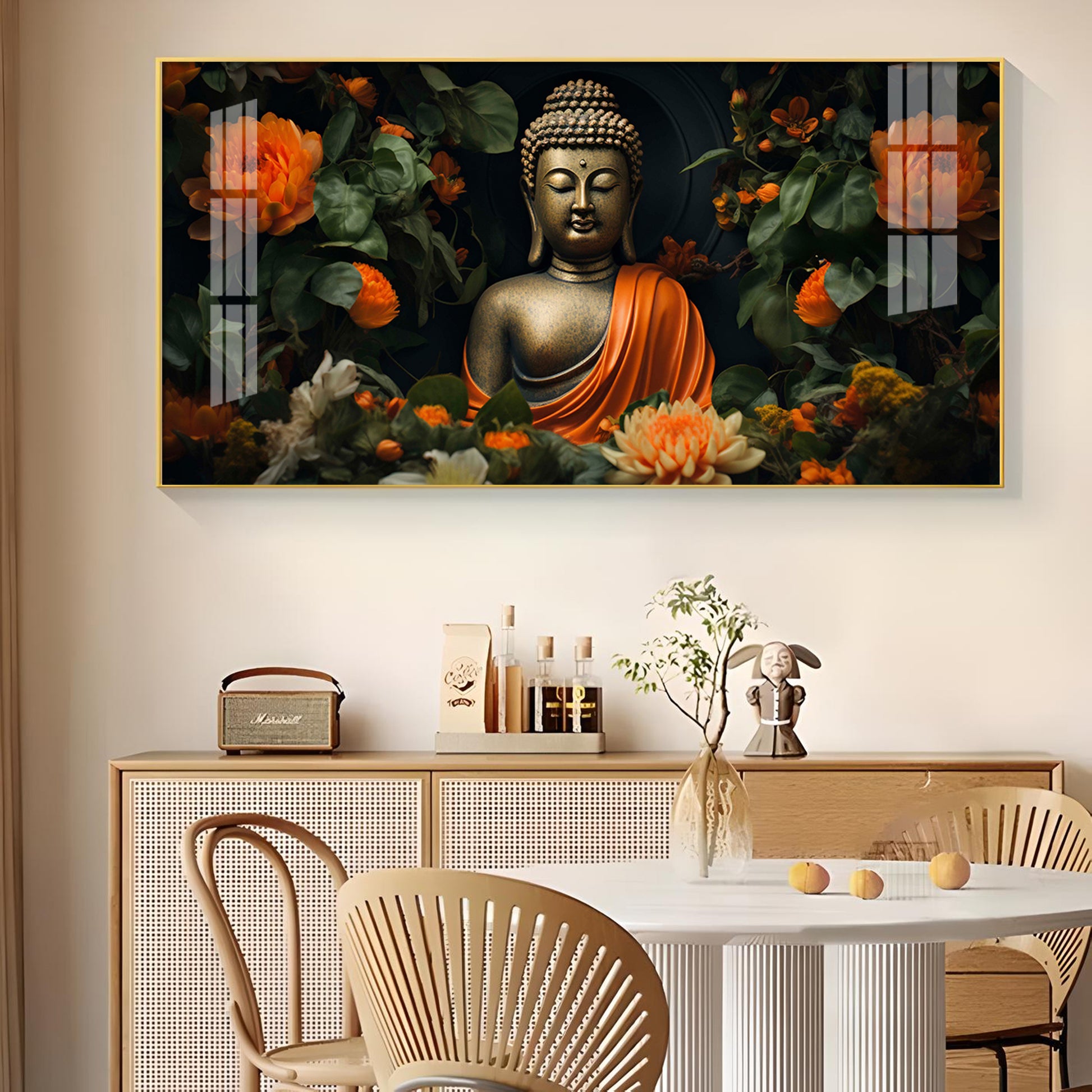 Luminous Buddha With Flower Glass Finish Horizontal Wall Art