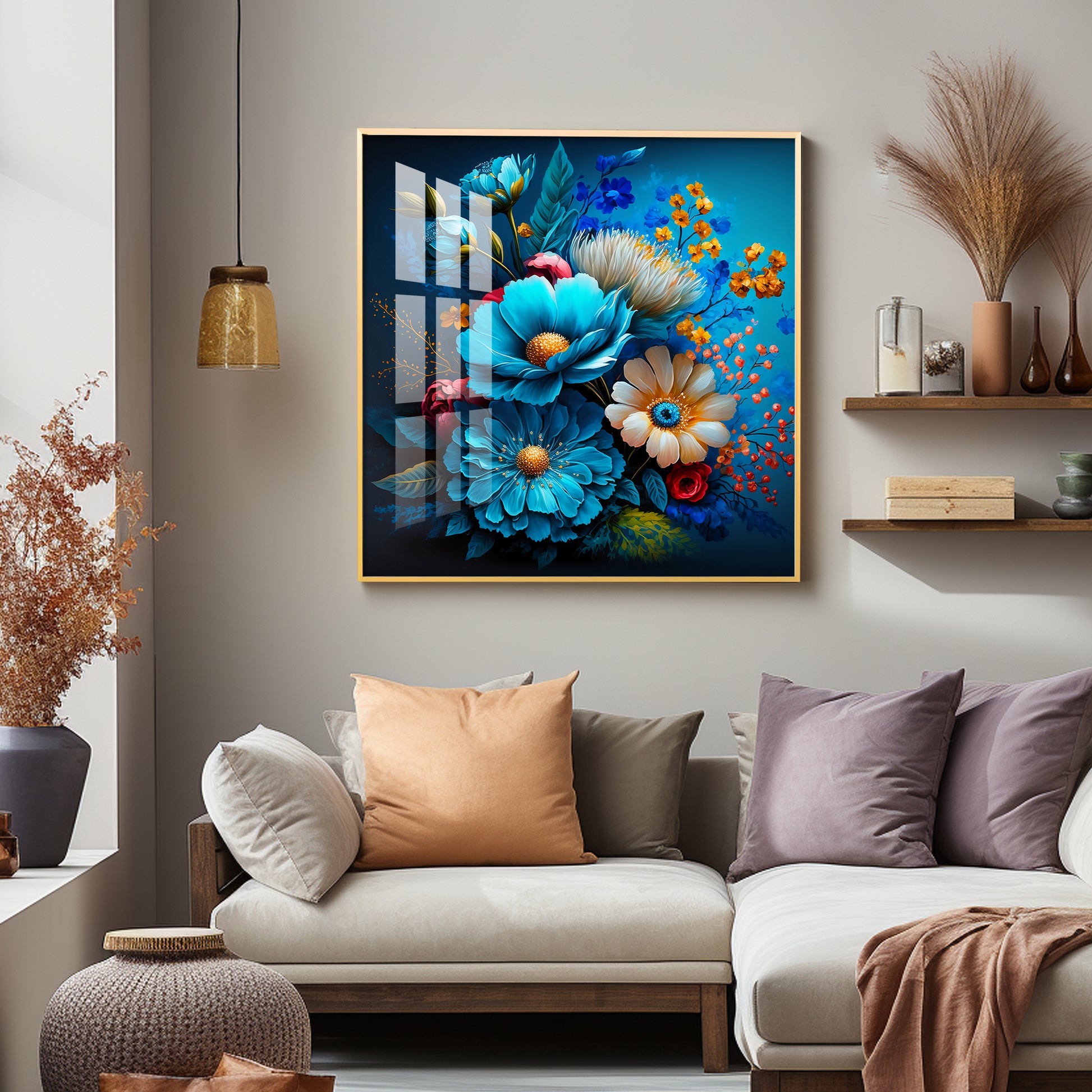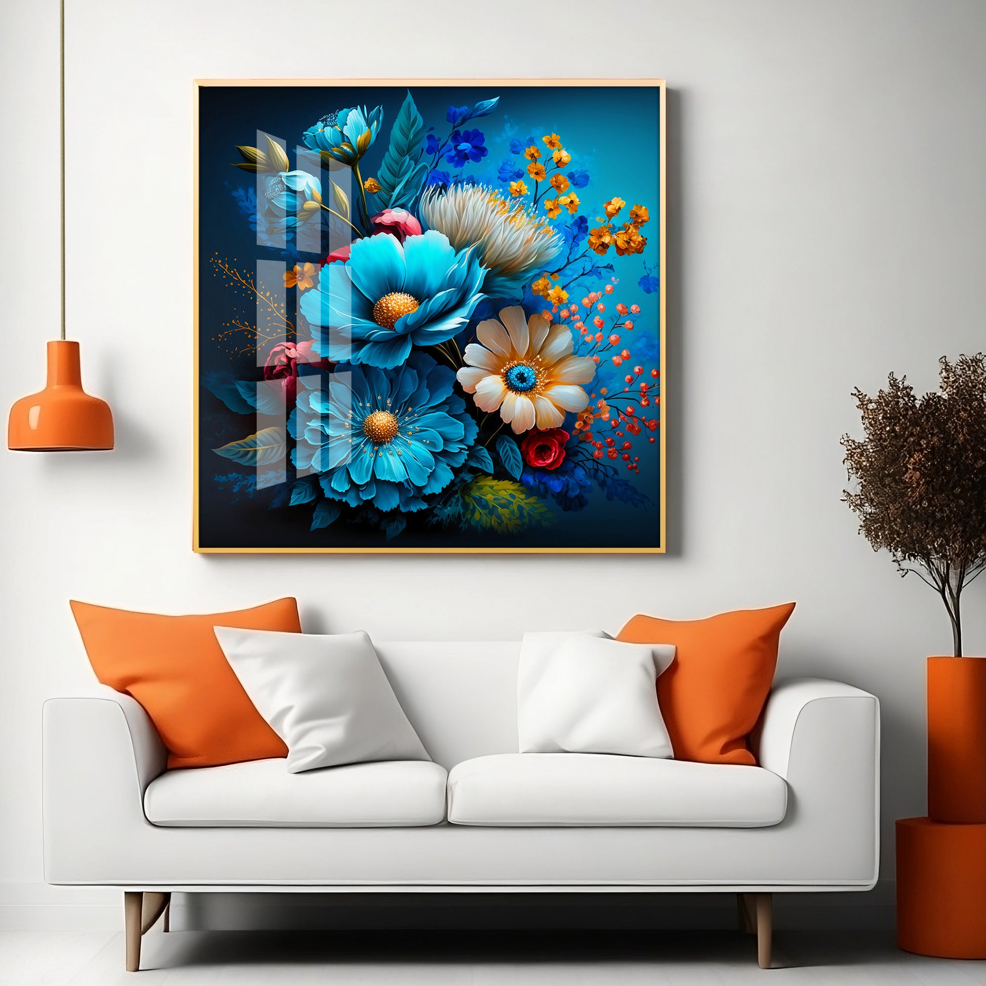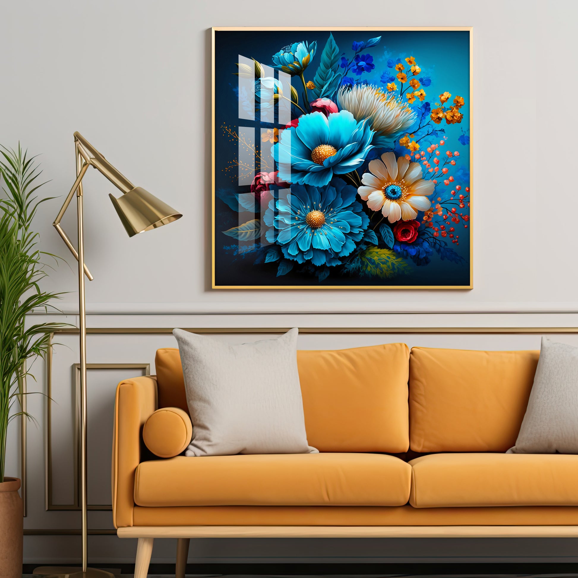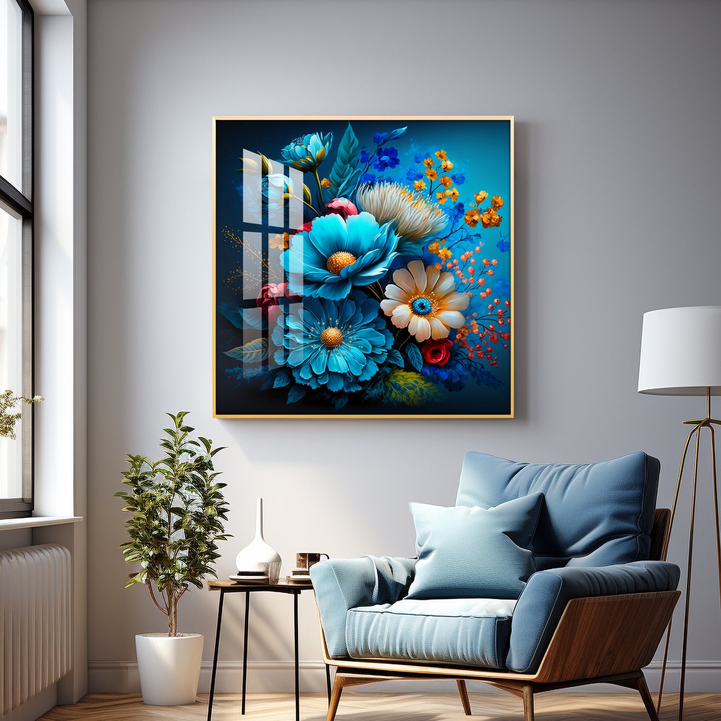 Indigo Floral Glass Finish Square Wall Art