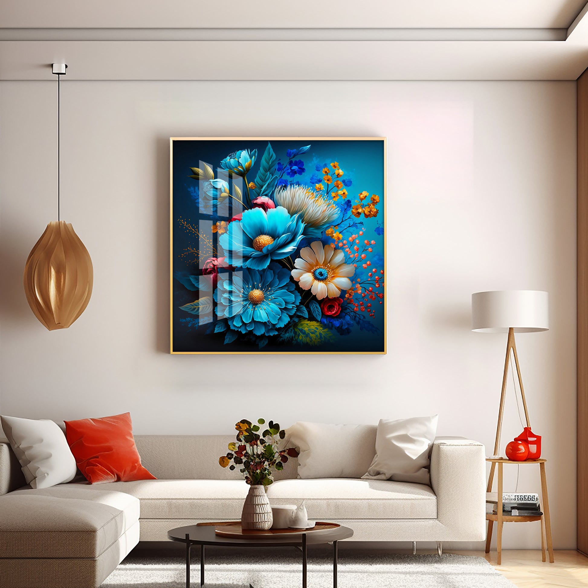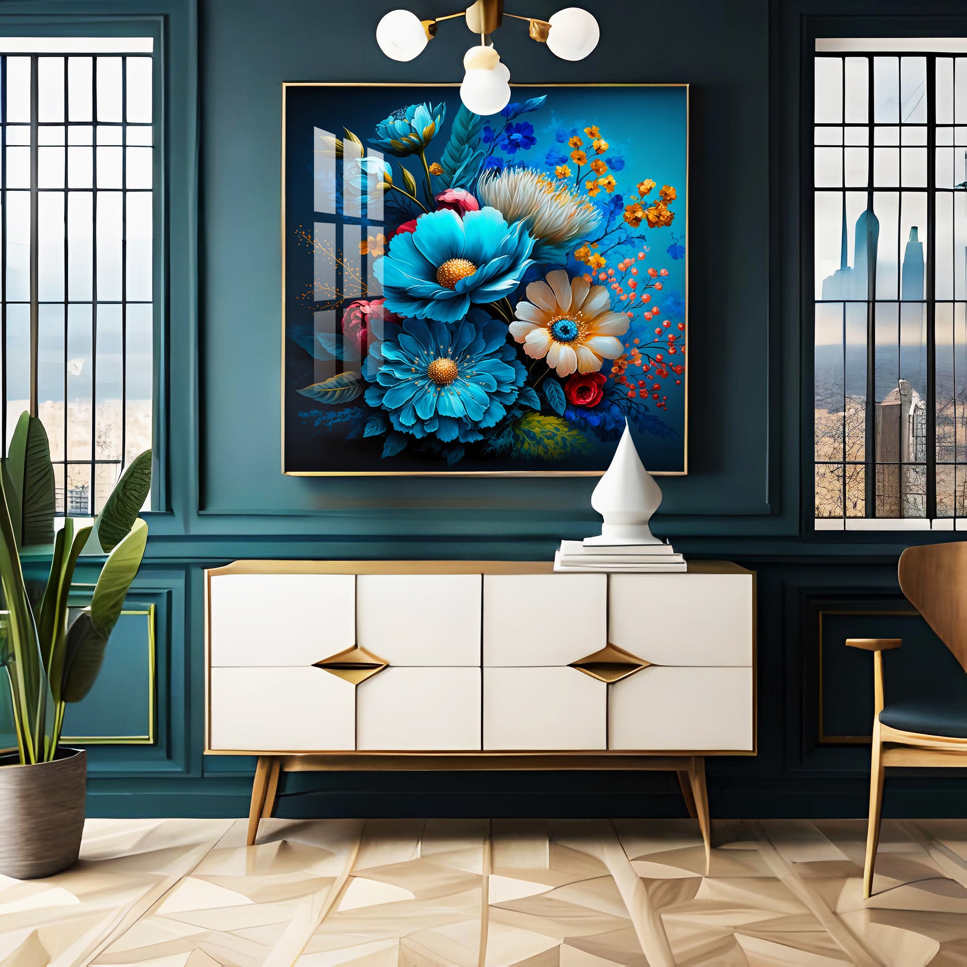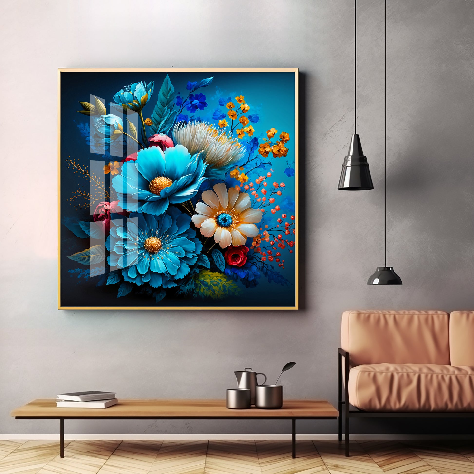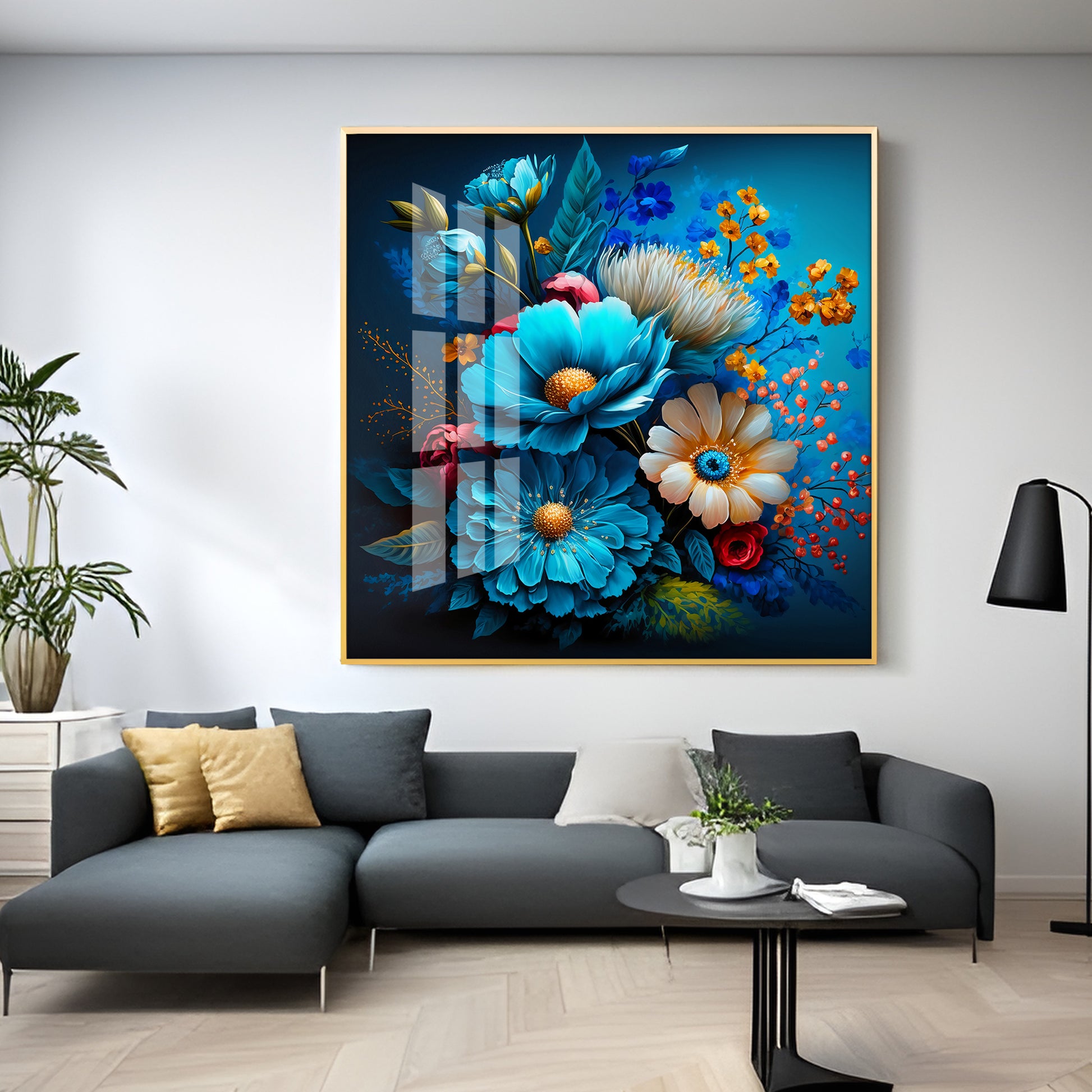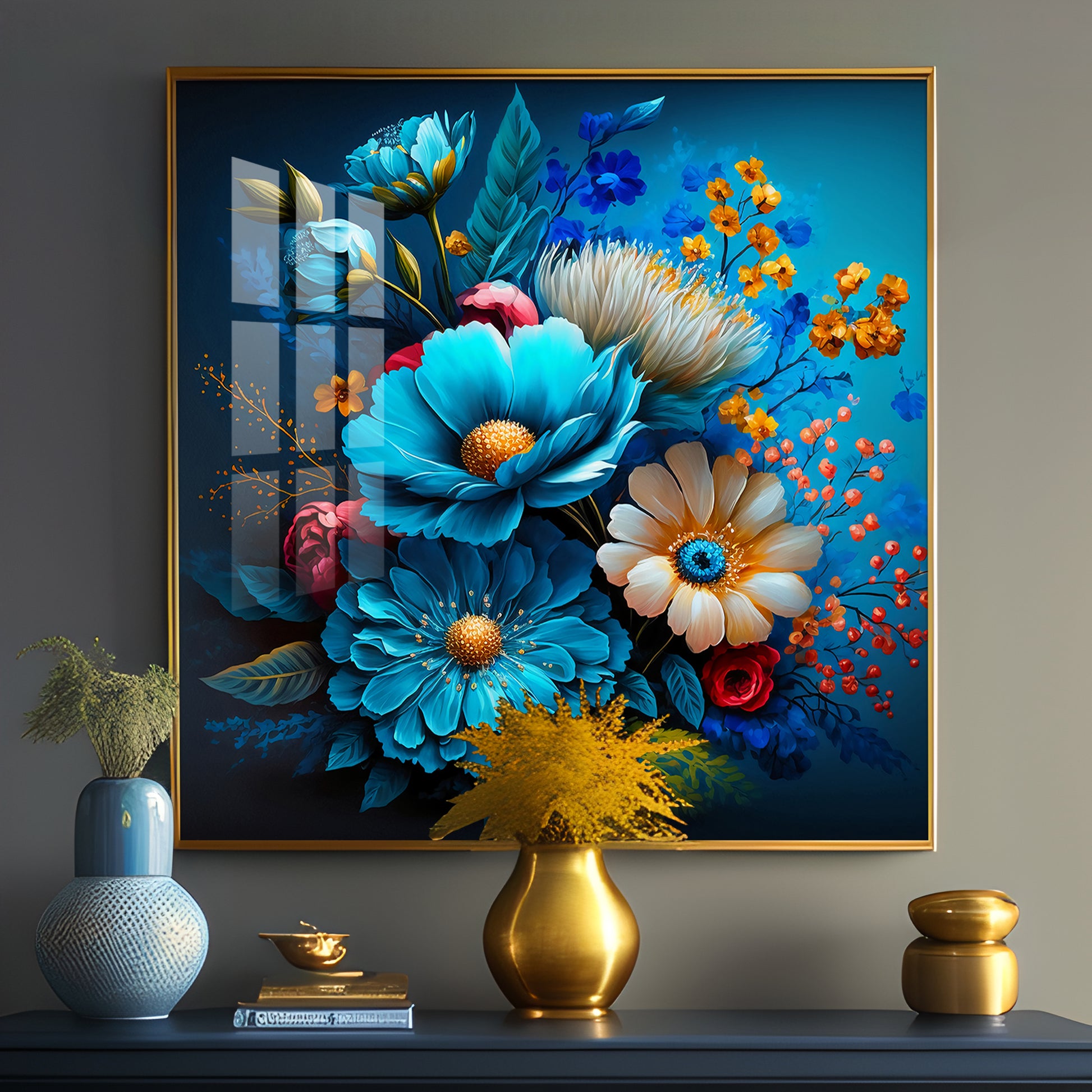 Indigo Floral Glass Finish Square Wall Art