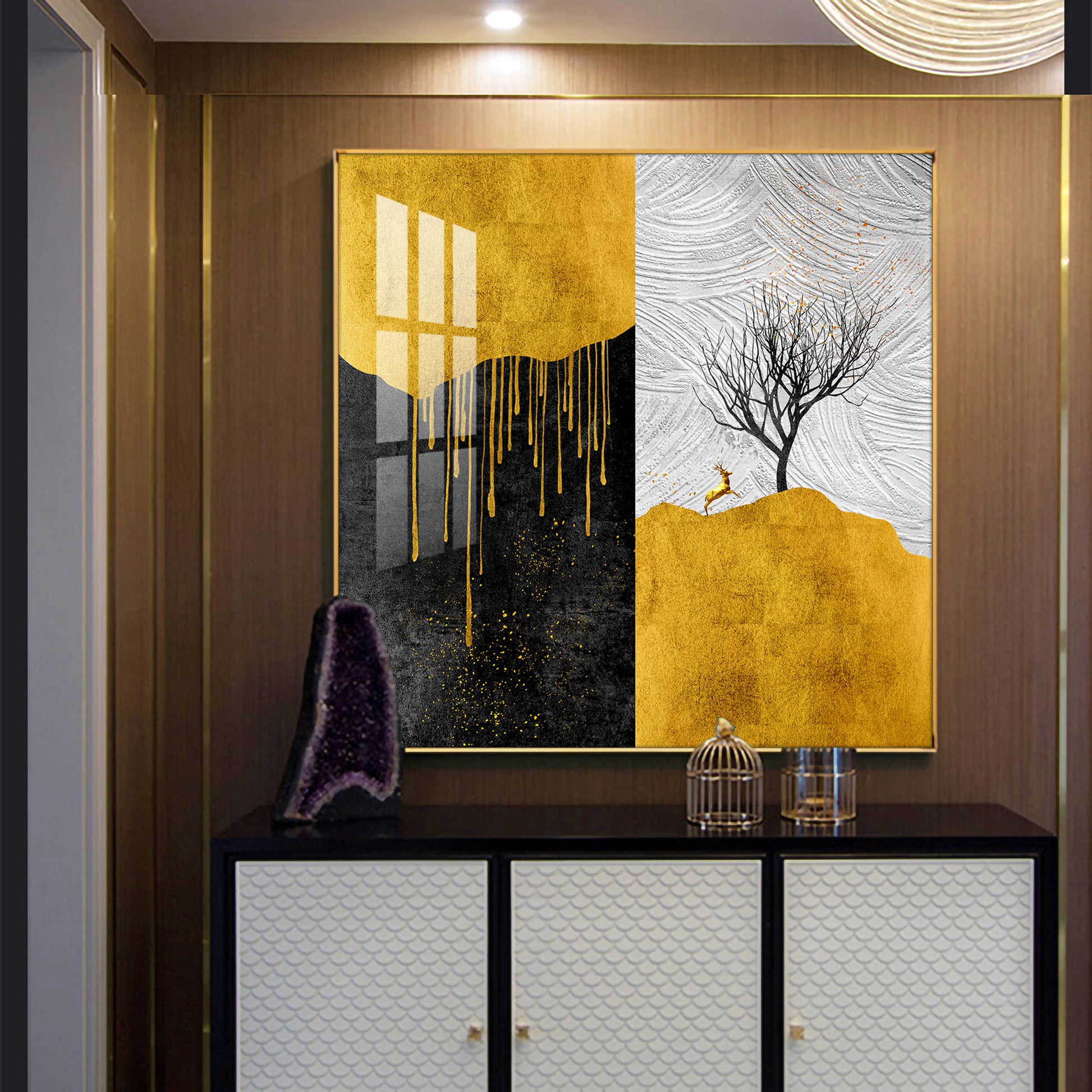 Our Framed glass finish wall art is easy to hang. The metal hooks are included in the box of your ordered wall art. You can simply mount it to the wall you want to place.