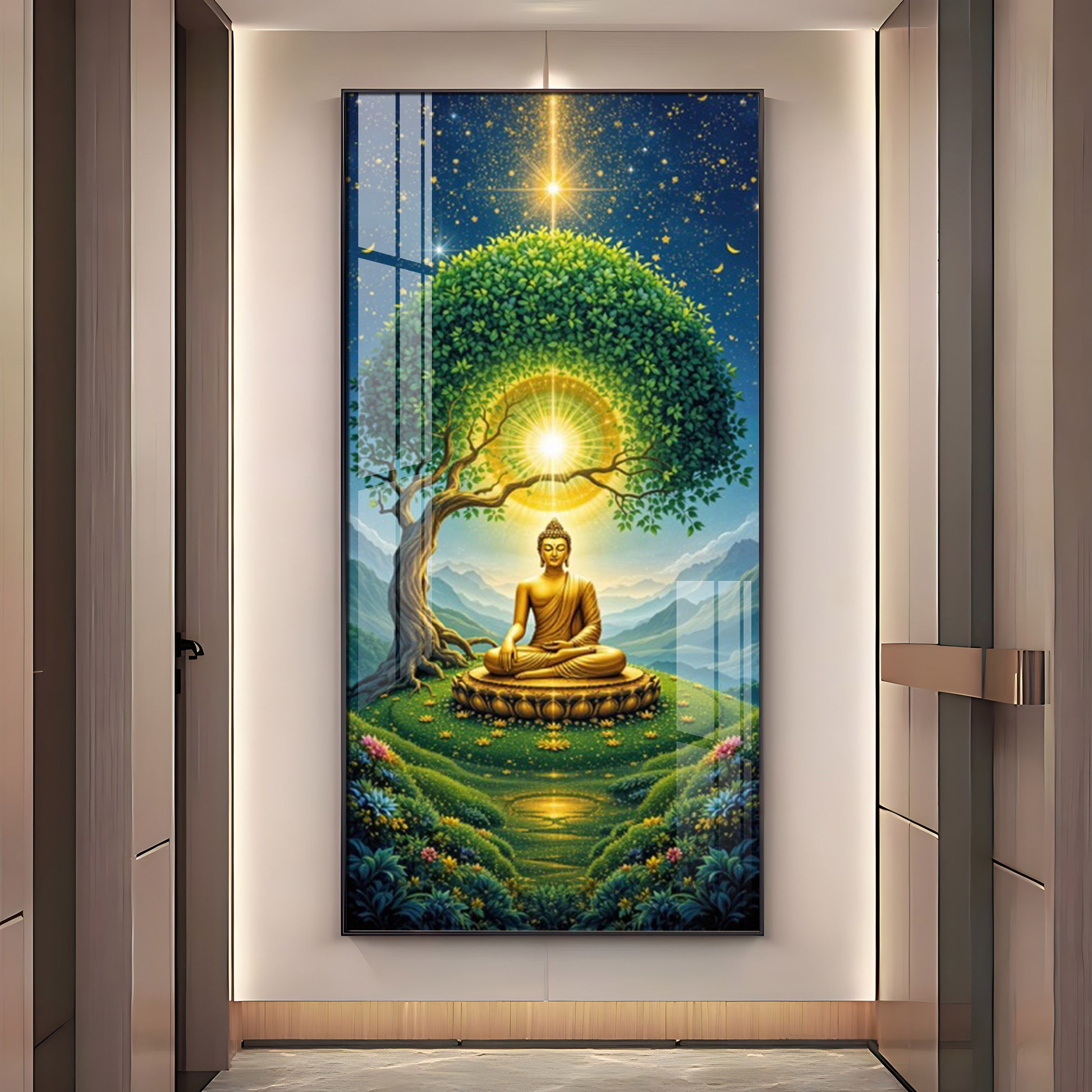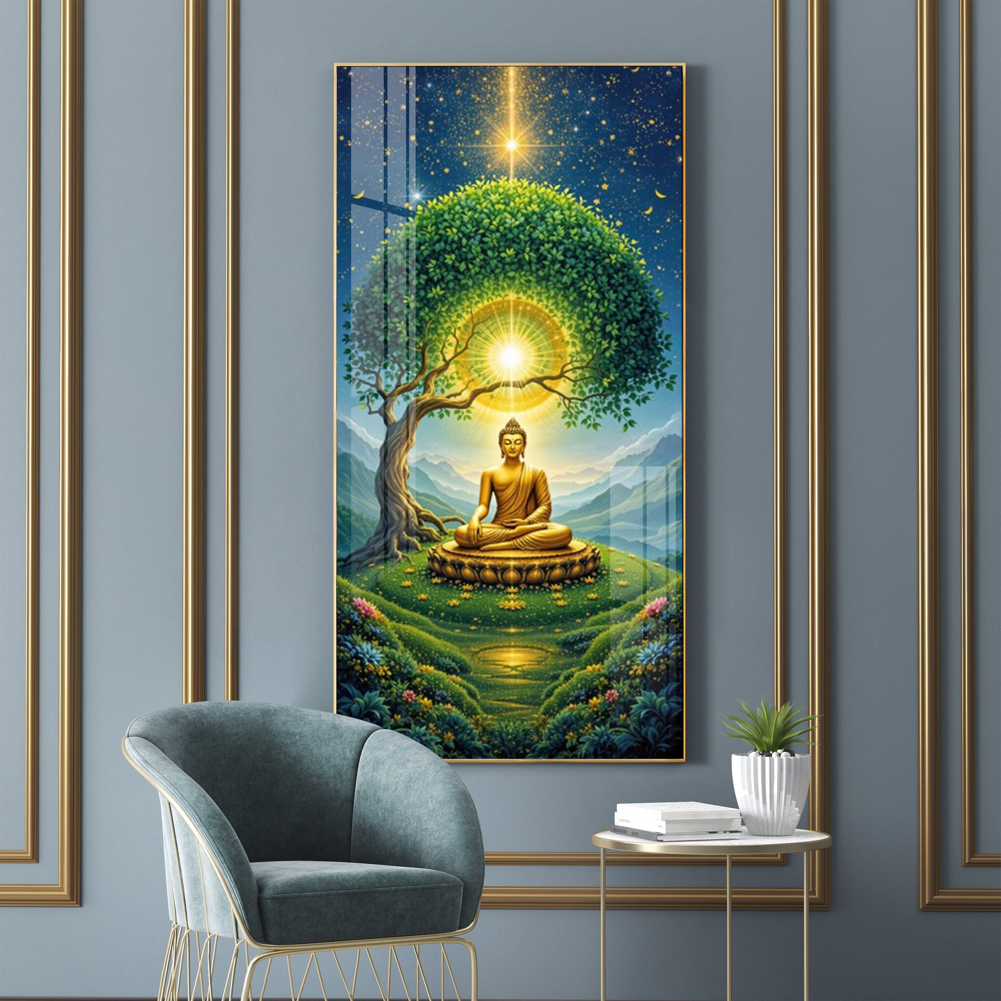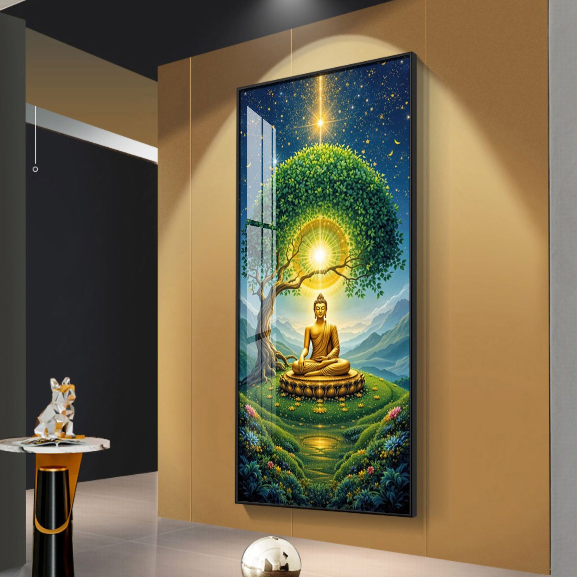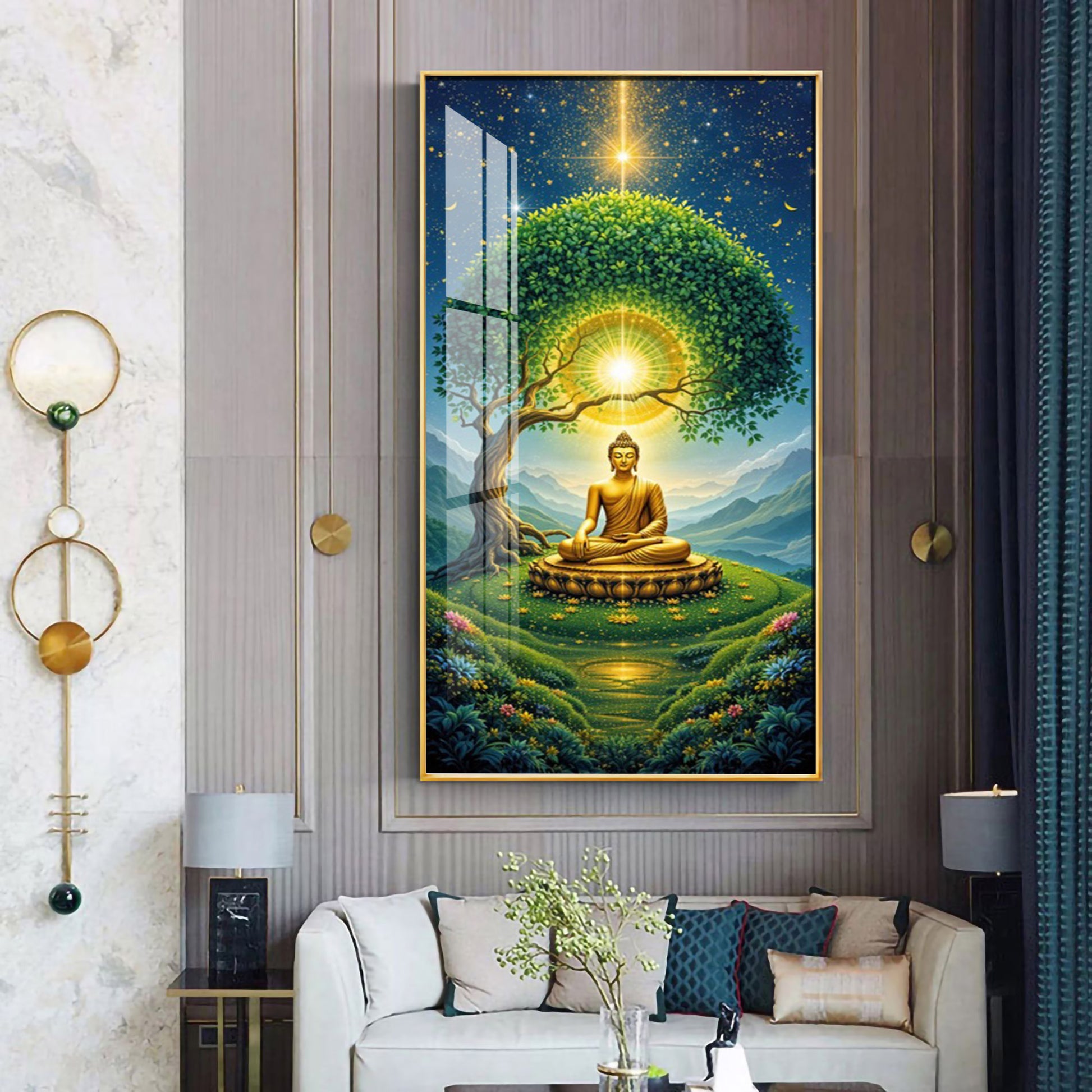 Meditating Buddha In Nature Glass Finish Vertical Wall Art