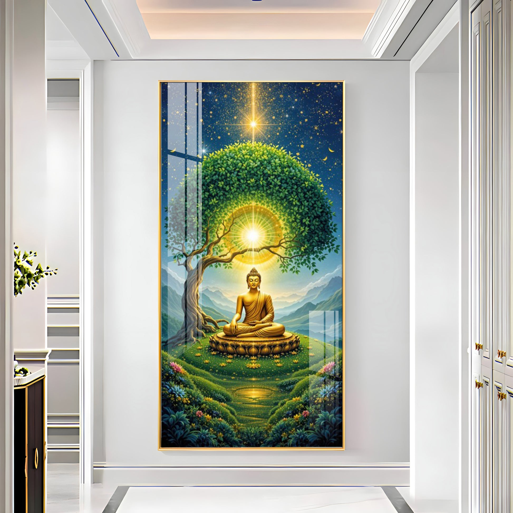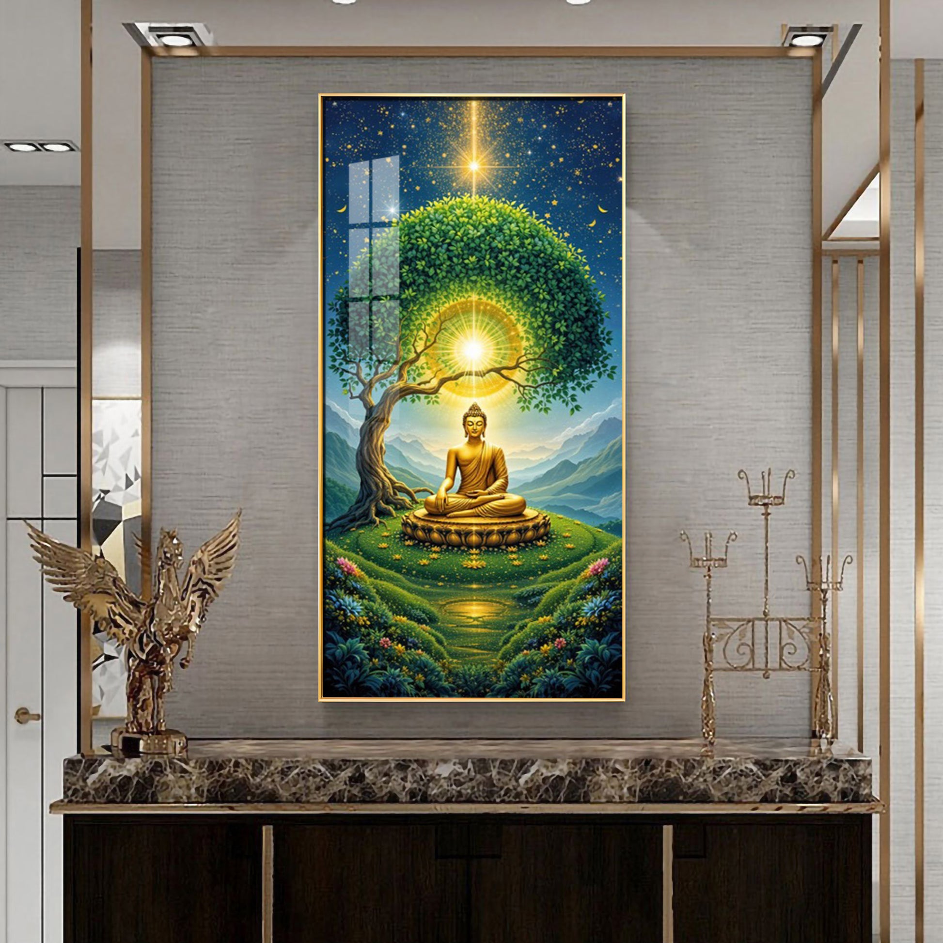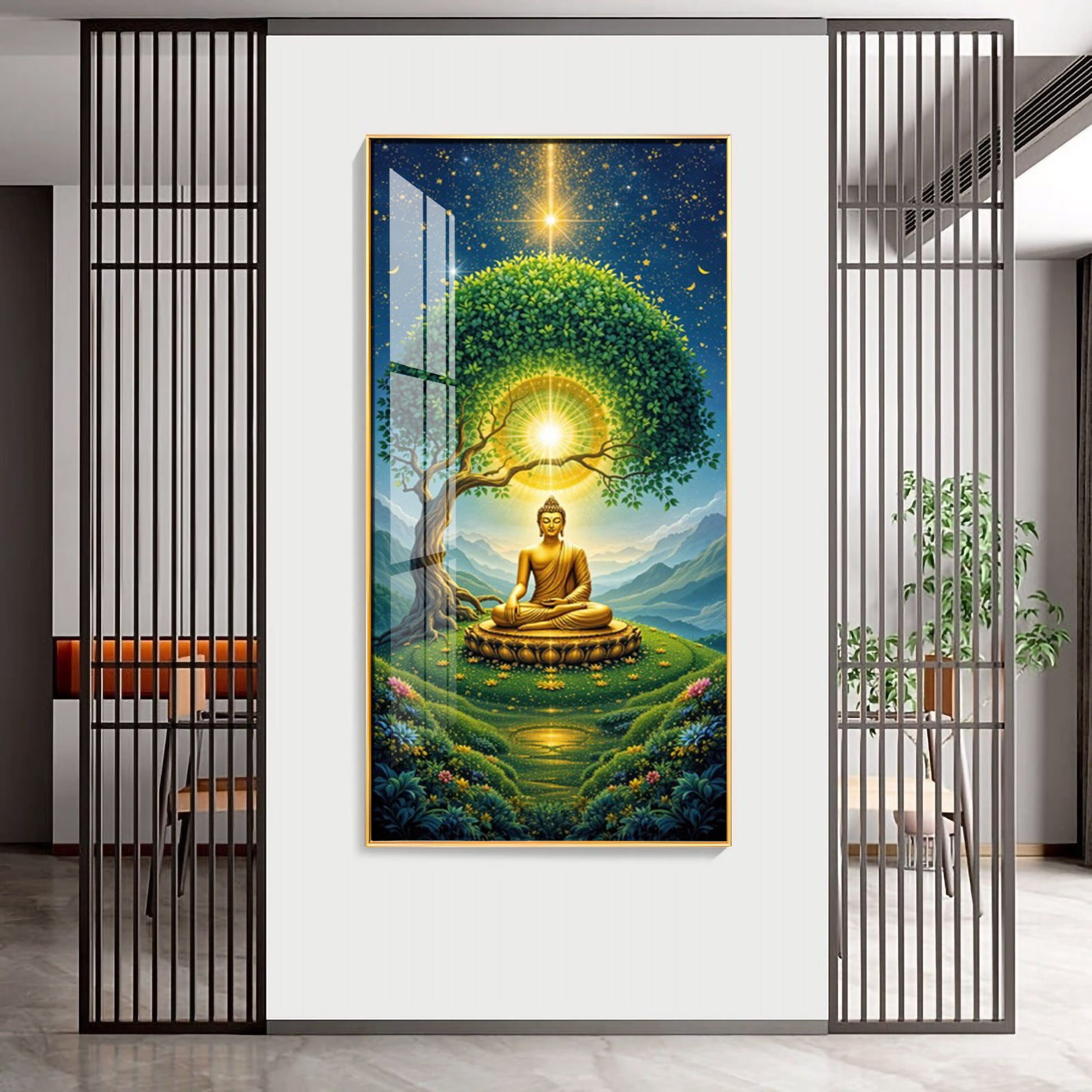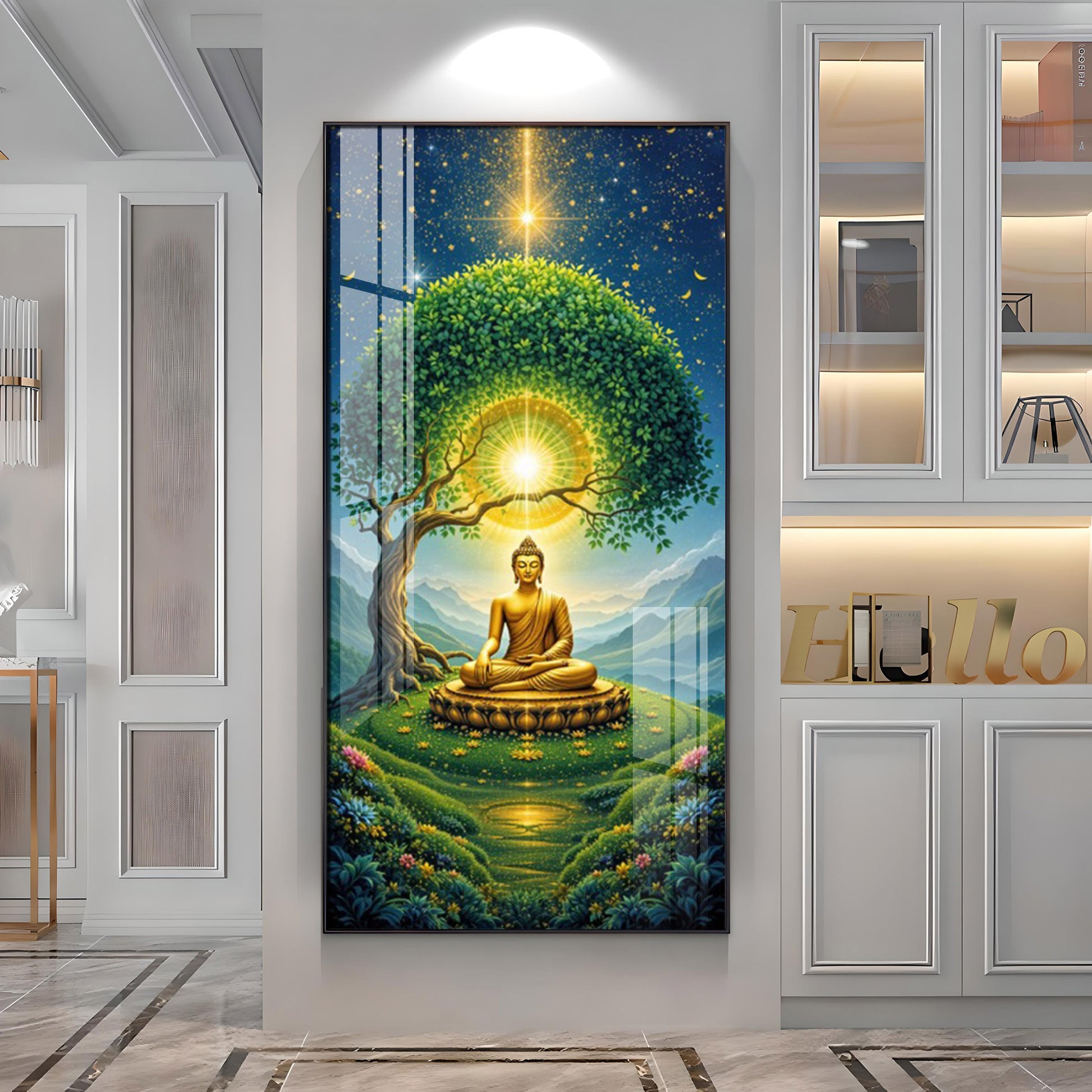 Meditating Buddha In Nature Glass Finish Vertical Wall Art
