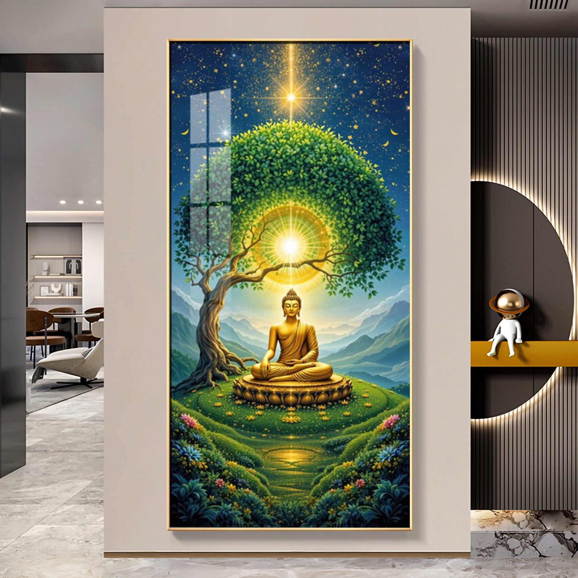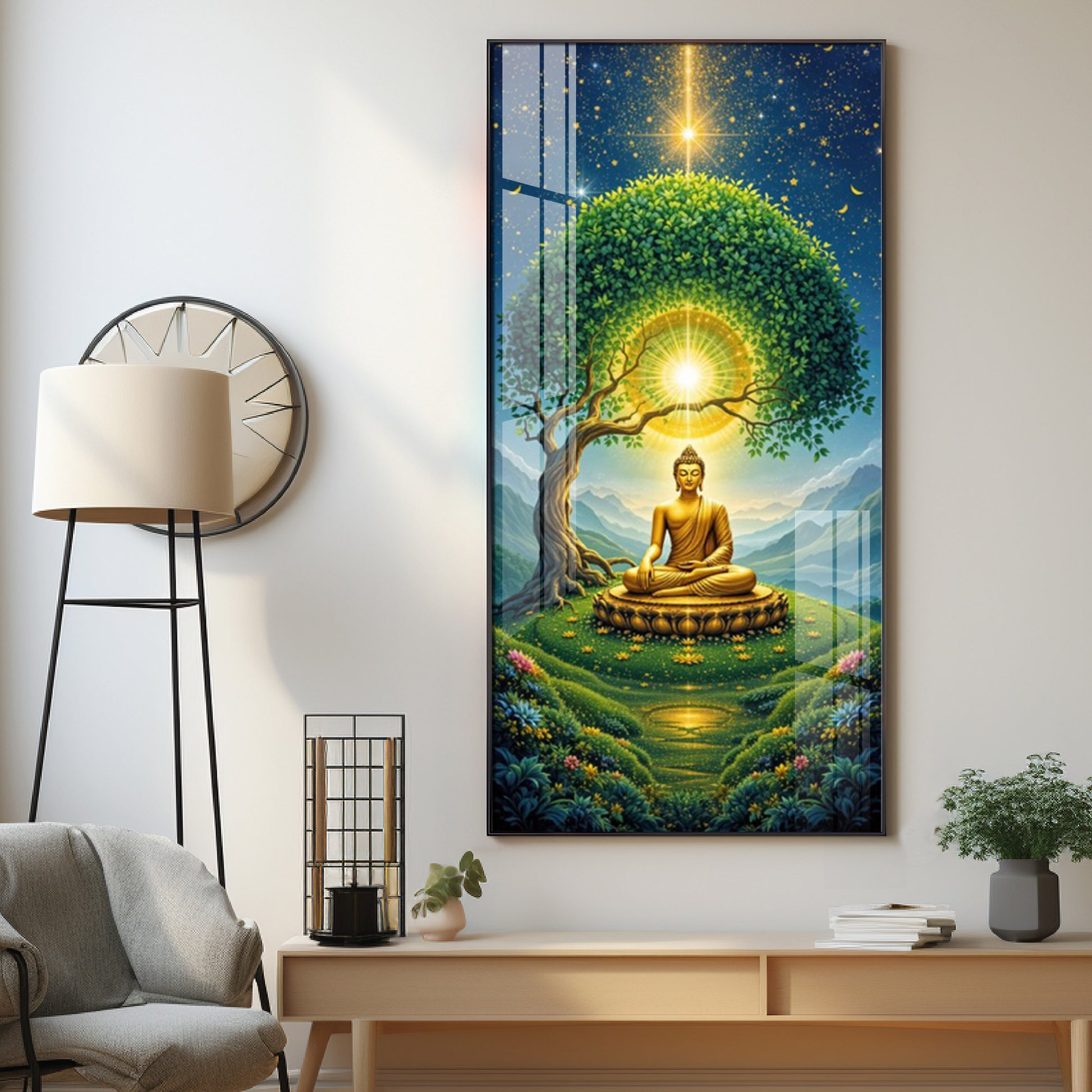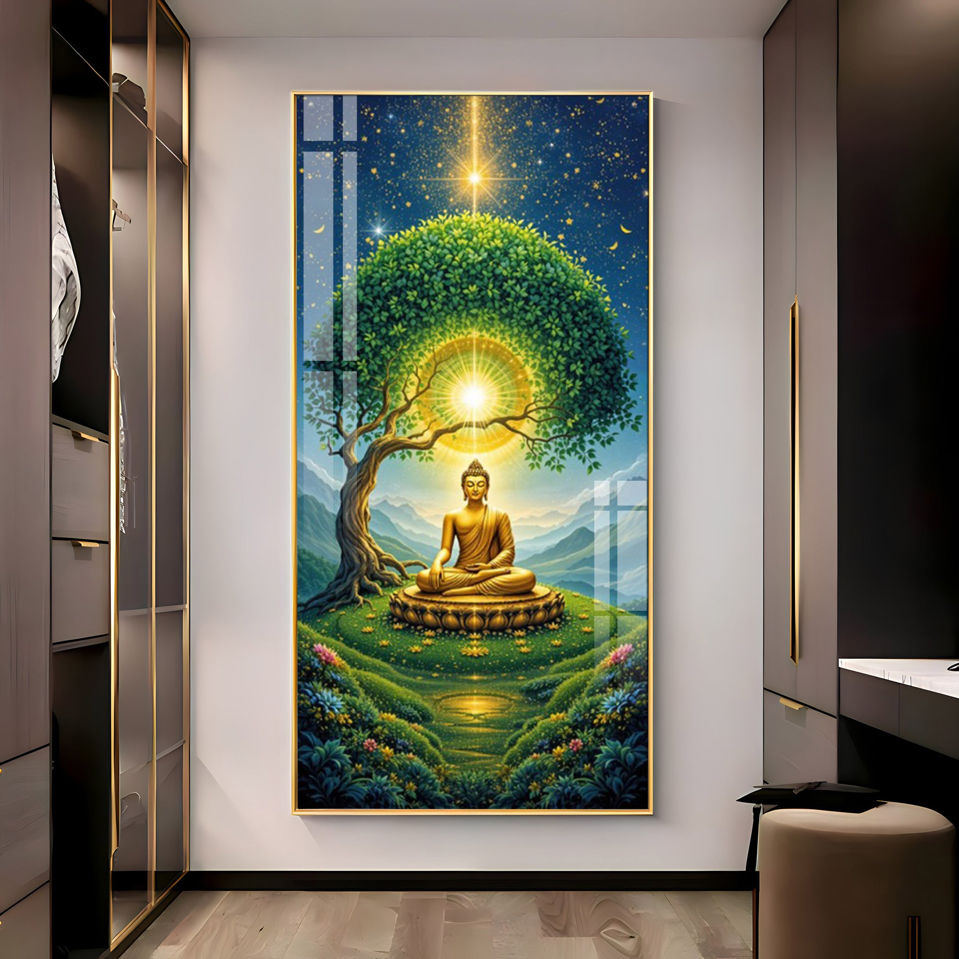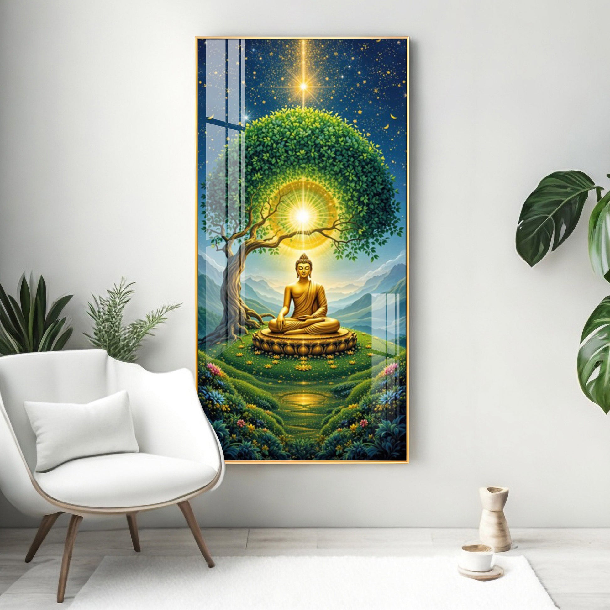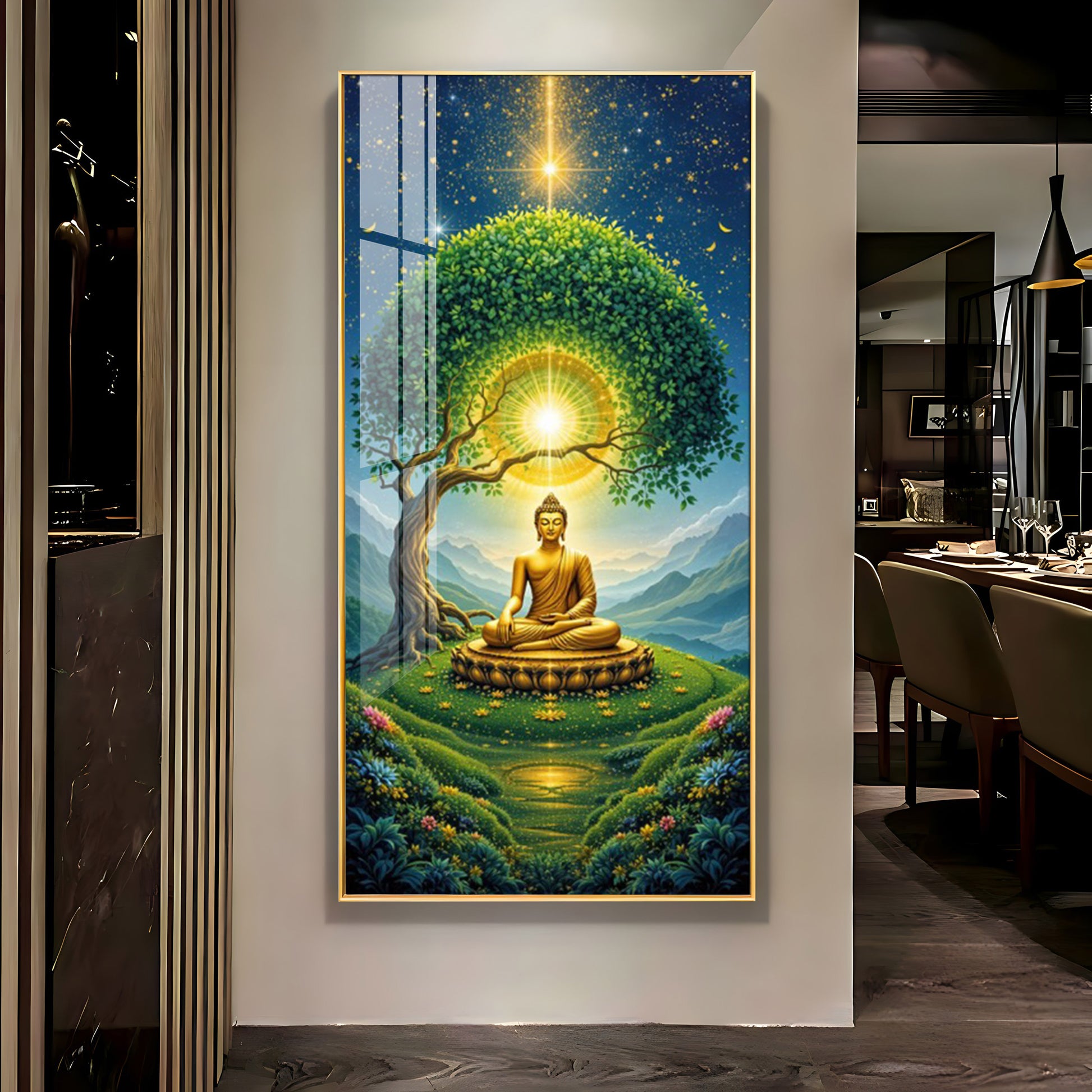Meditating Buddha In Nature Glass Finish Vertical Wall Art