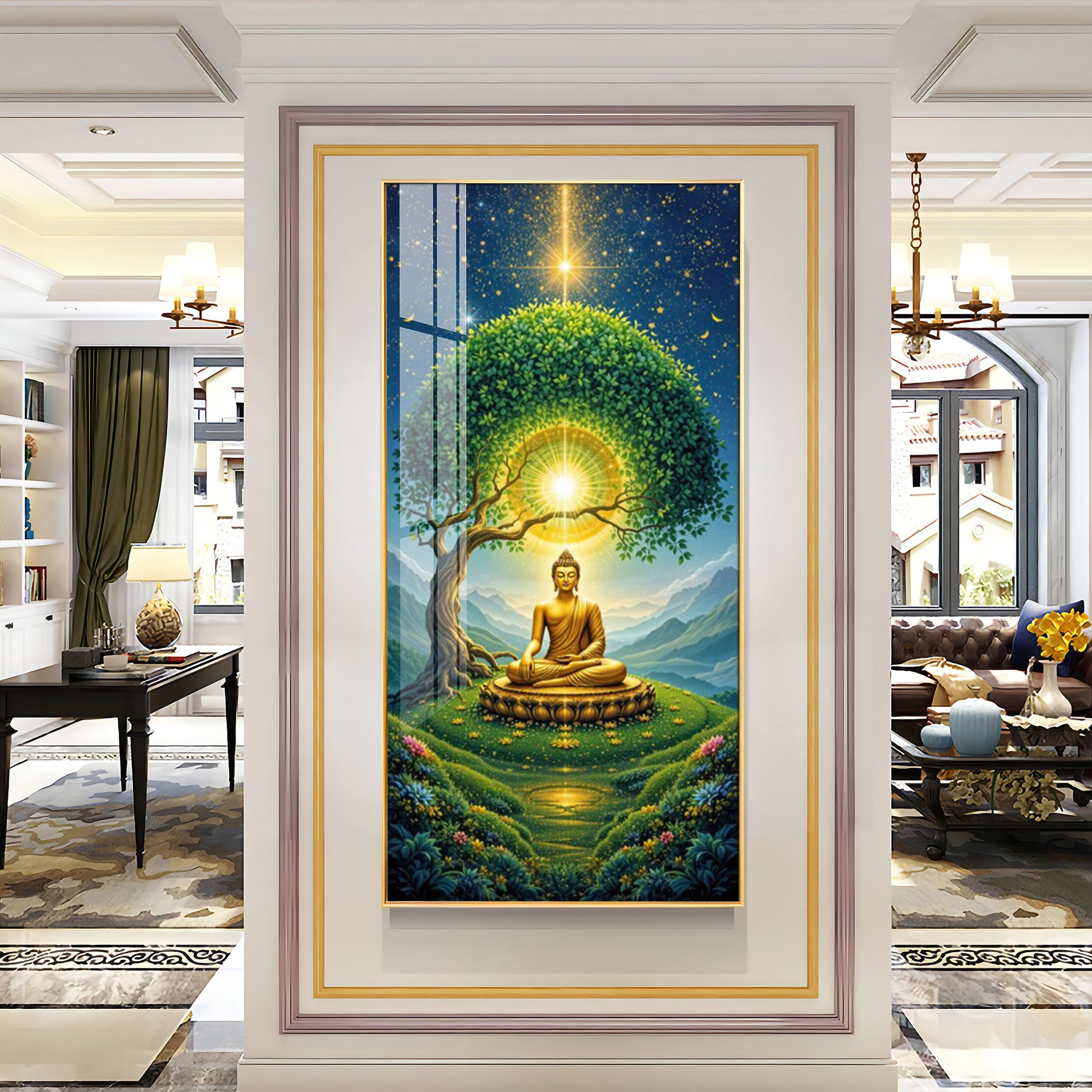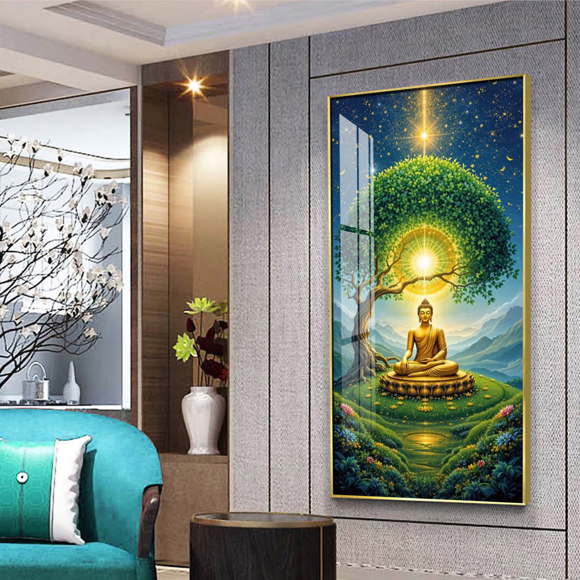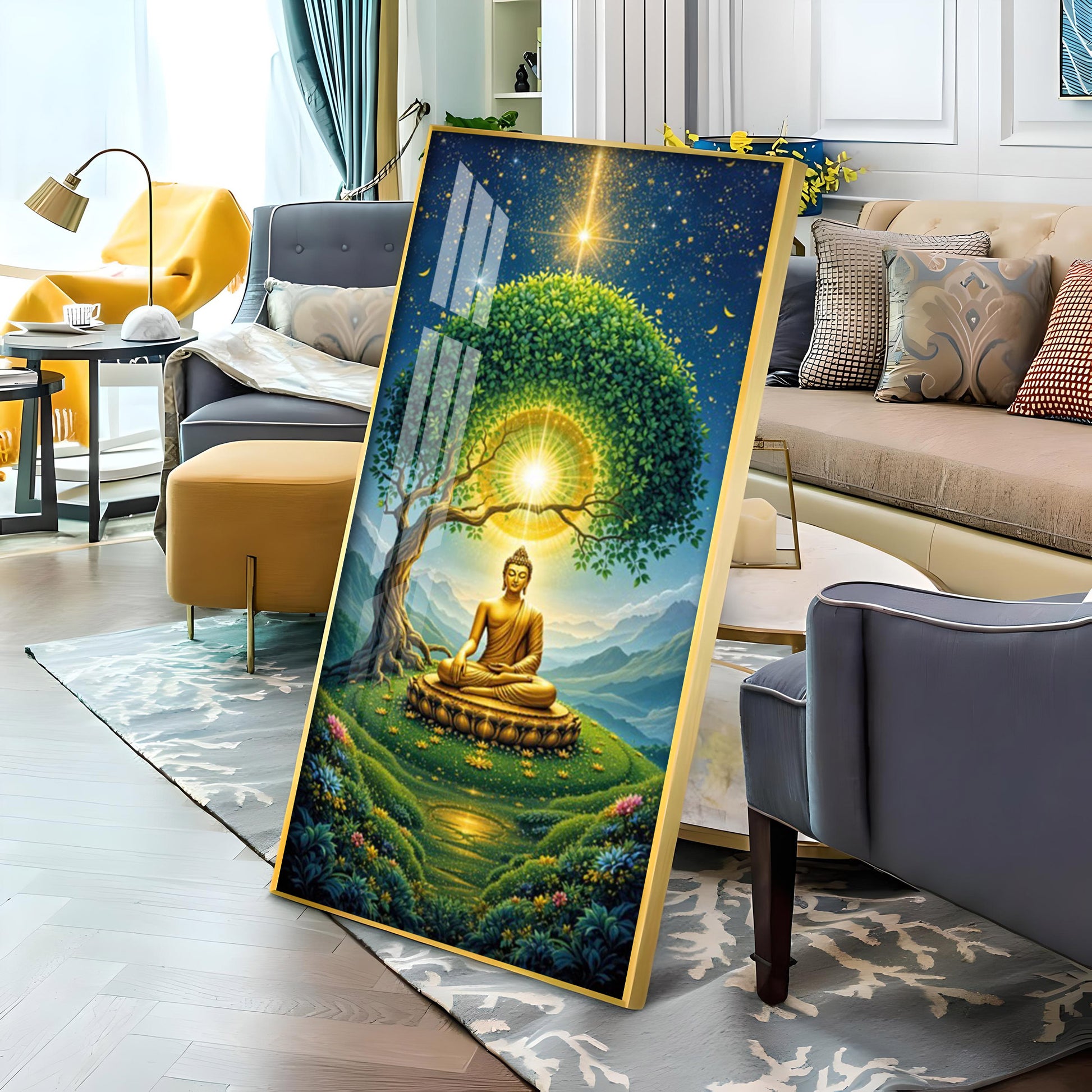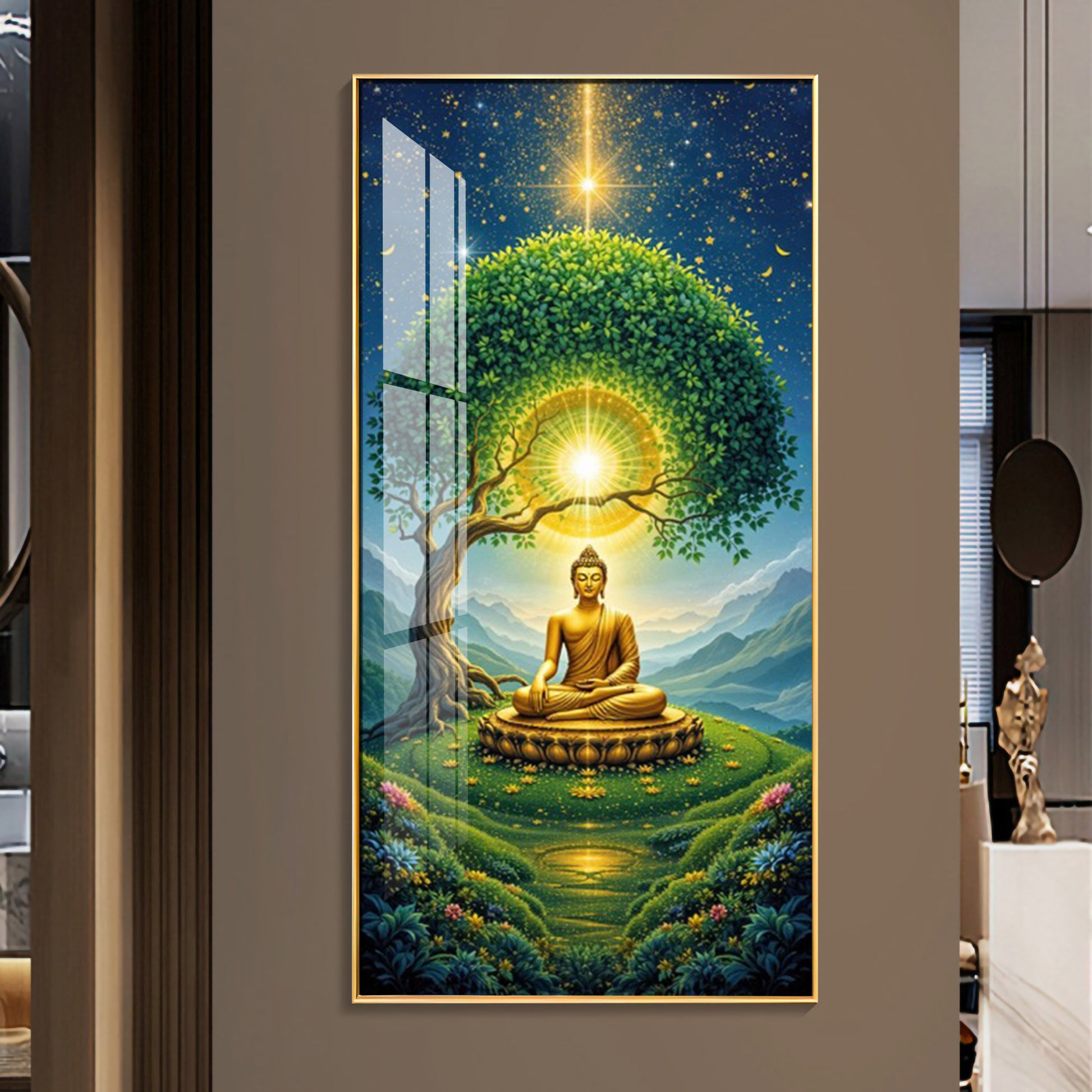 Meditating Buddha In Nature Glass Finish Vertical Wall Art