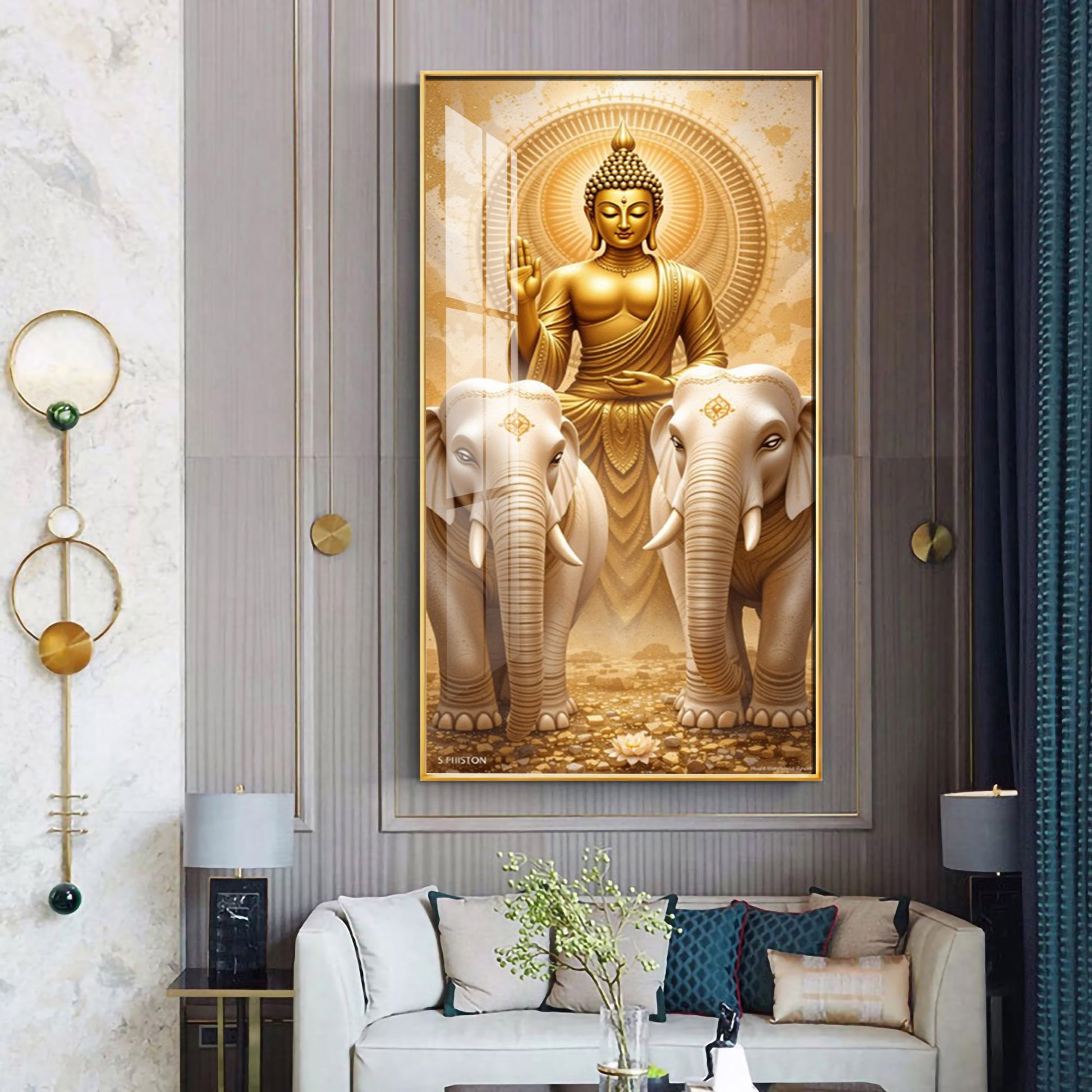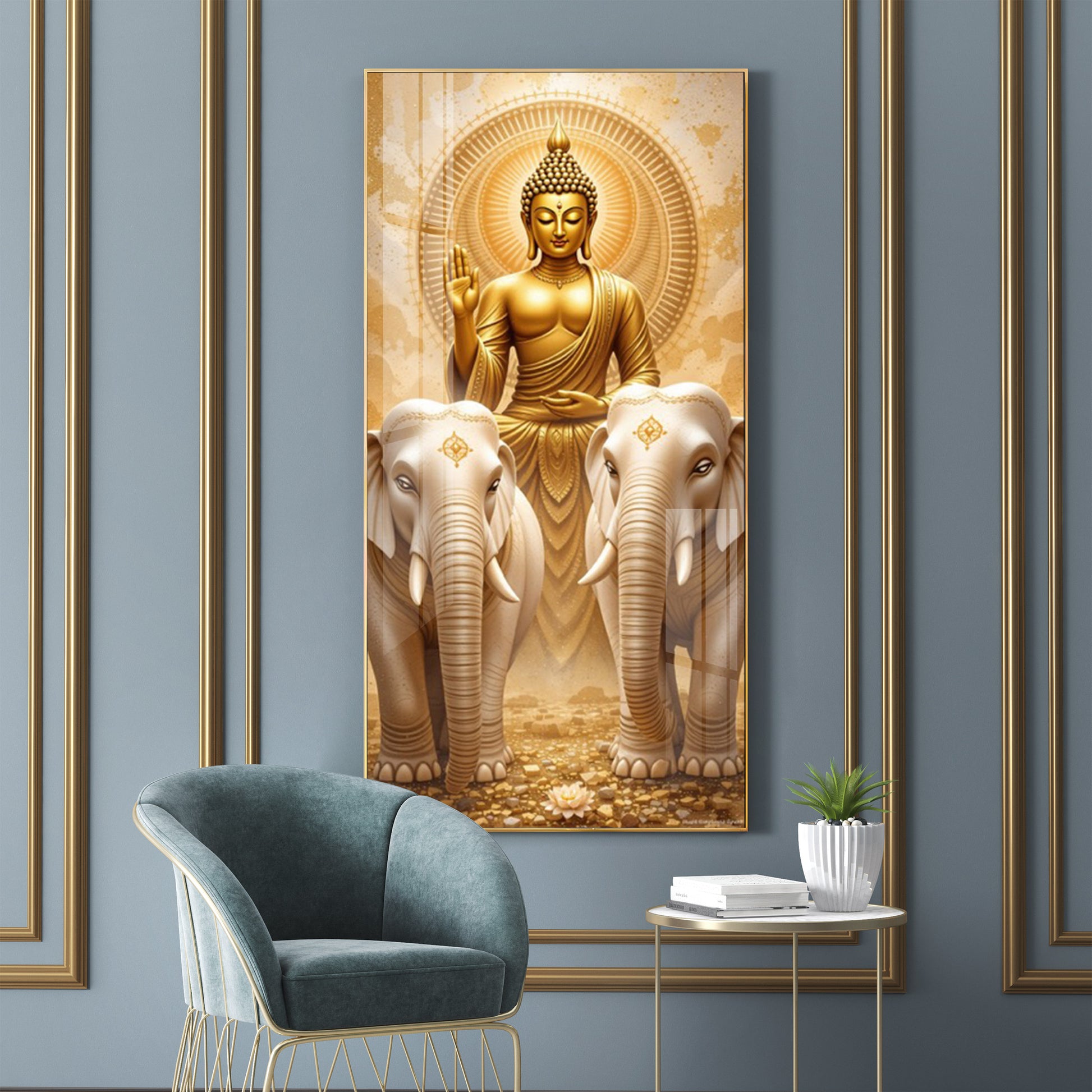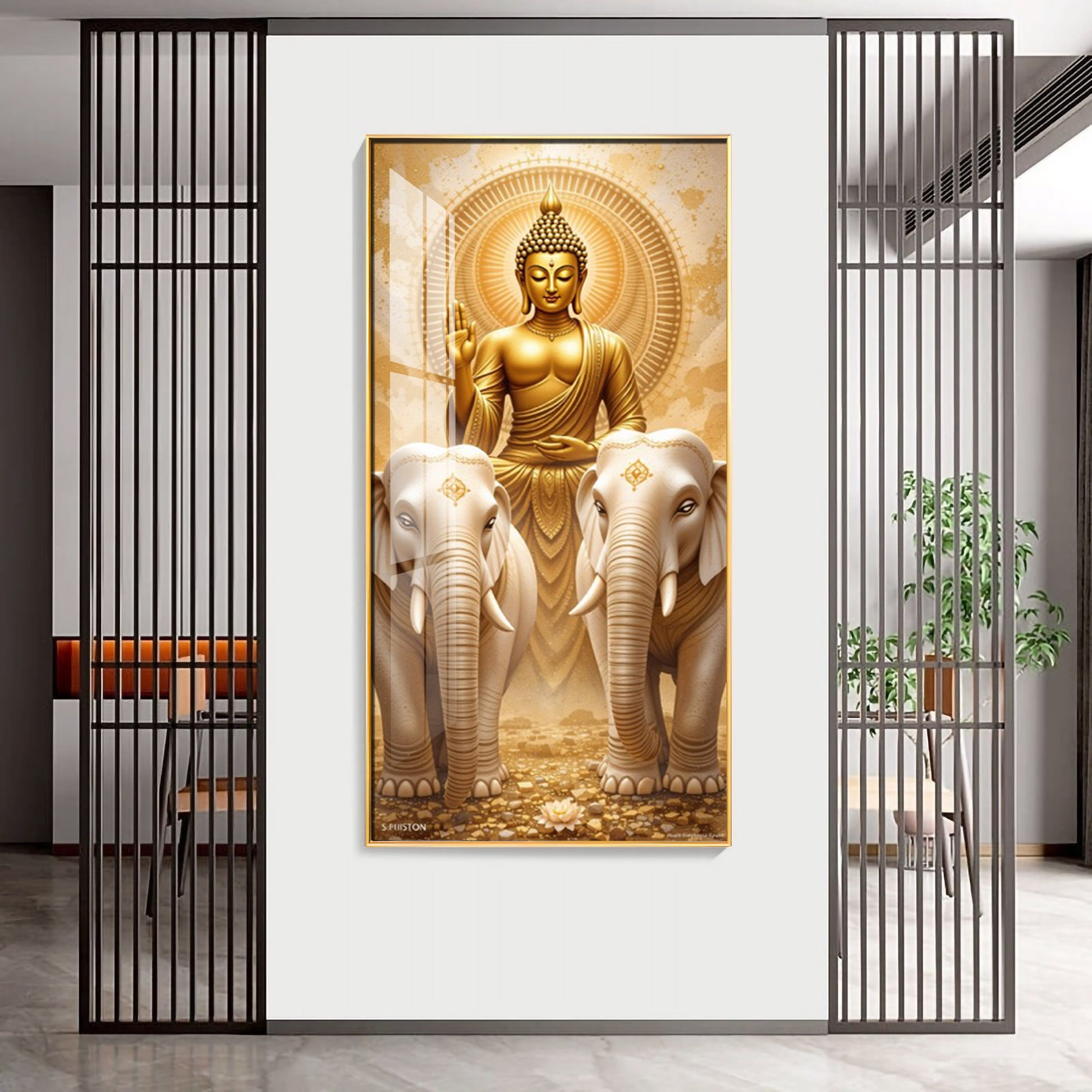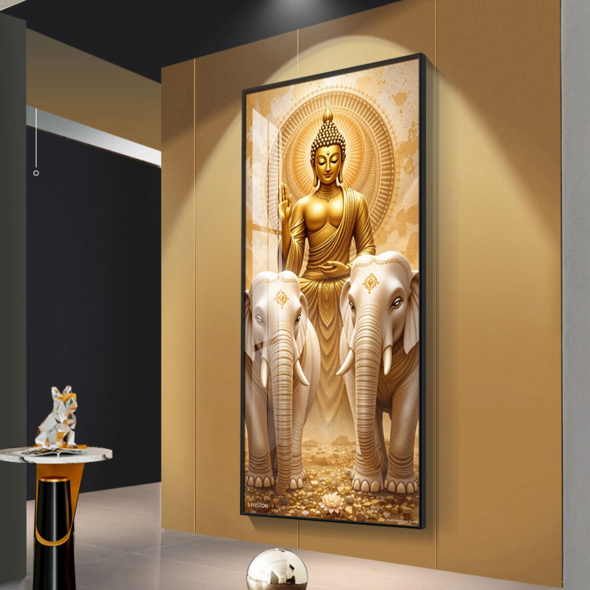 Meditating Buddha With Alpha Elephant Glass Finish Vertical Wall Art