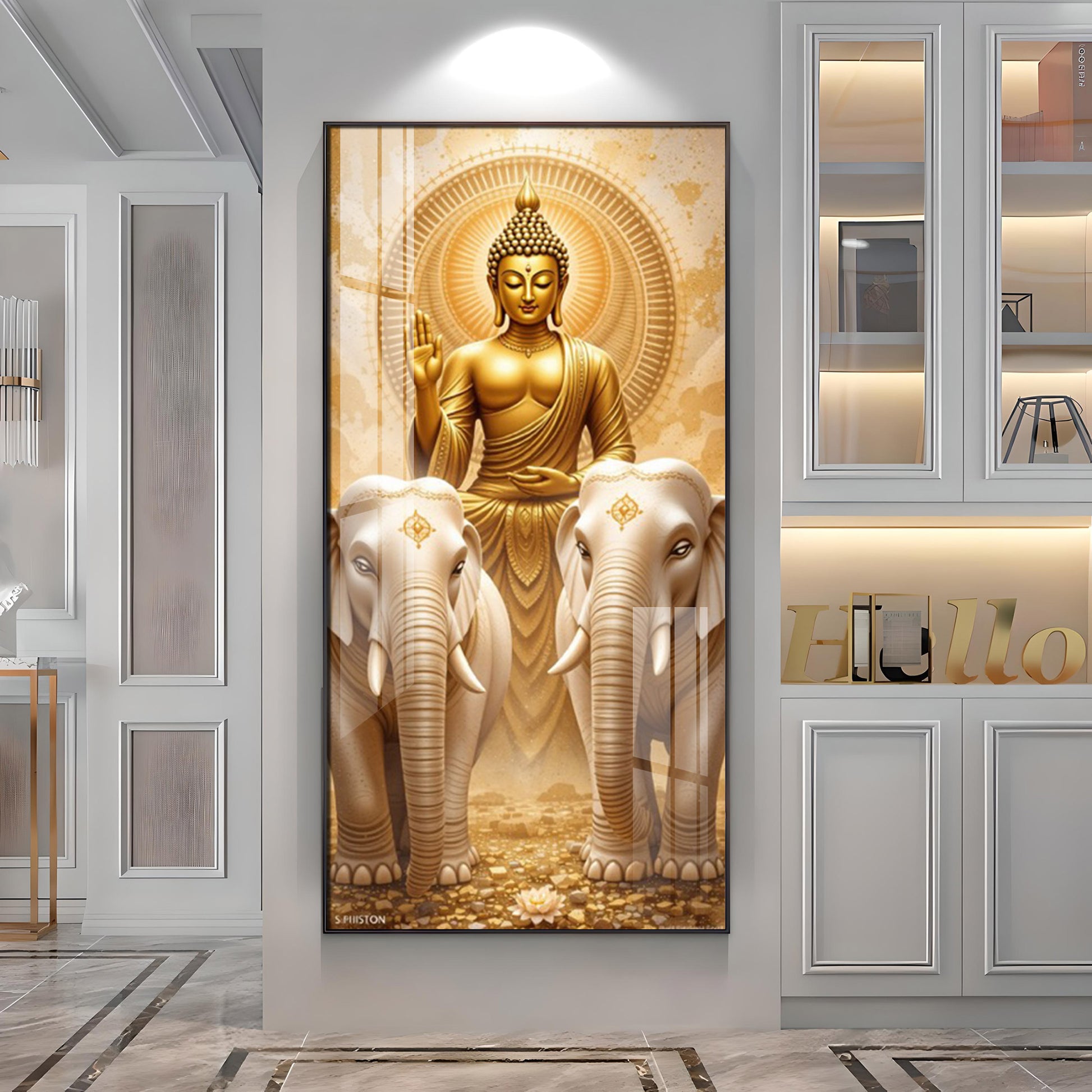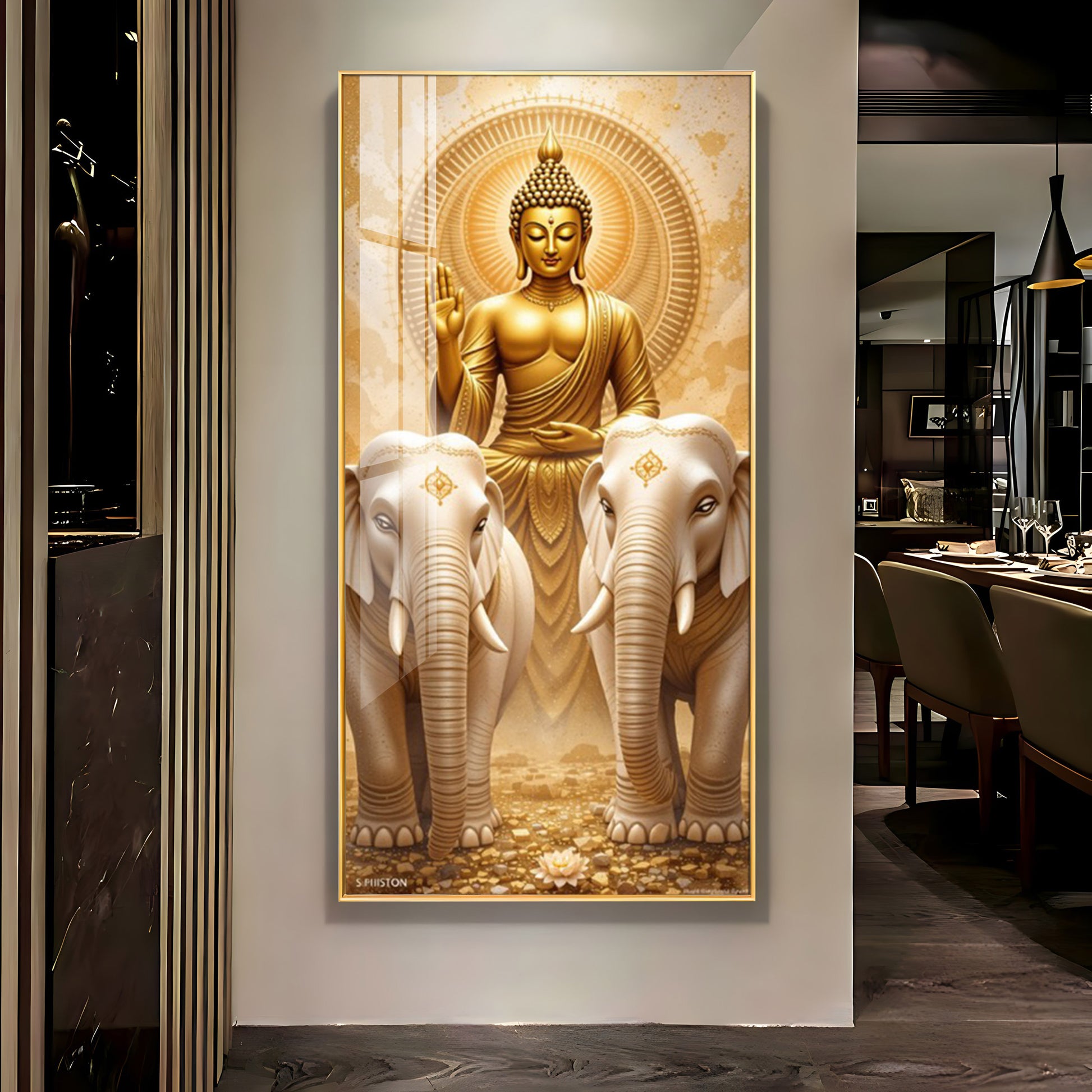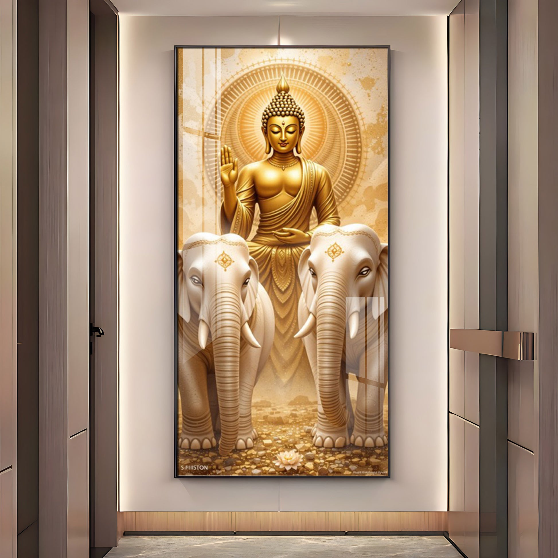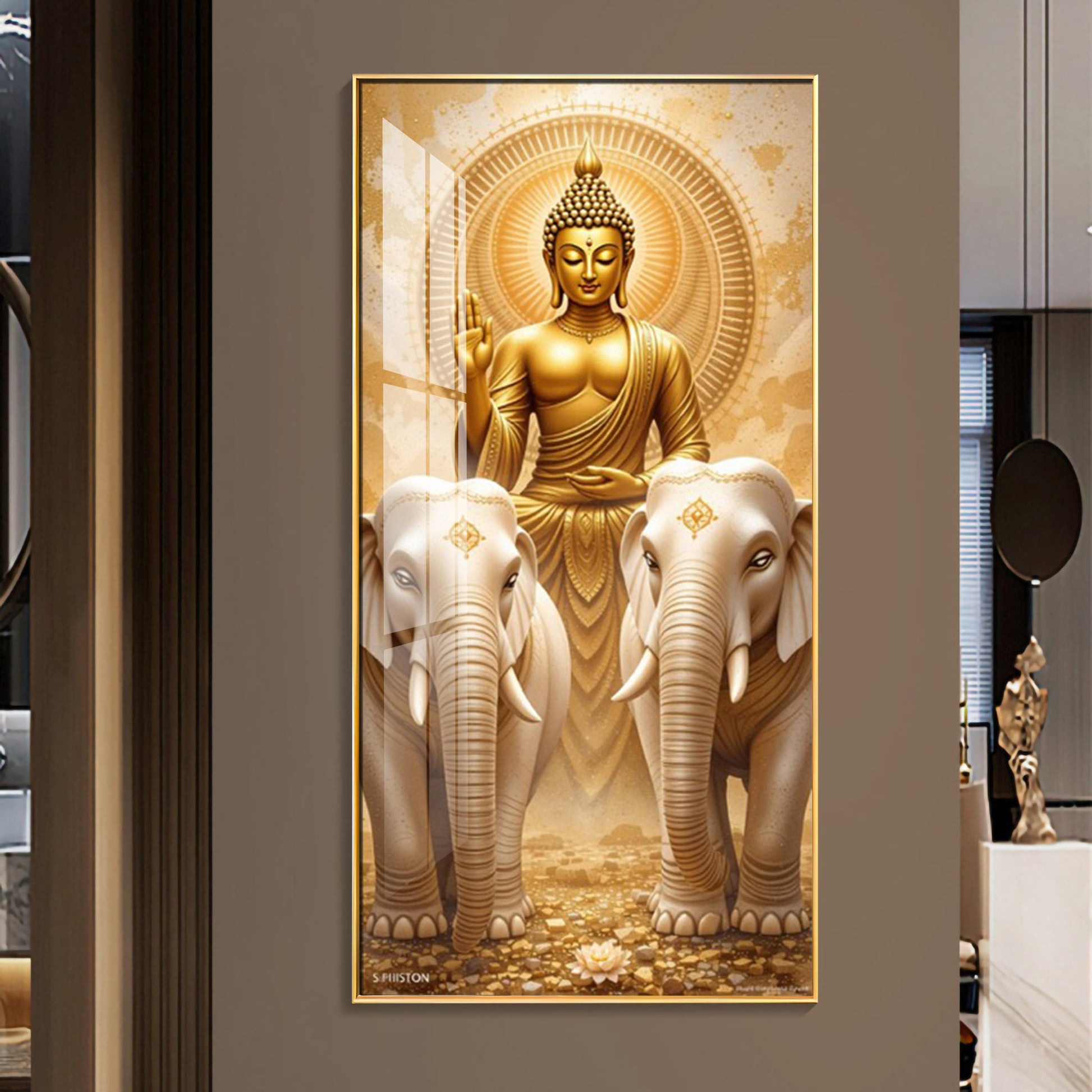 Meditating Buddha With Alpha Elephant Glass Finish Vertical Wall Art
