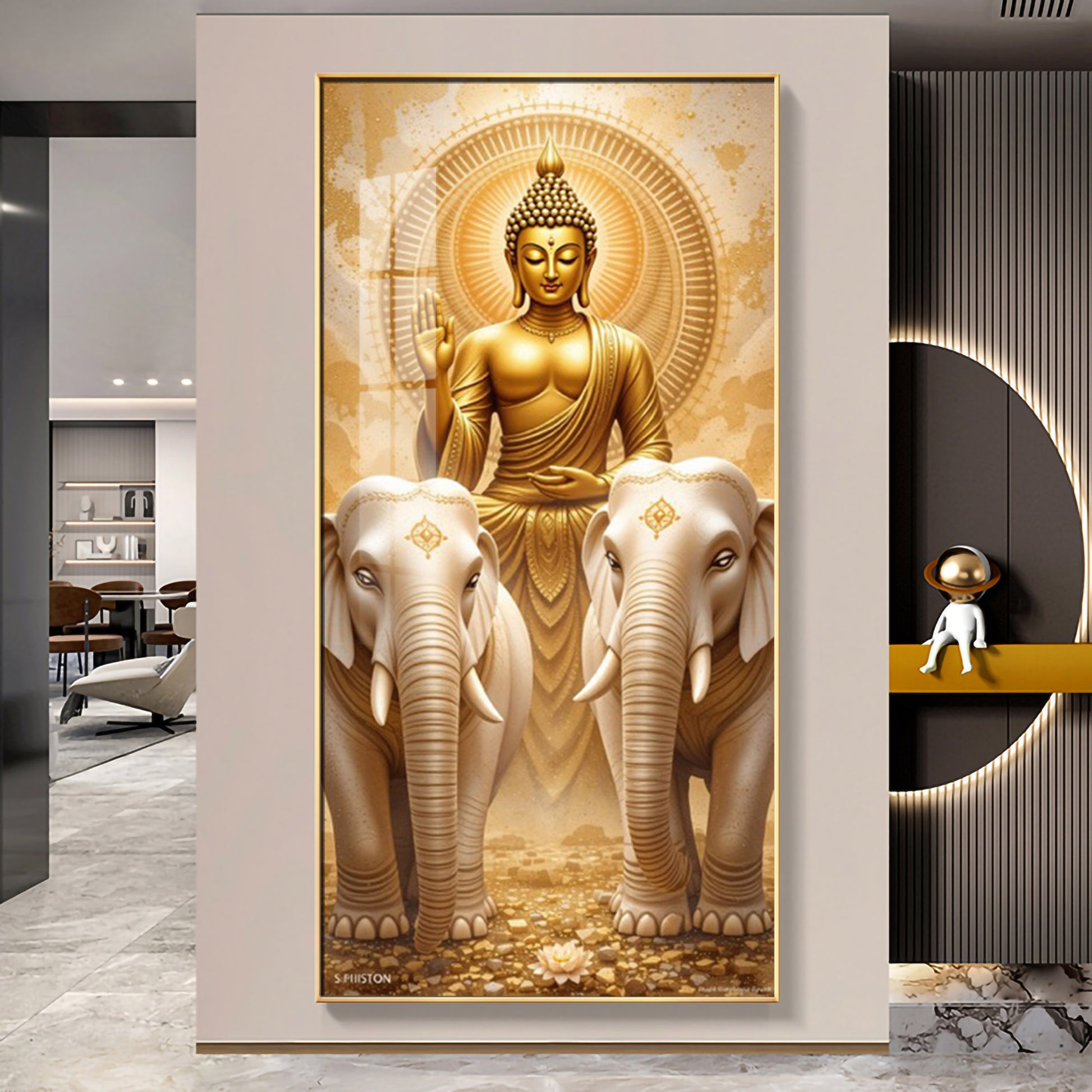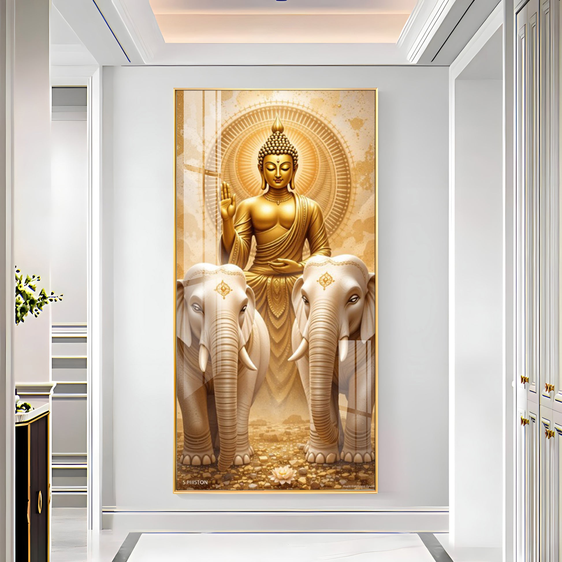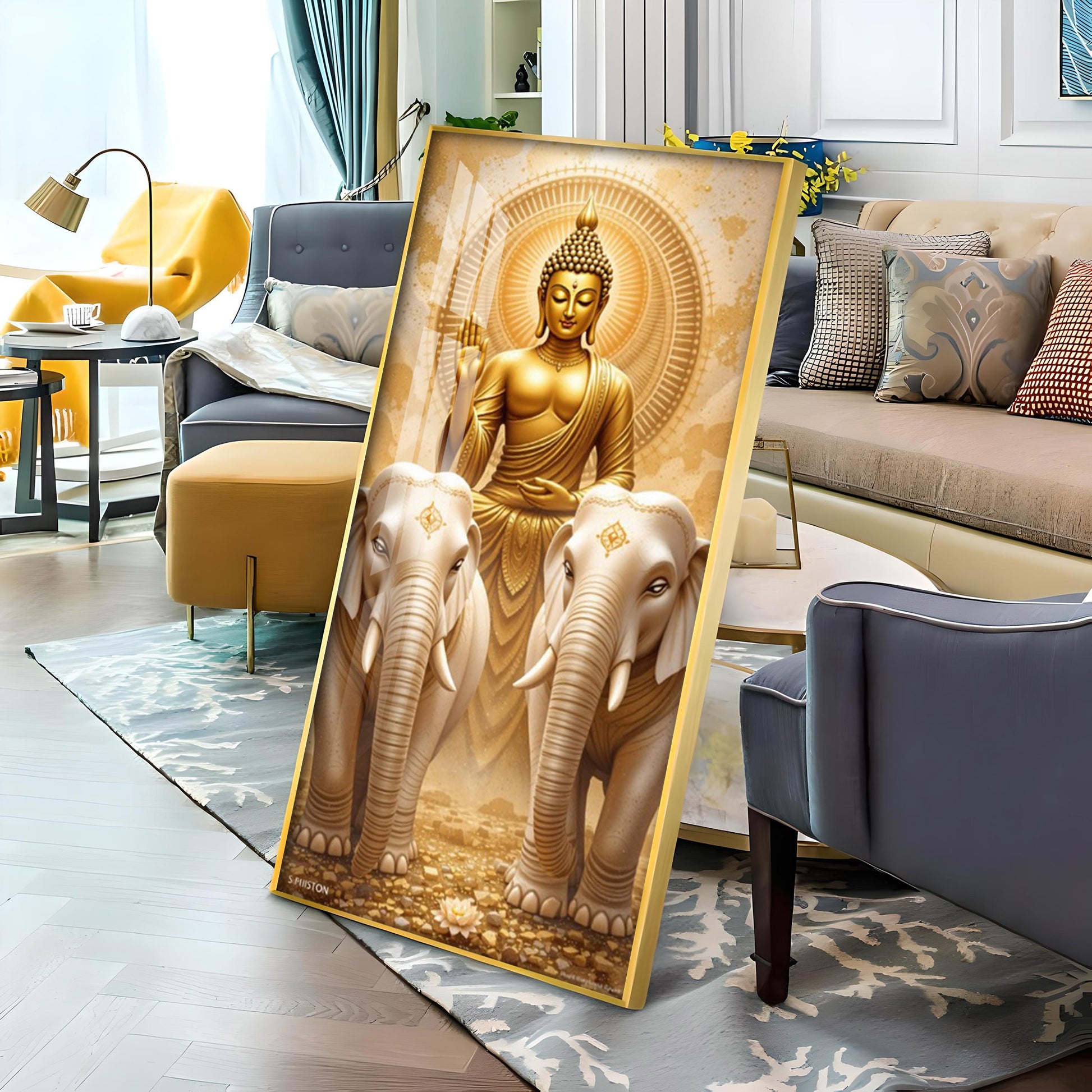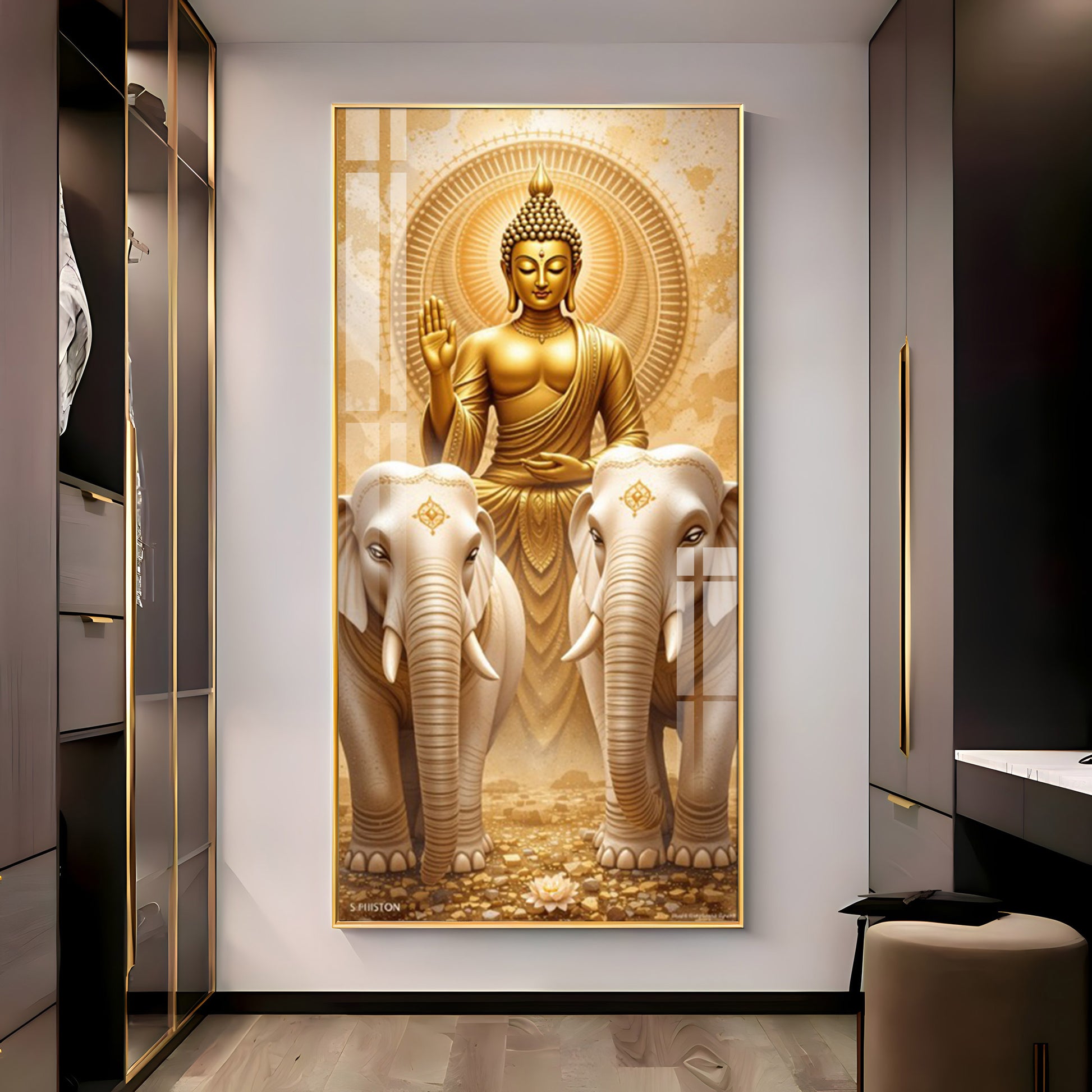 Meditating Buddha With Alpha Elephant Glass Finish Vertical Wall Art