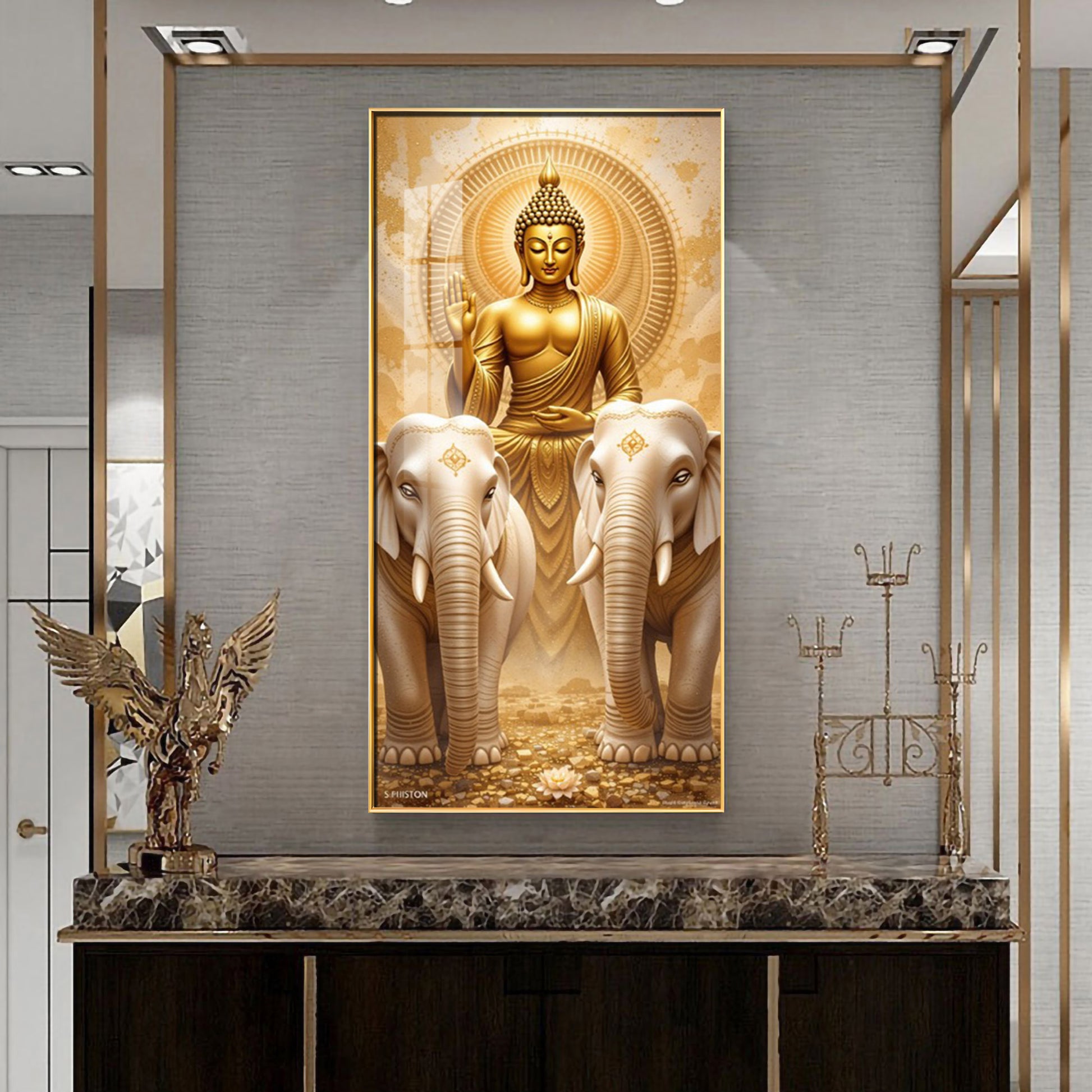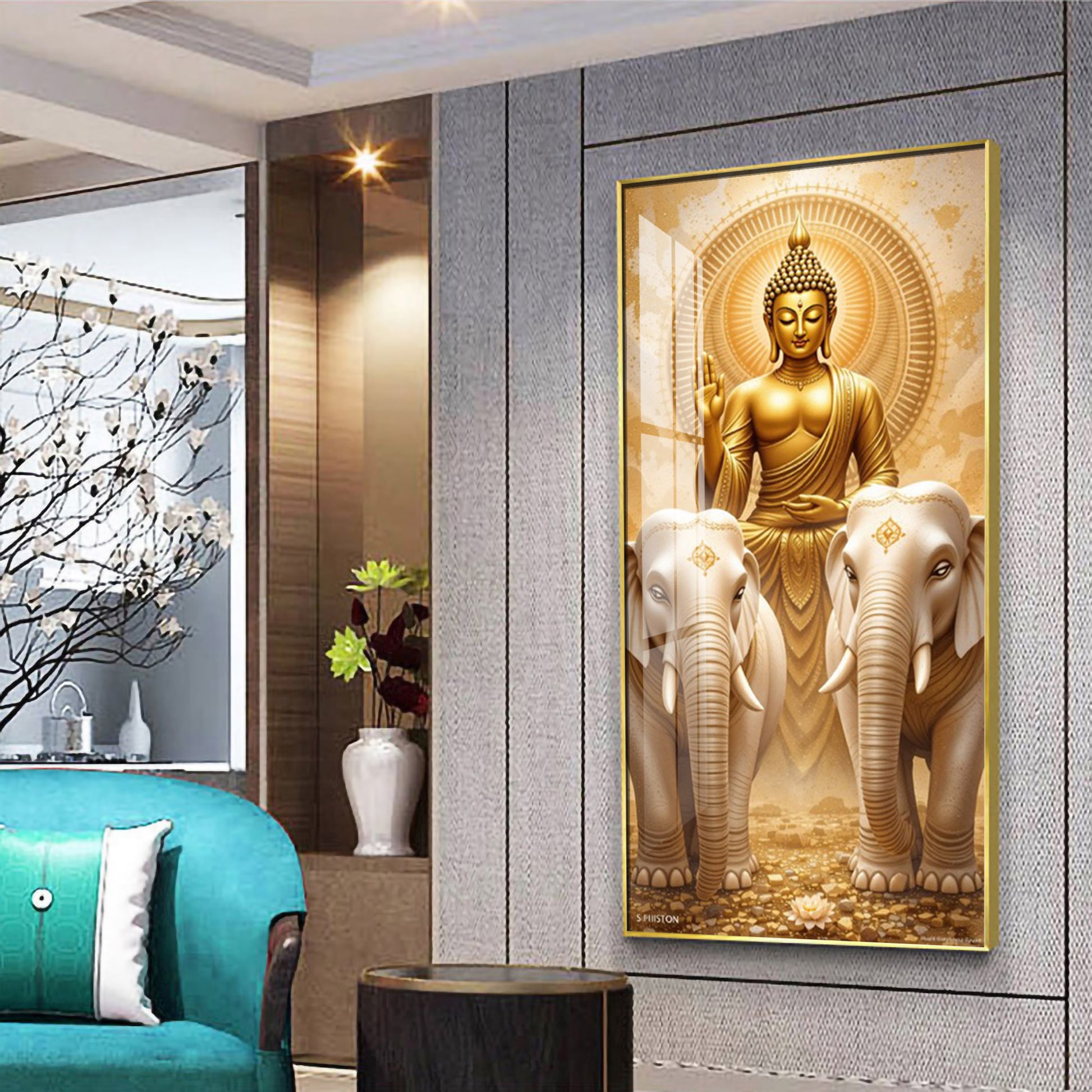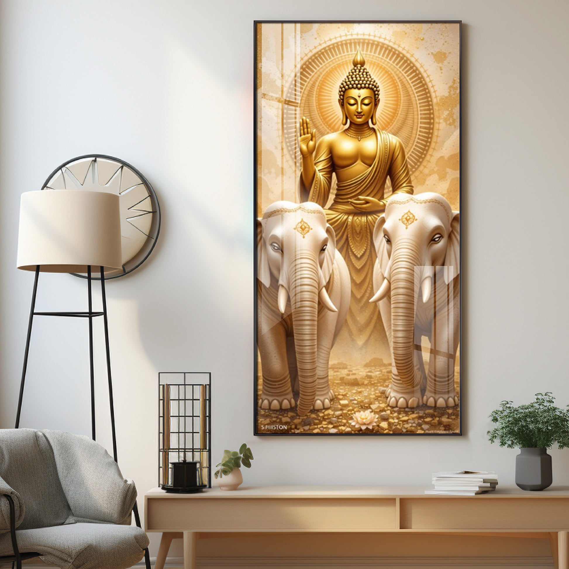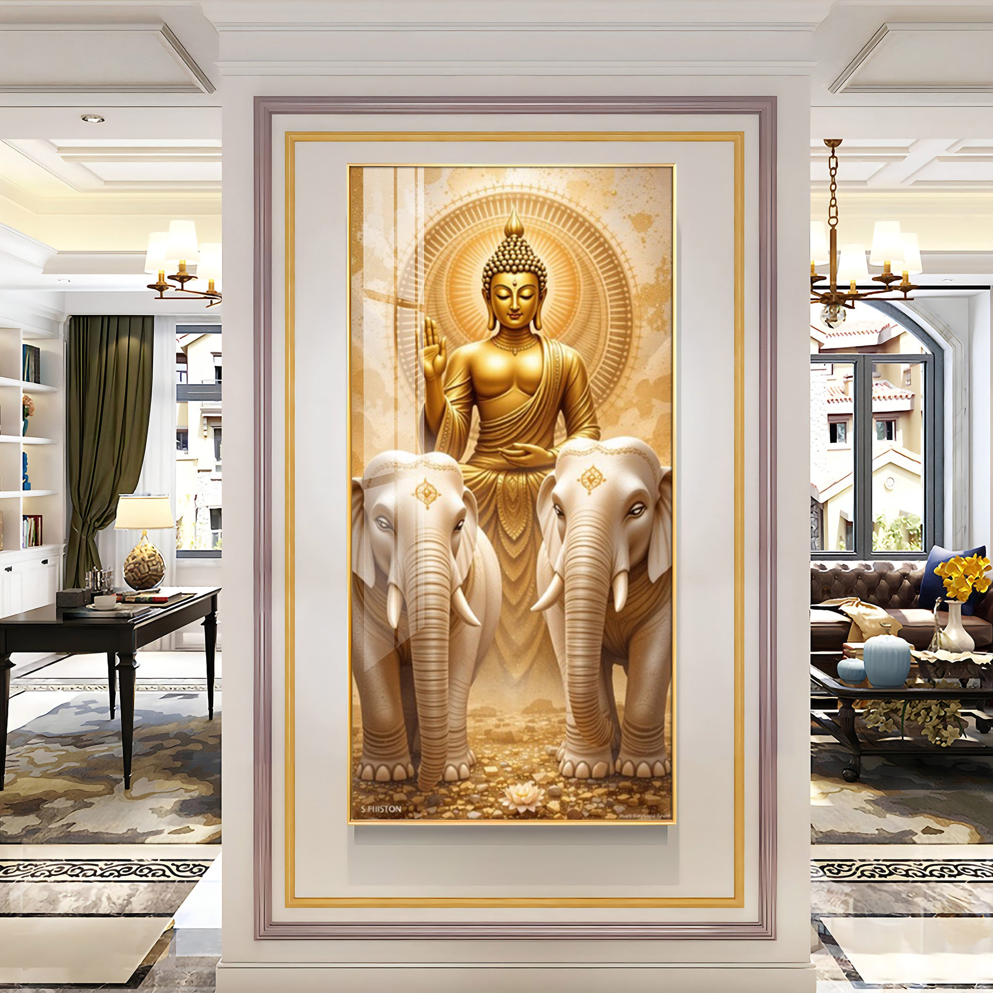 Meditating Buddha With Alpha Elephant Glass Finish Vertical Wall Art