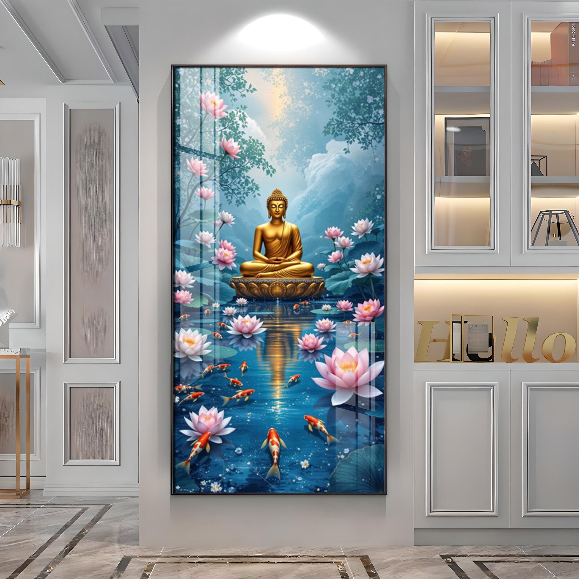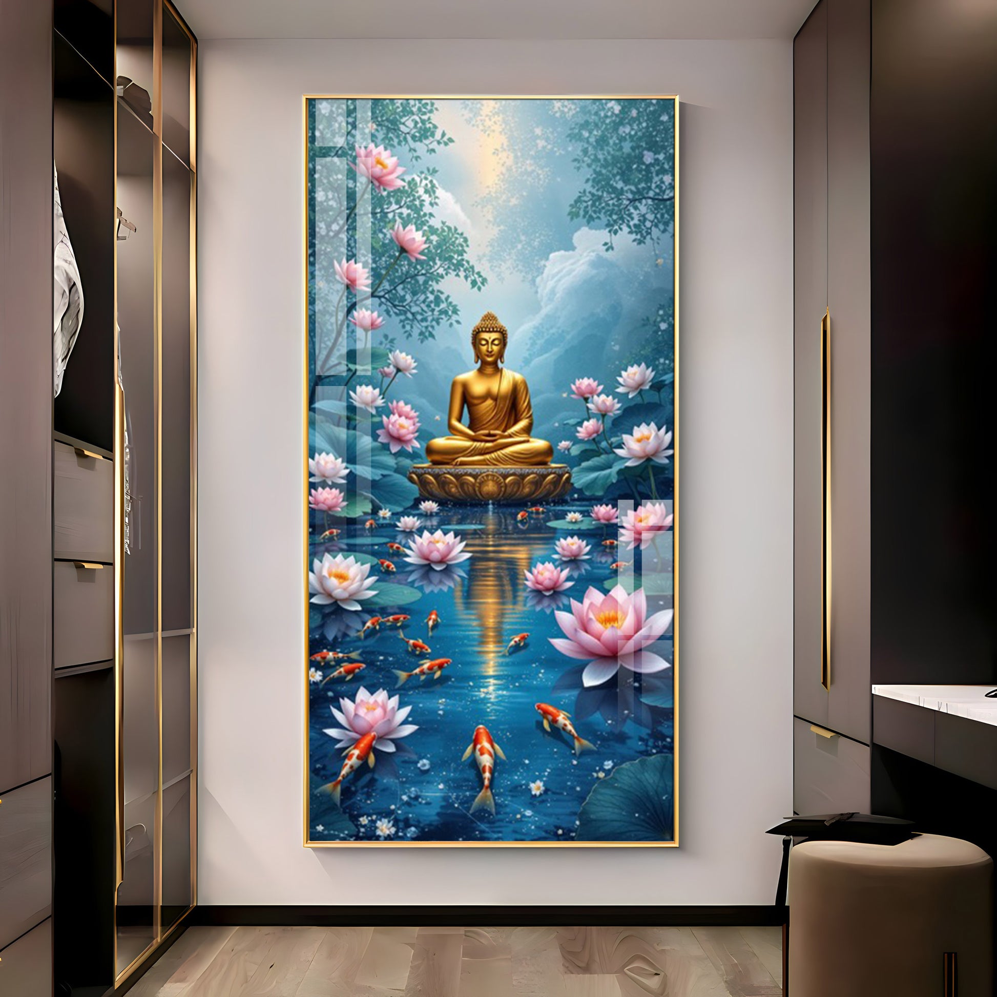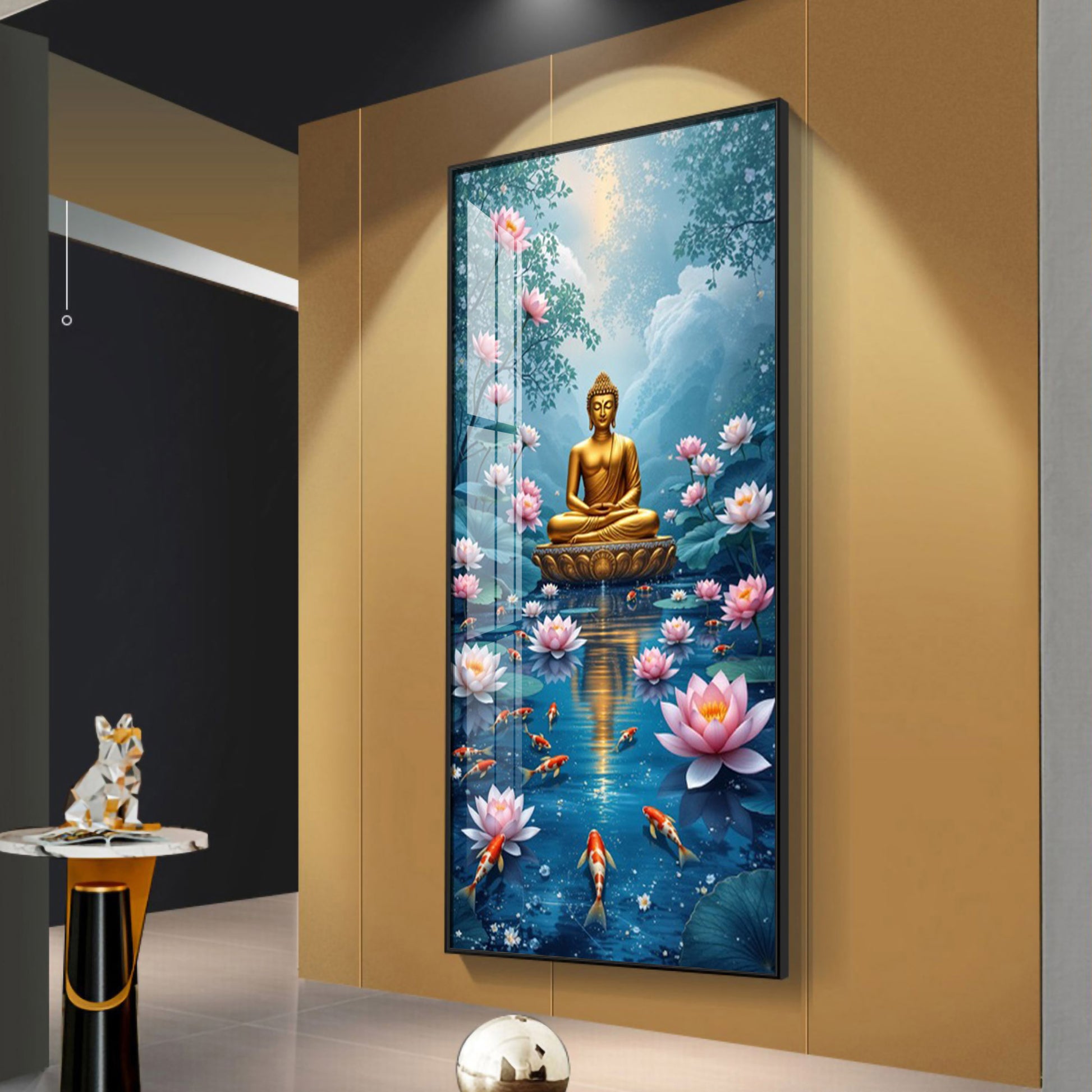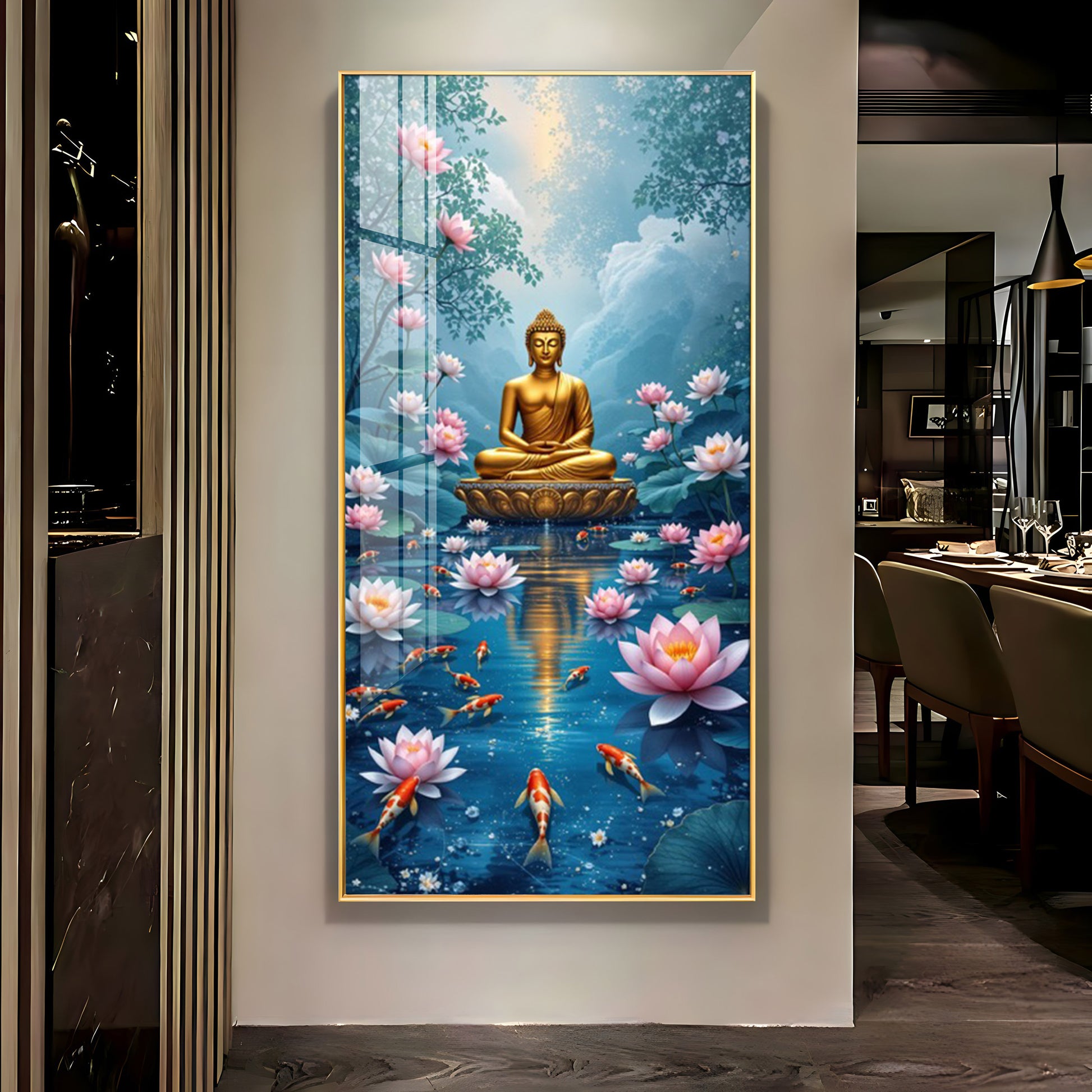 Meditating Buddha With Lotus Glass Finish Vertical Wall Art