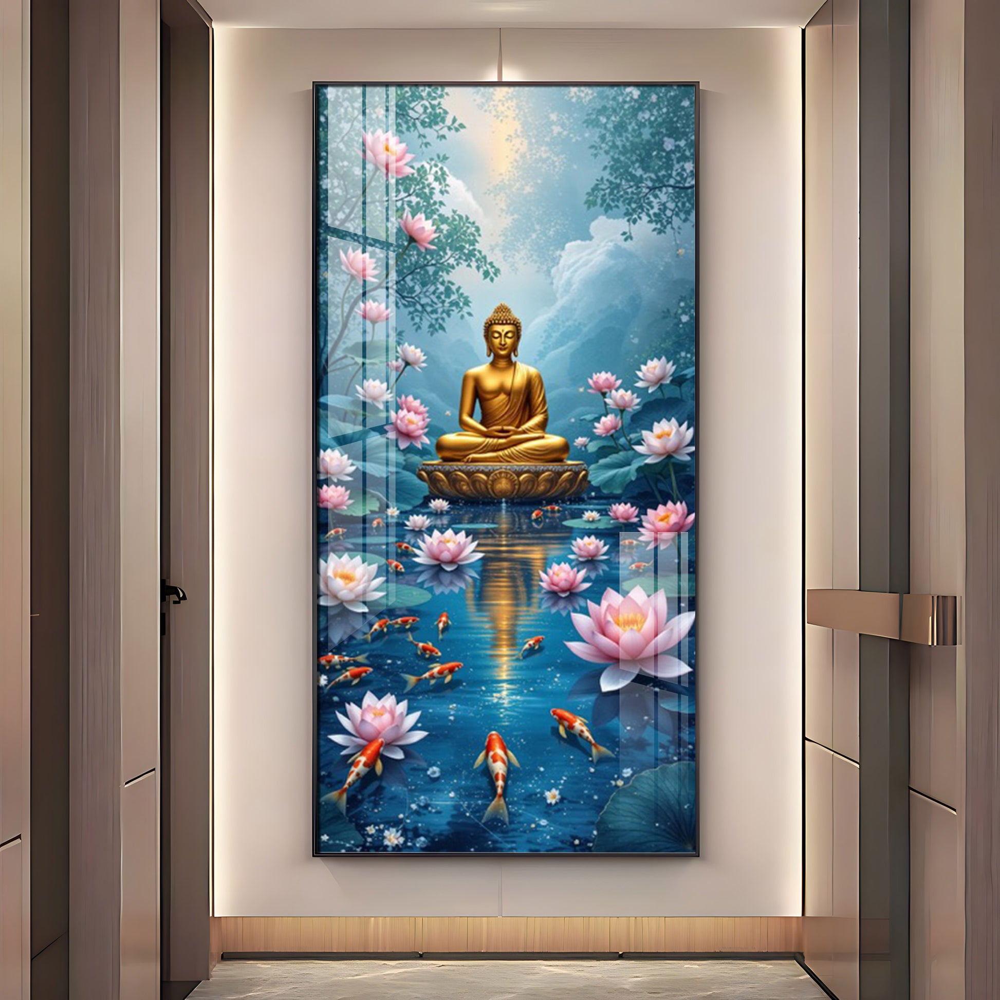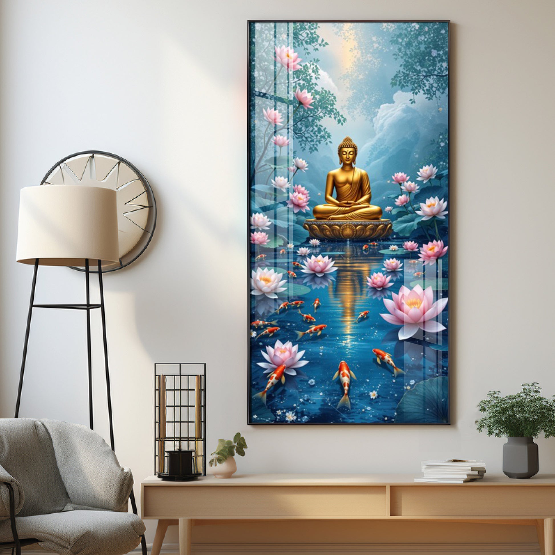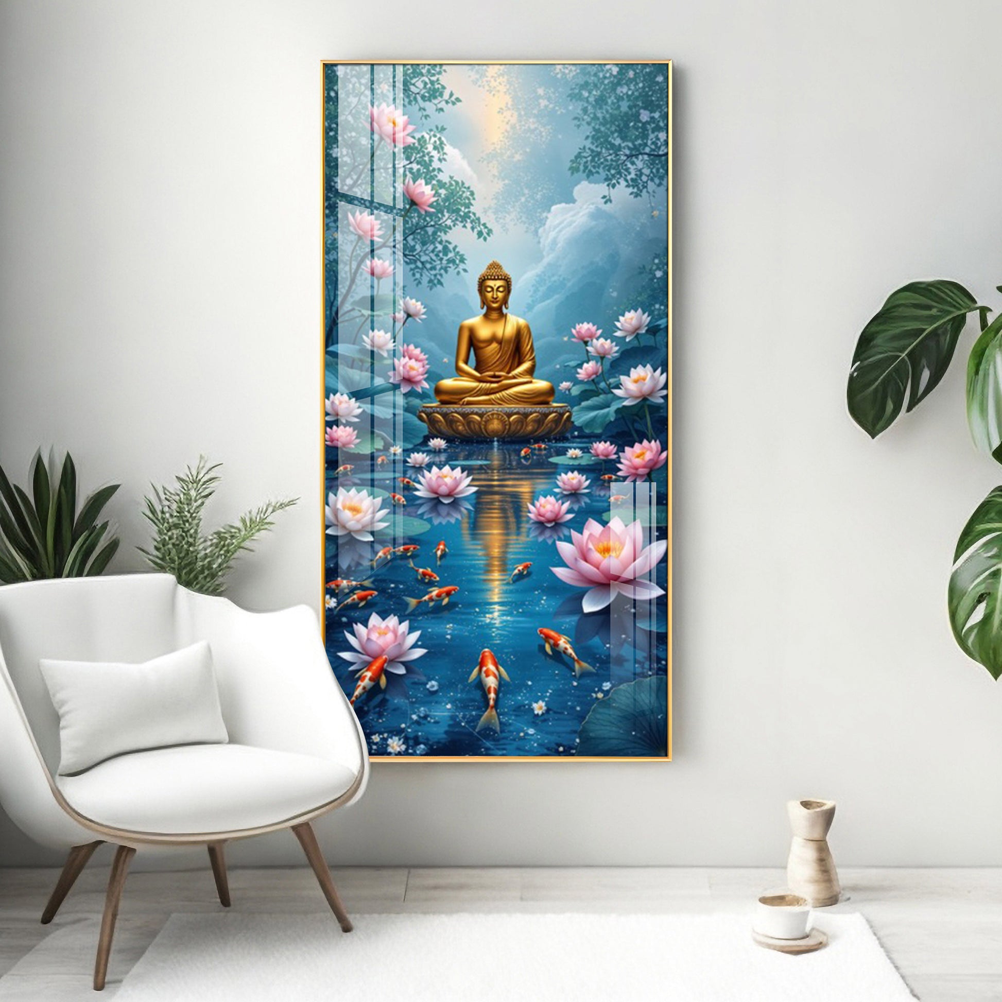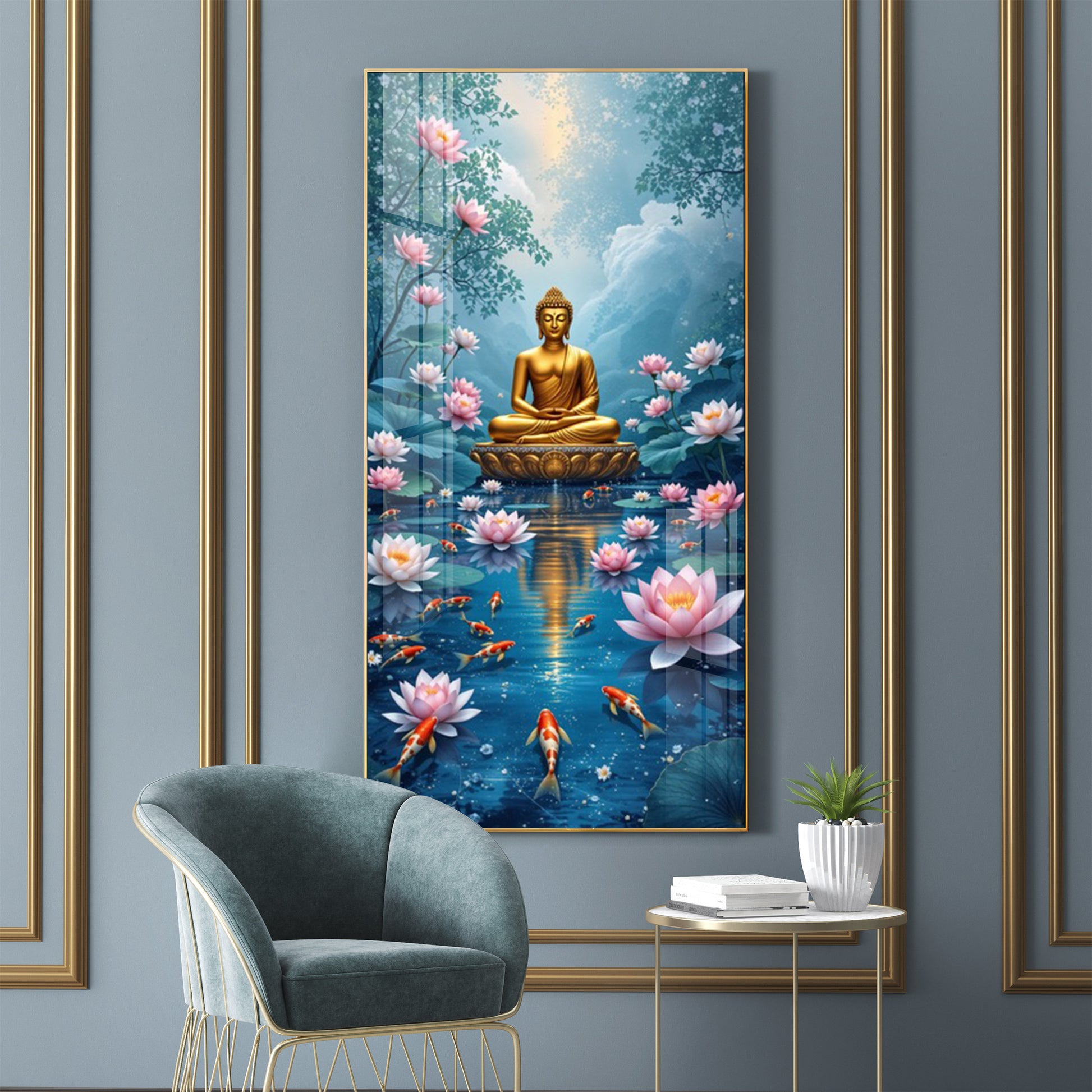 Meditating Buddha With Lotus Glass Finish Vertical Wall Art