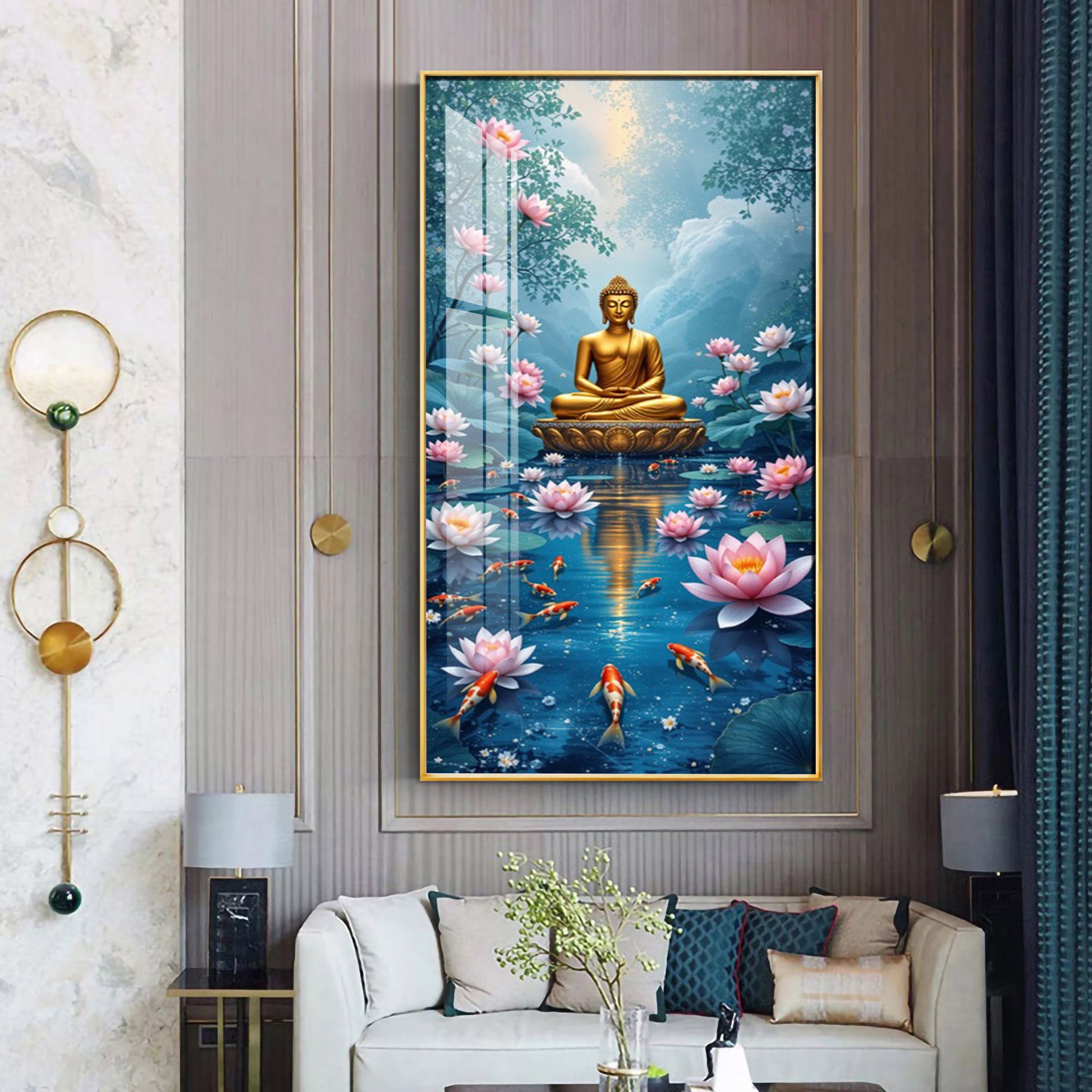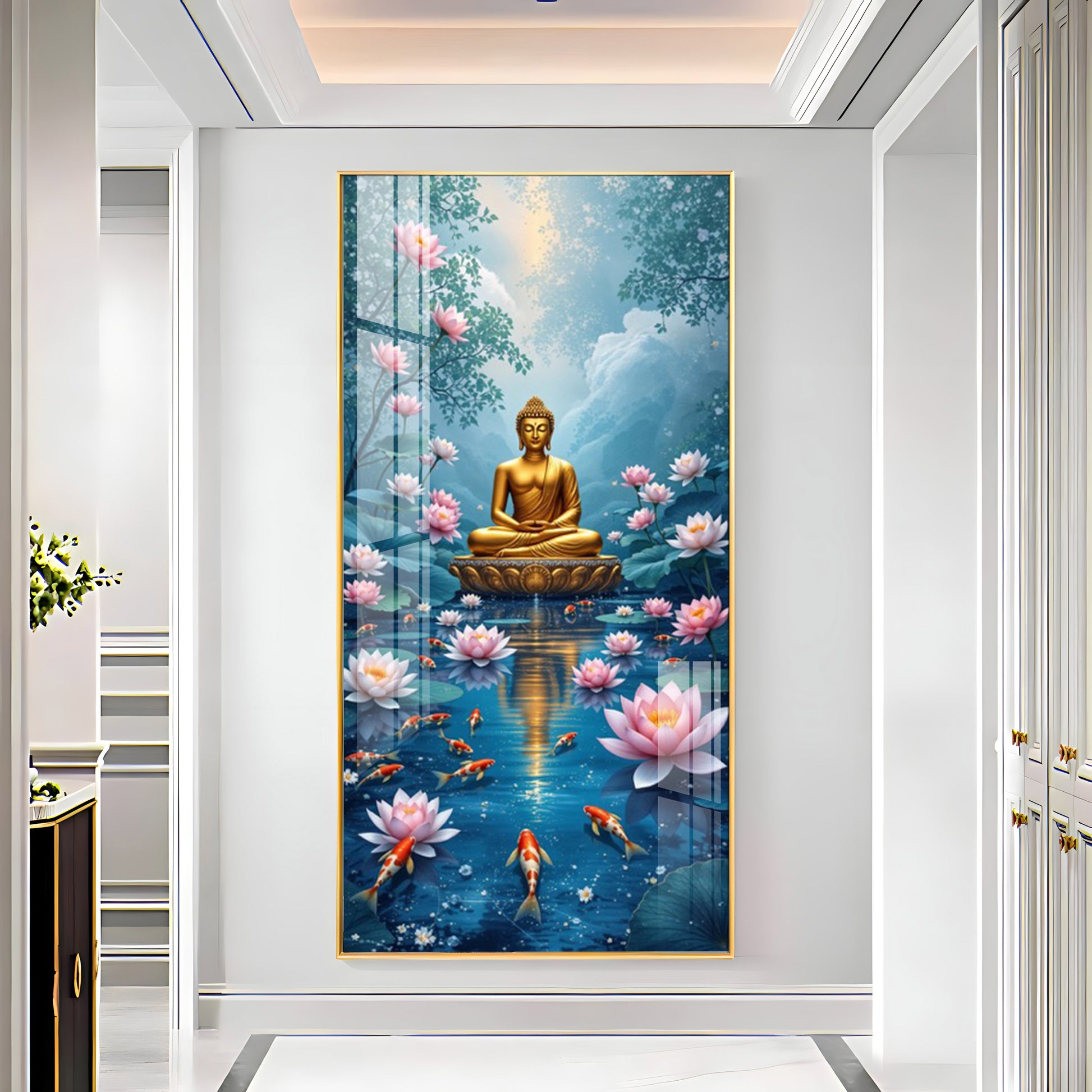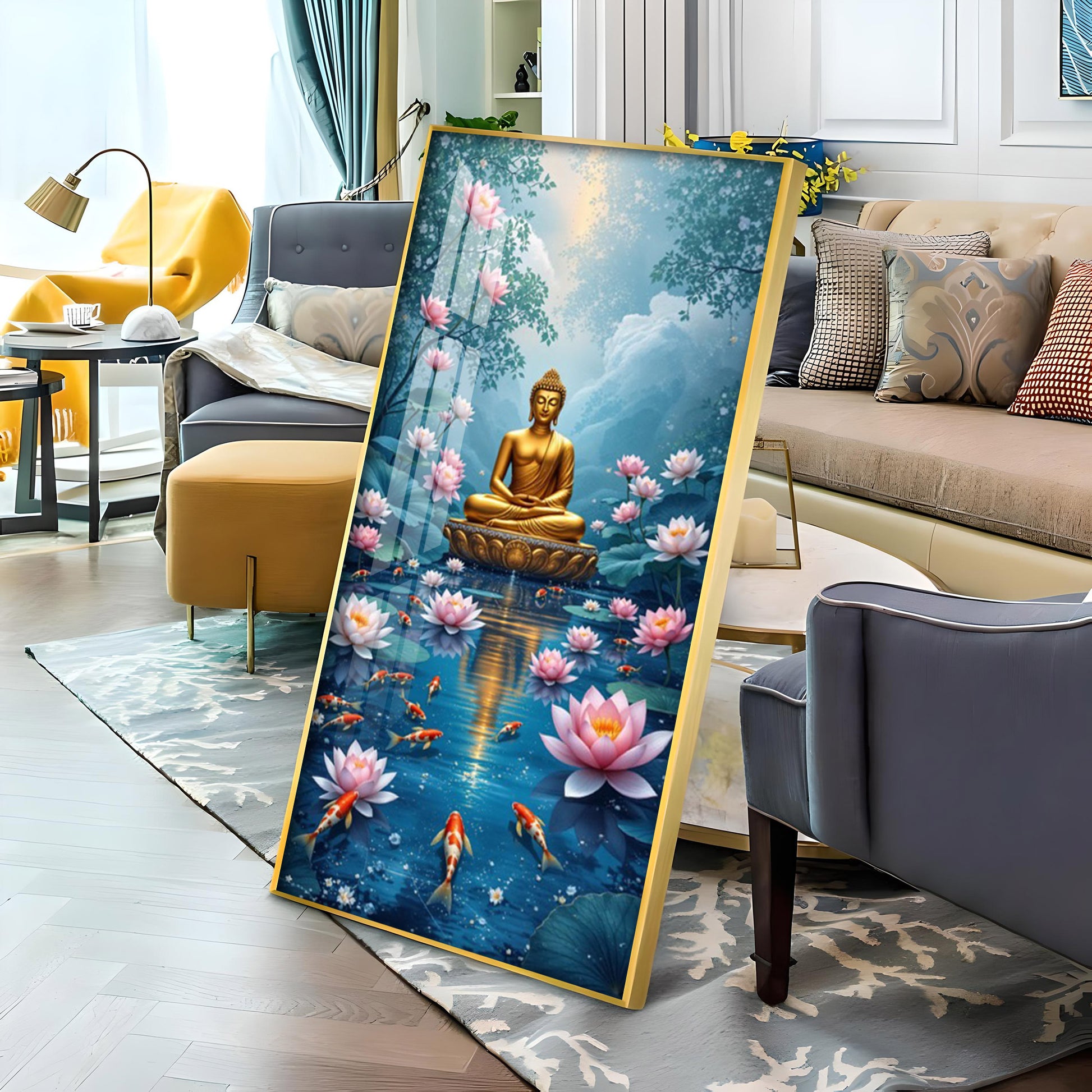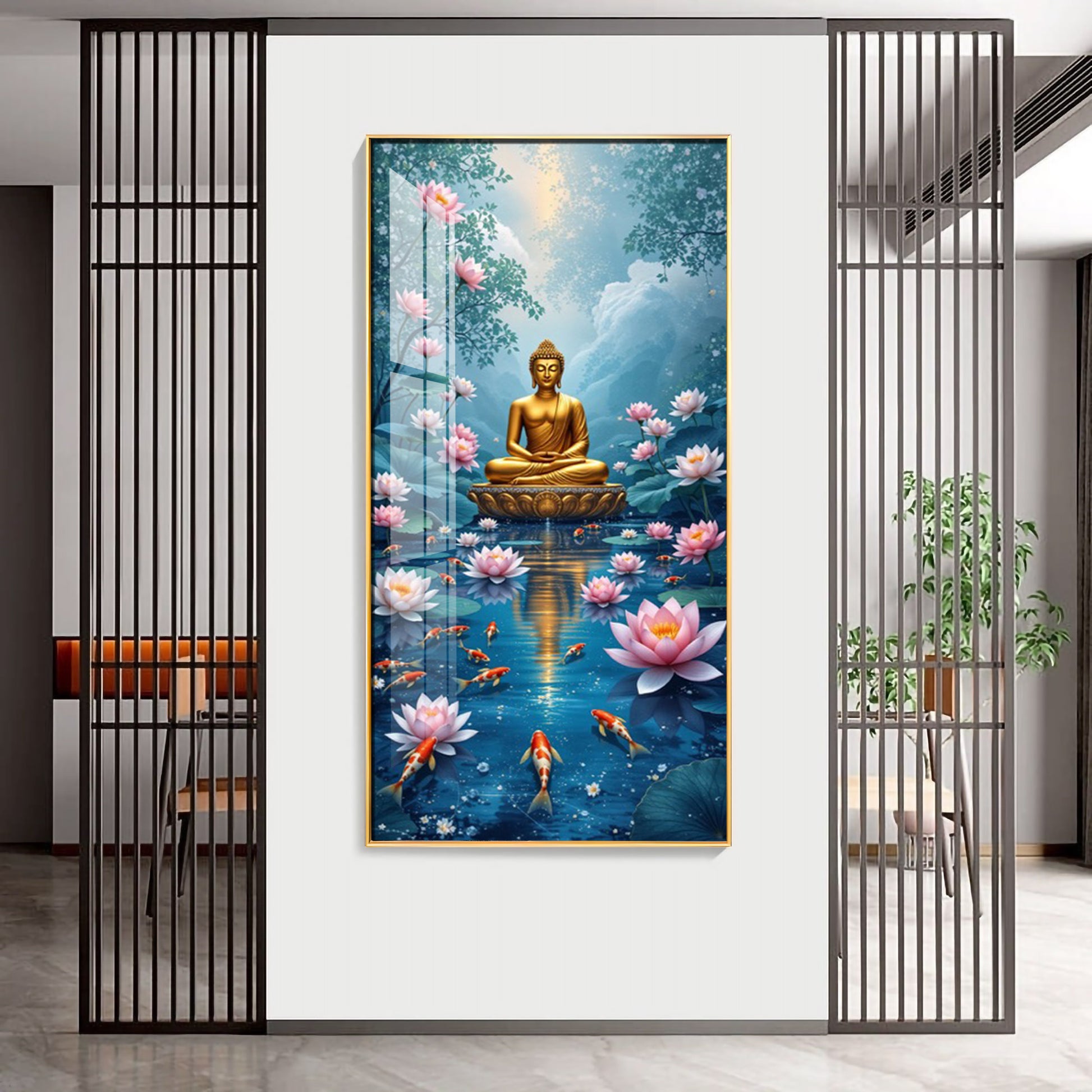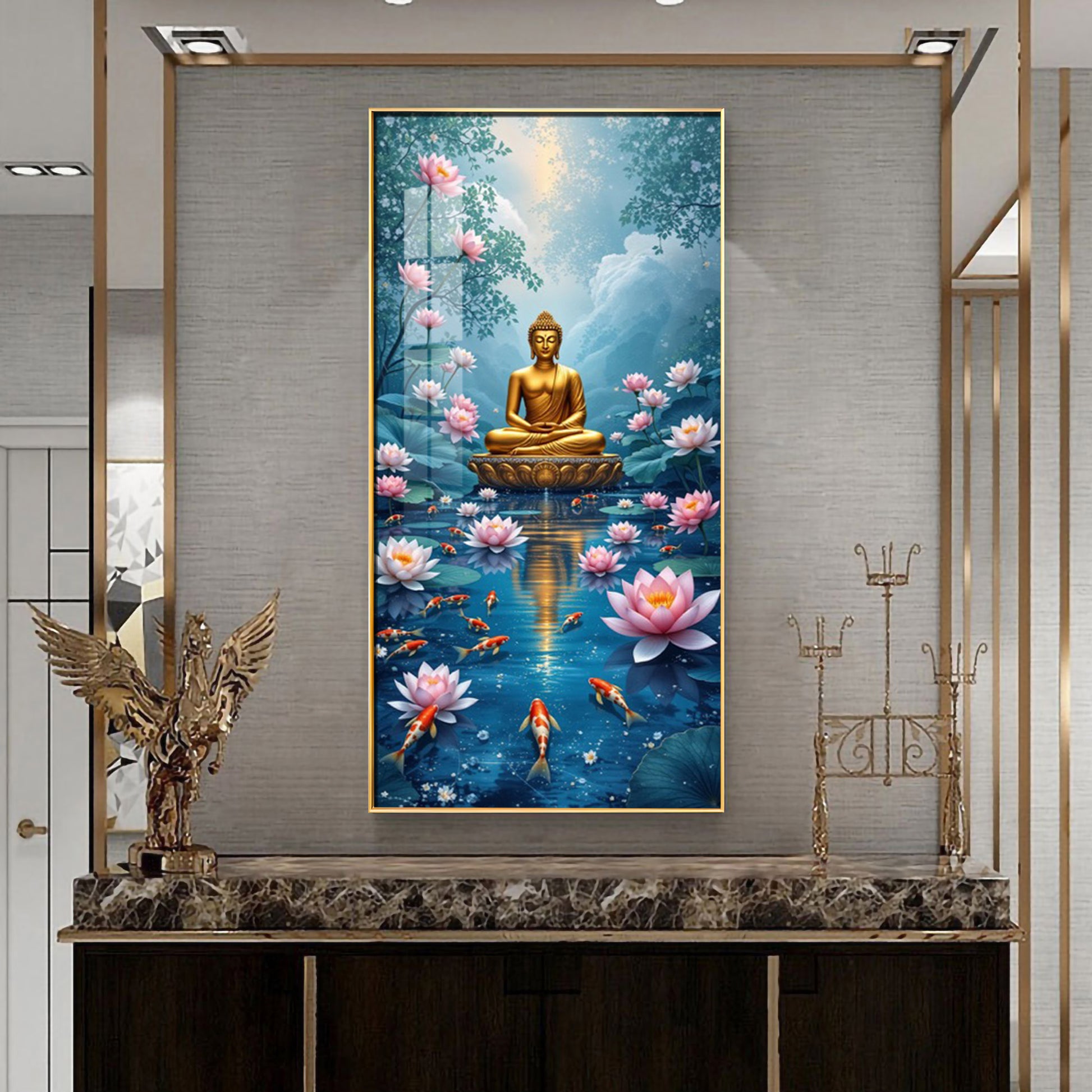 Meditating Buddha With Lotus Glass Finish Vertical Wall Art