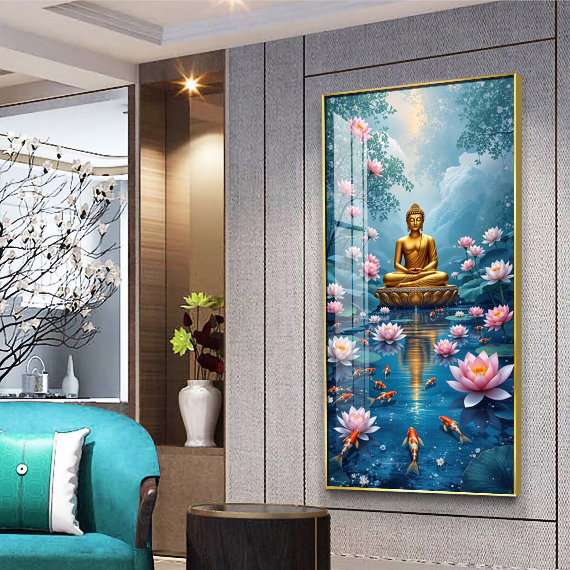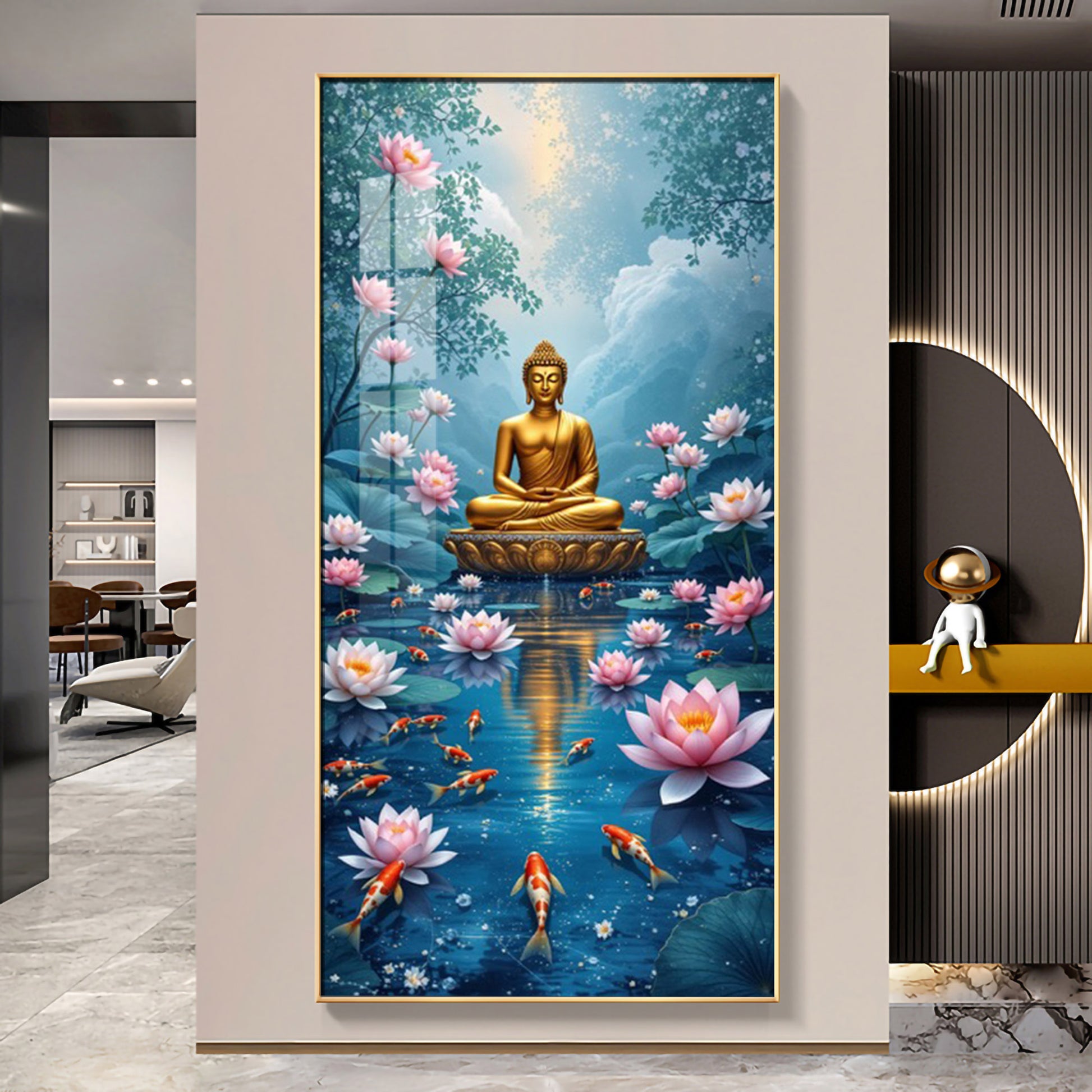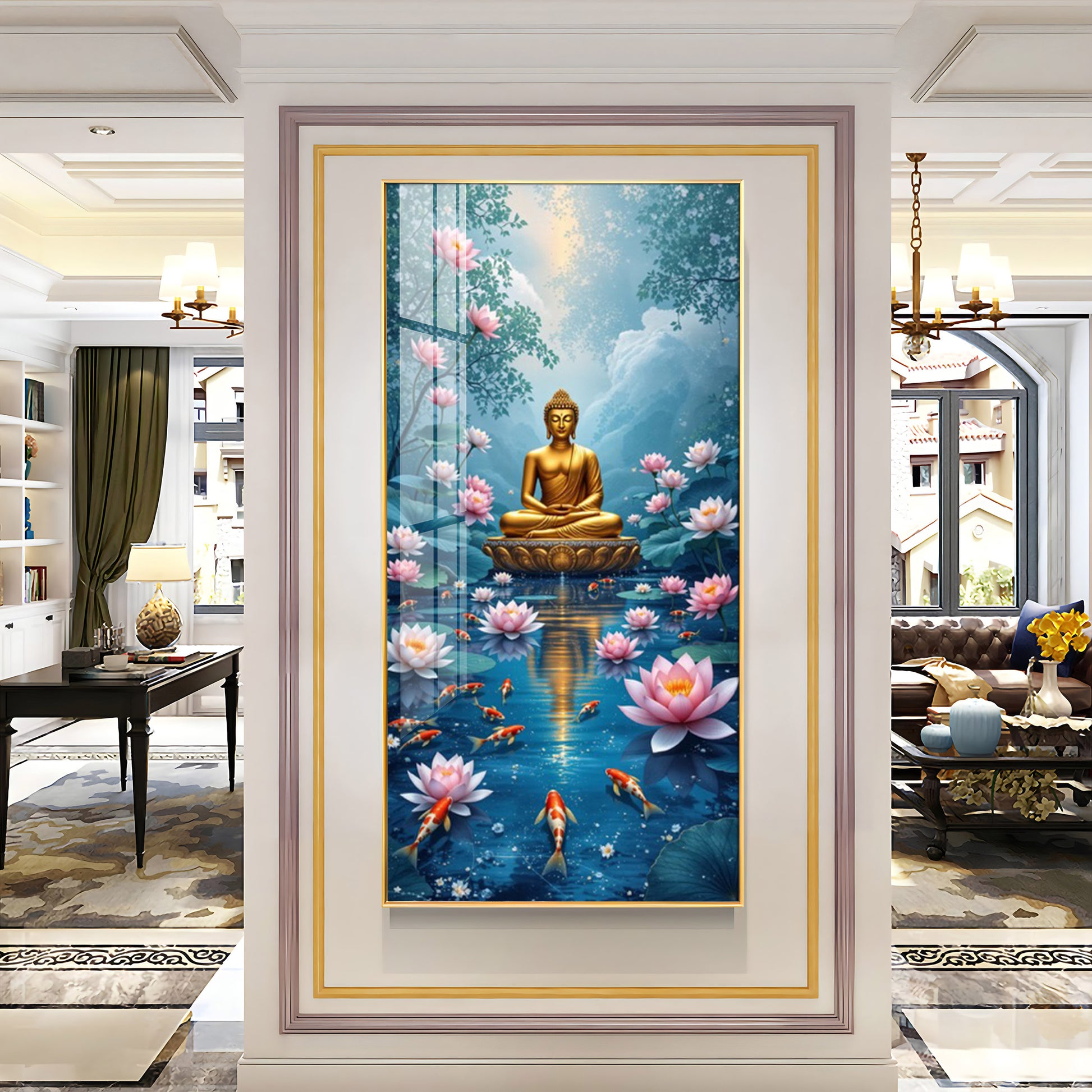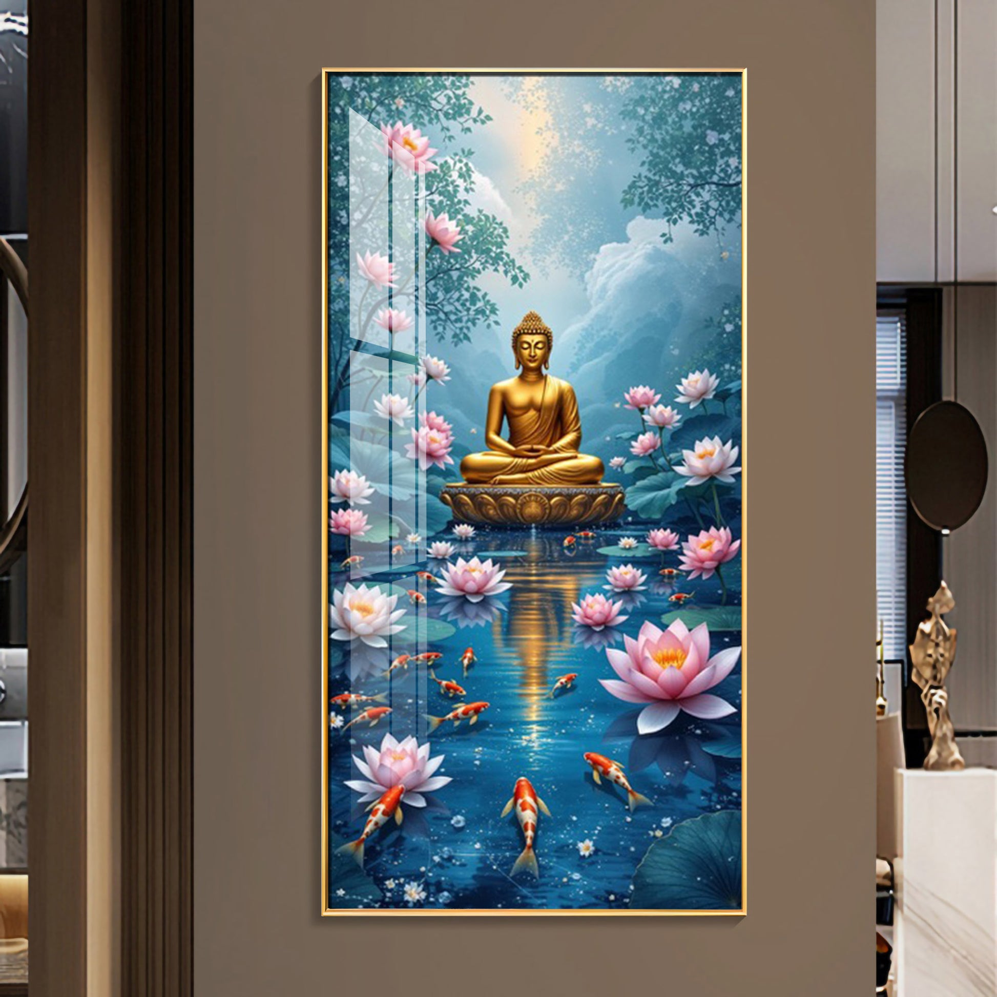 Meditating Buddha With Lotus Glass Finish Vertical Wall Art