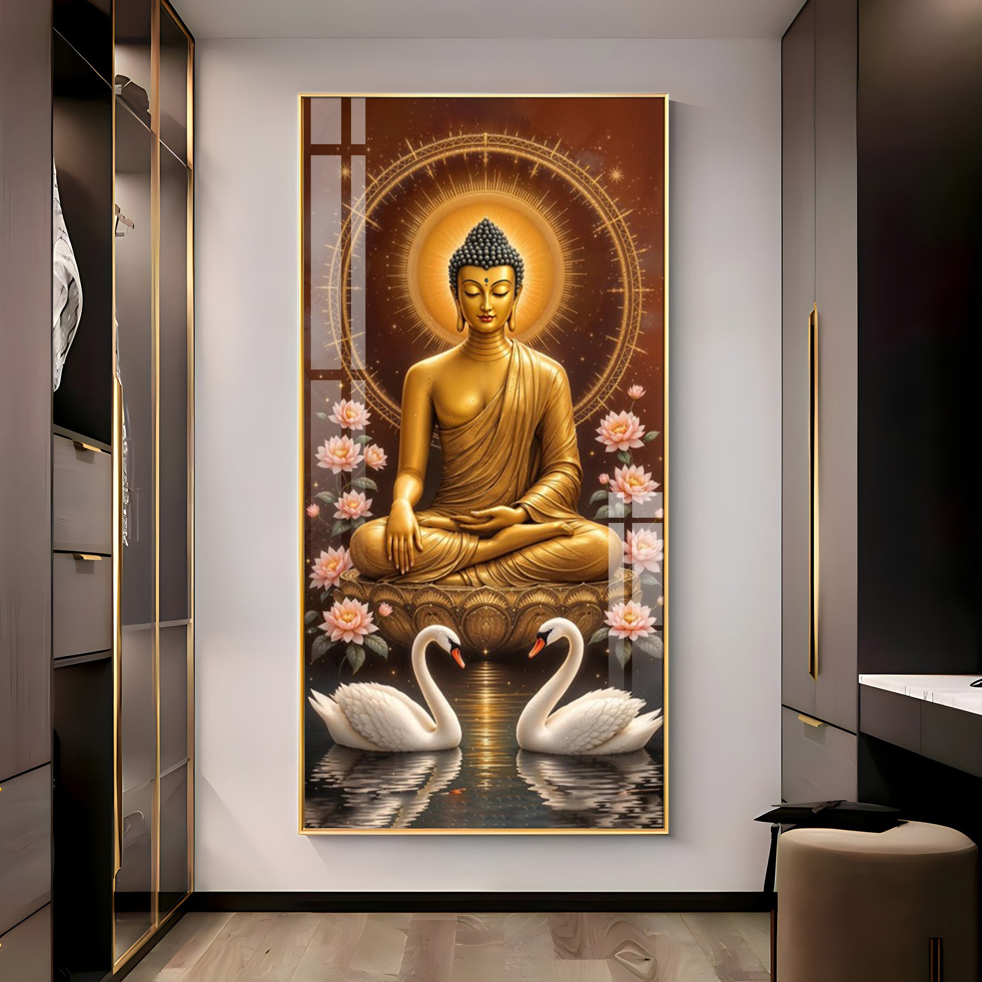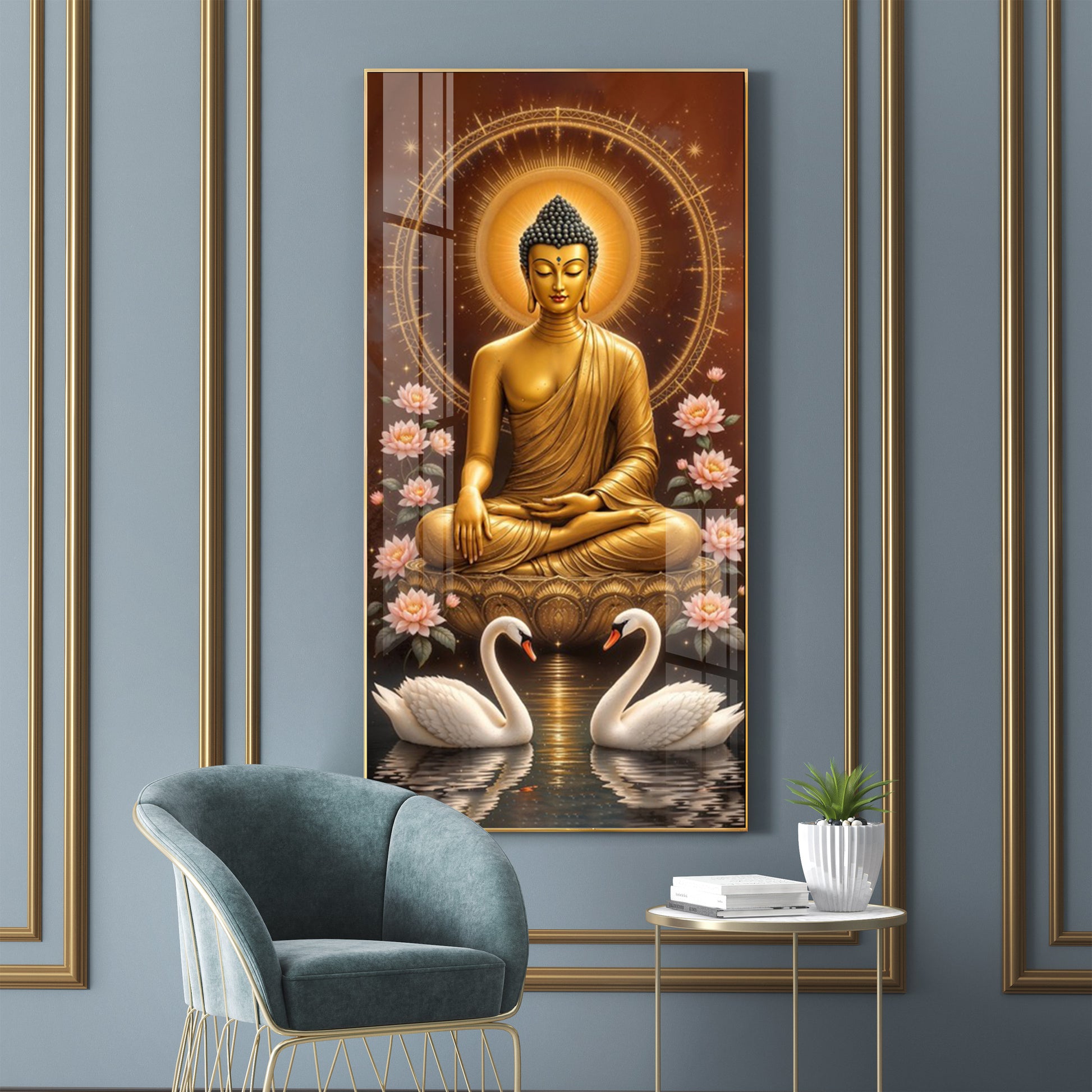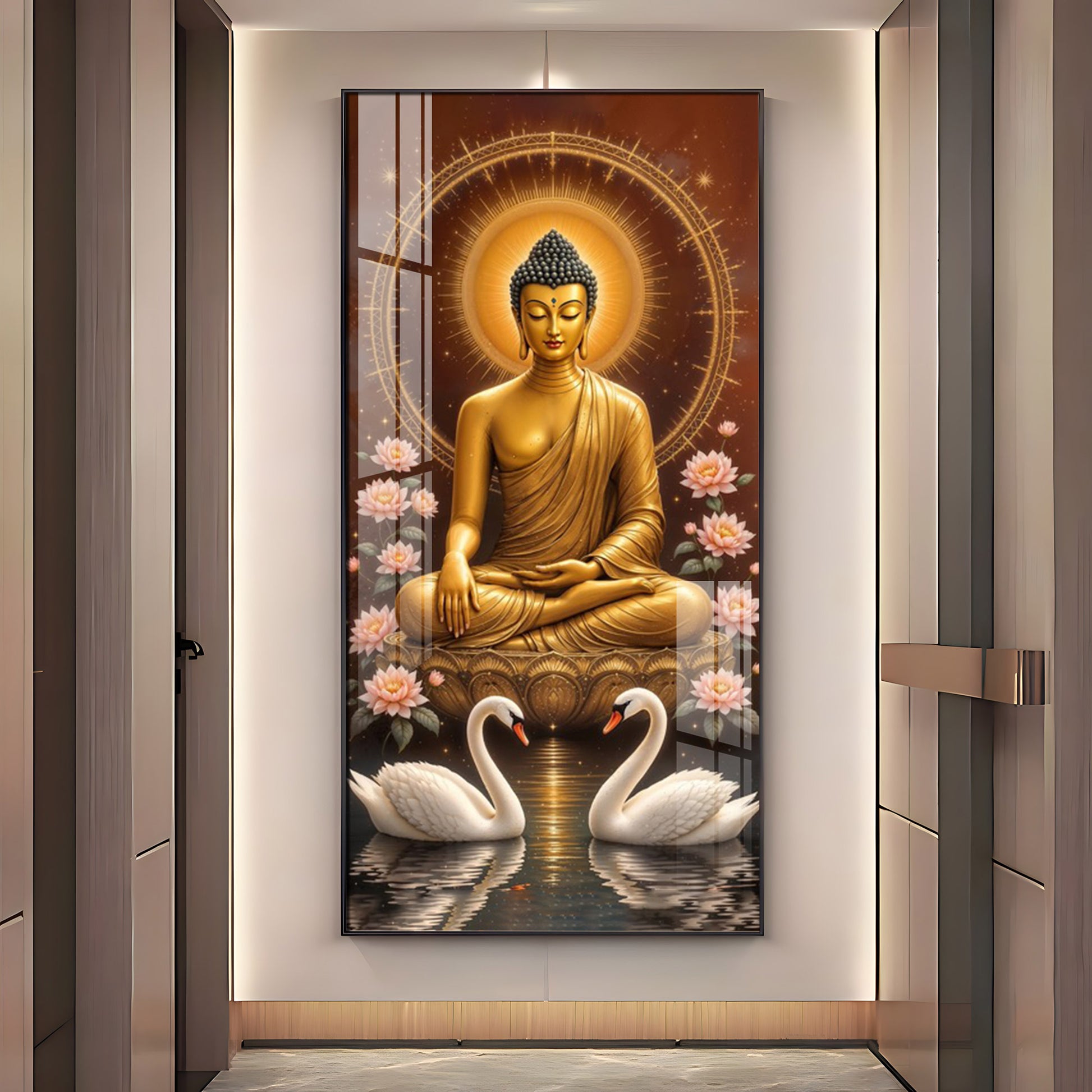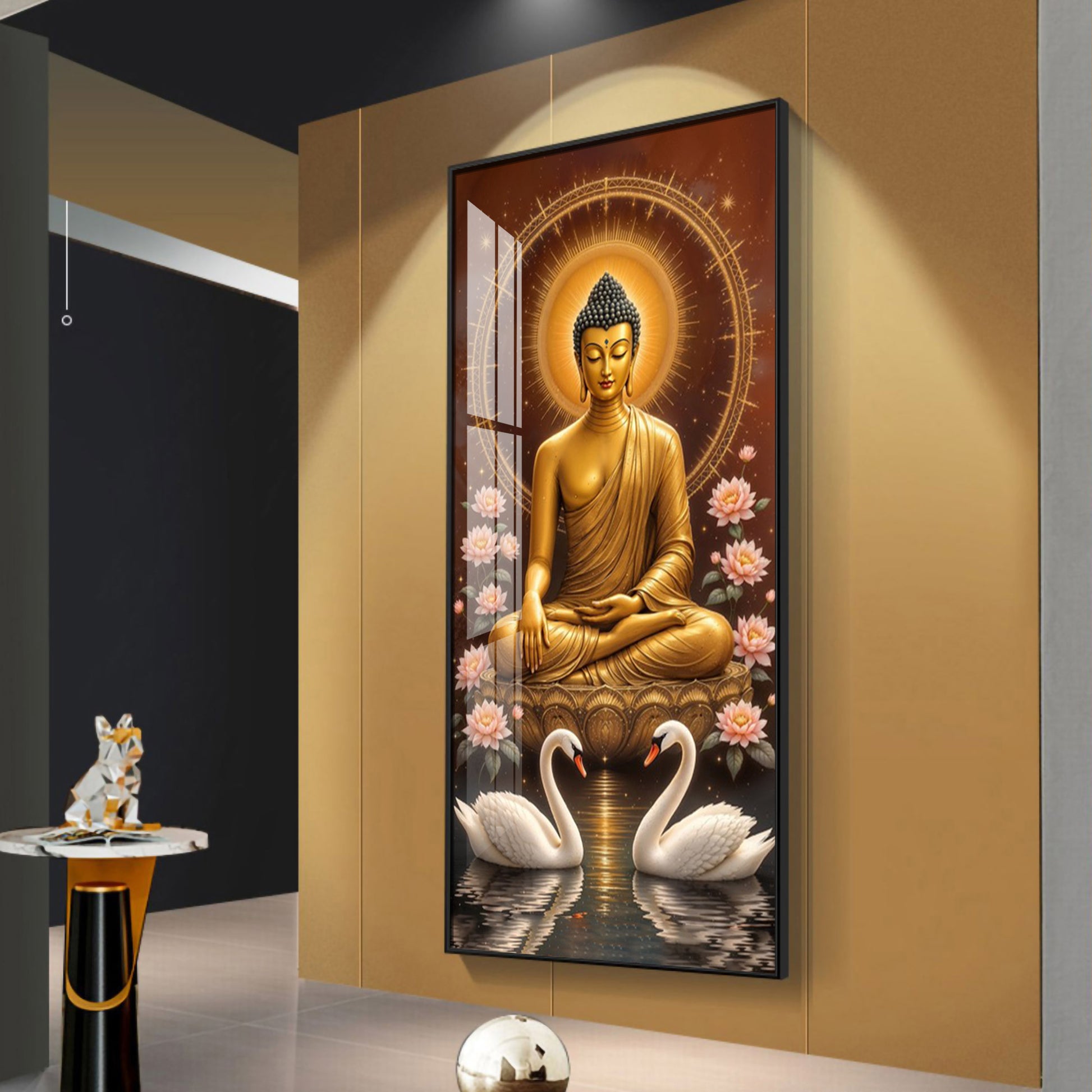 Meditating Budha With Swarn Glass Finish Vertical Wall Art