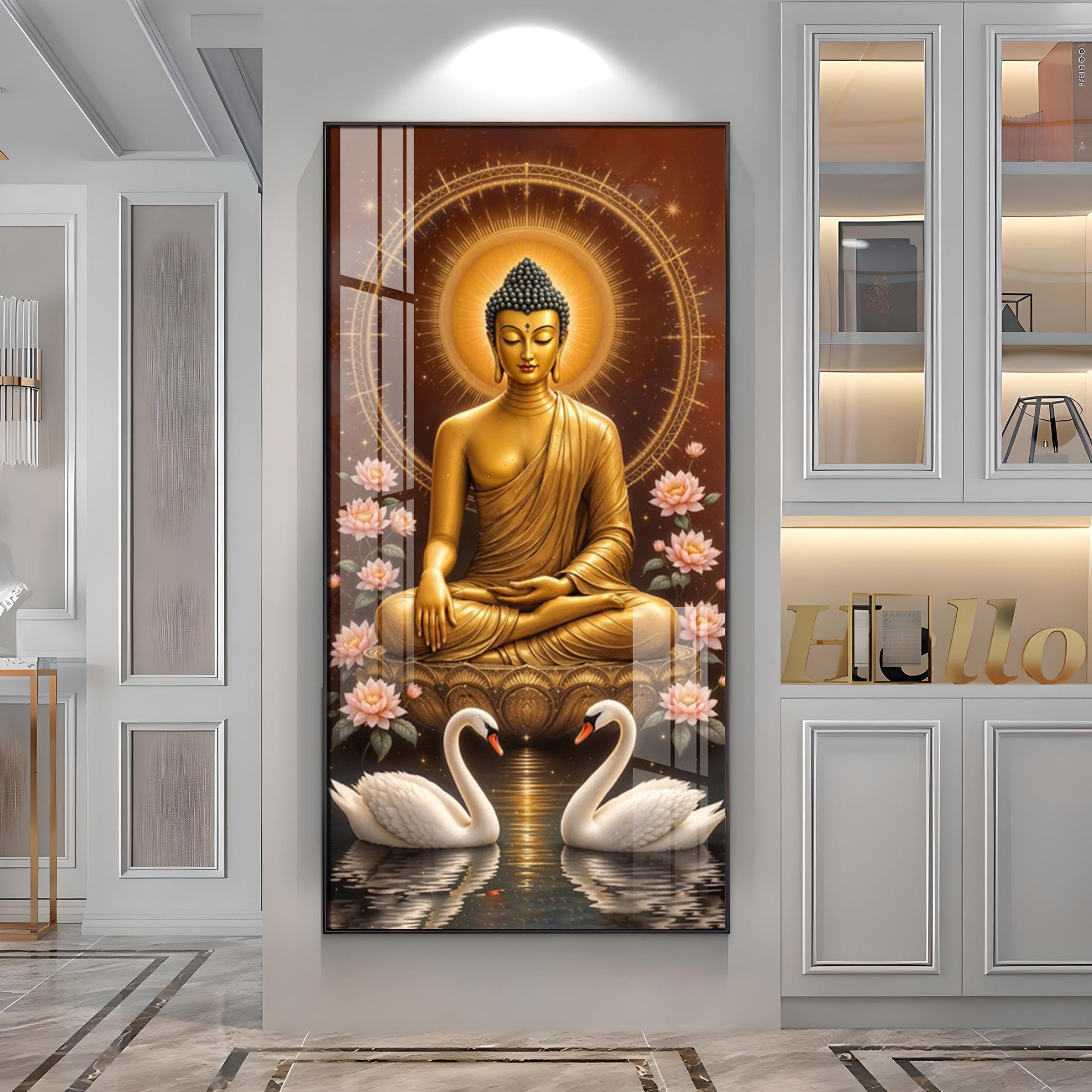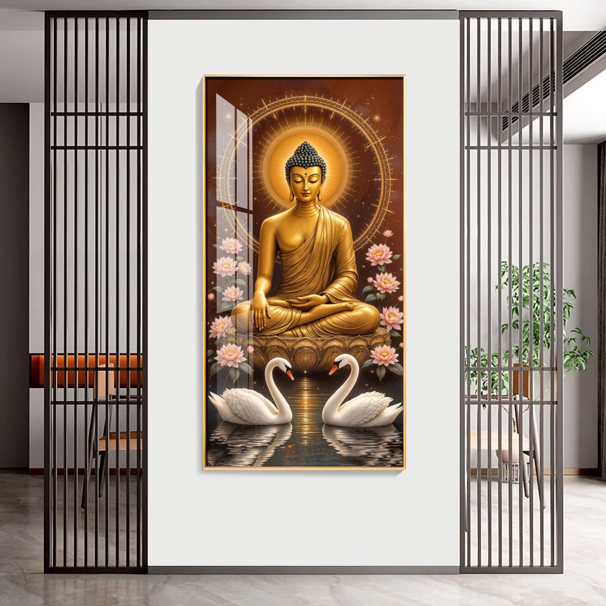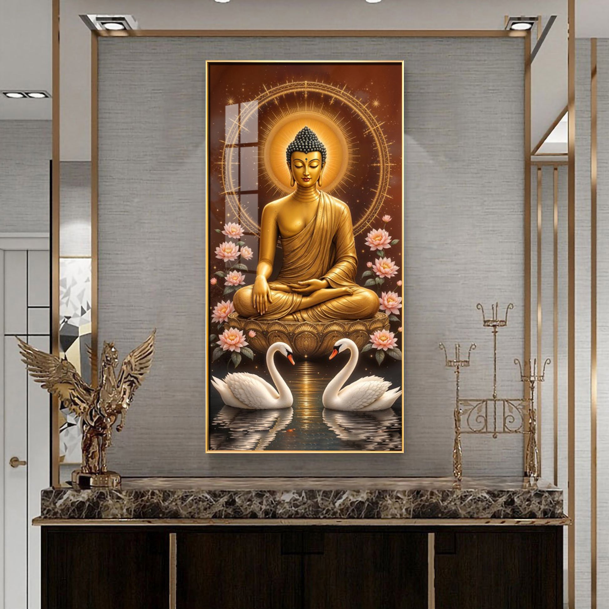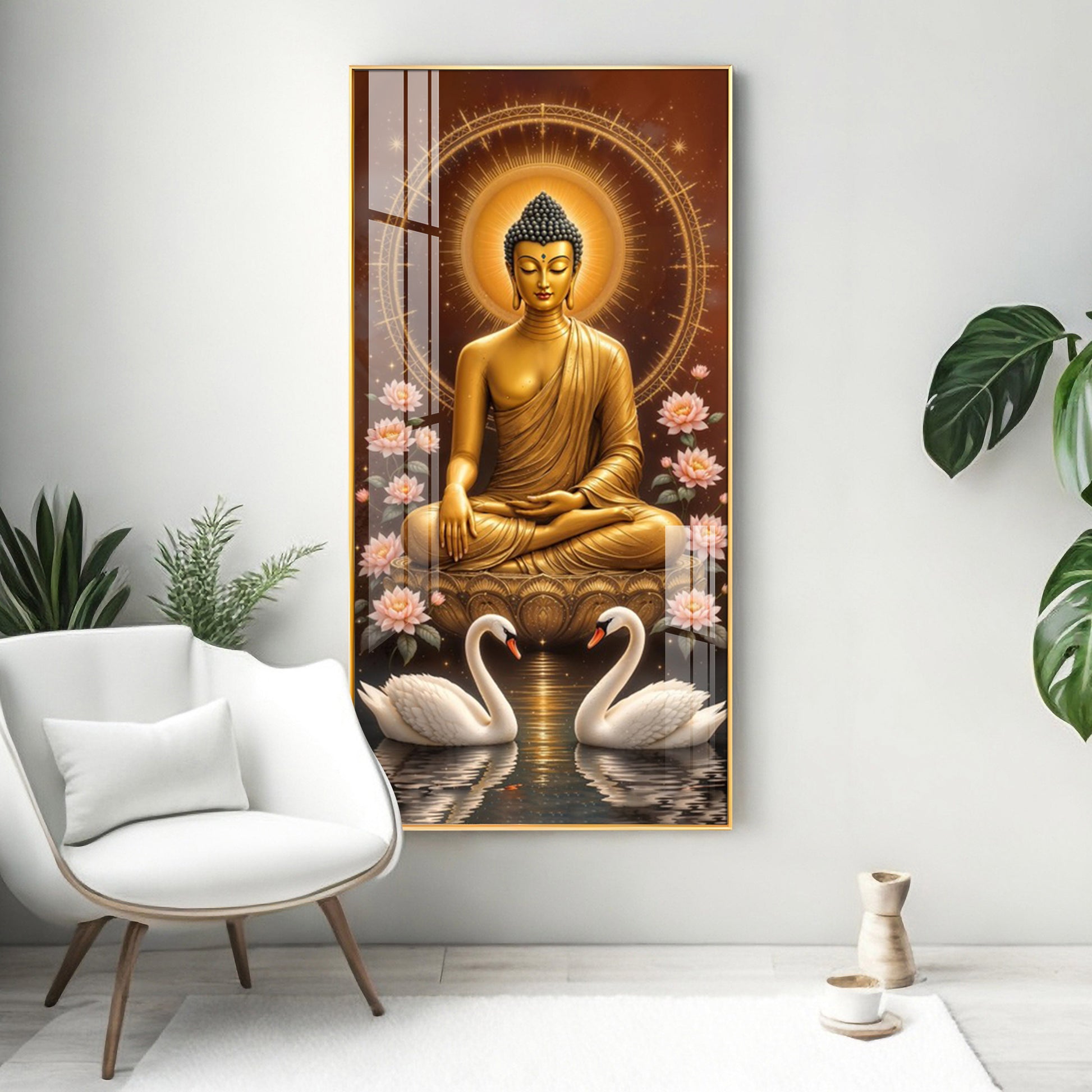 Meditating Budha With Swarn Glass Finish Vertical Wall Art
