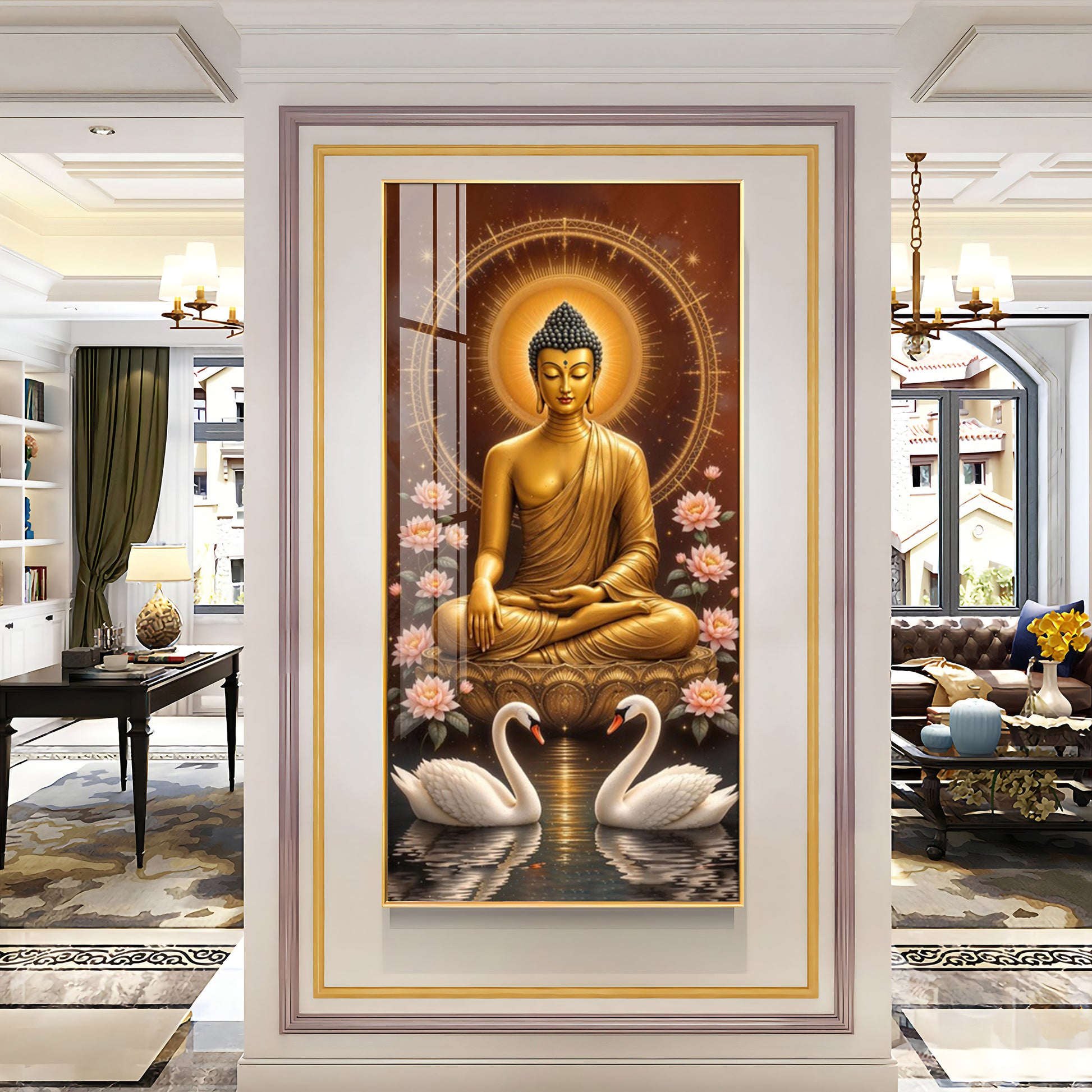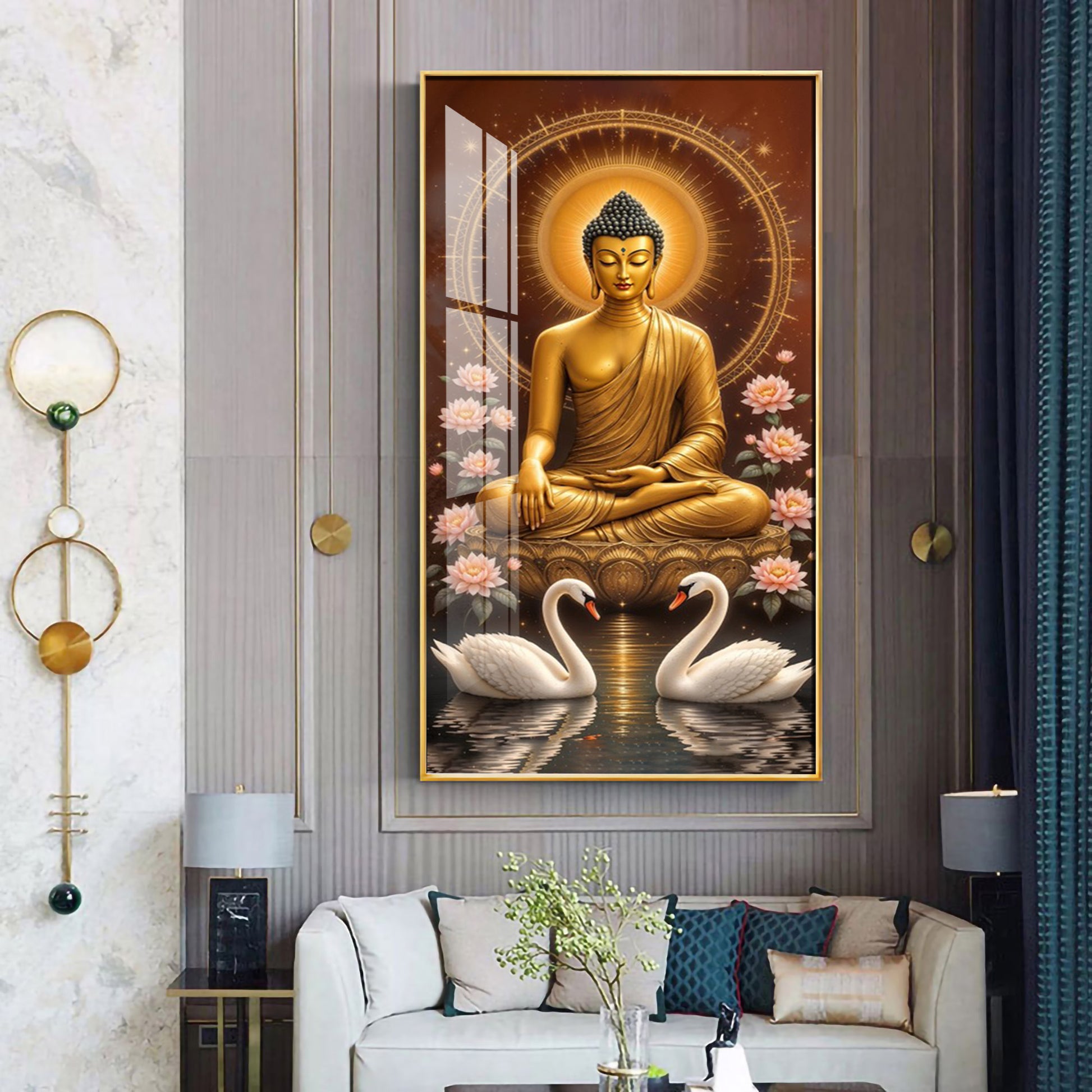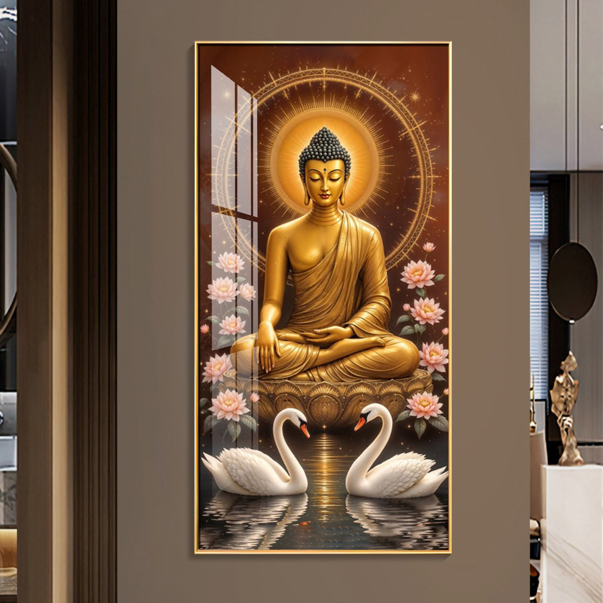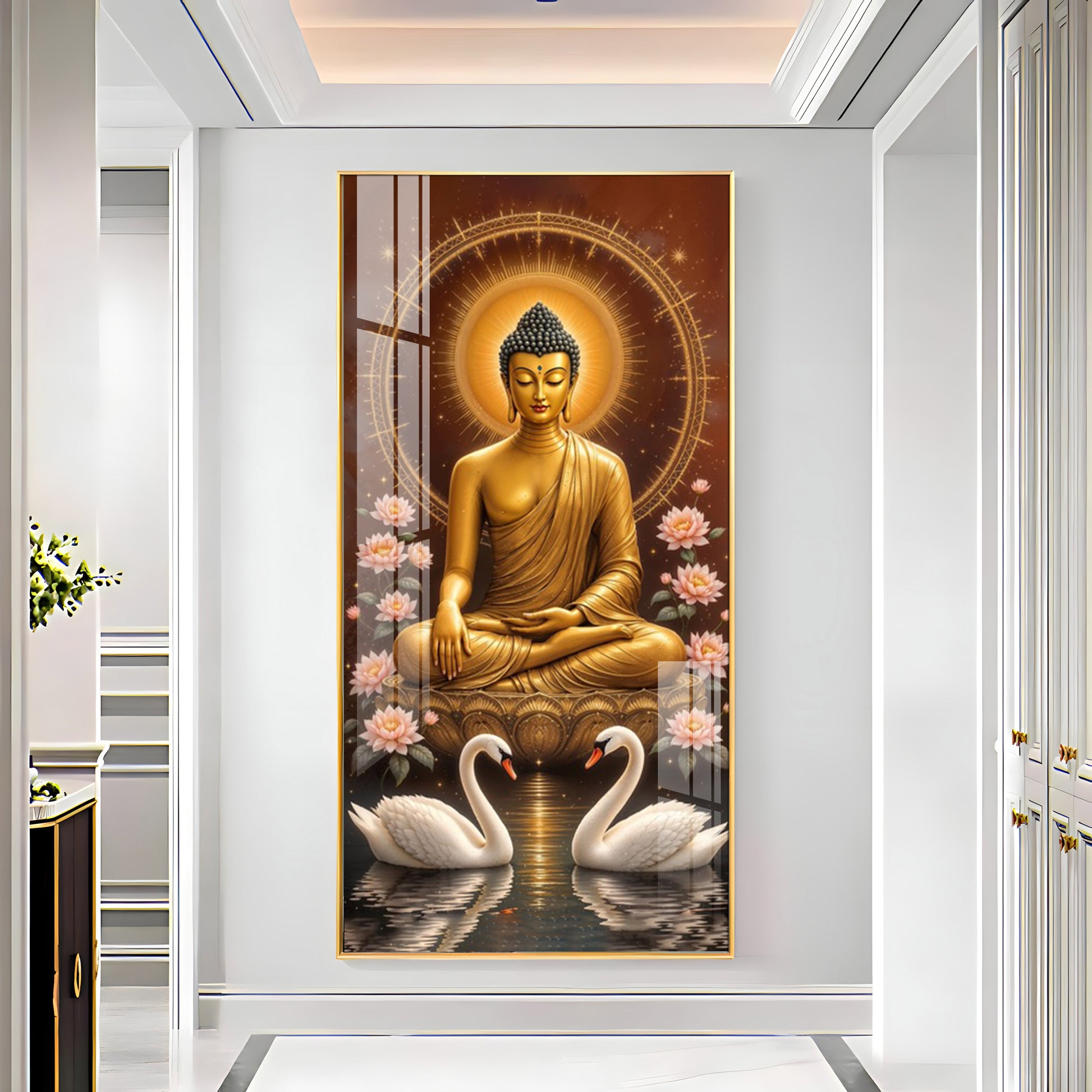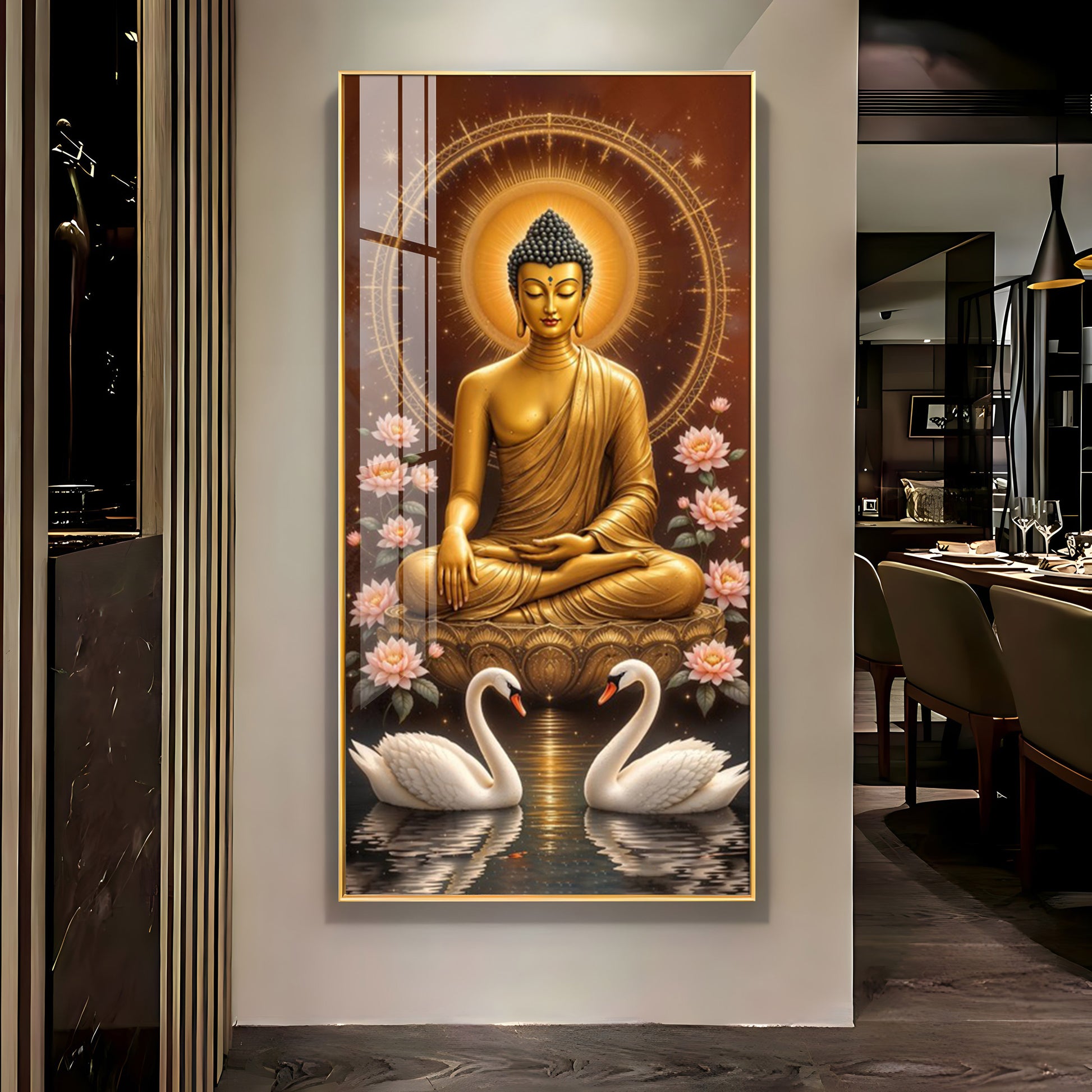 Meditating Budha With Swarn Glass Finish Vertical Wall Art