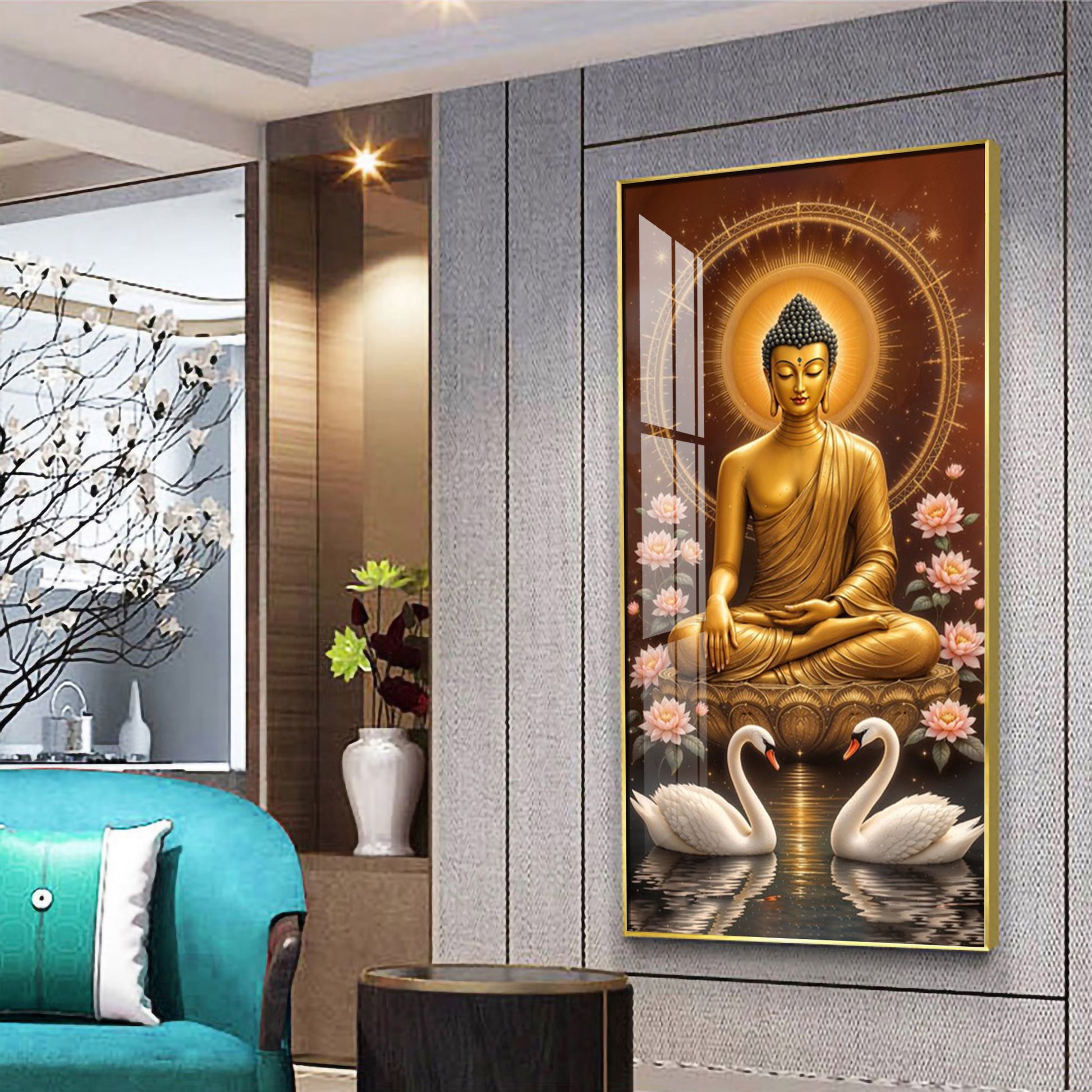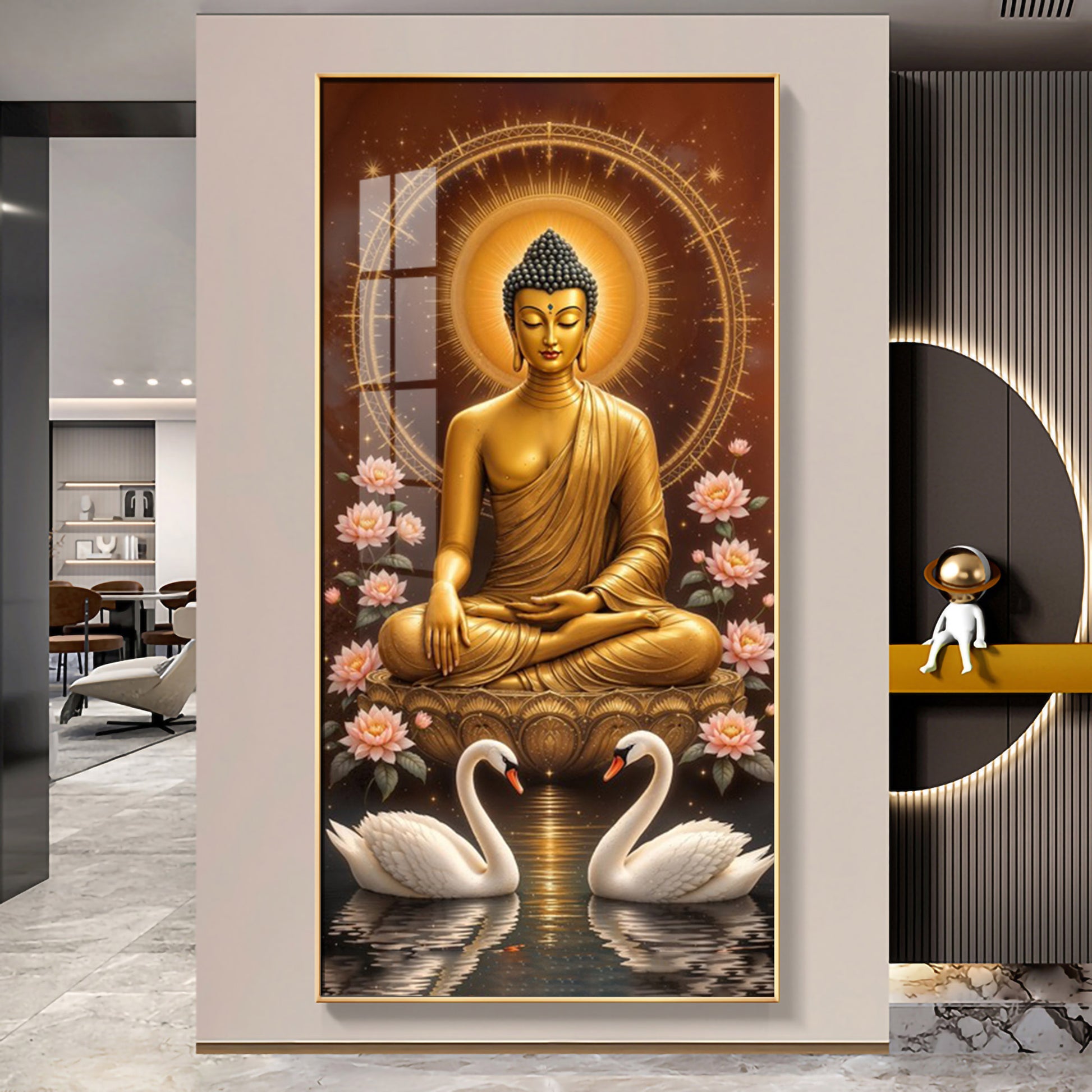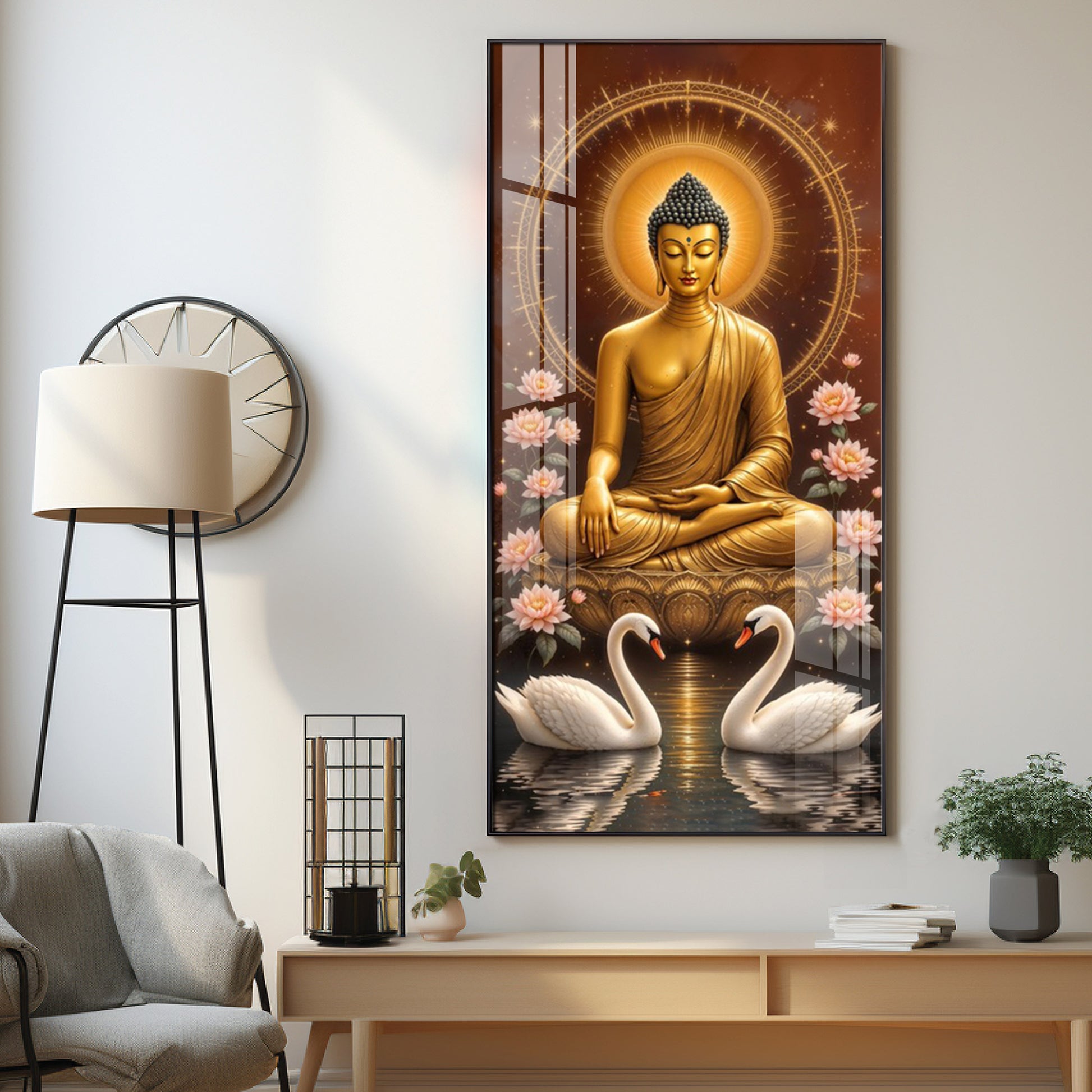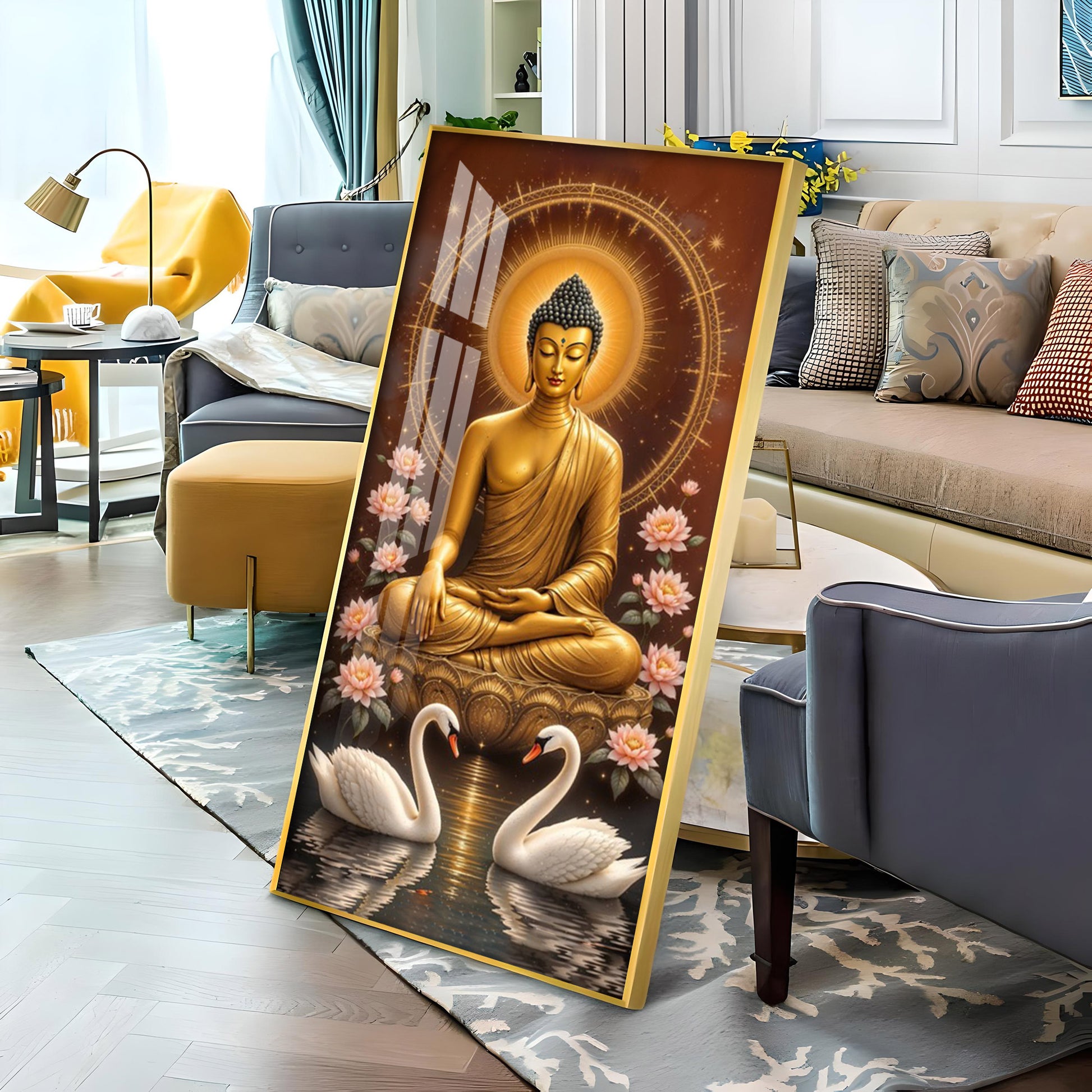 Meditating Budha With Swarn Glass Finish Vertical Wall Art