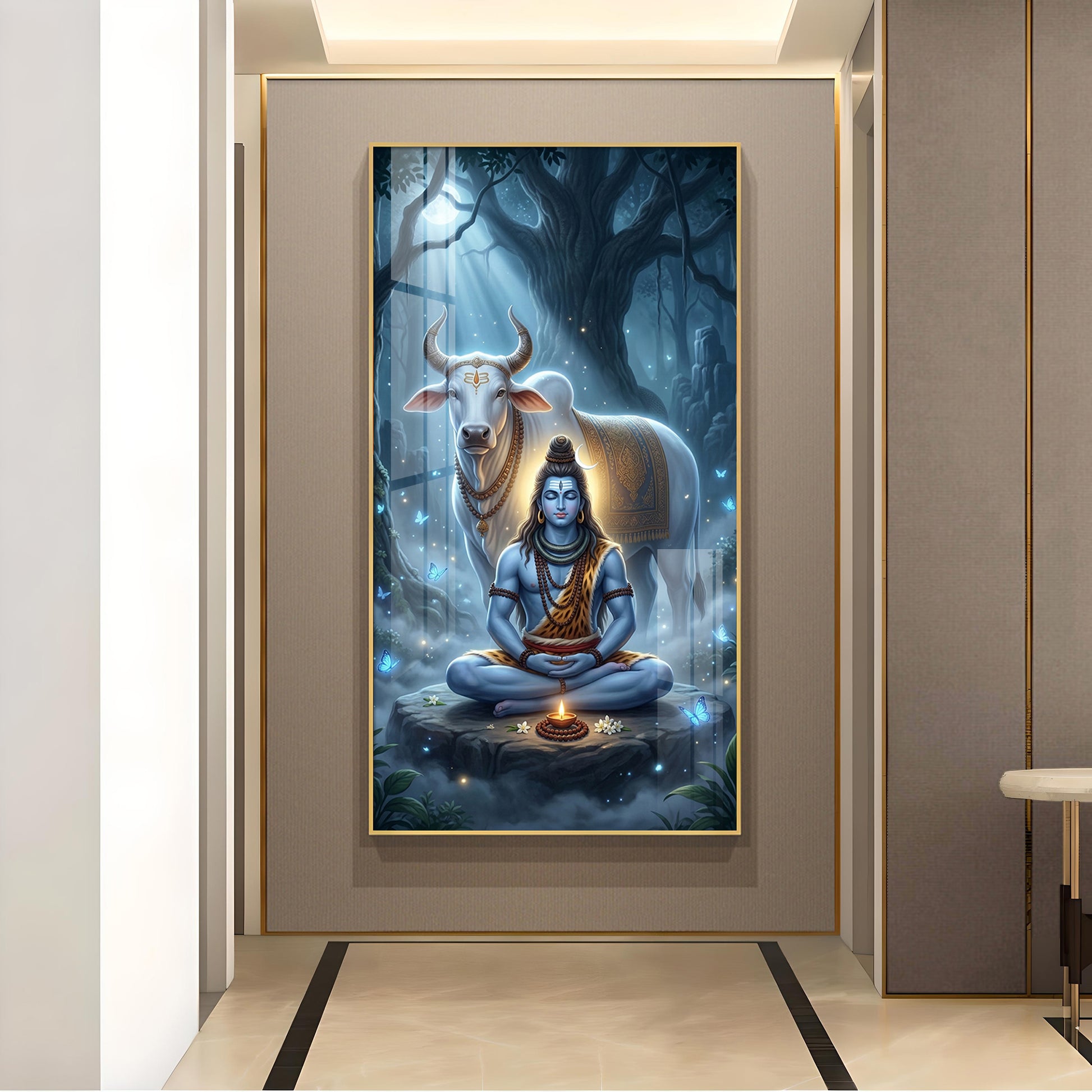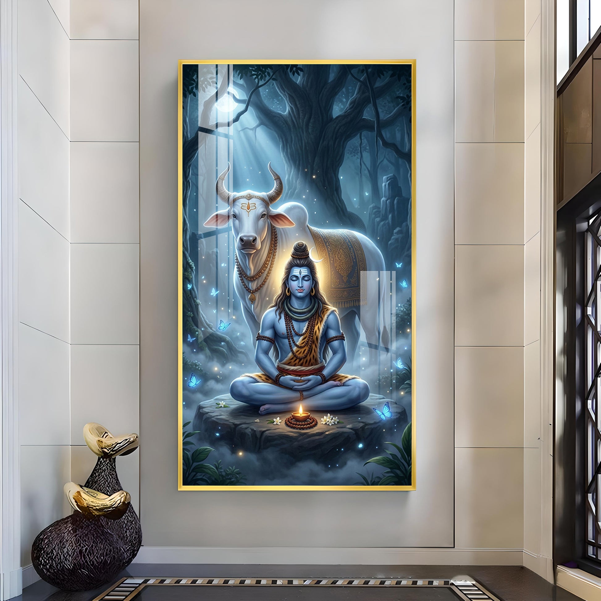 Meditating Lord Shiv With Nandi Glass Finish Vertical Wall Art