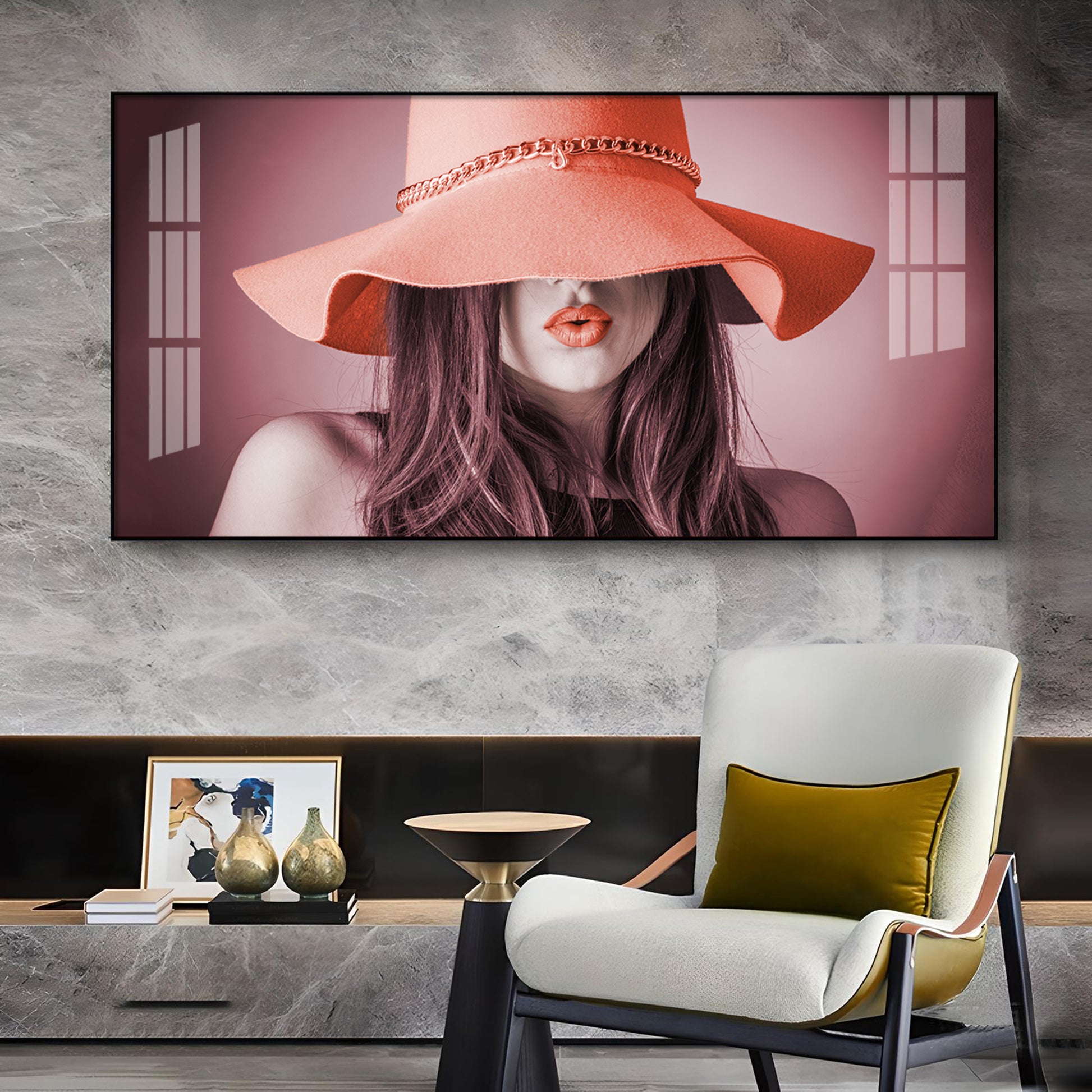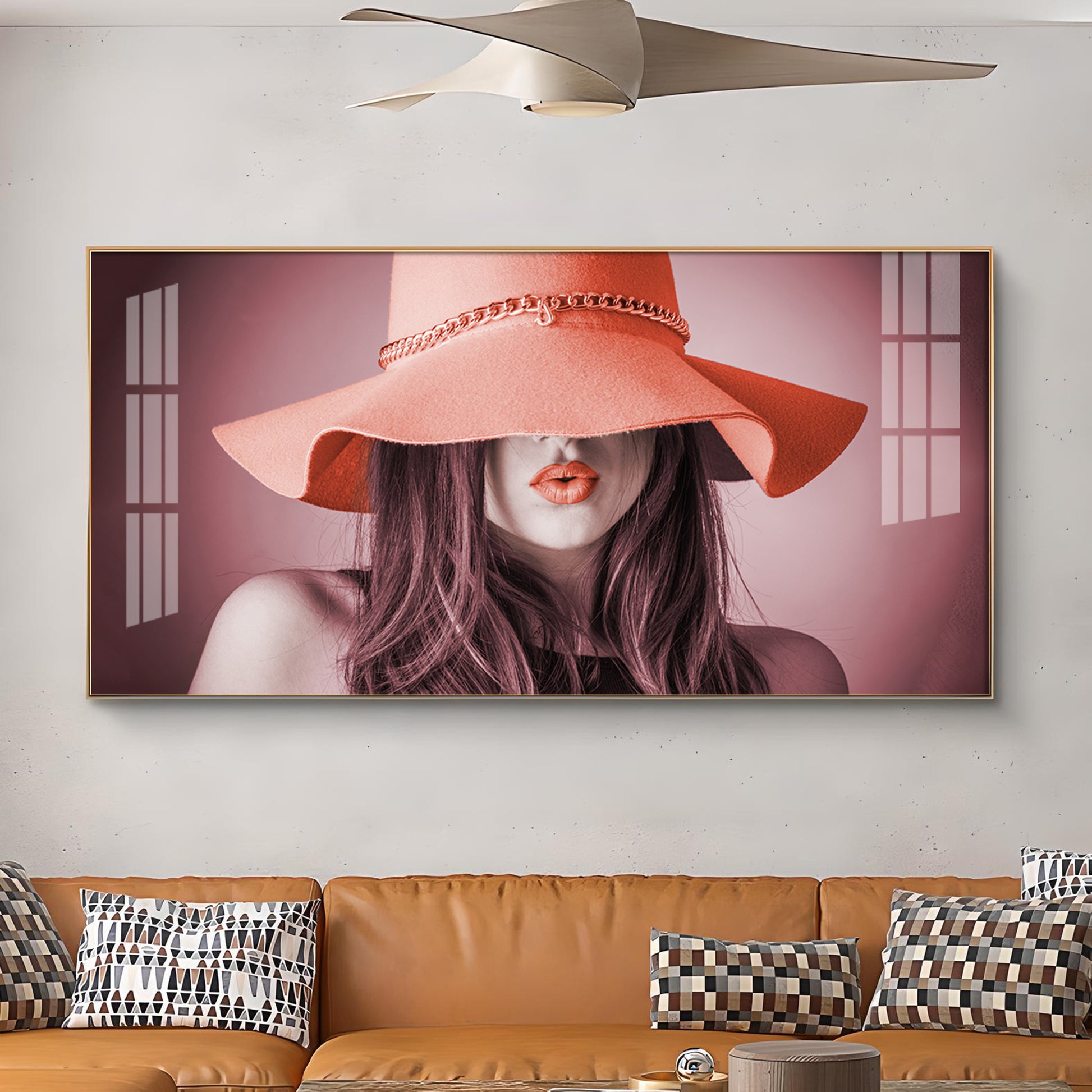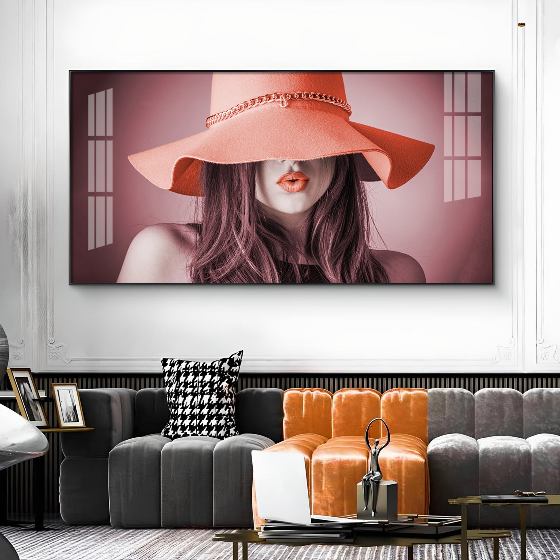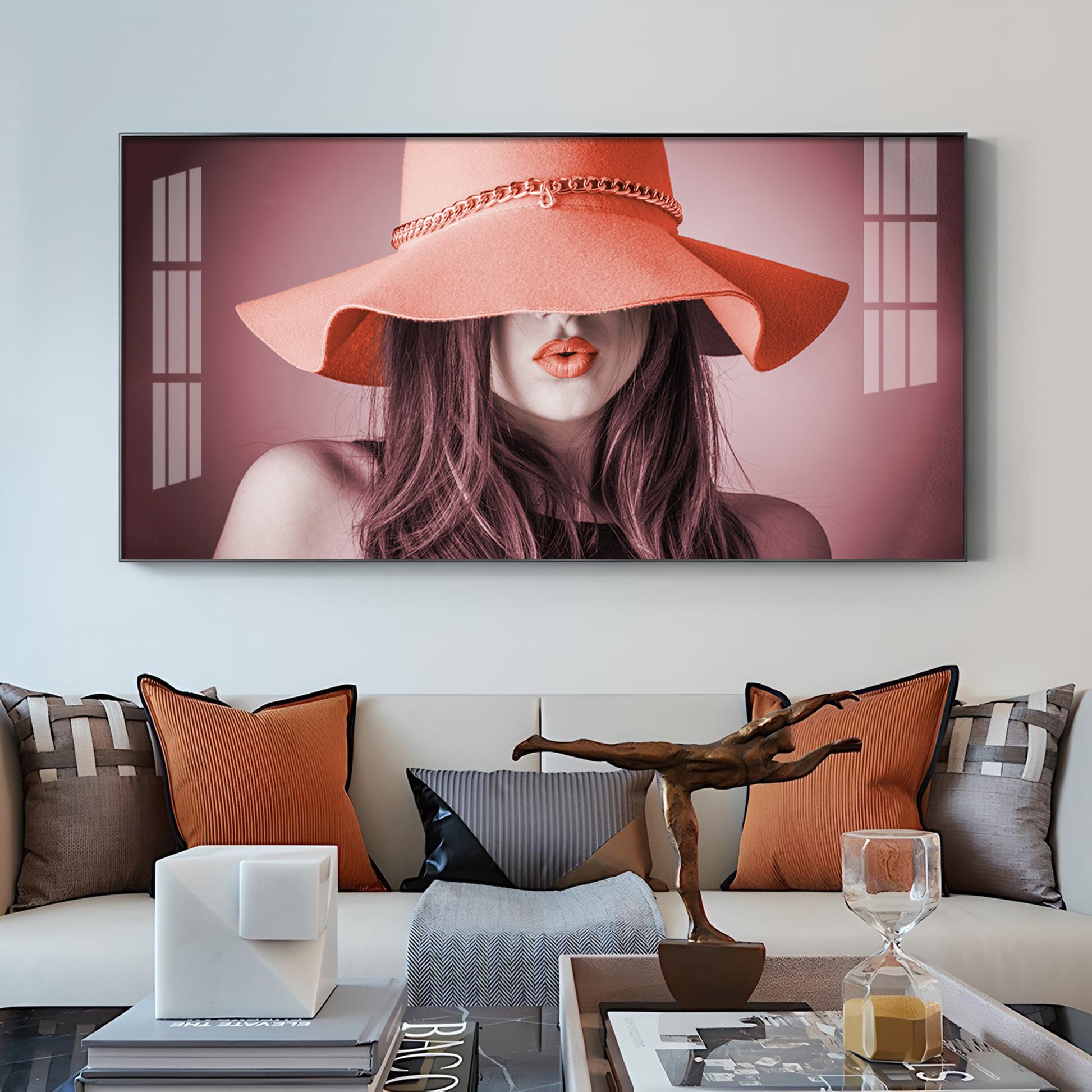 Modern Lady With Hat Glass Finish Horizontal Wall Art