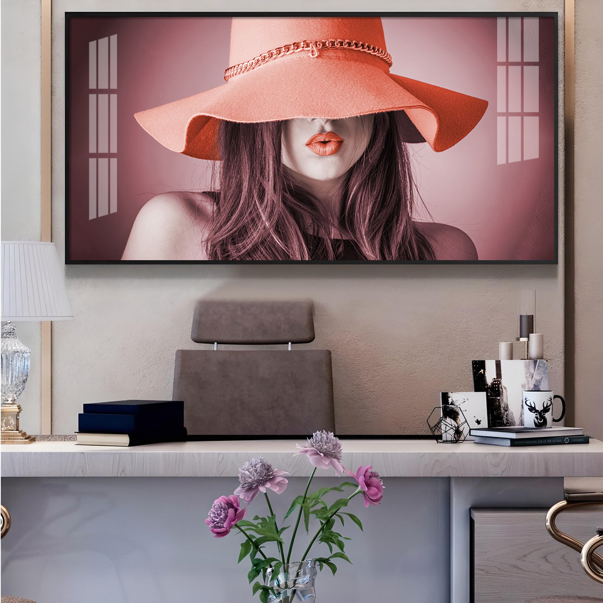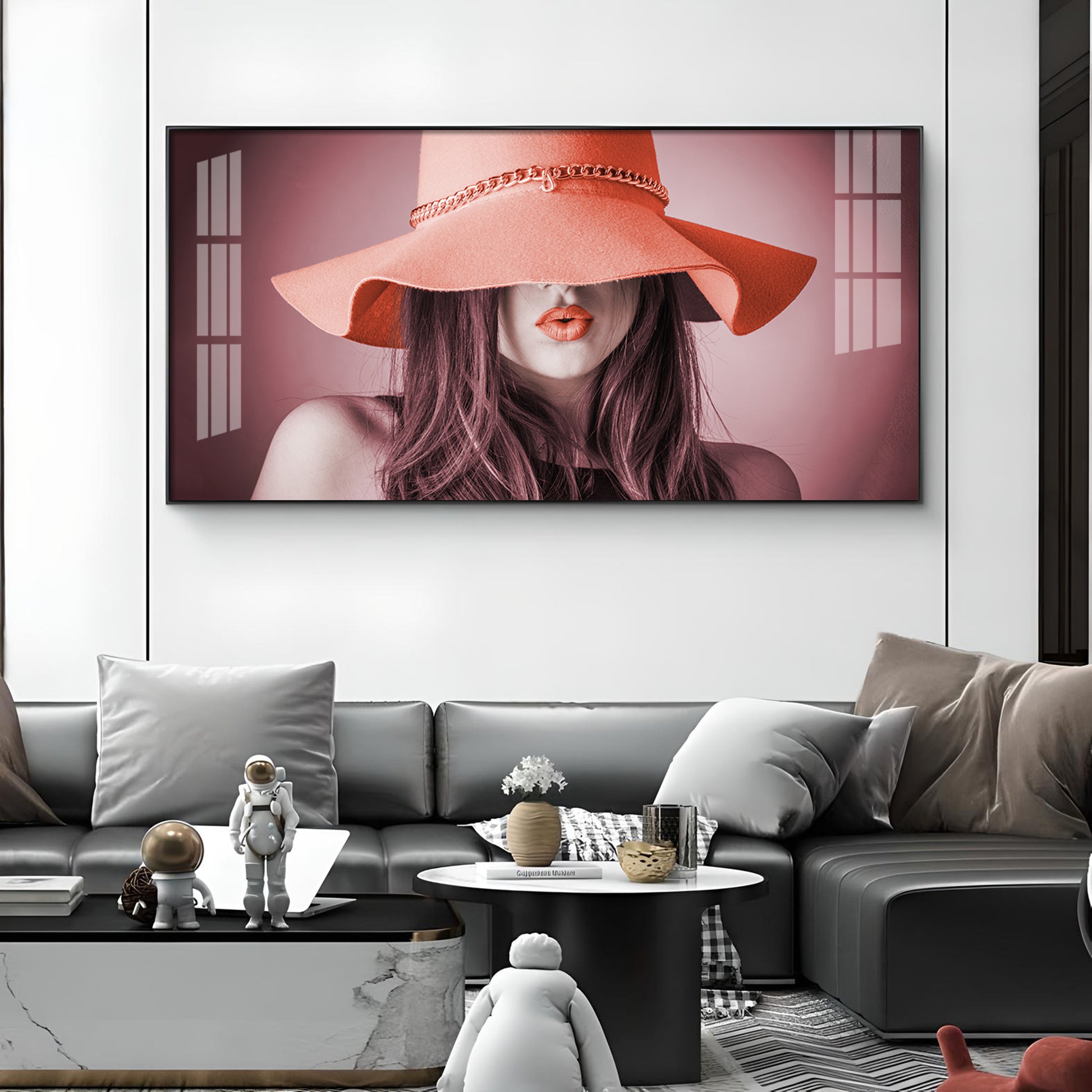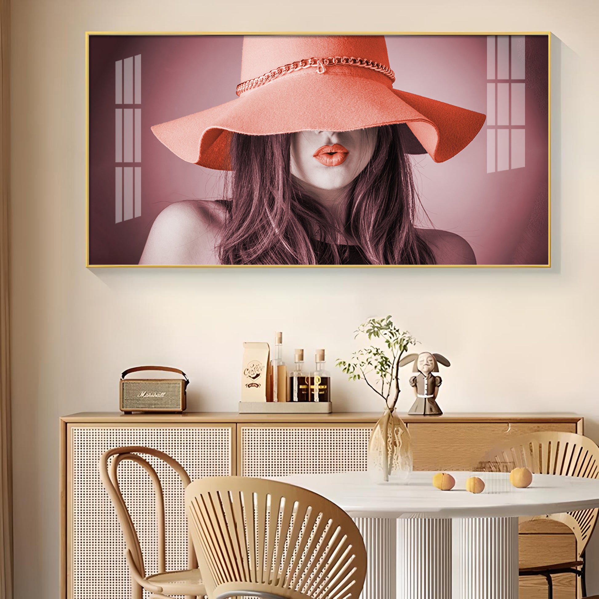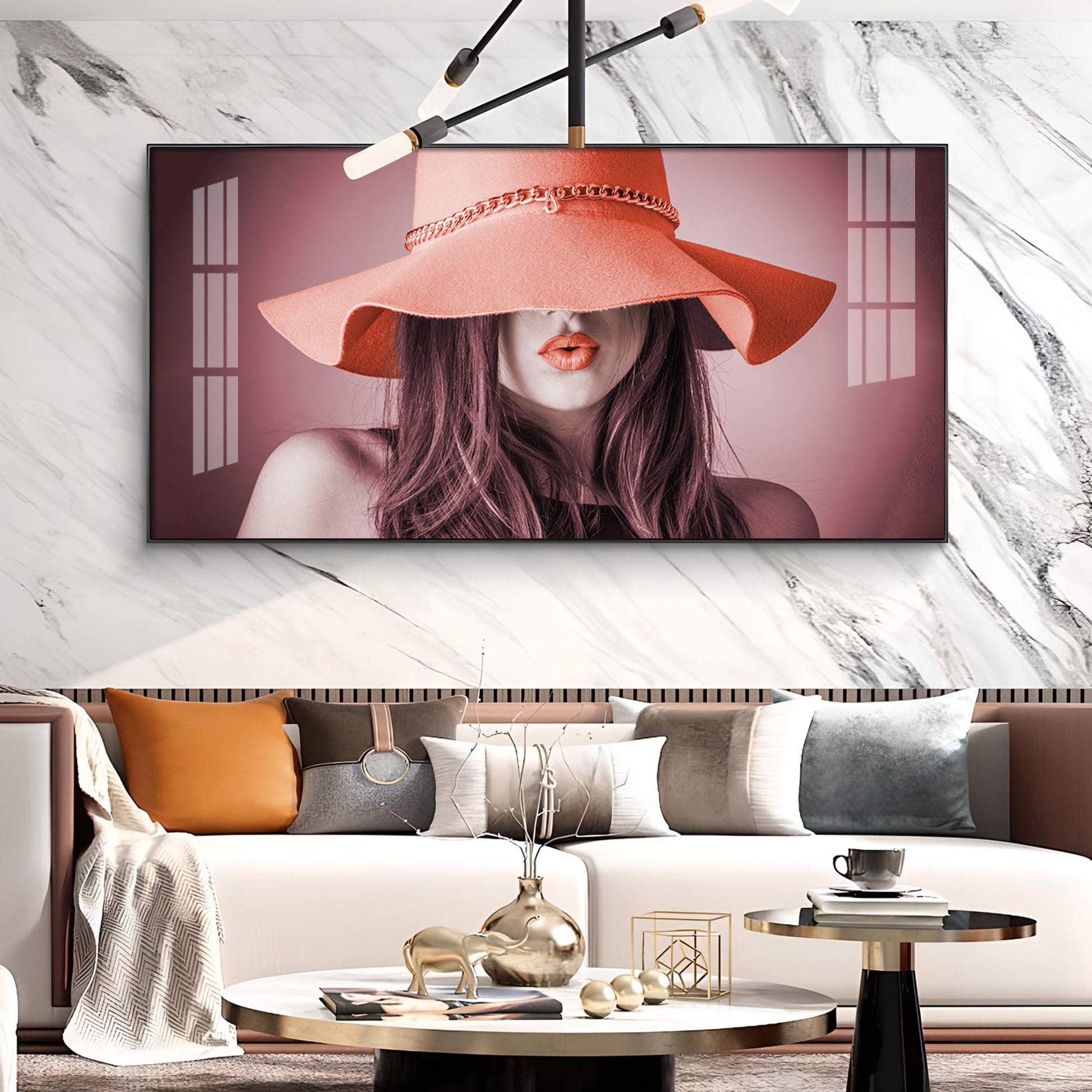 Modern Lady With Hat Glass Finish Horizontal Wall Art