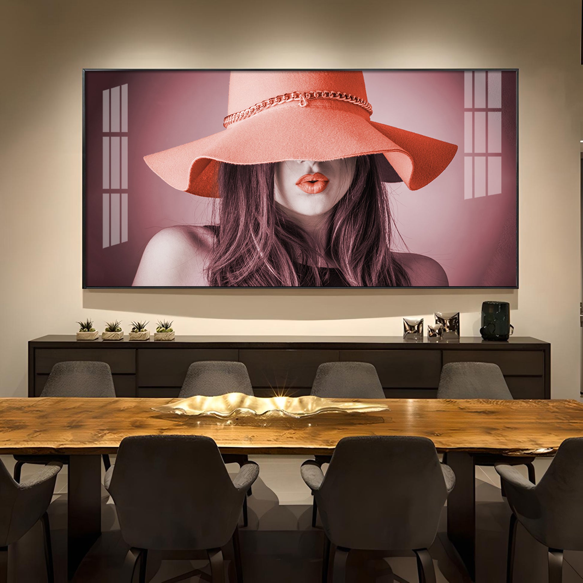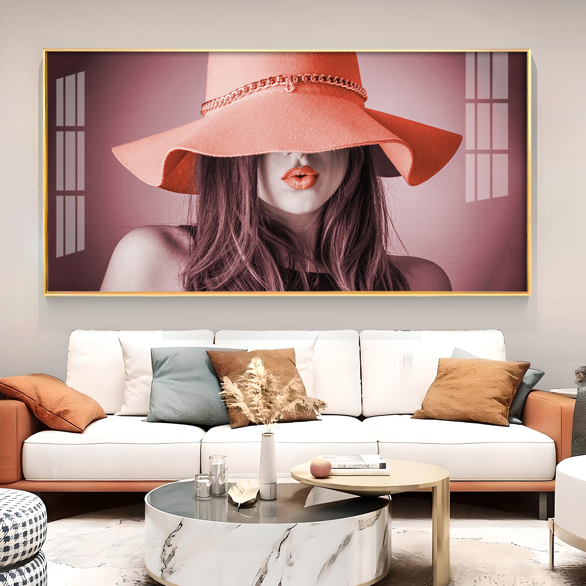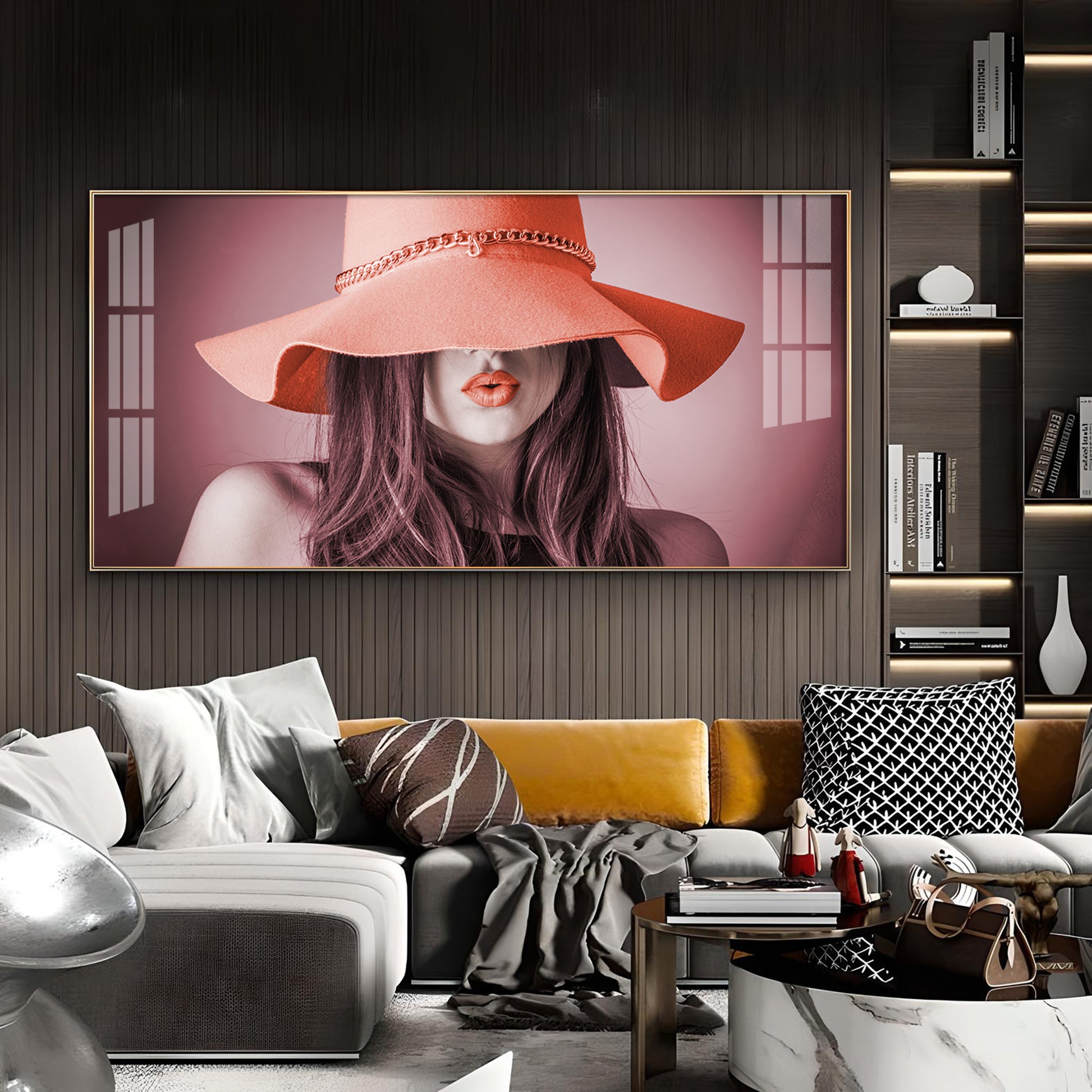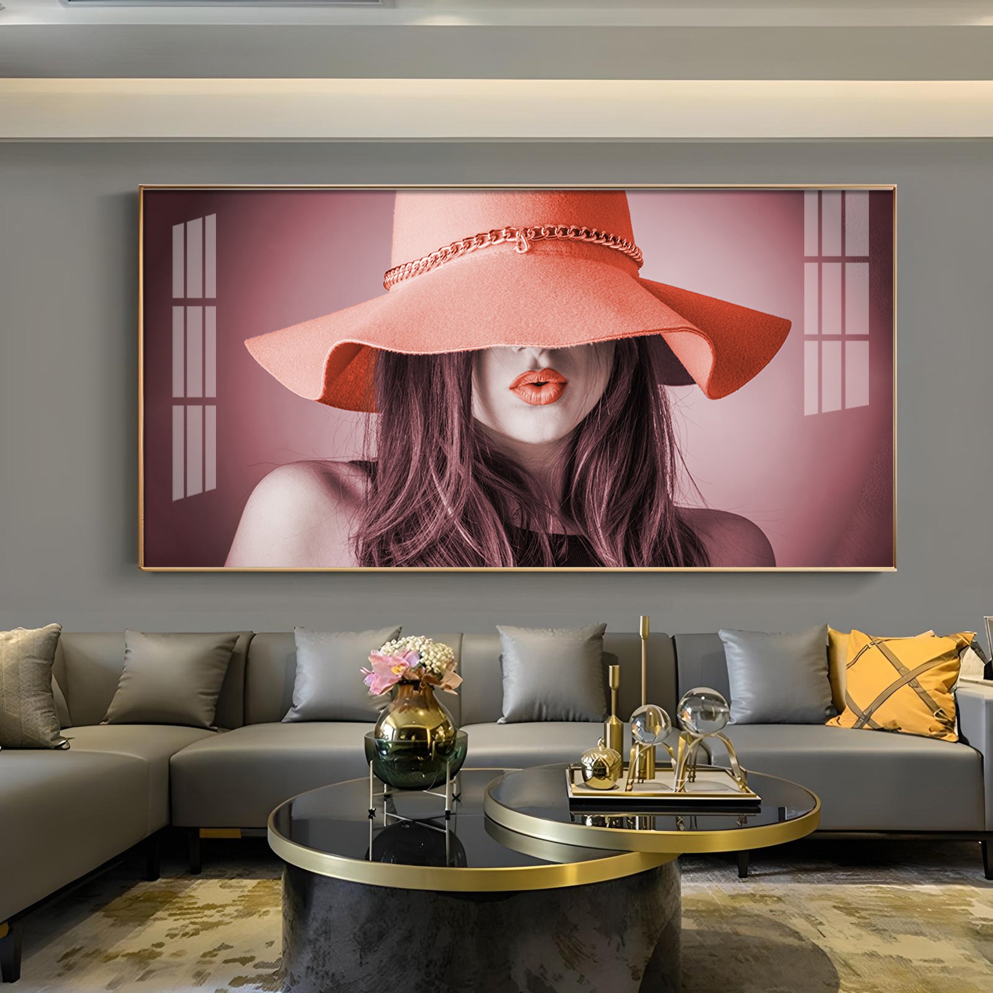 Modern Lady With Hat Glass Finish Horizontal Wall Art