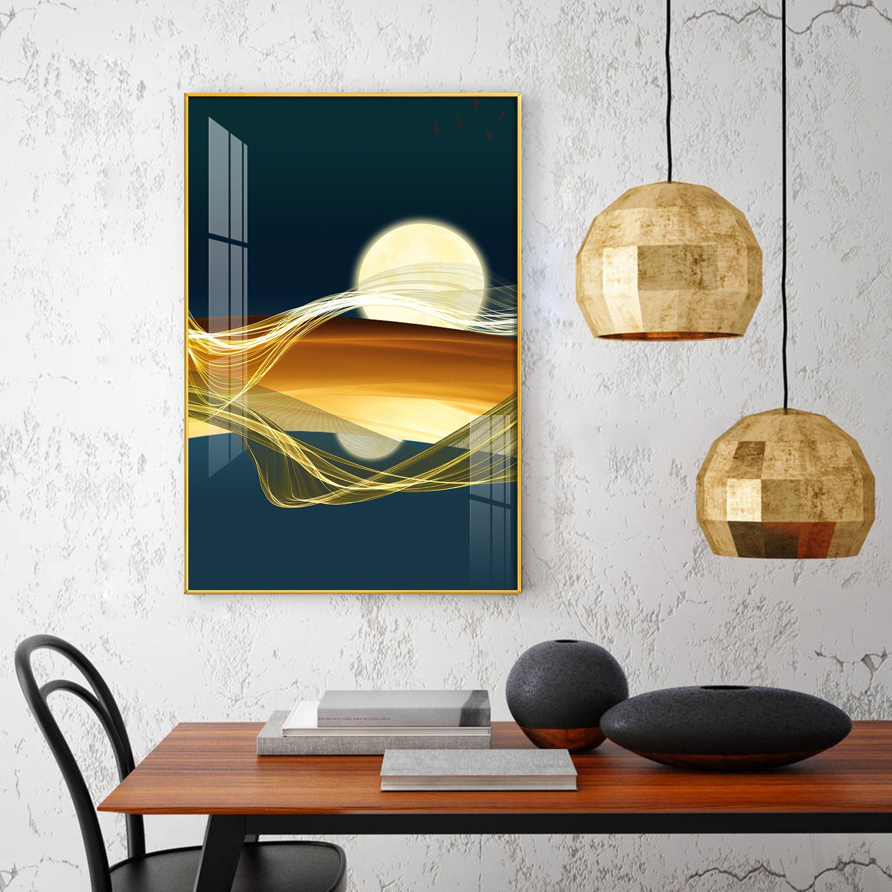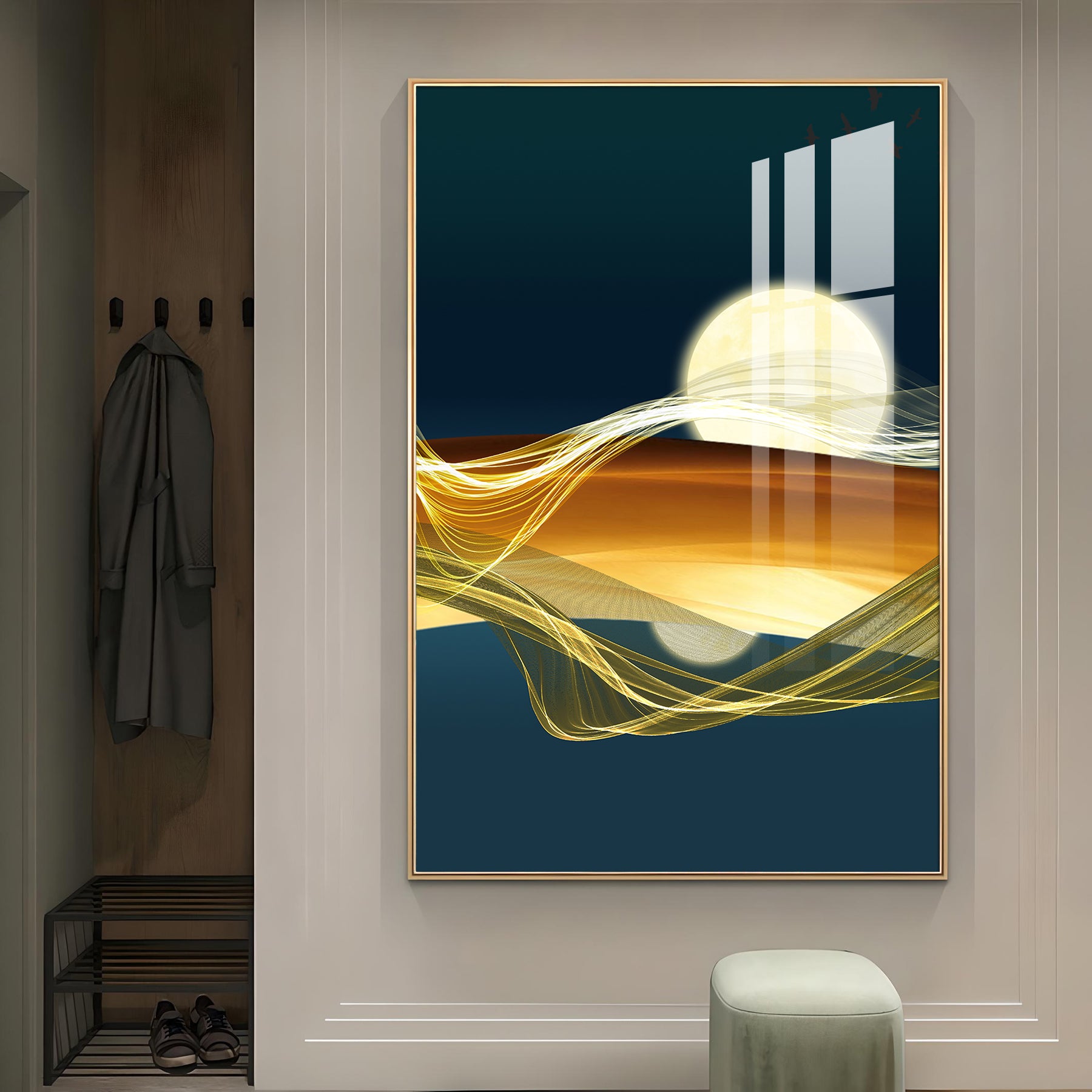 Our Framed glass finish wall art is easy to hang. The metal hooks are included in the box of your ordered wall art. You can simply mount it to the wall you want to place.