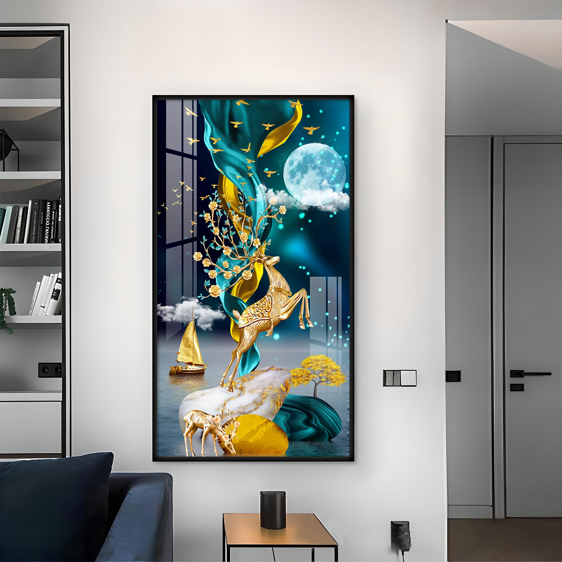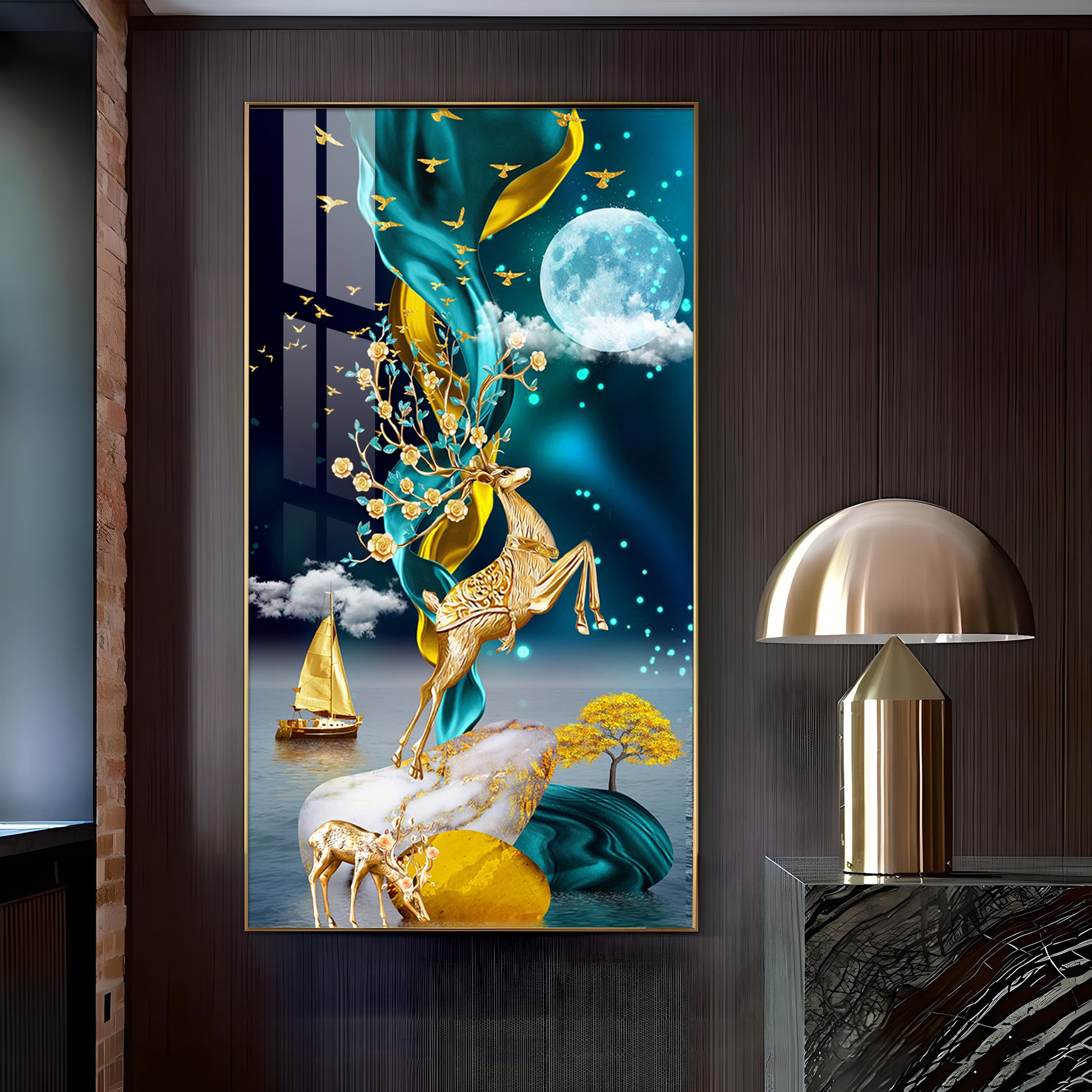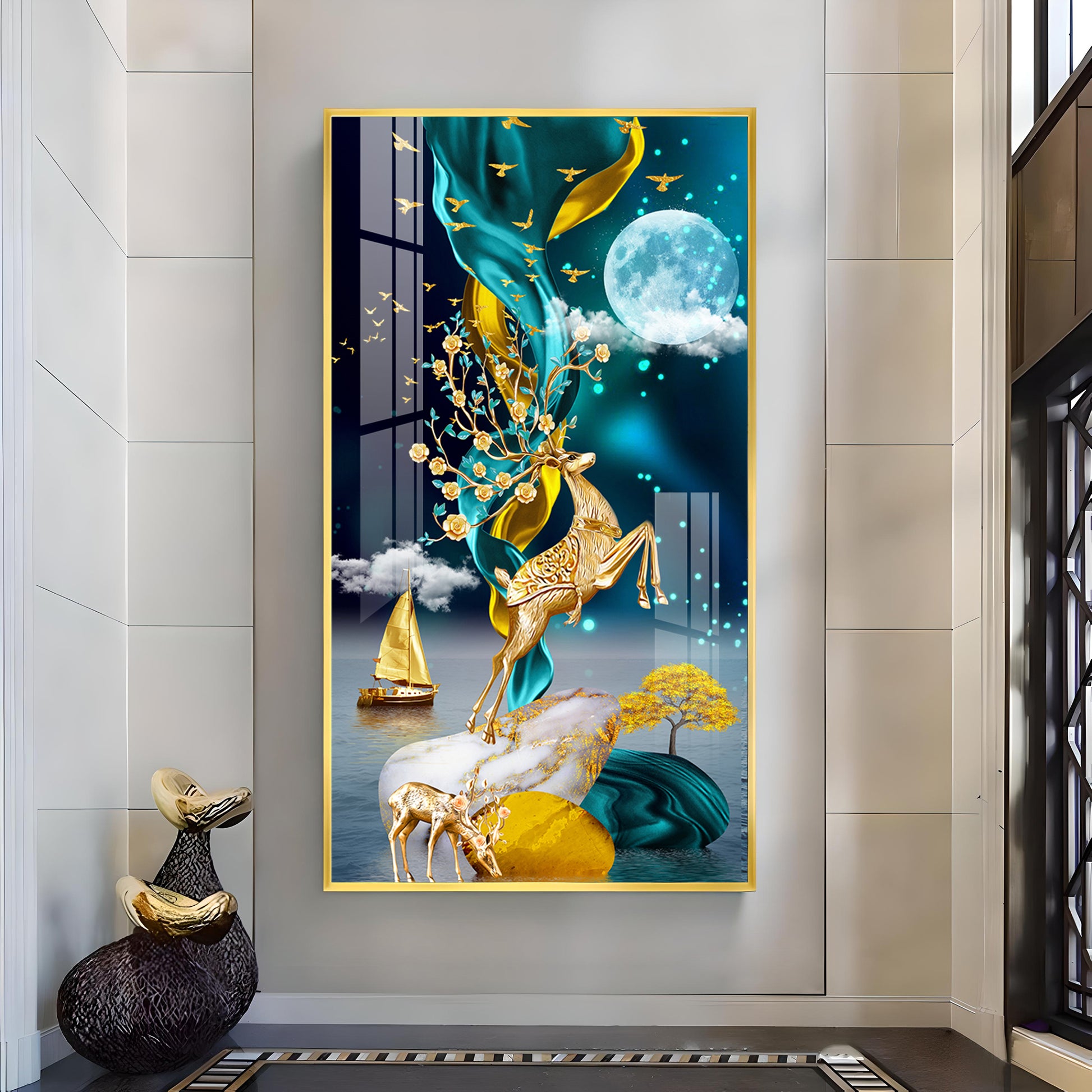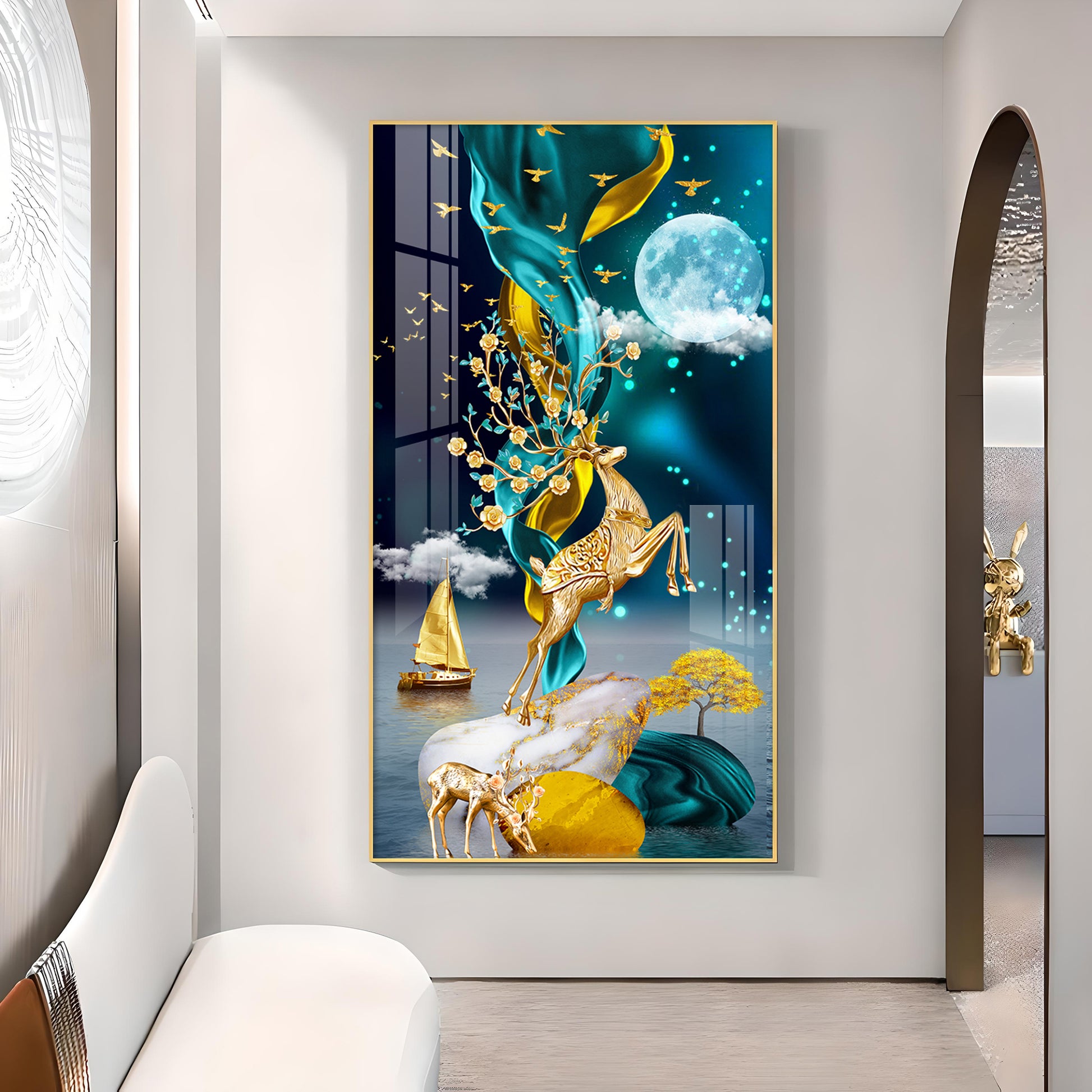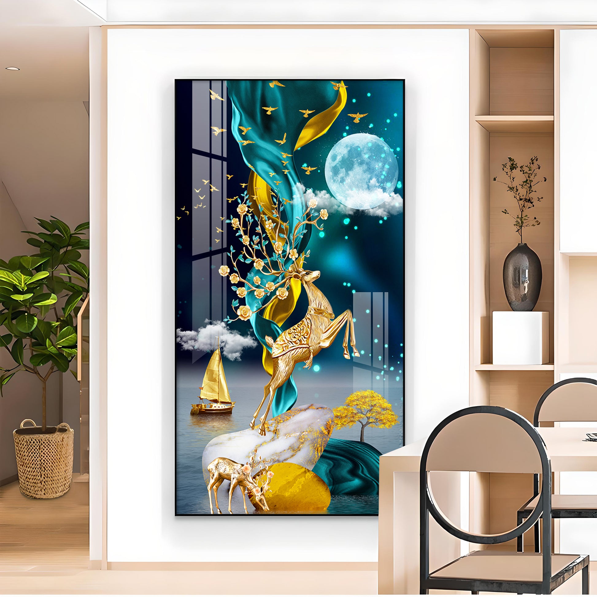 Moonnlit Dancing Deer Glass Finish Vertical Wall Art