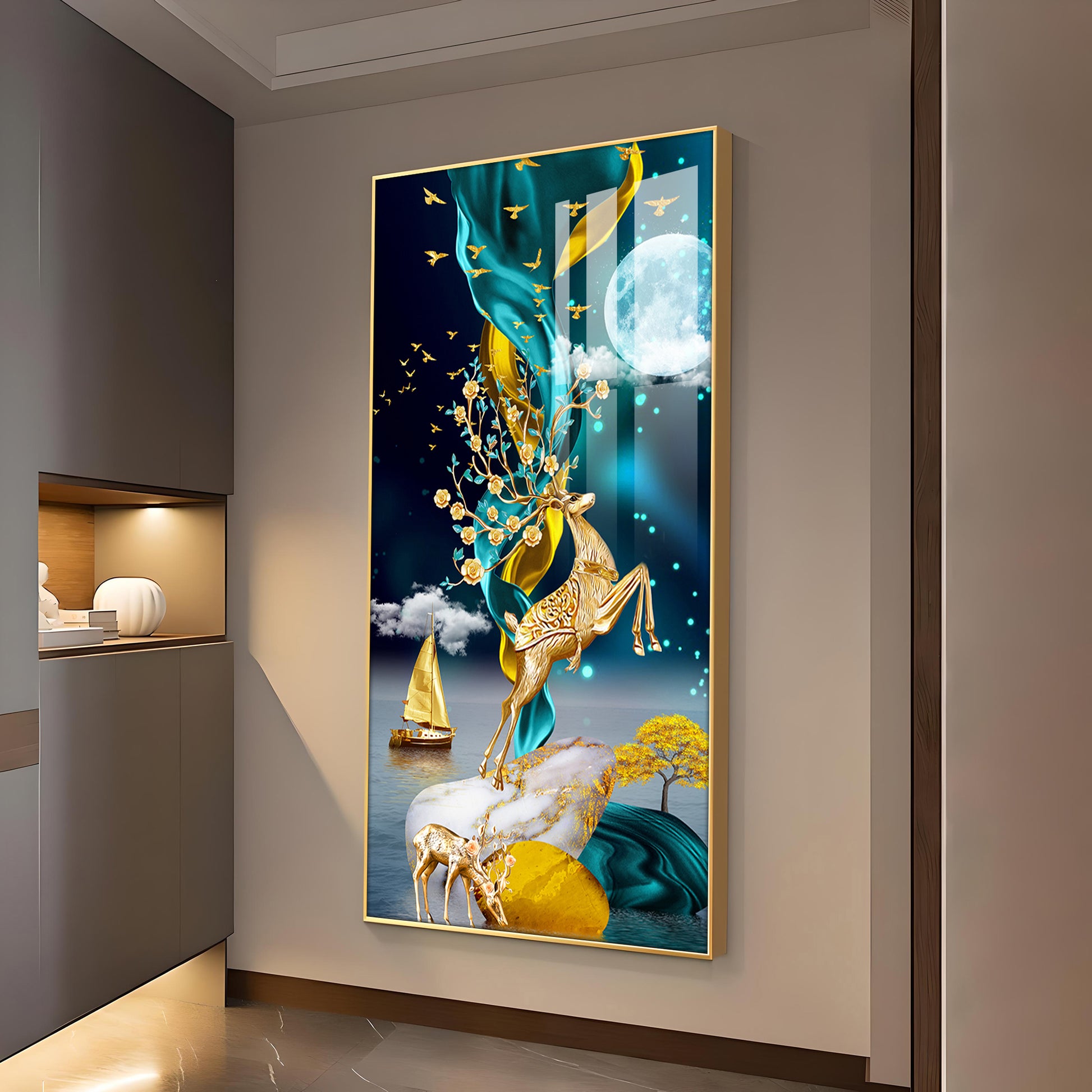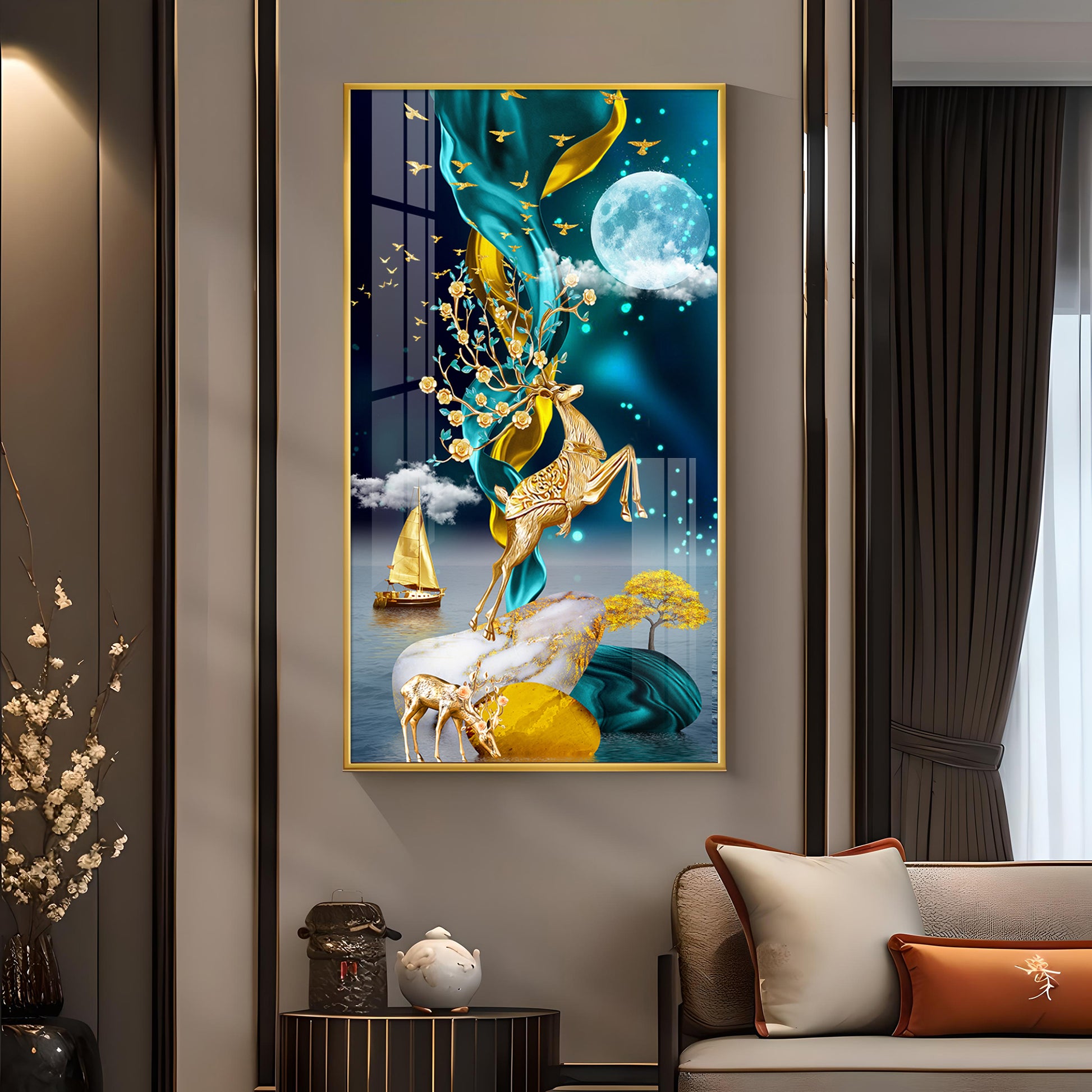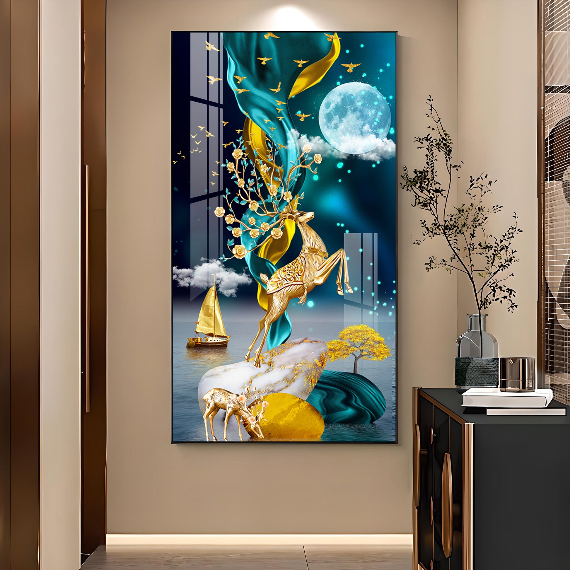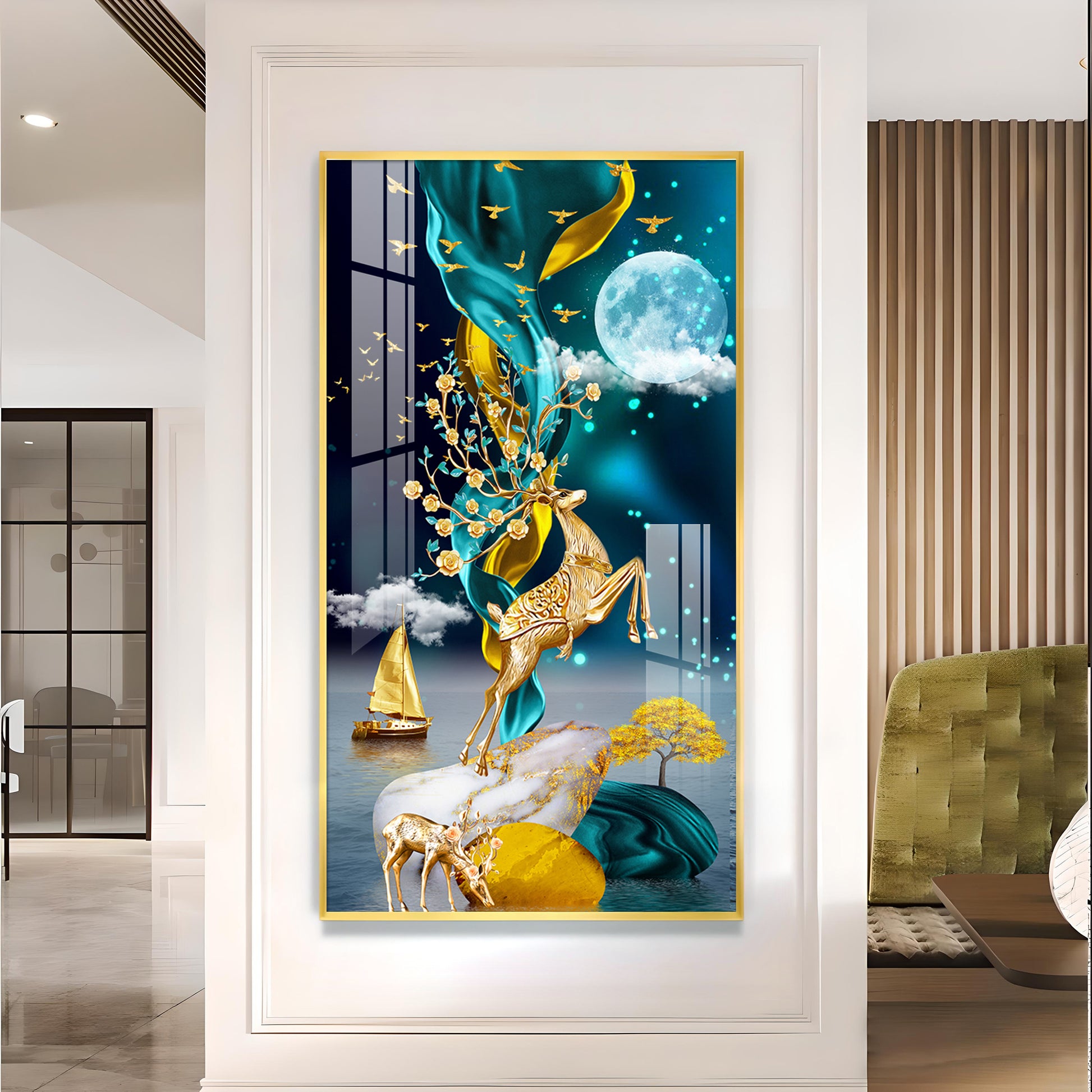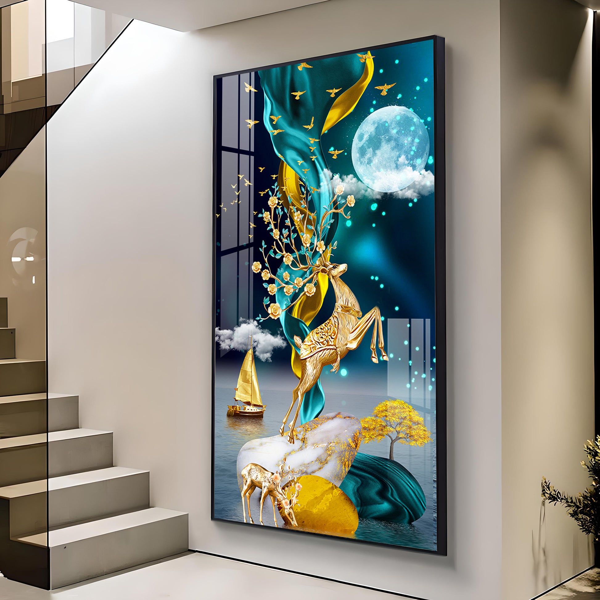 Moonnlit Dancing Deer Glass Finish Vertical Wall Art