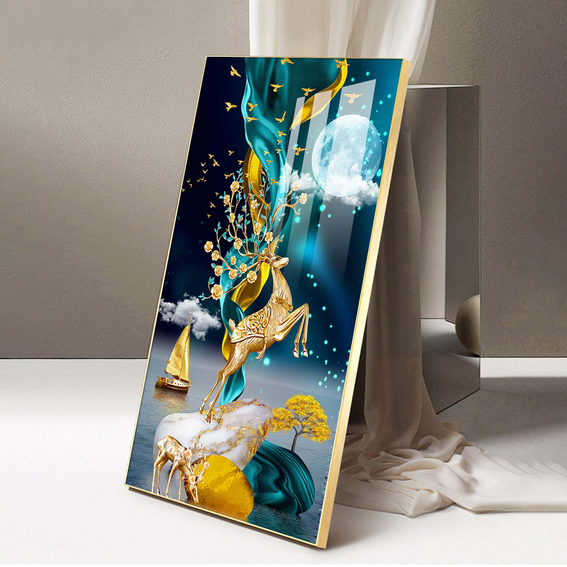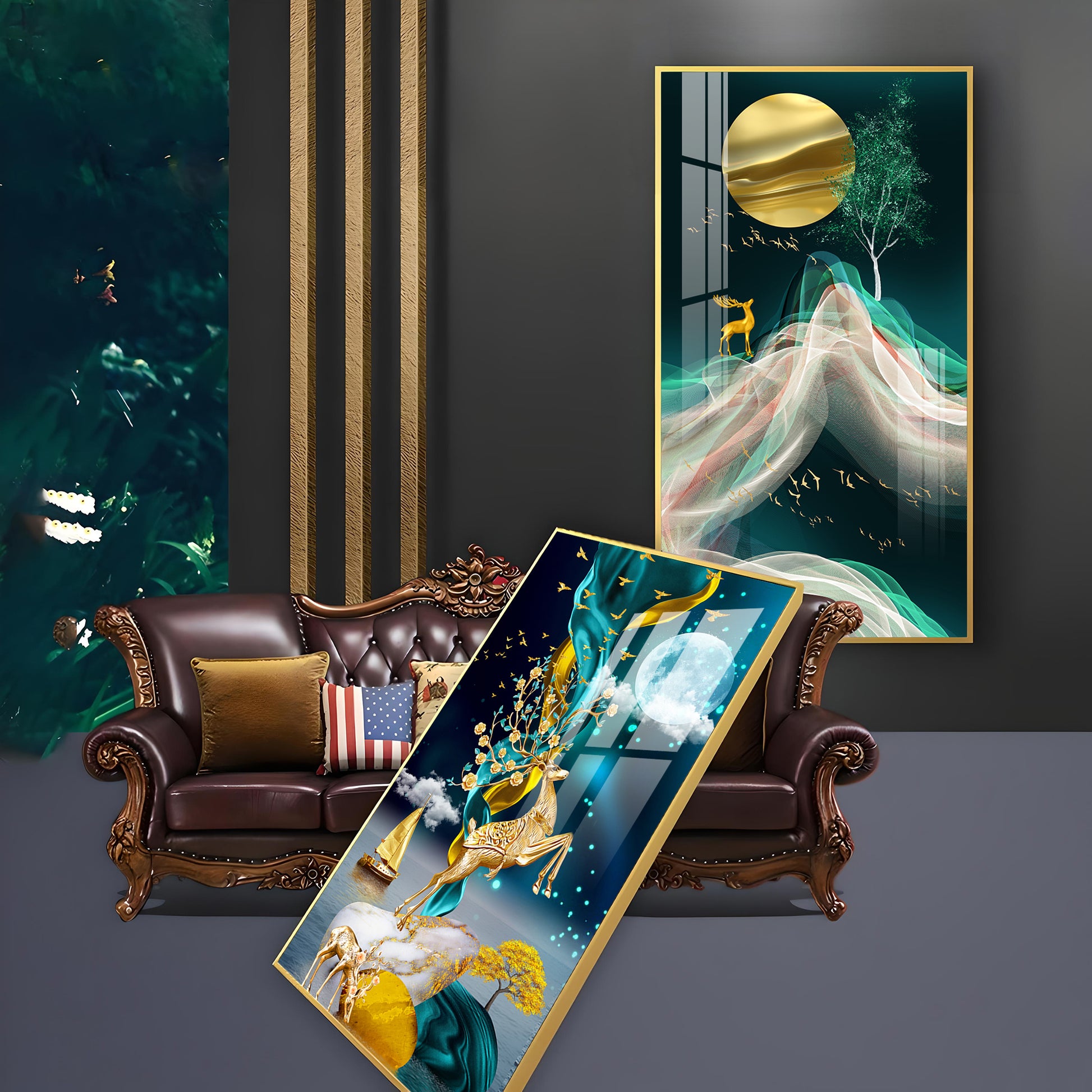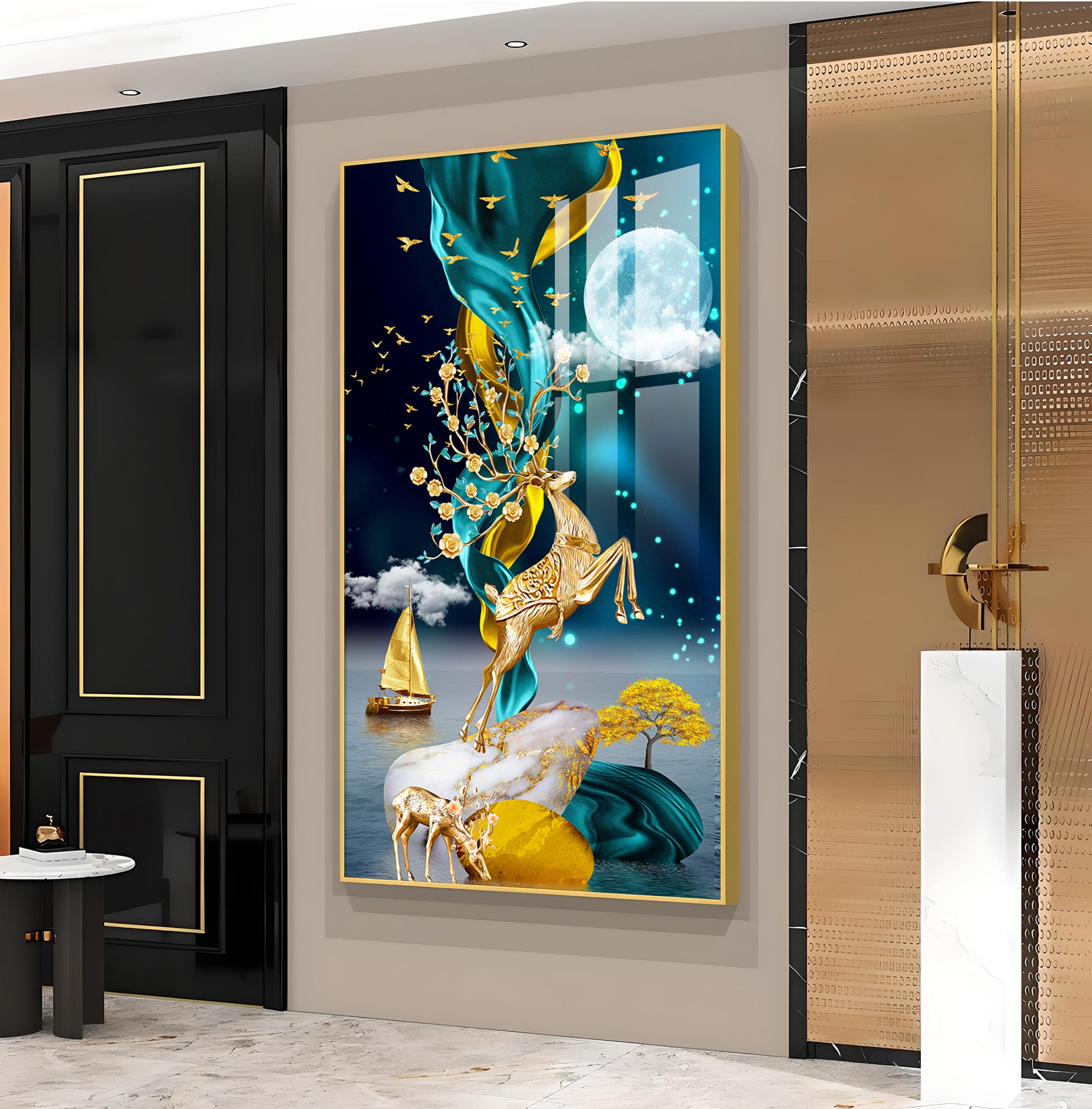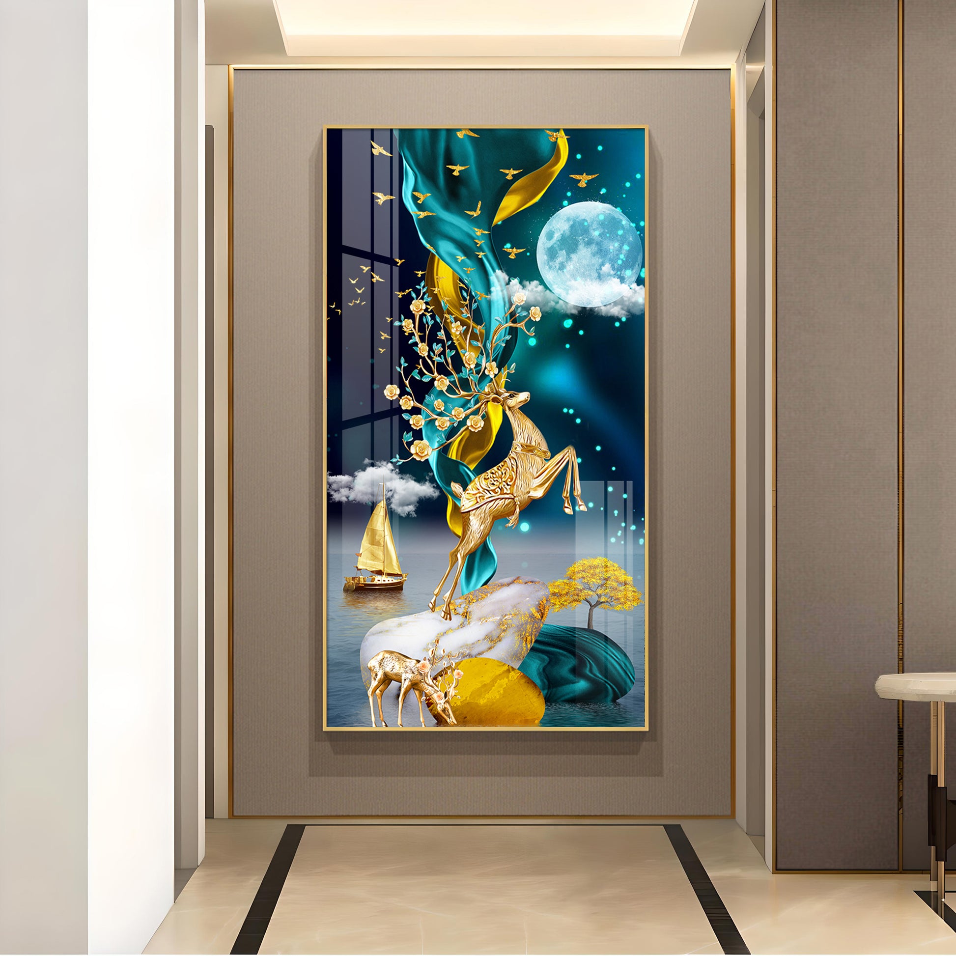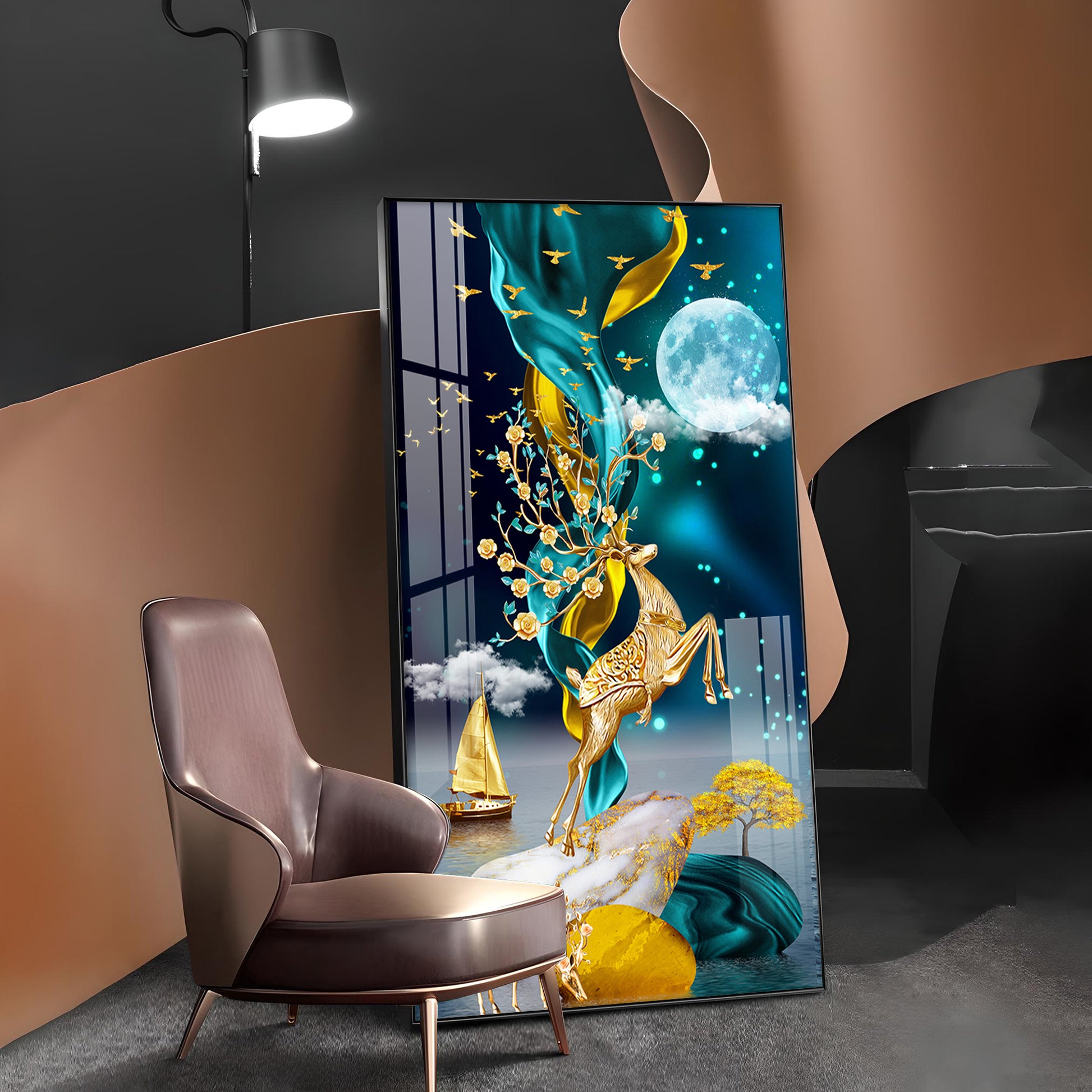 Moonnlit Dancing Deer Glass Finish Vertical Wall Art