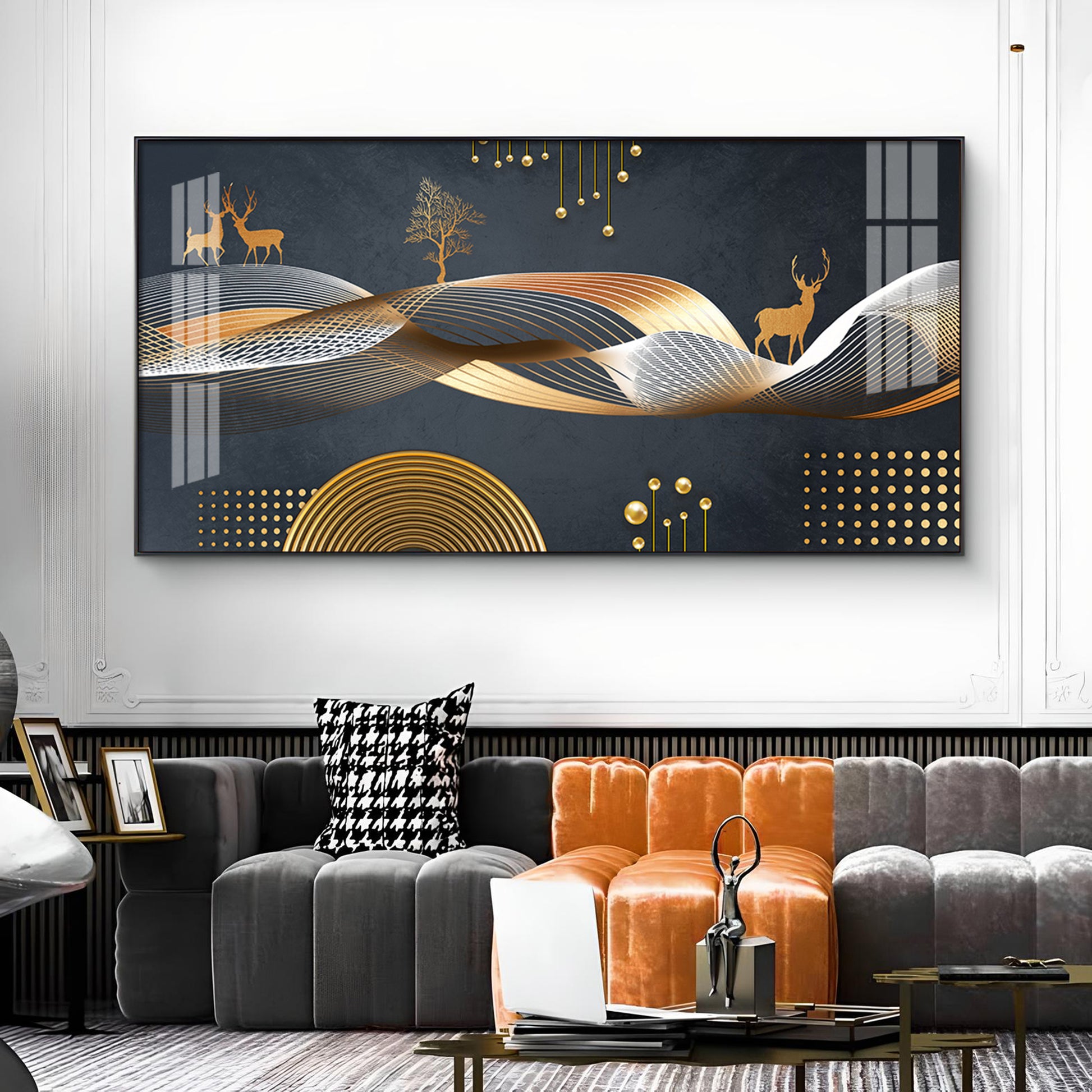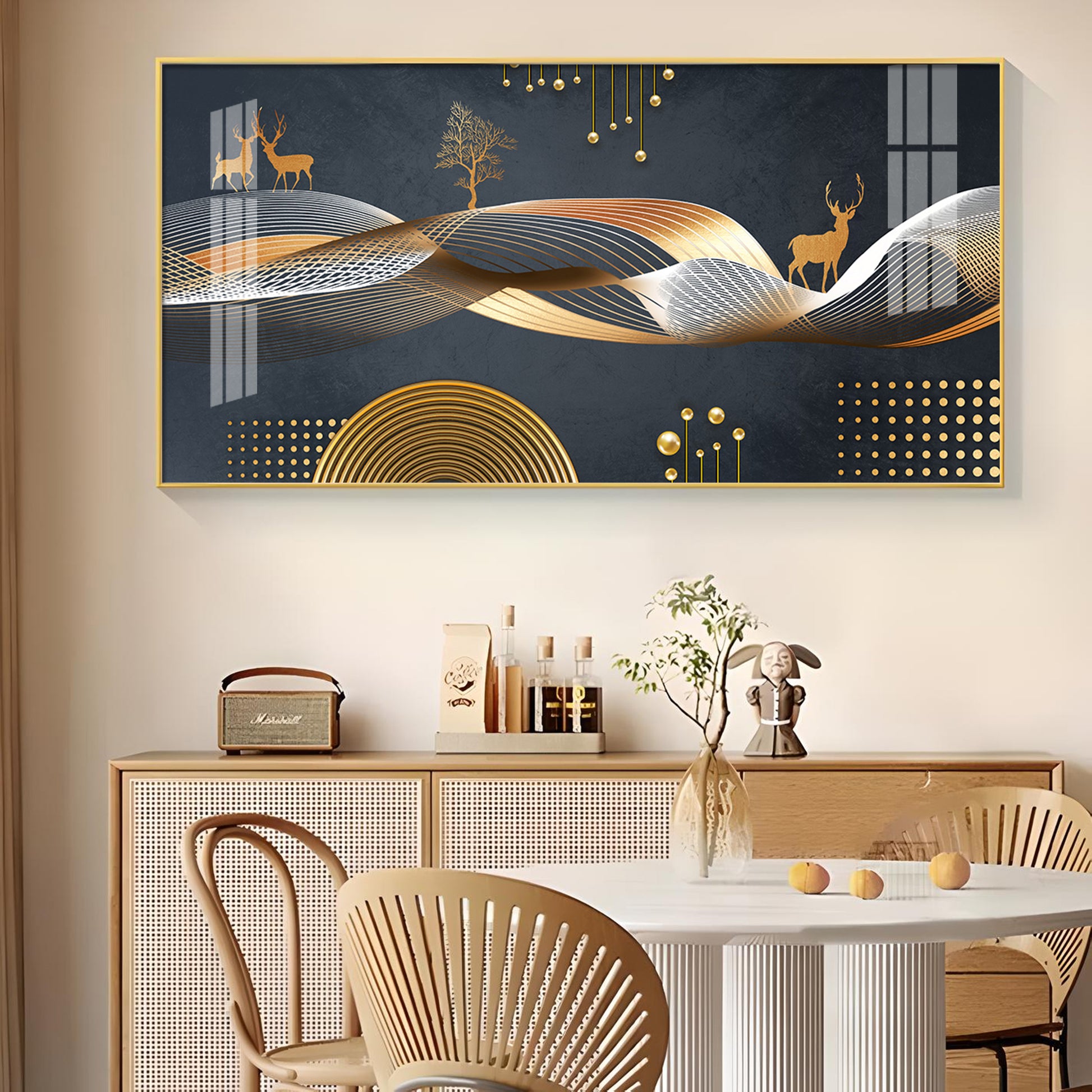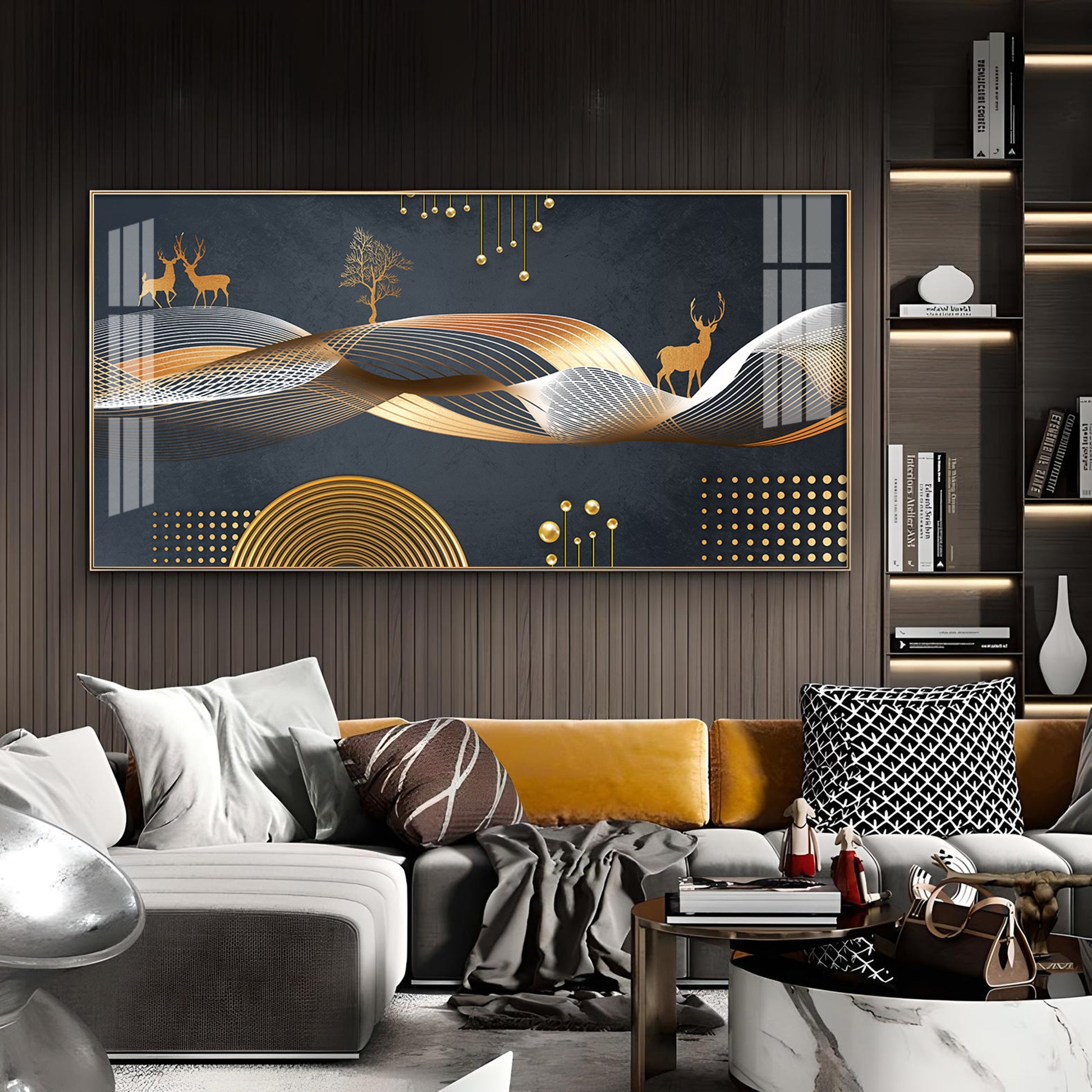 Night Landscape With Golden Deer Glass Finish Horizontal Wall Art