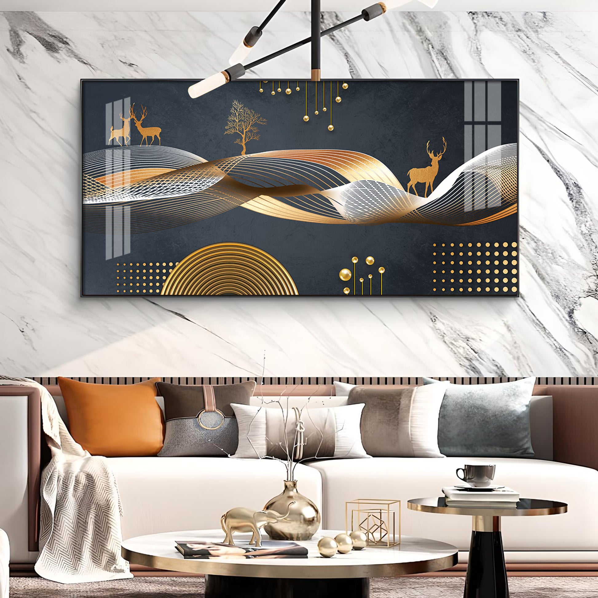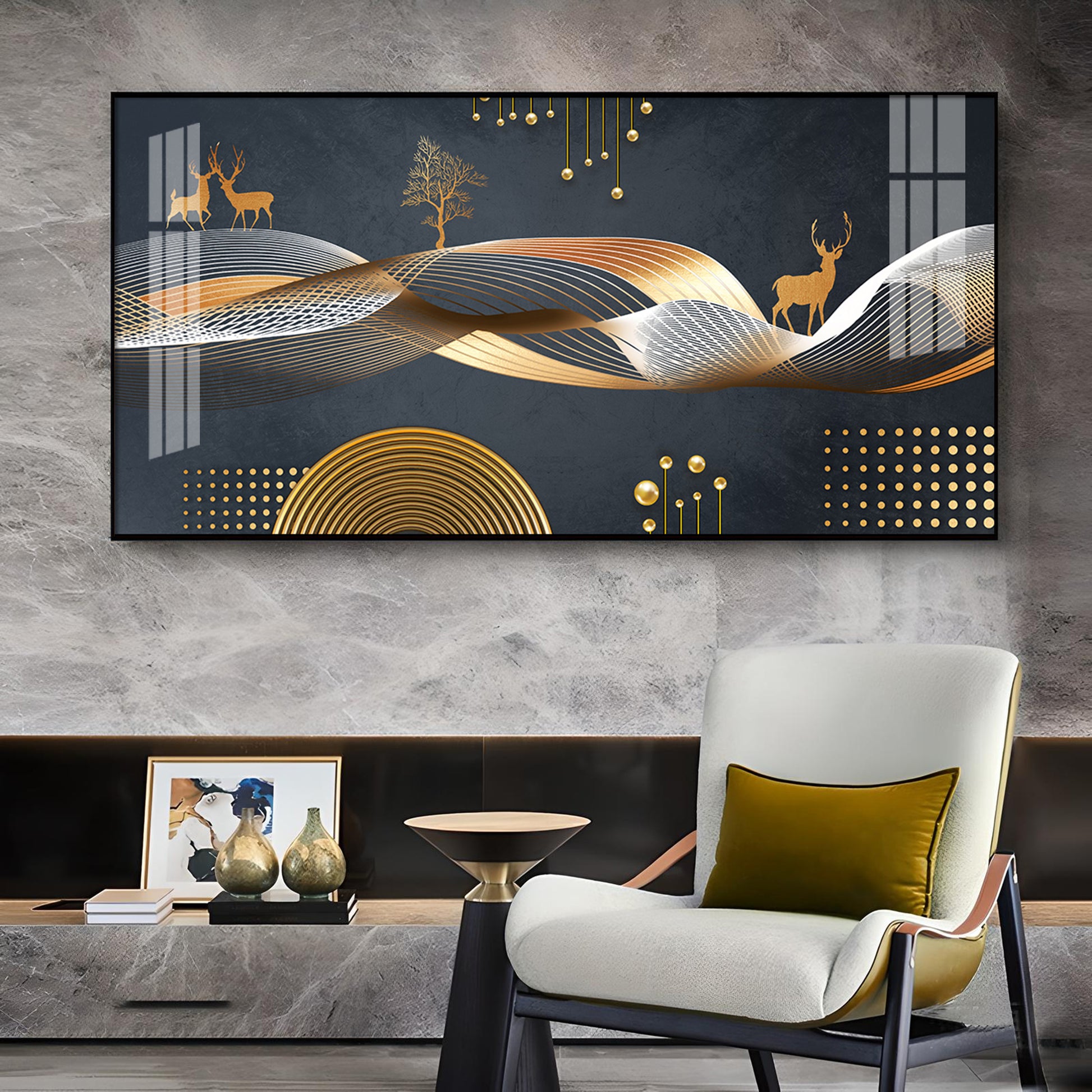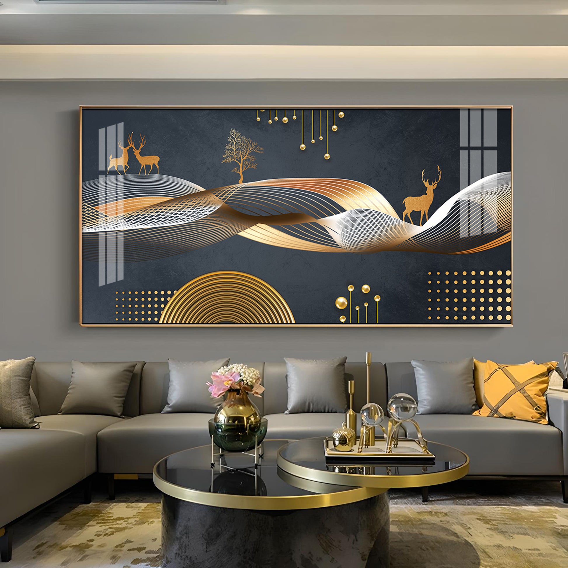 Night Landscape With Golden Deer Glass Finish Horizontal Wall Art